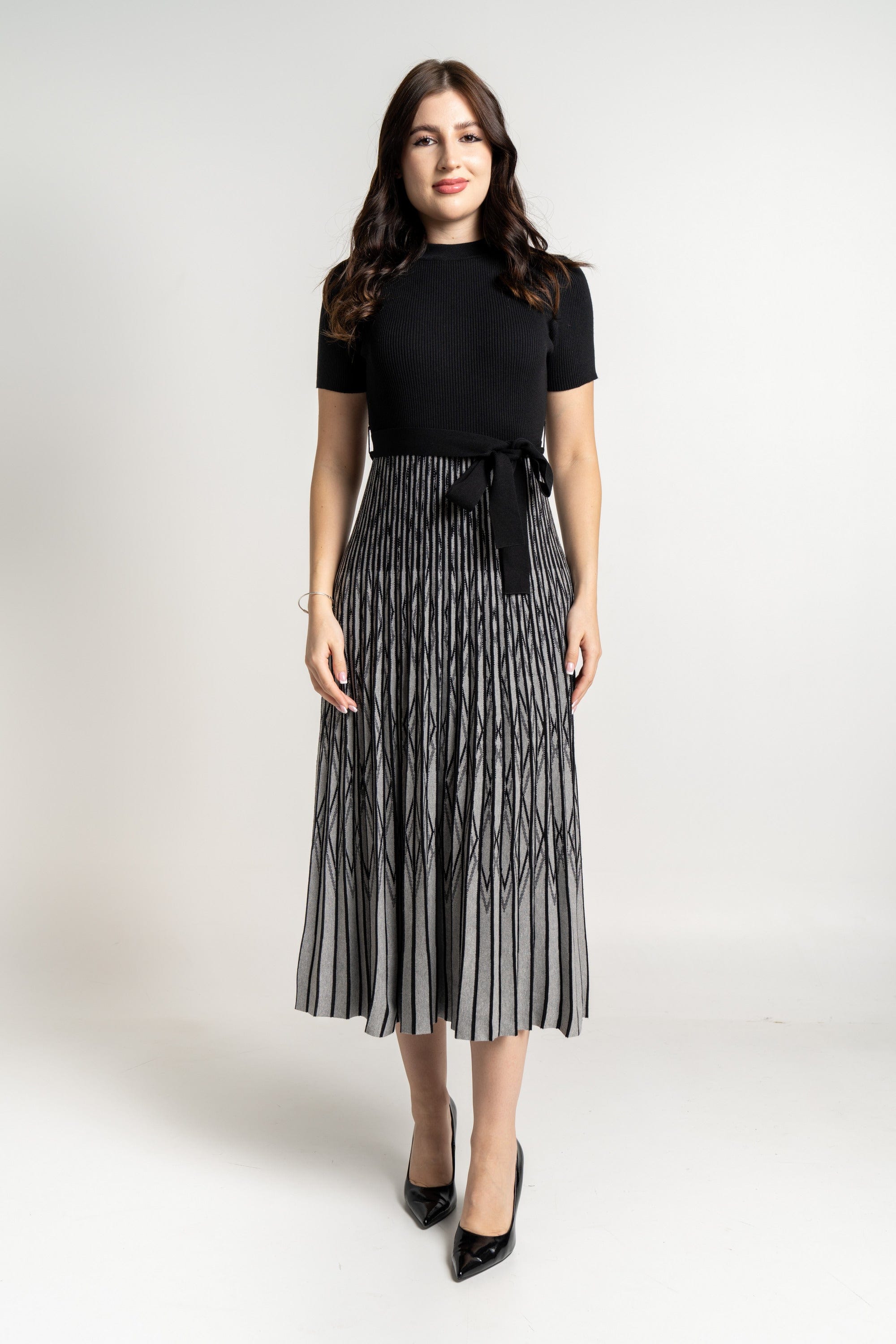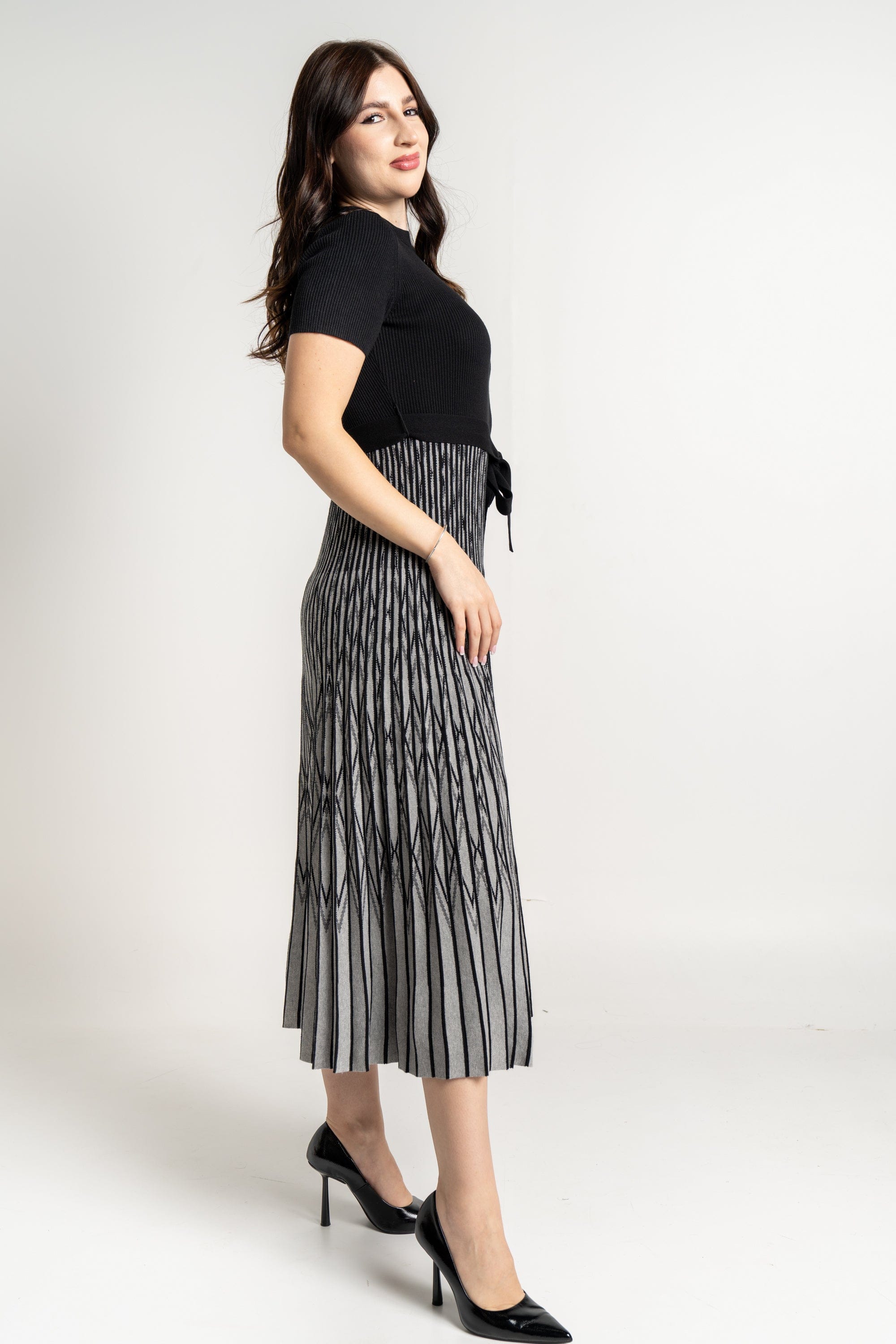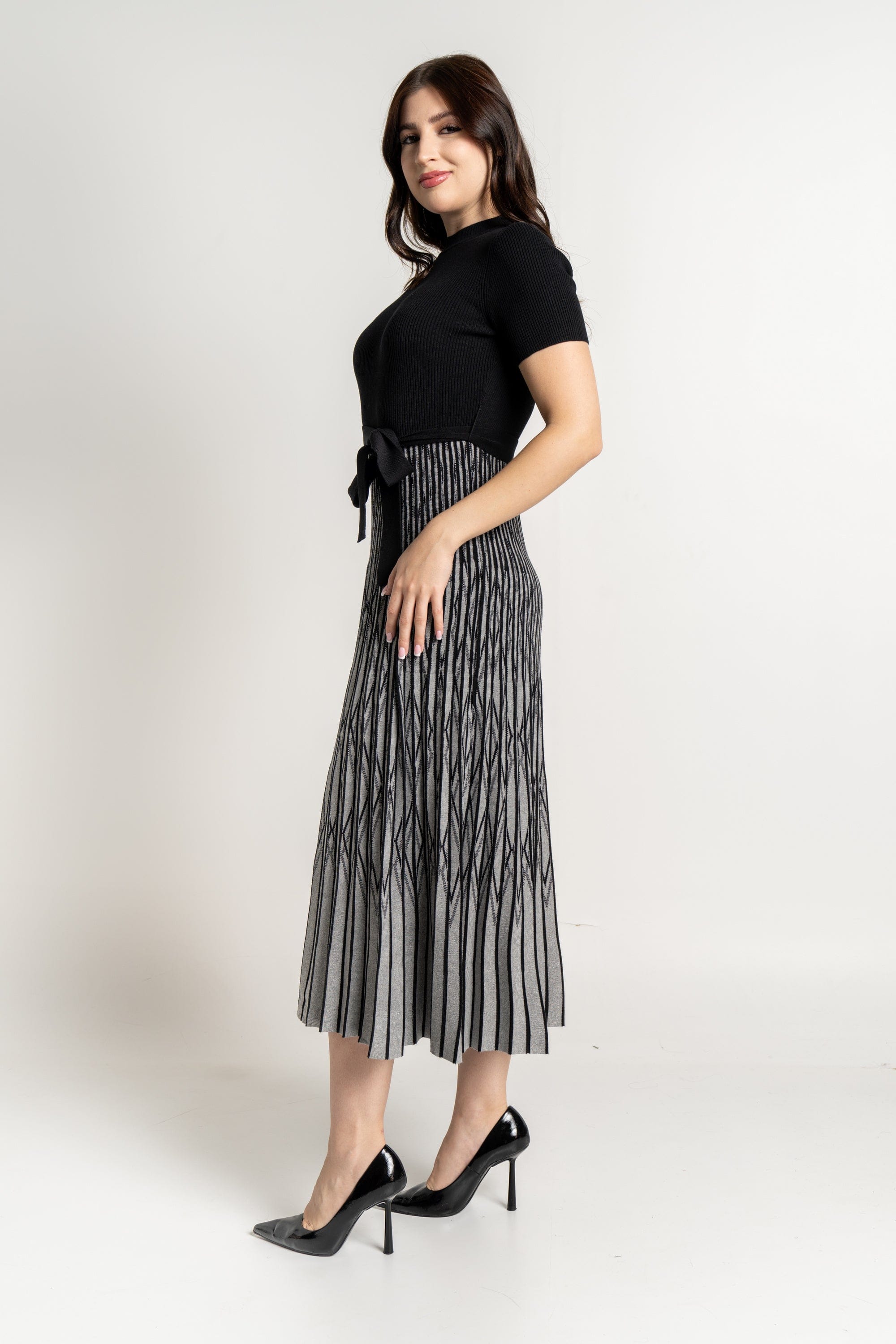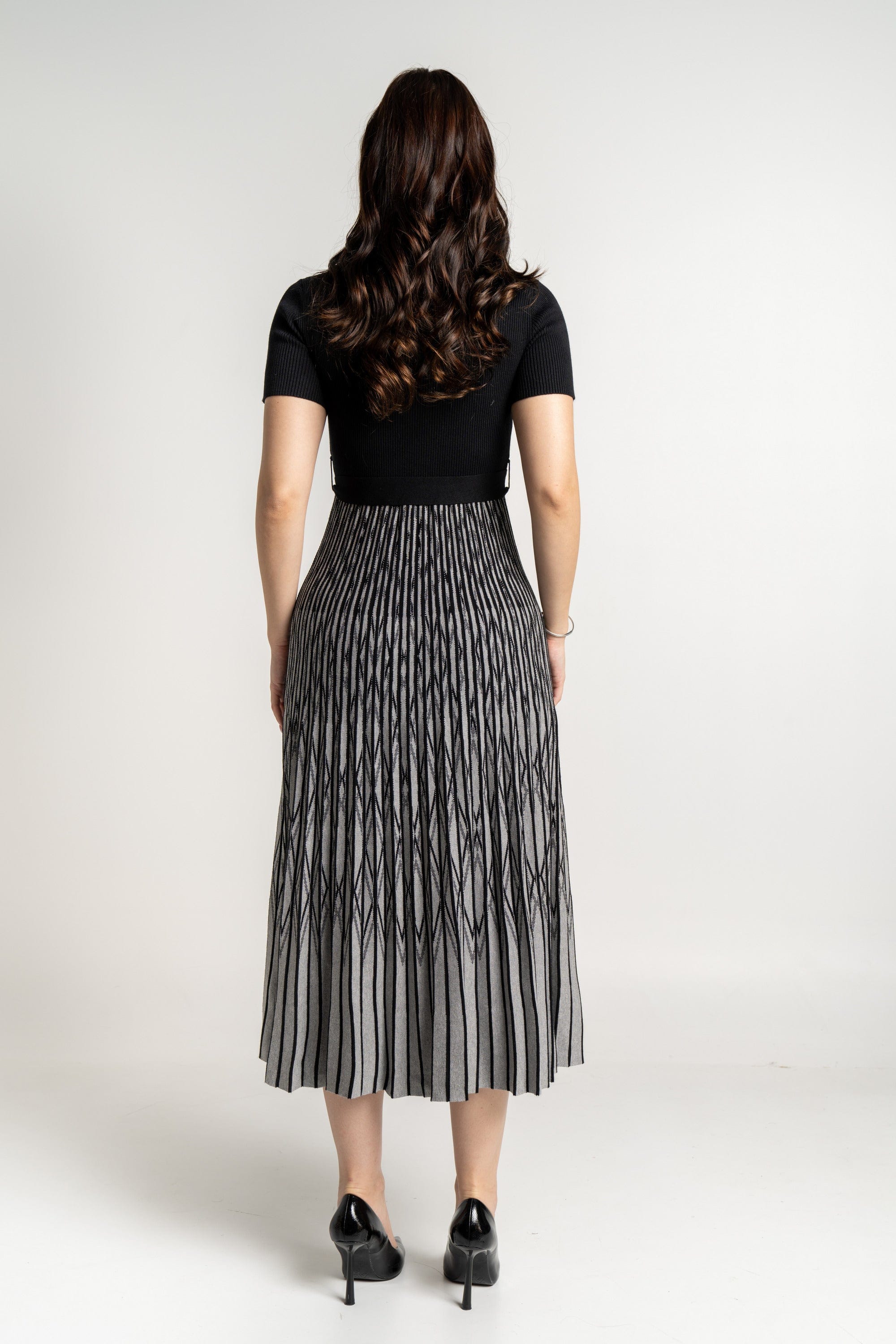 - طول ميدي مخطط بلونين (أسود/وردي) لإطلالة عصرية