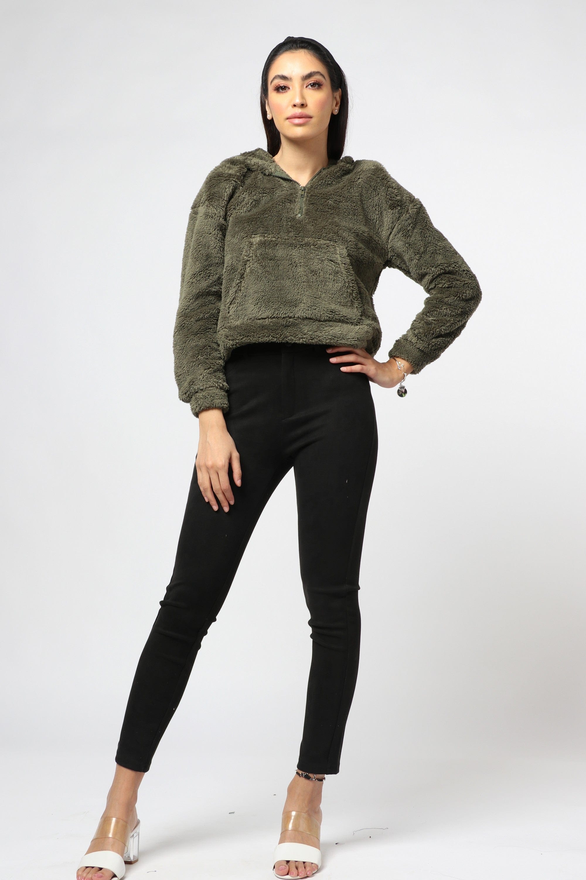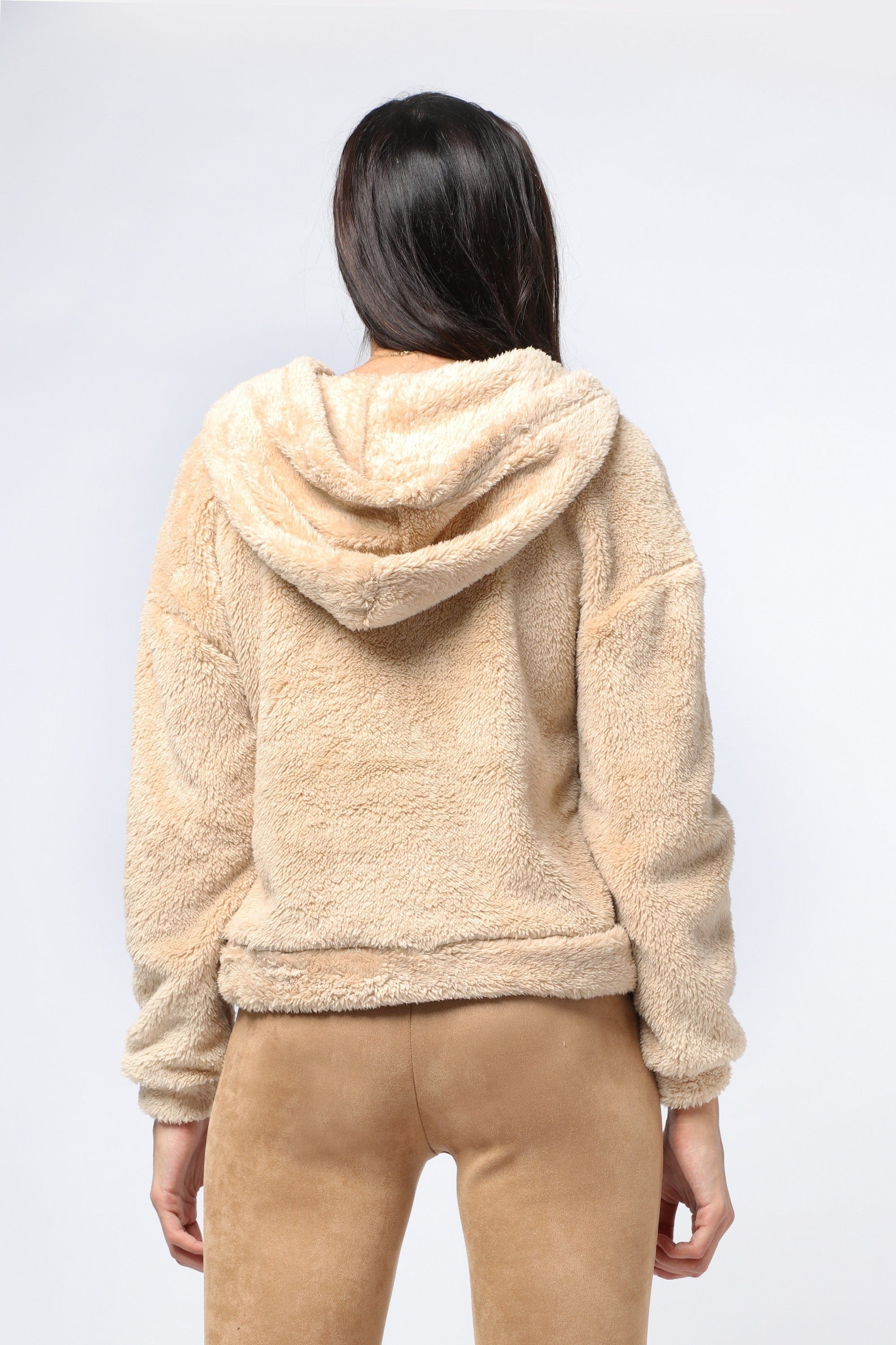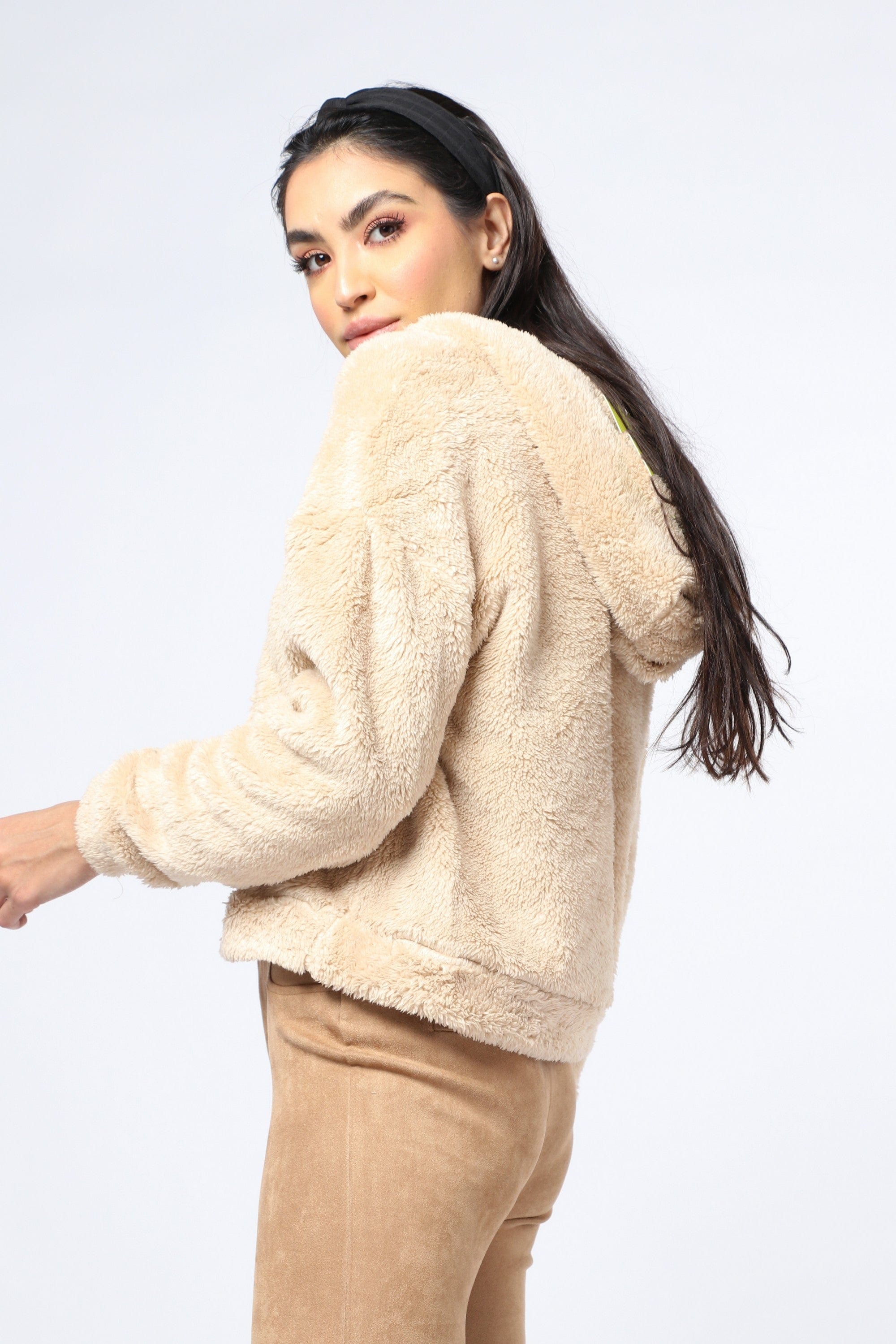 بلوزة فرو بسحاب وقبعة بأكمام طويلة