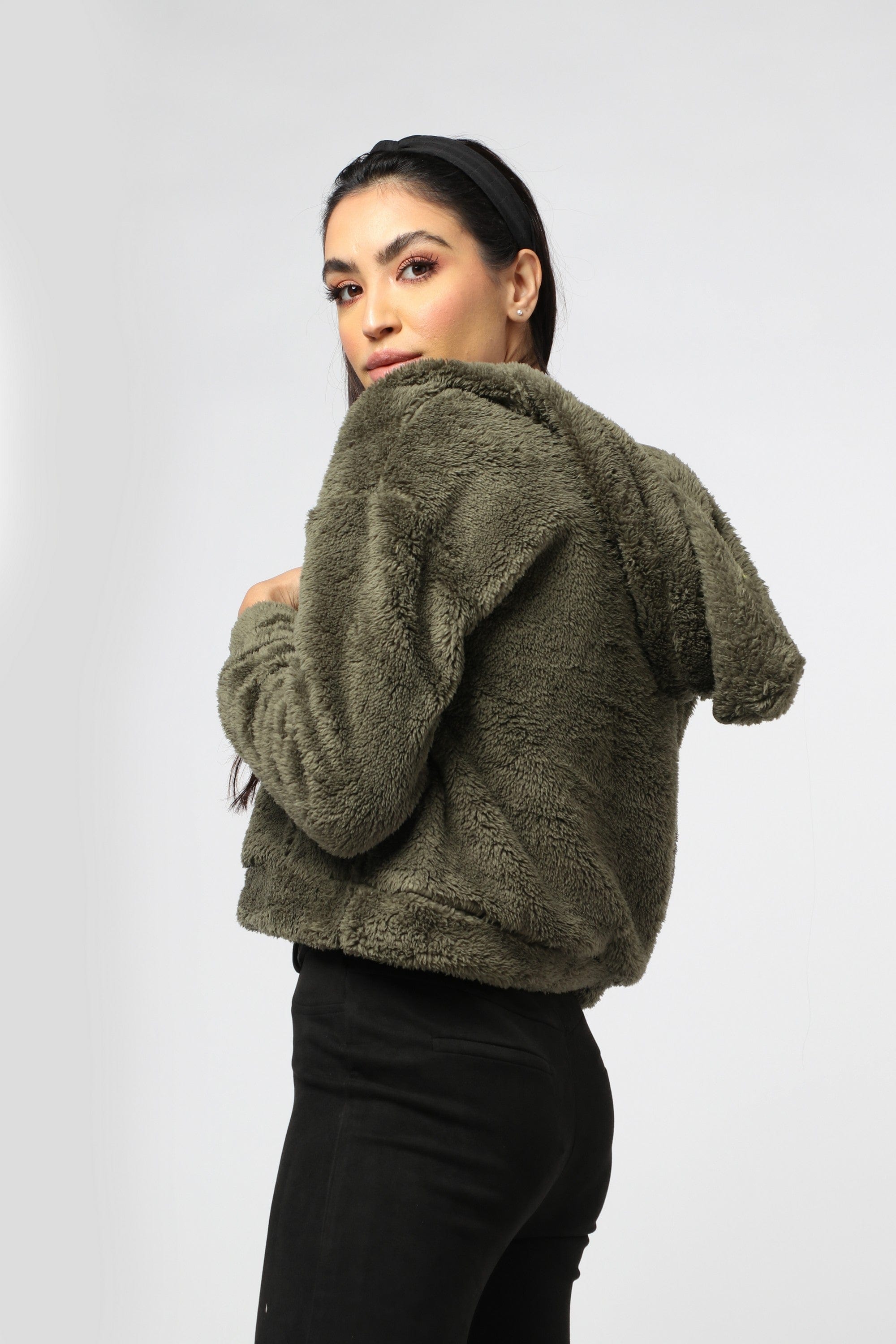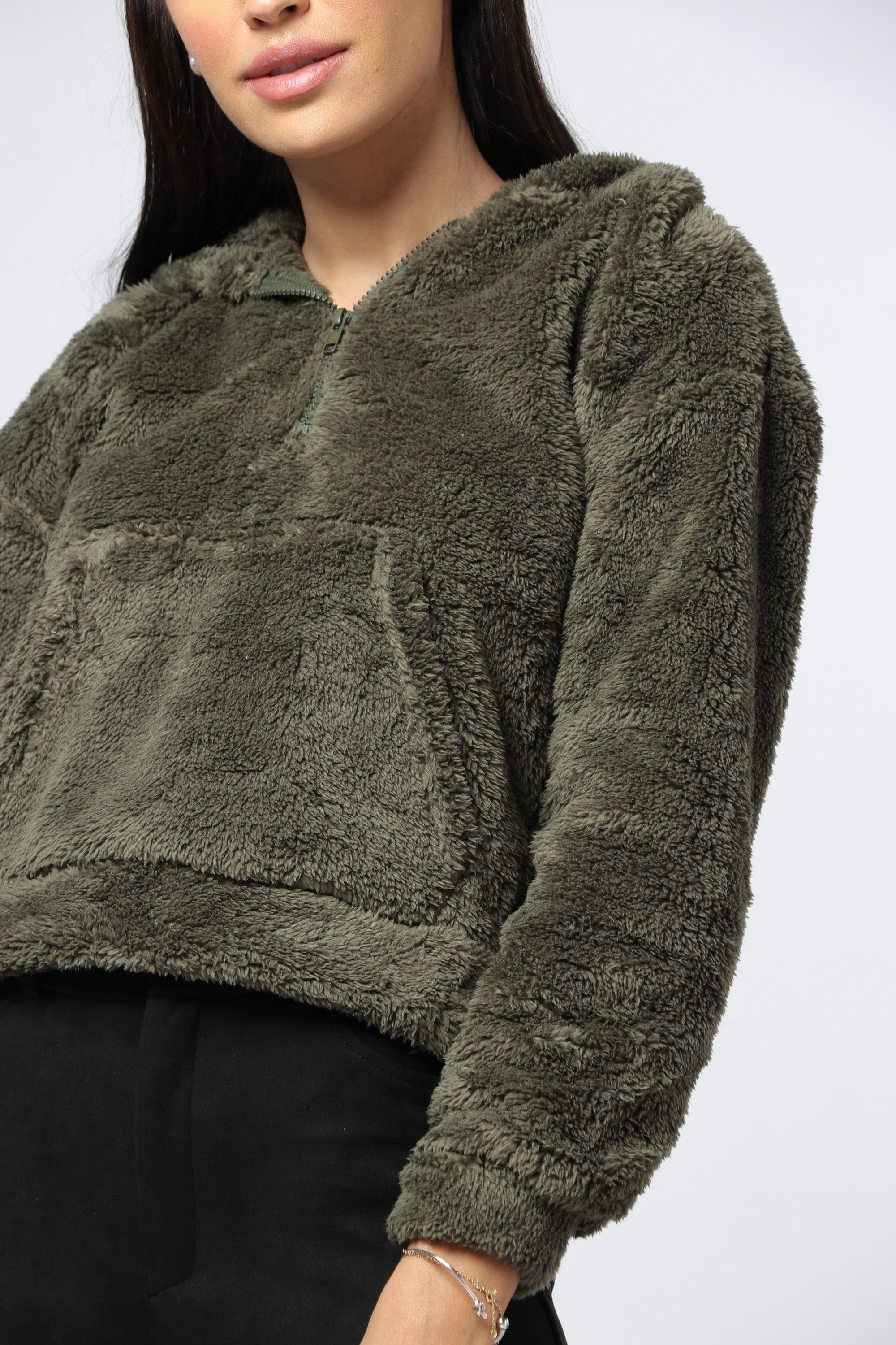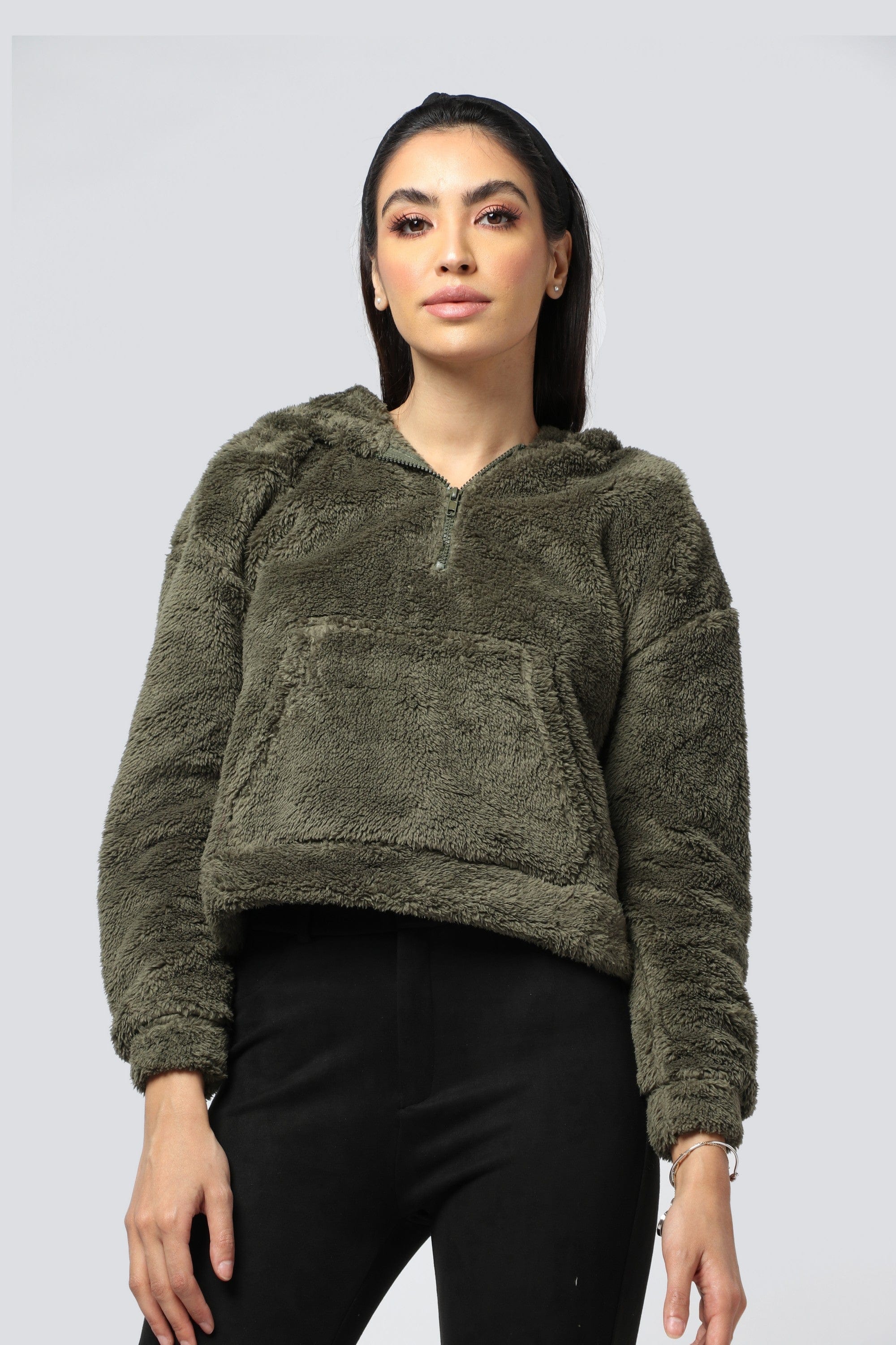 بلوزة فرو بسحاب وقبعة بأكمام طويلة