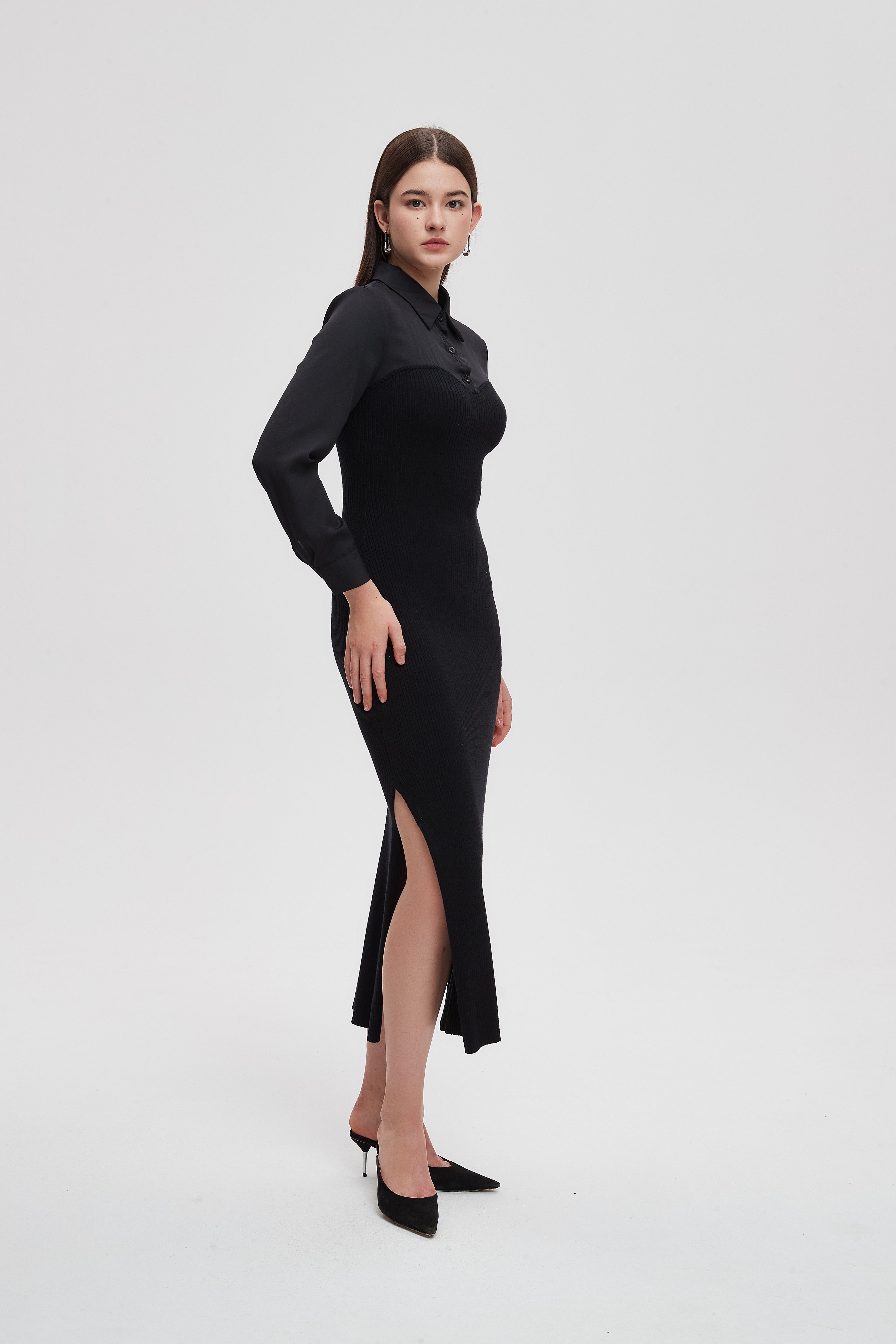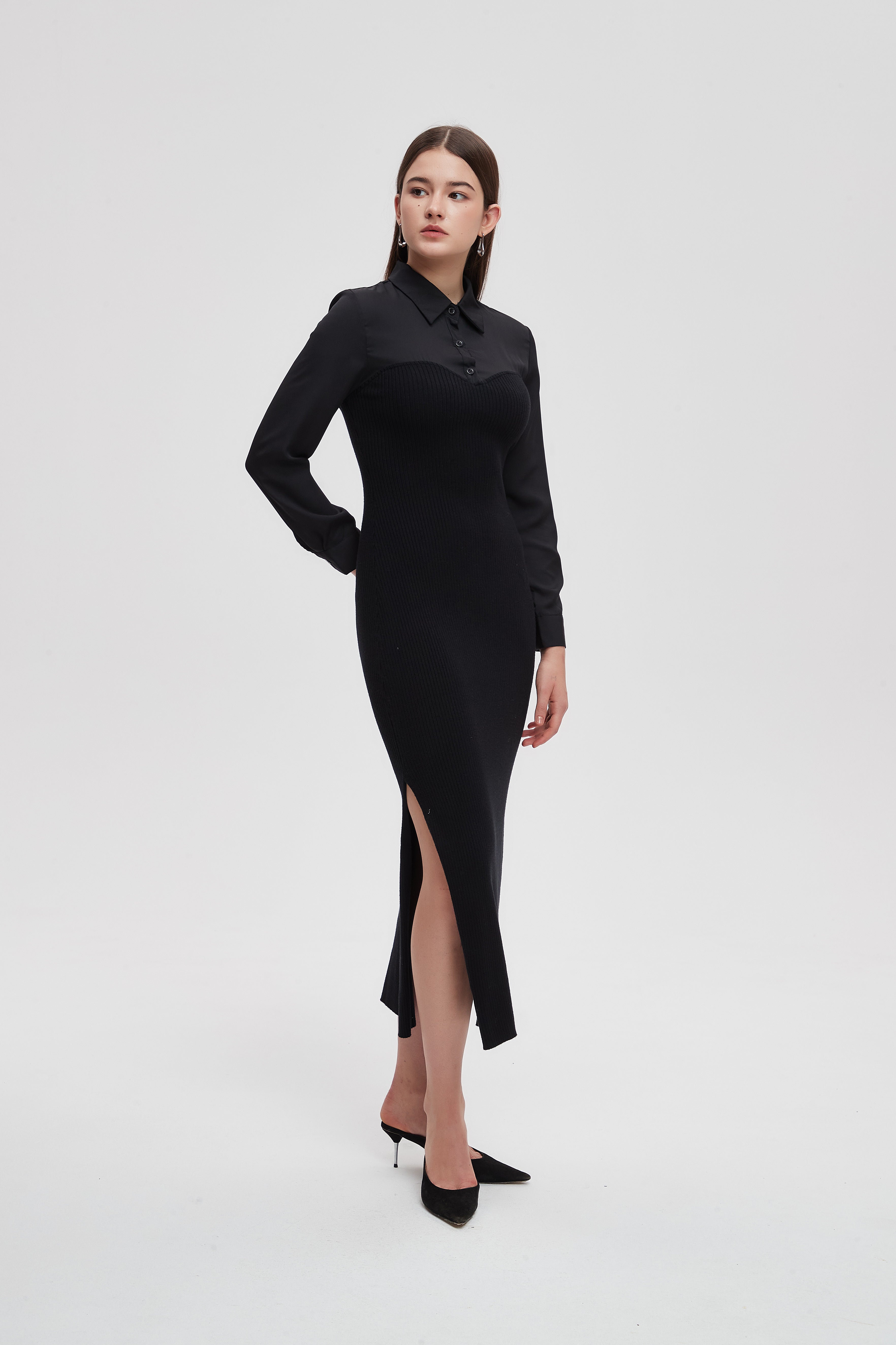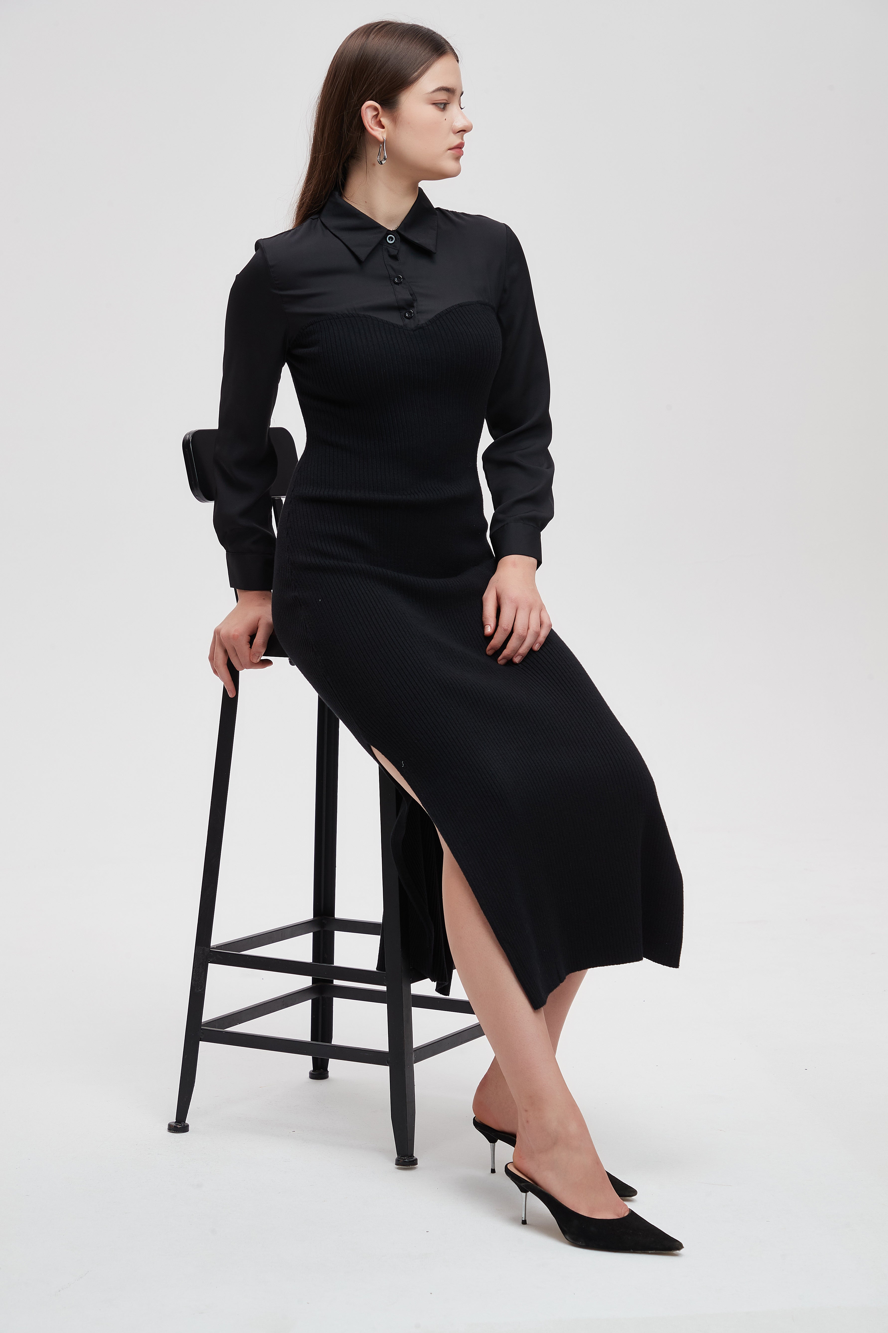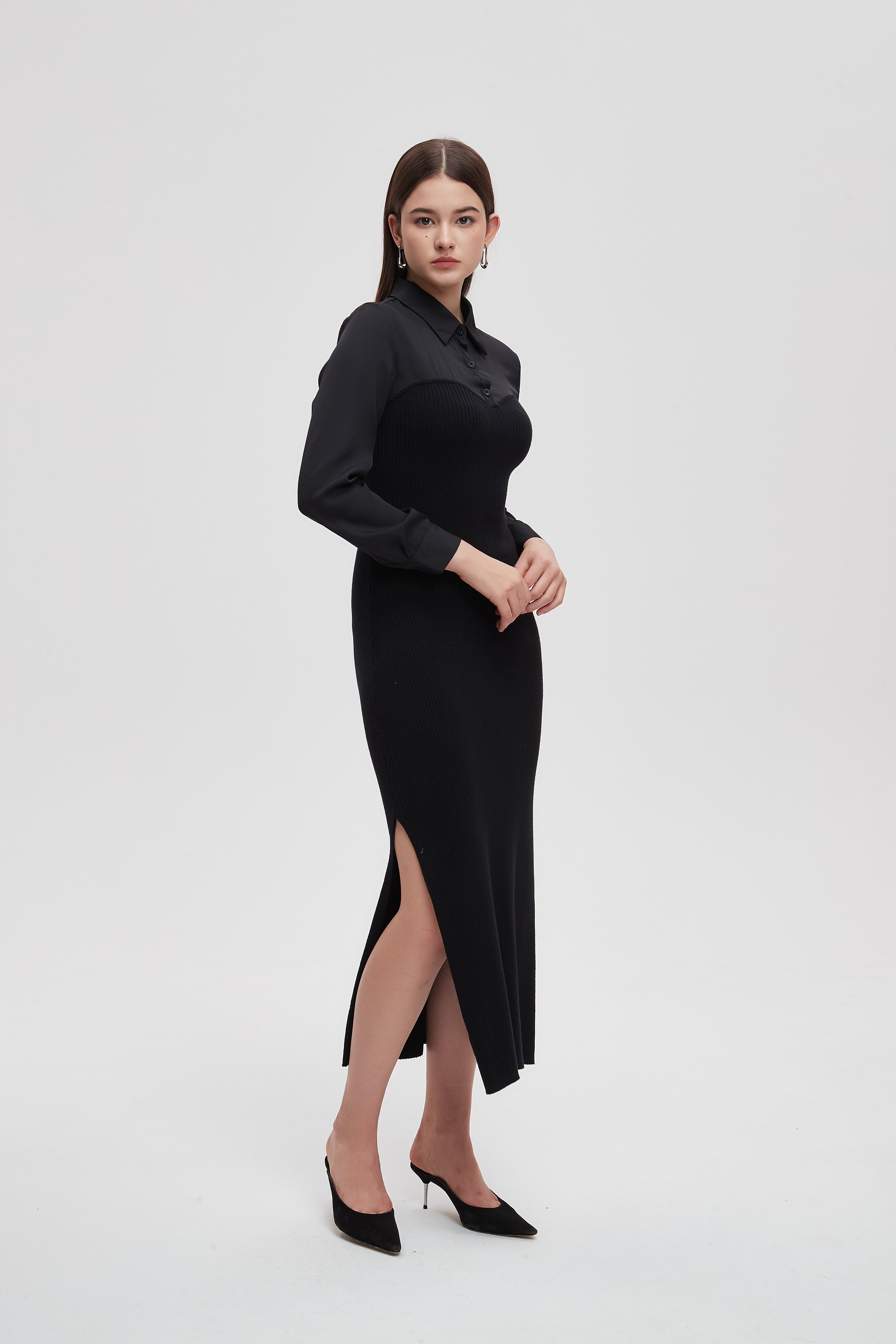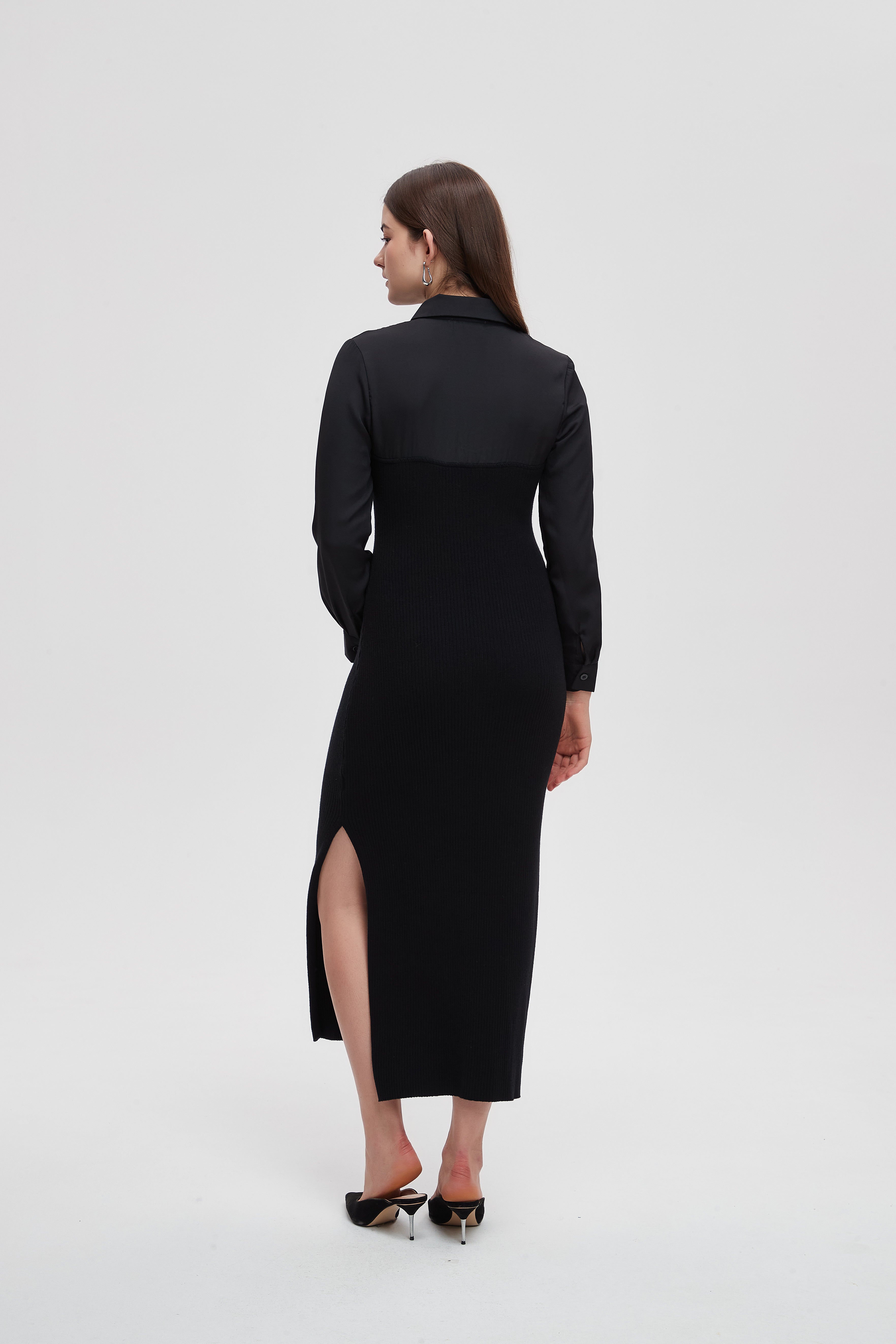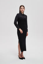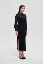 فستان طويل بفتحة جانبية بكم طويل سادة