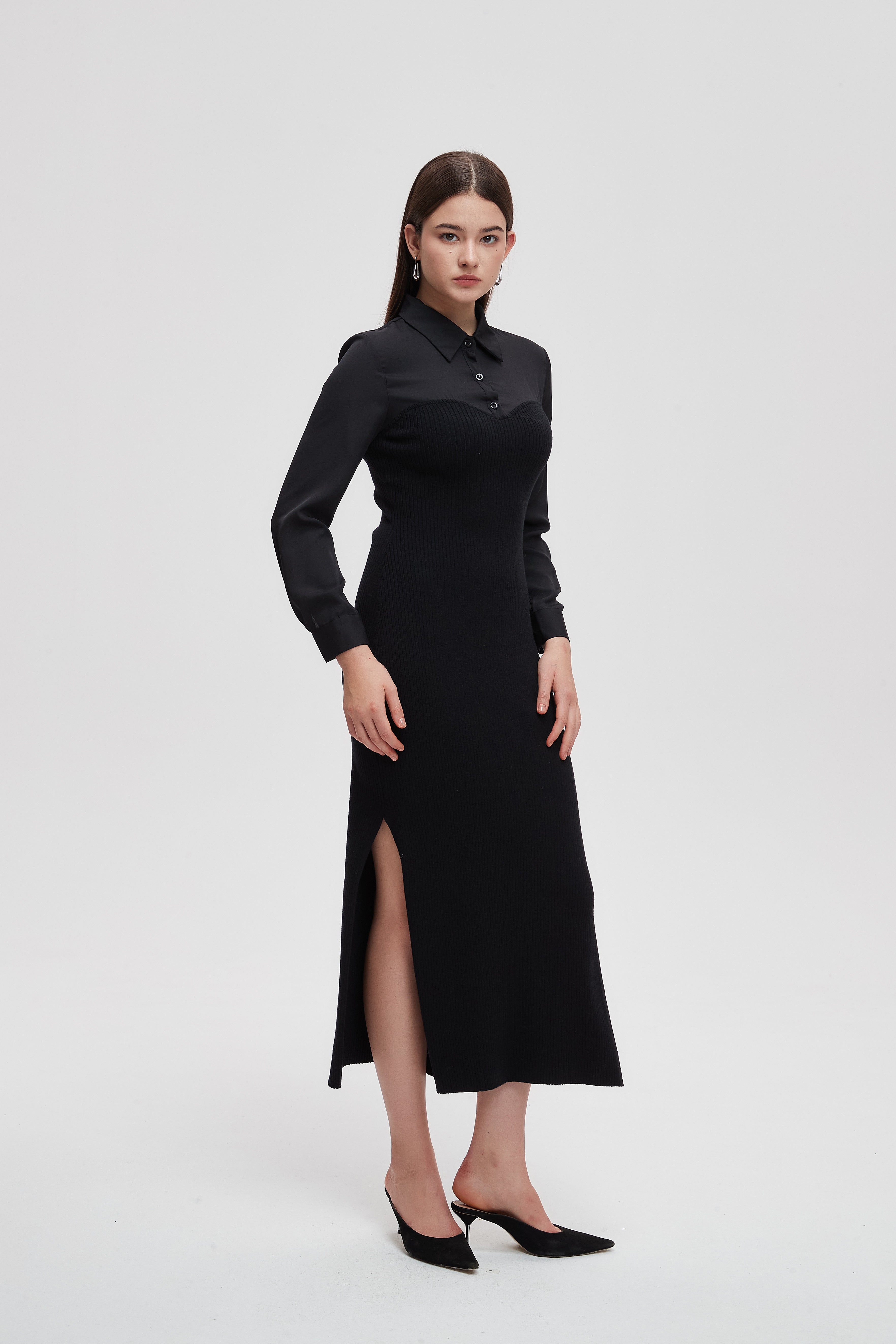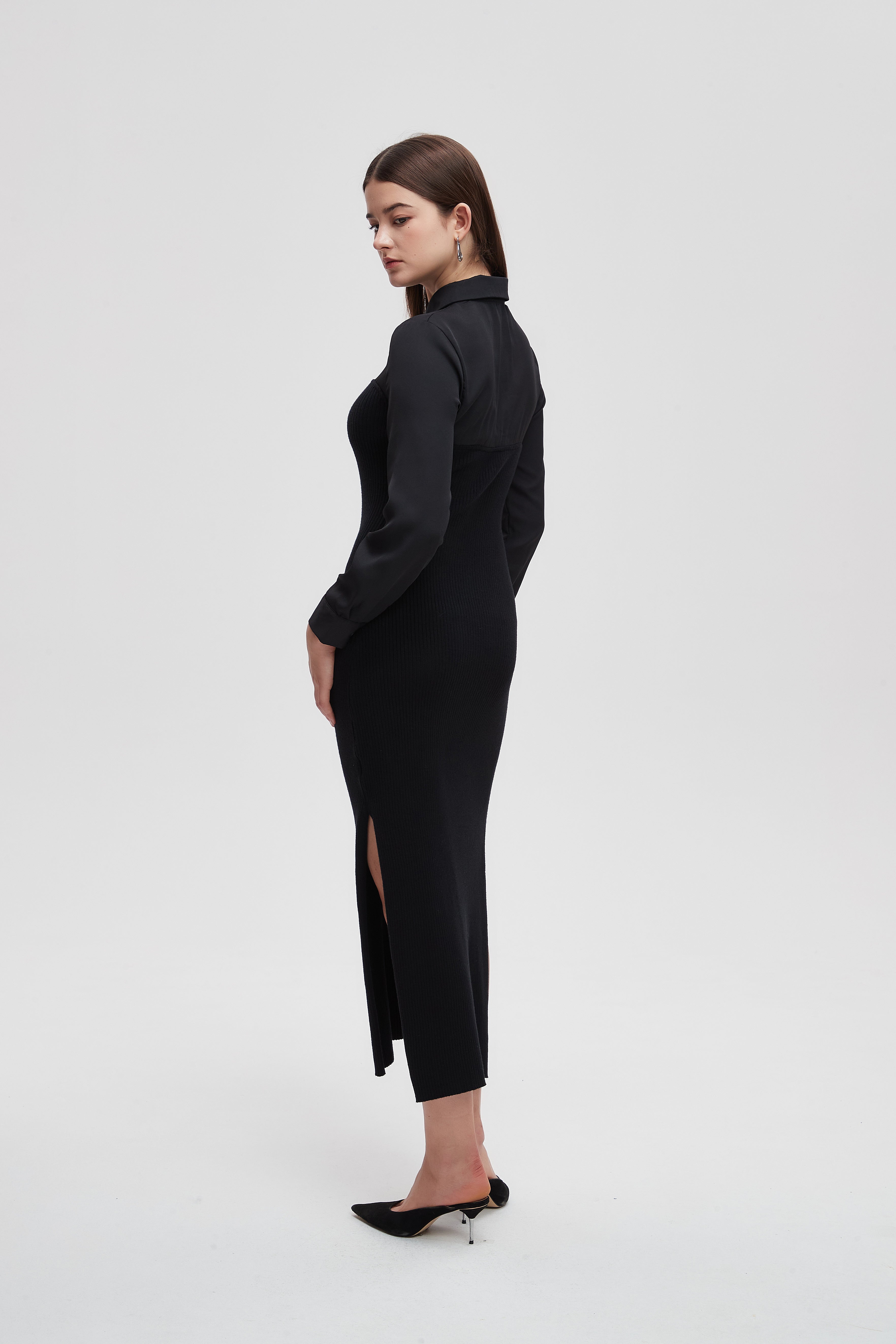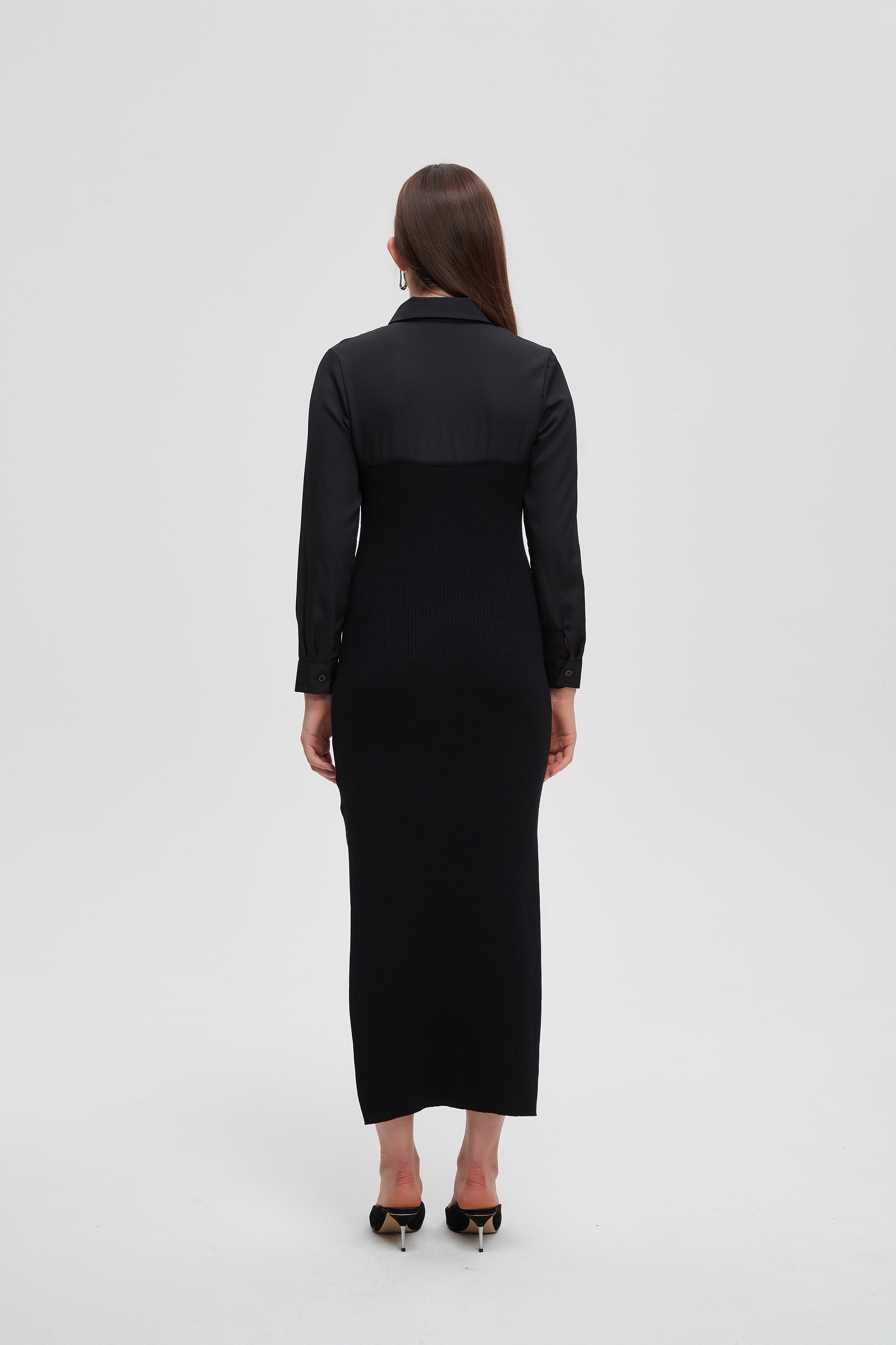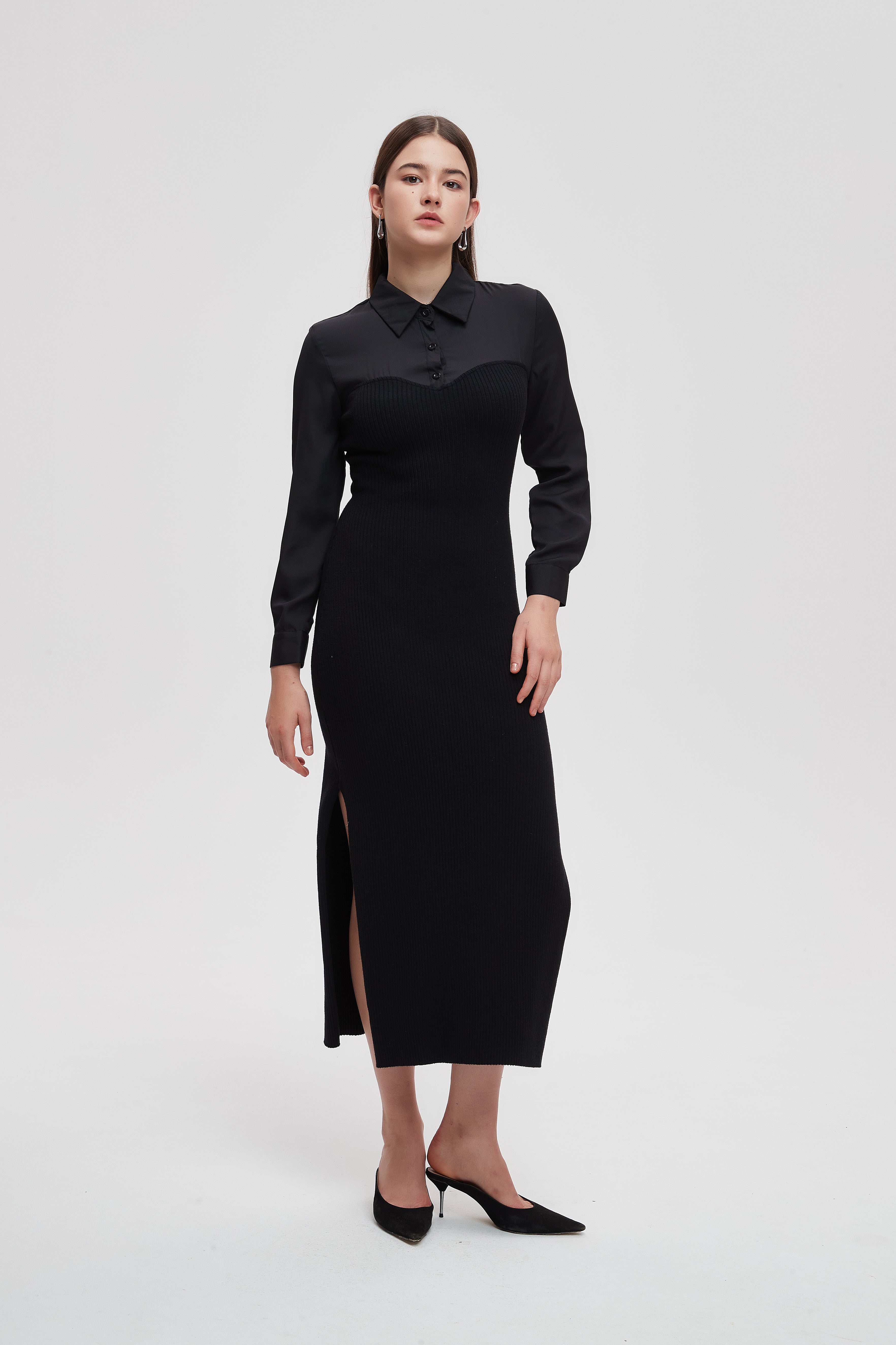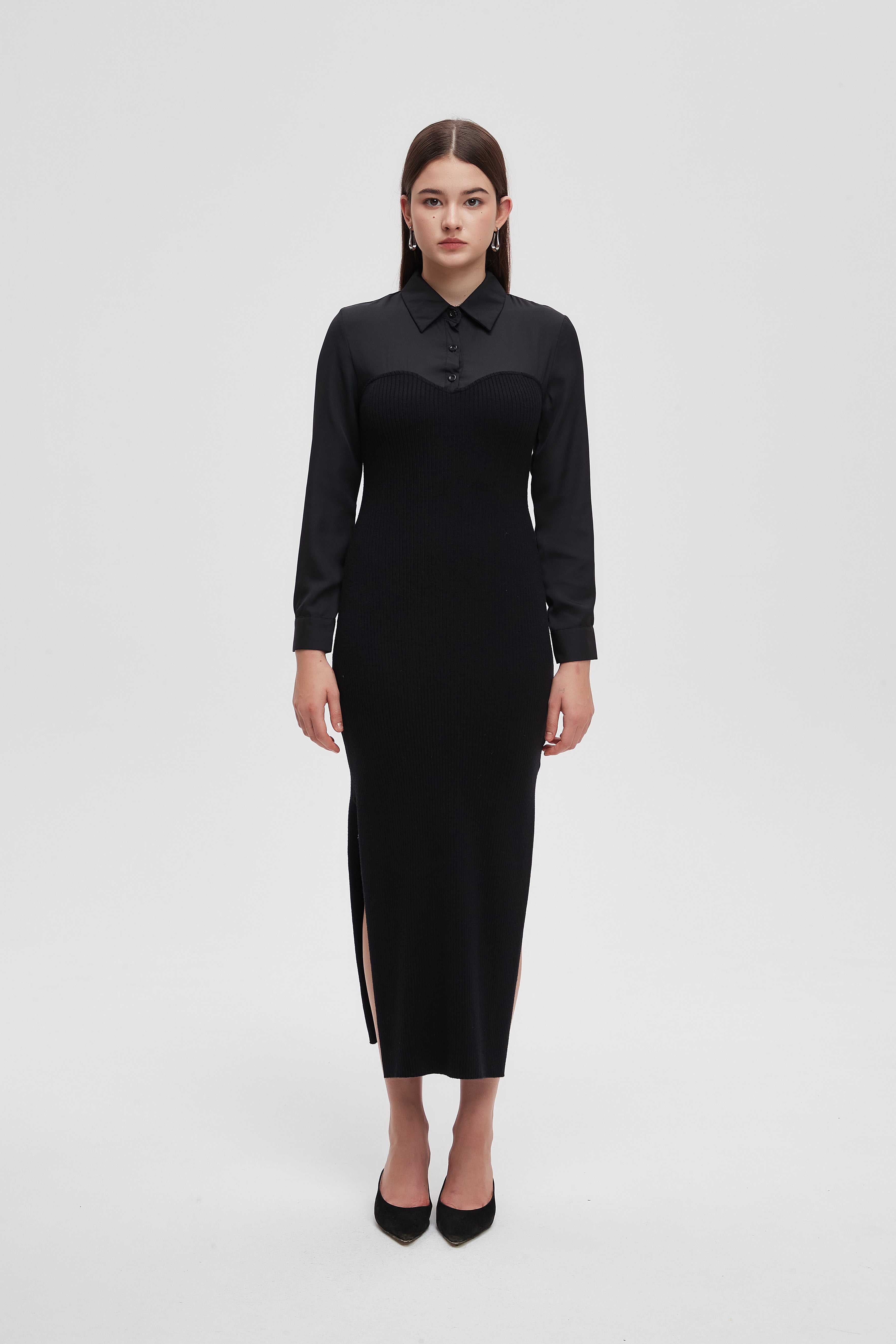 فستان طويل بفتحة جانبية بكم طويل سادة