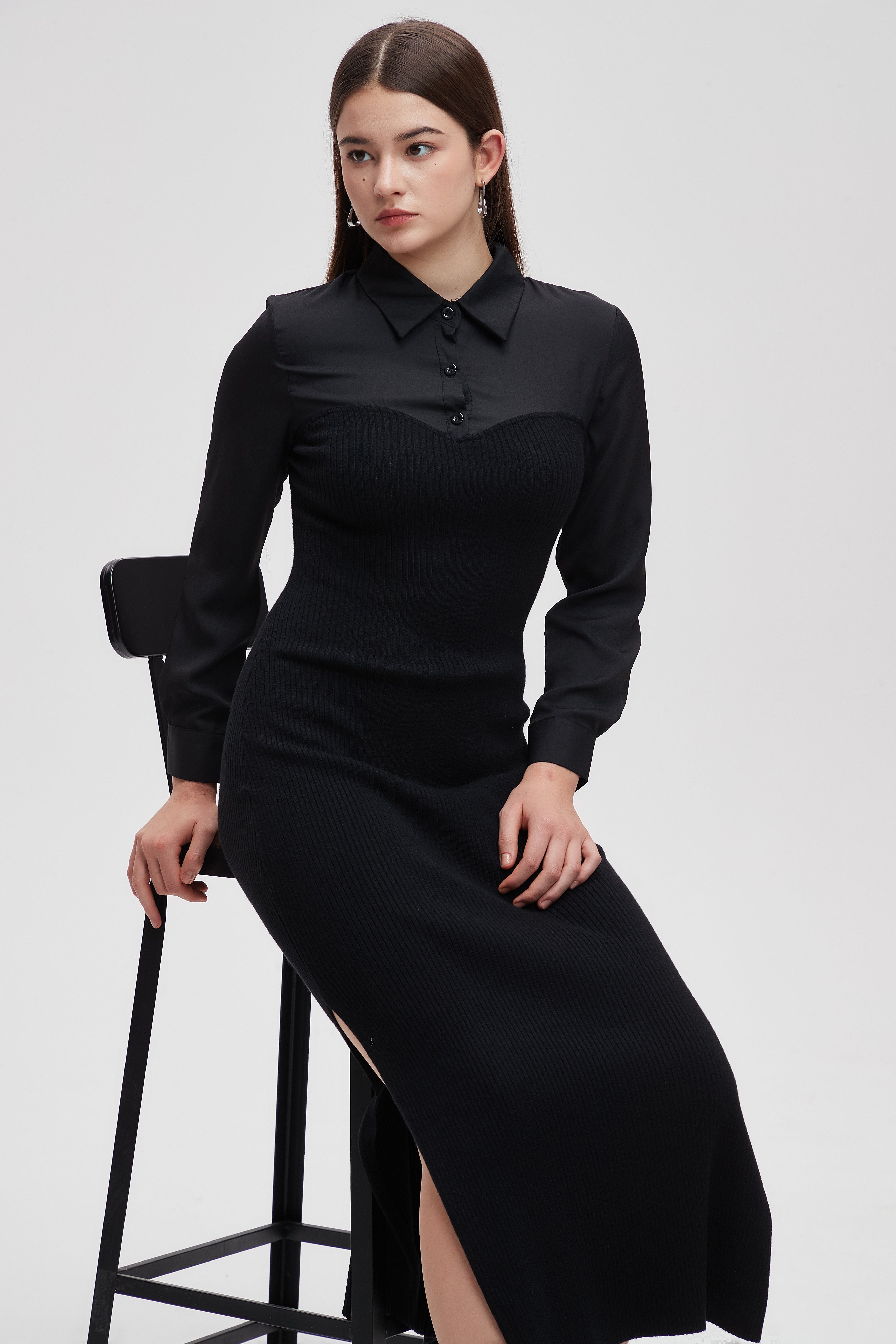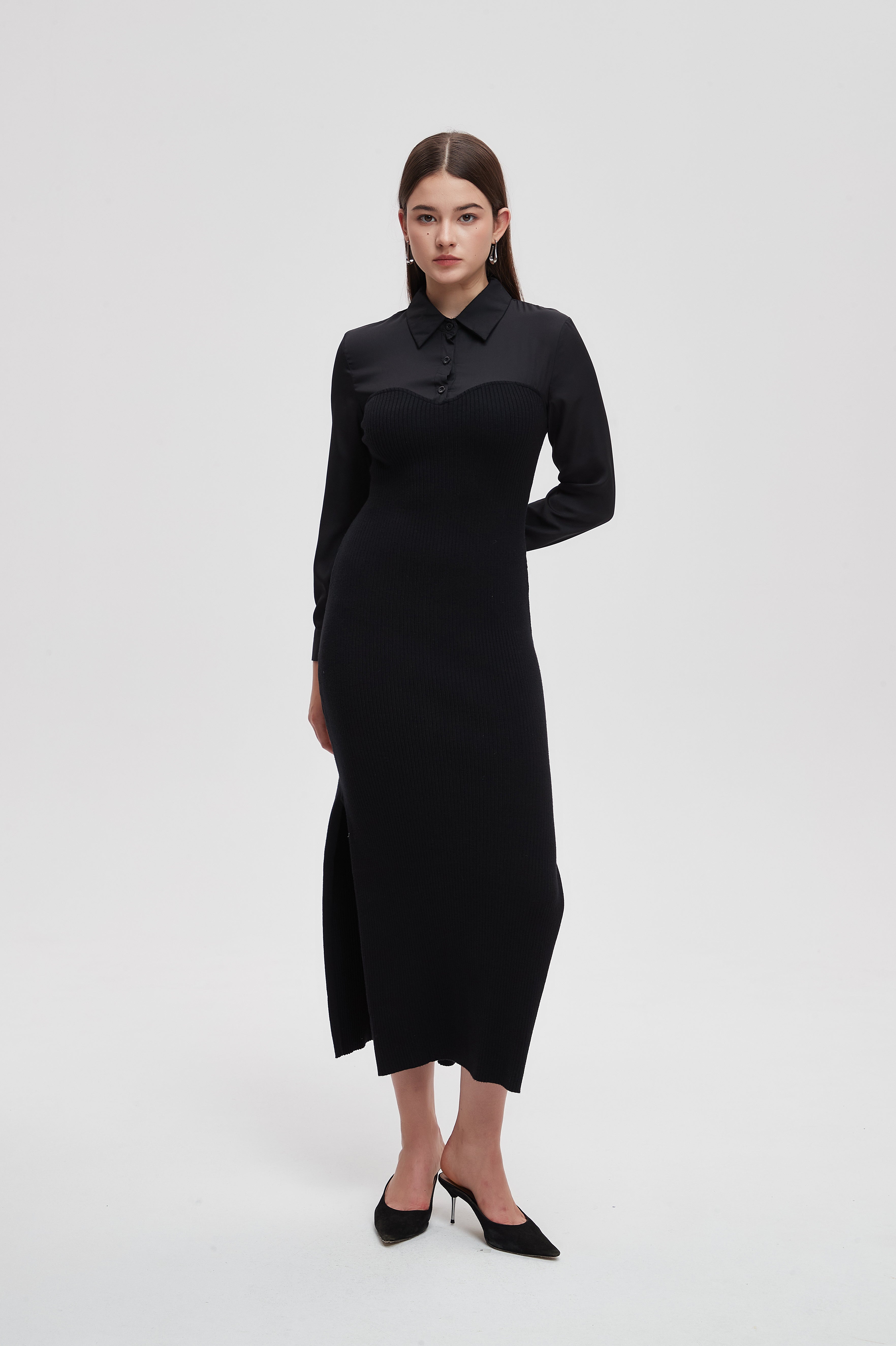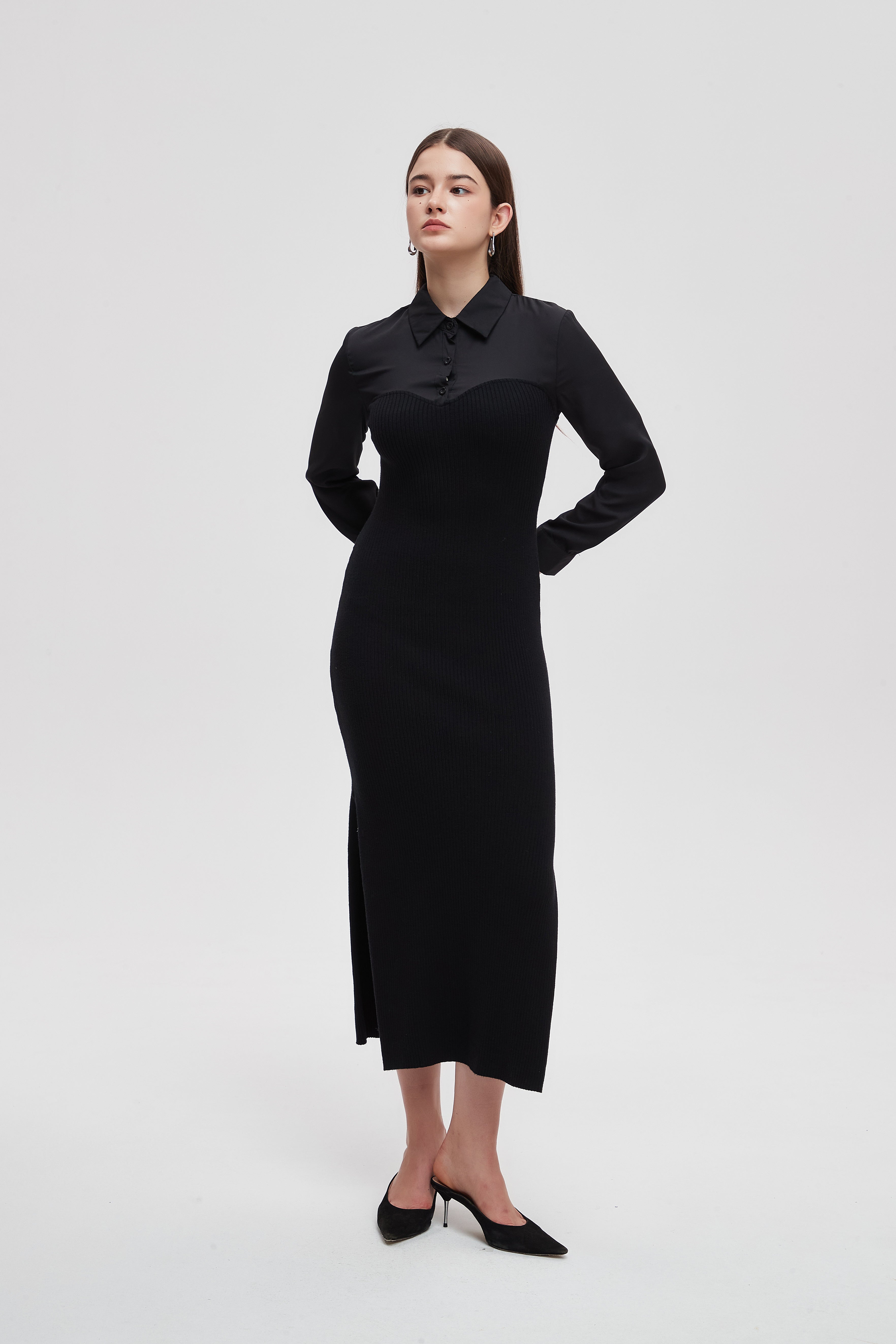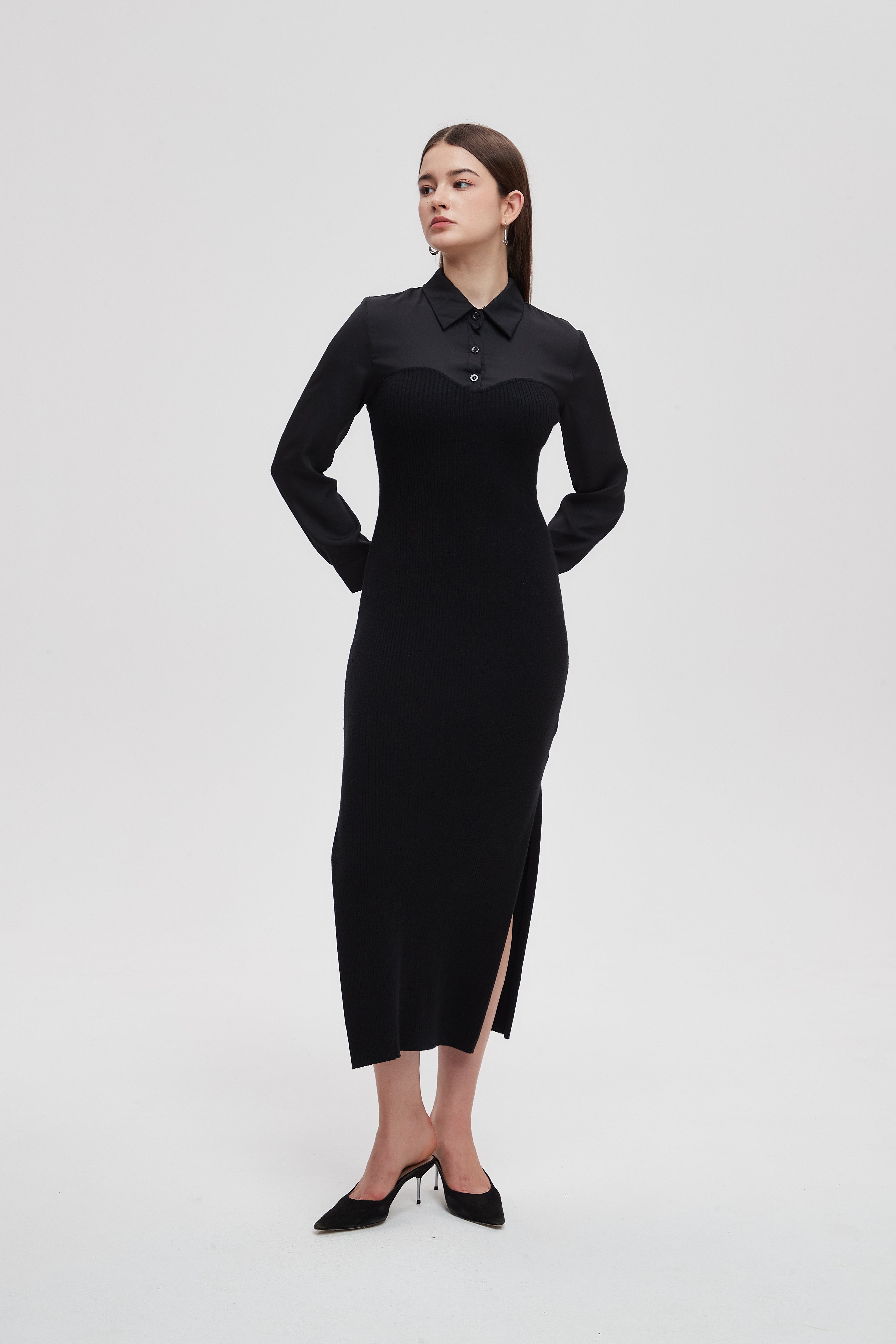 فستان طويل بفتحة جانبية بكم طويل سادة