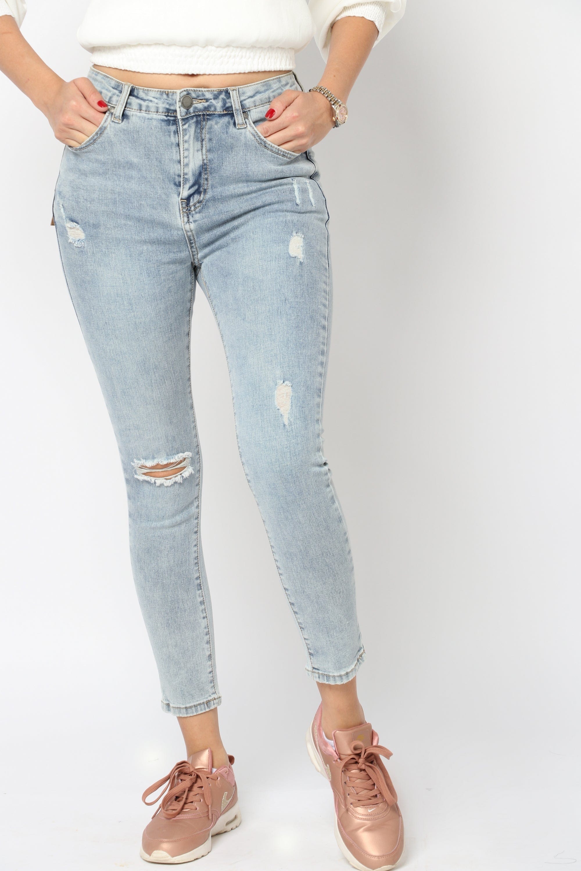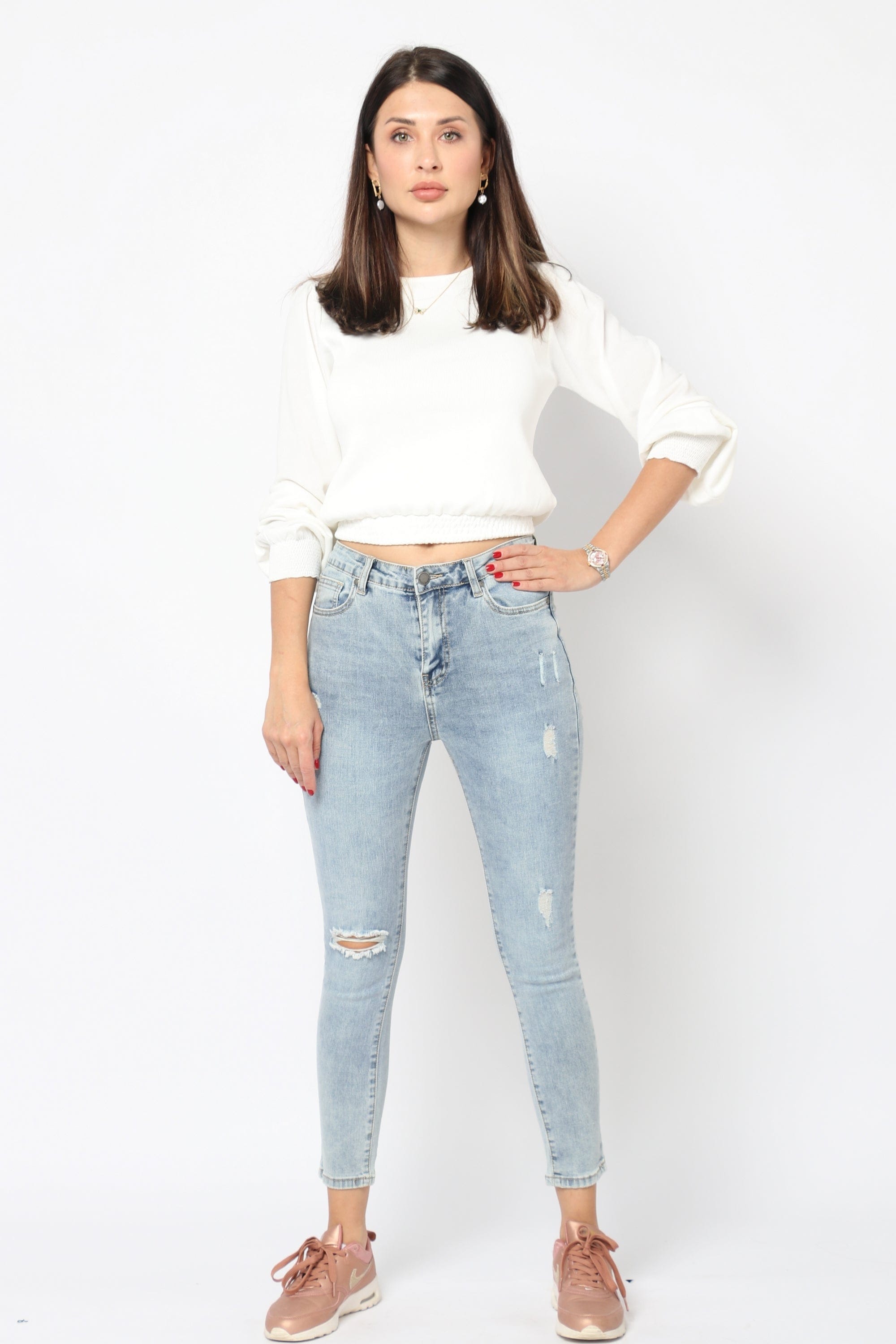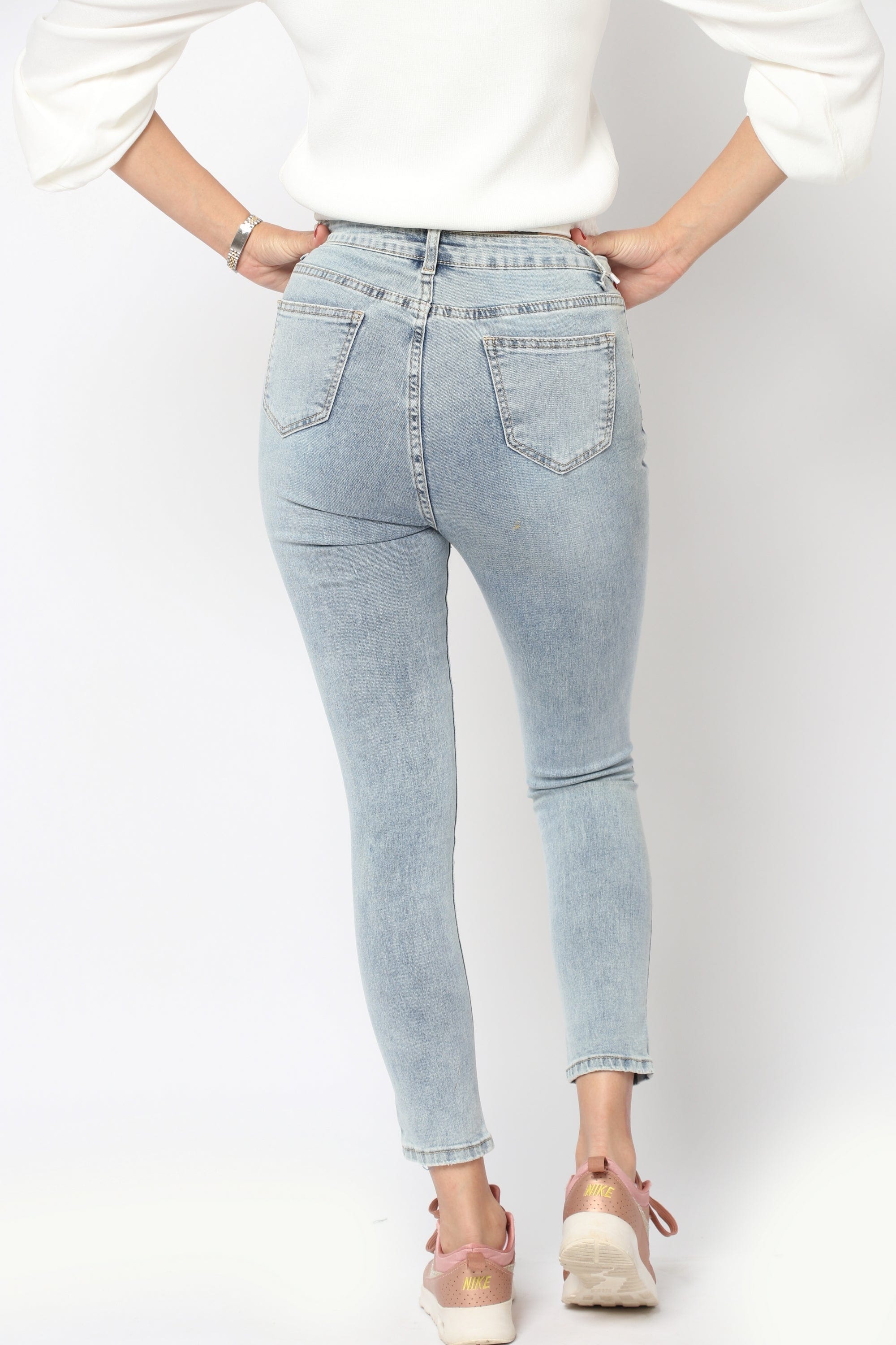 بنطلون جينز مقطع بسحاب وزرار وجيوب سكيني طويل نسائي