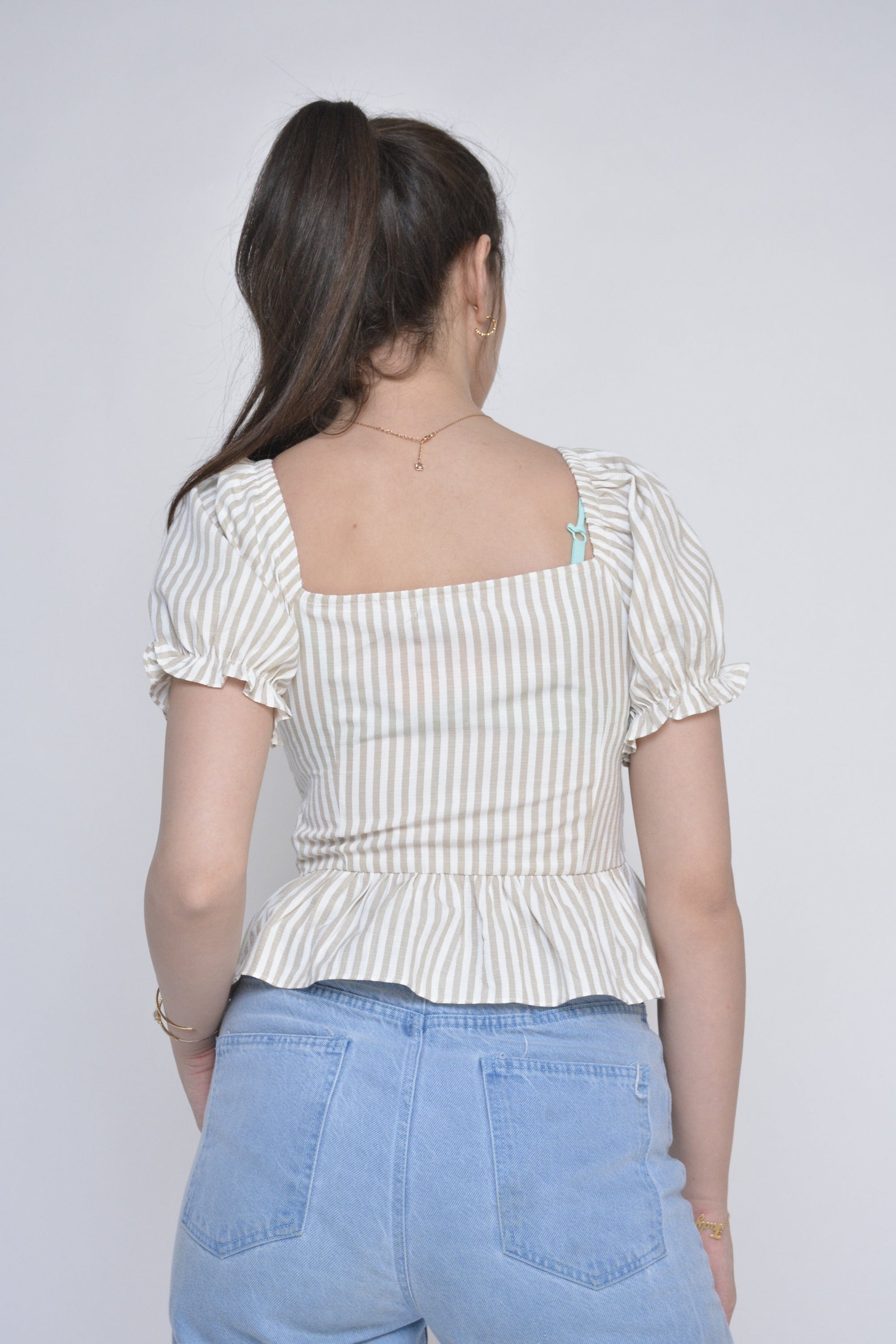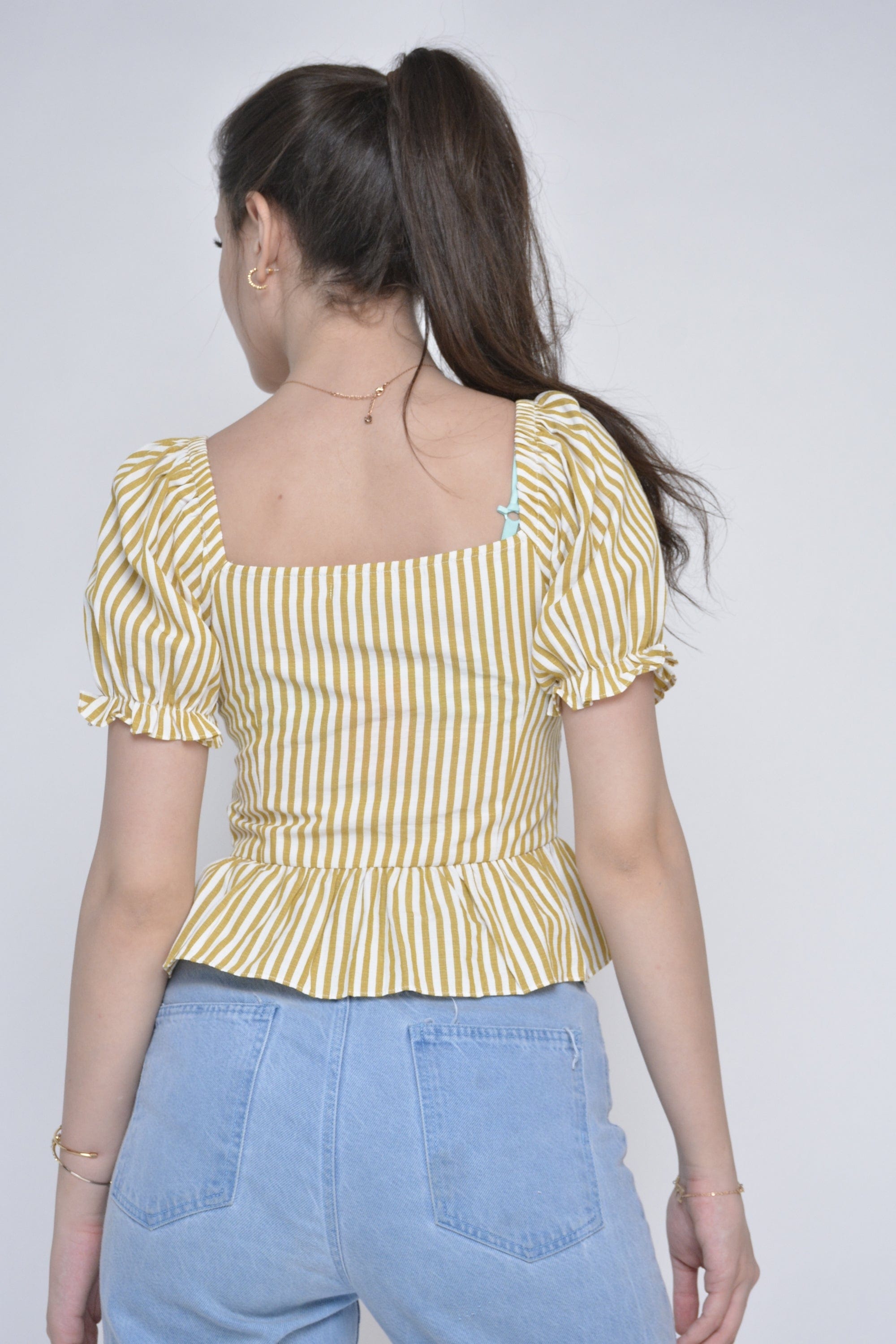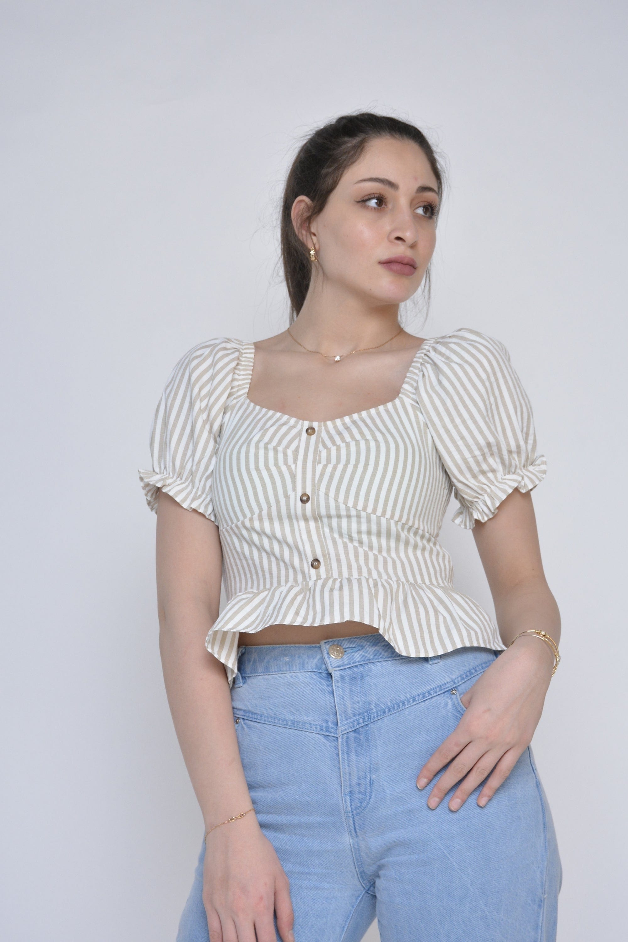بلوزة مقلمة بالطول كم قصير بف بأزرار أمامية نسائي