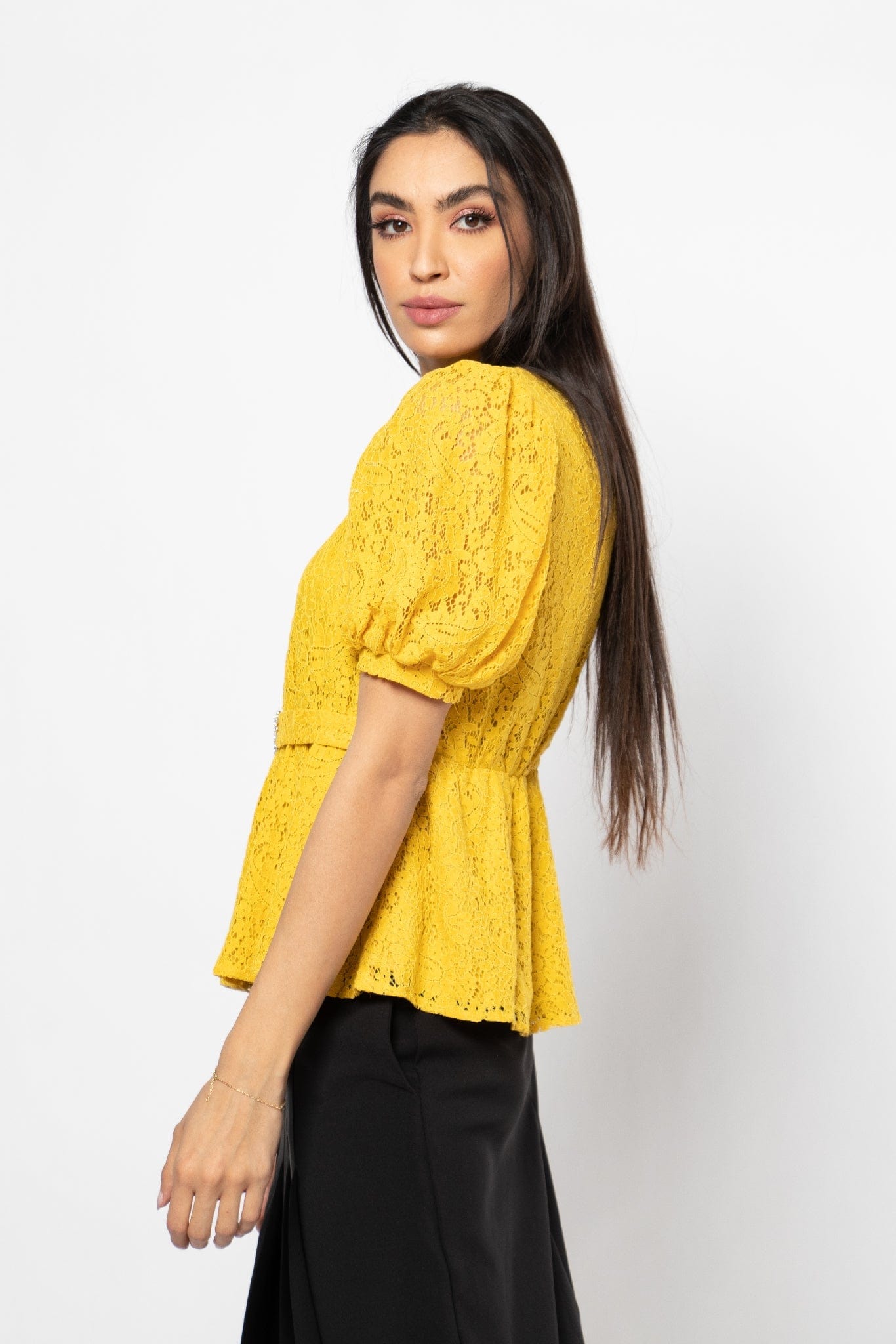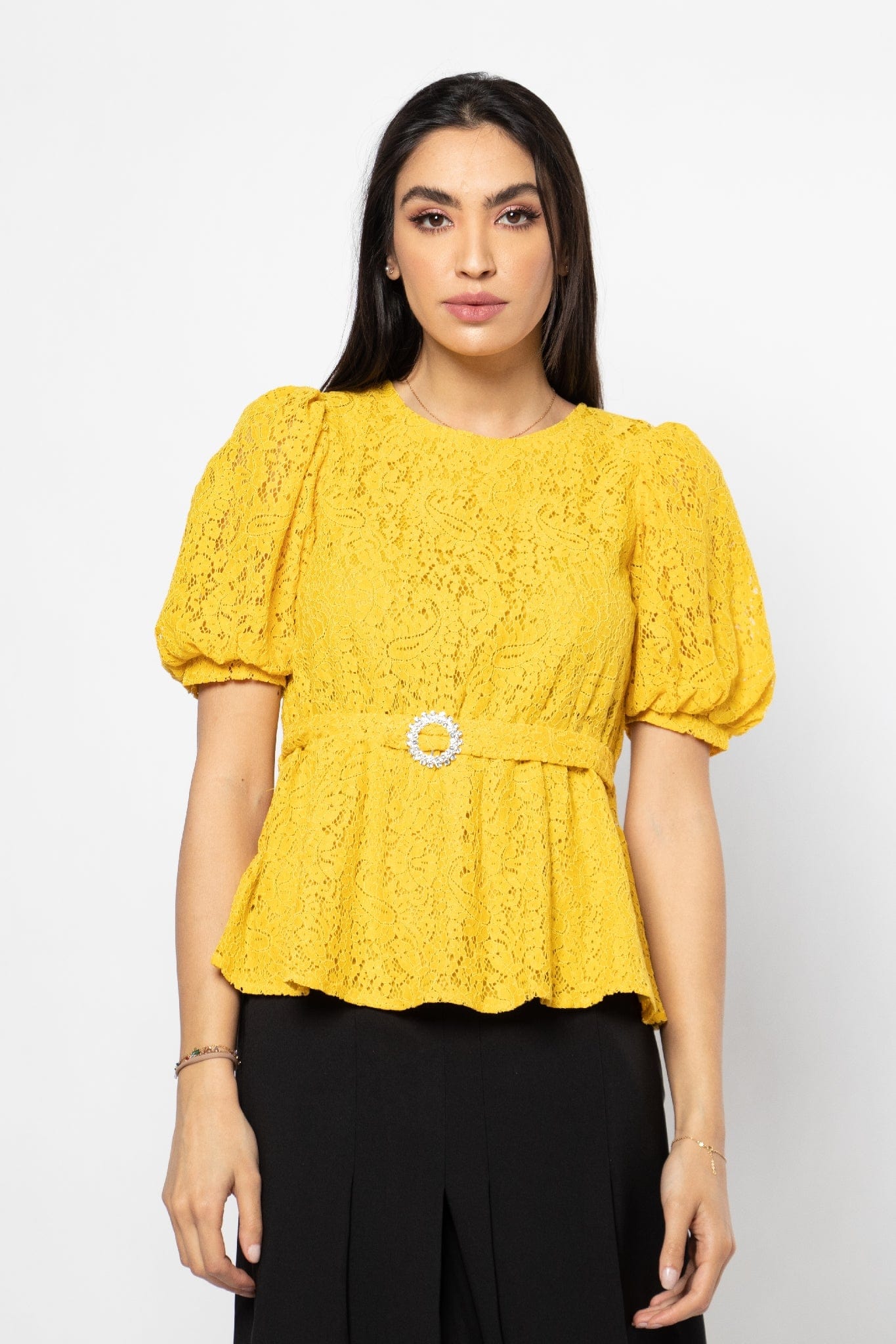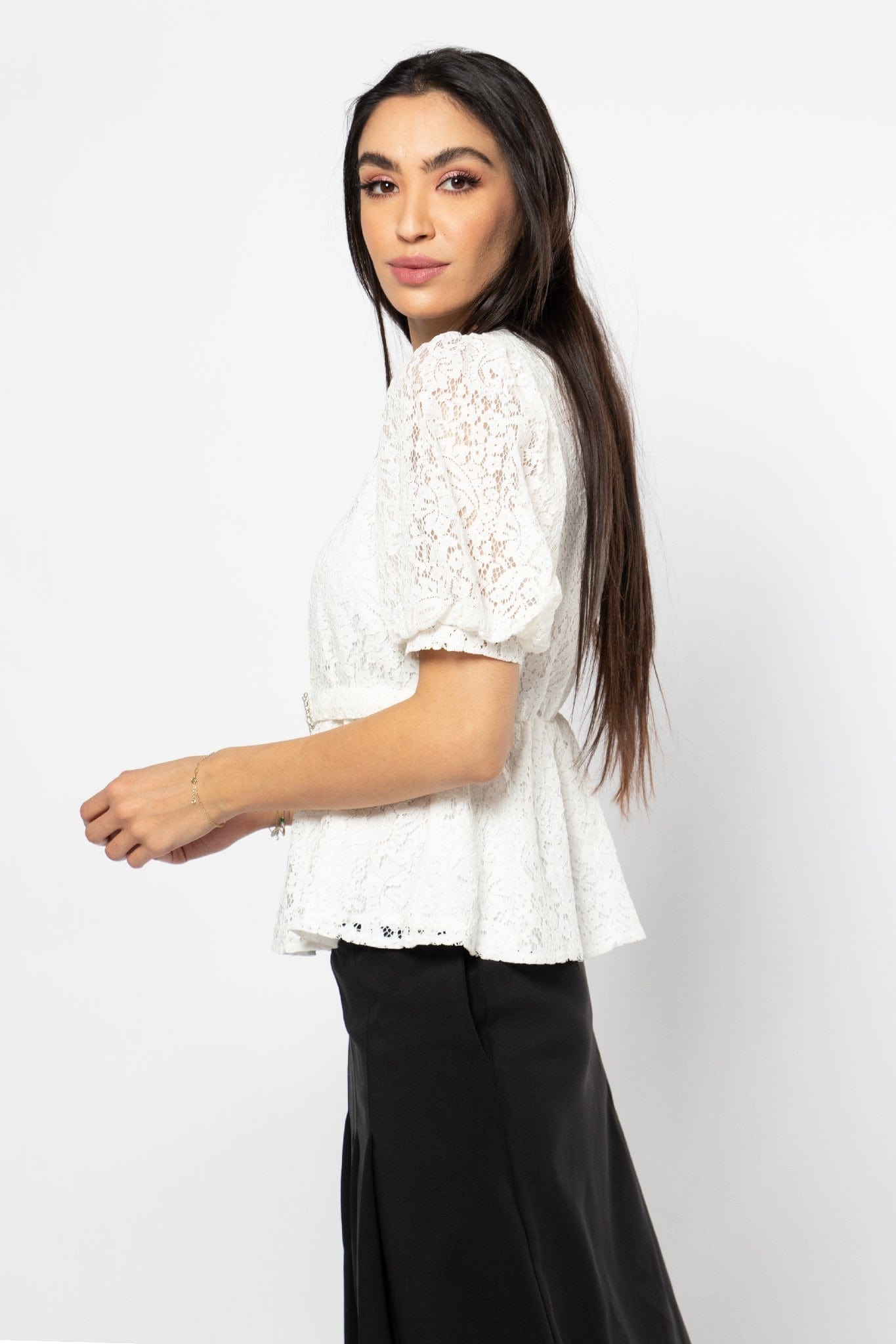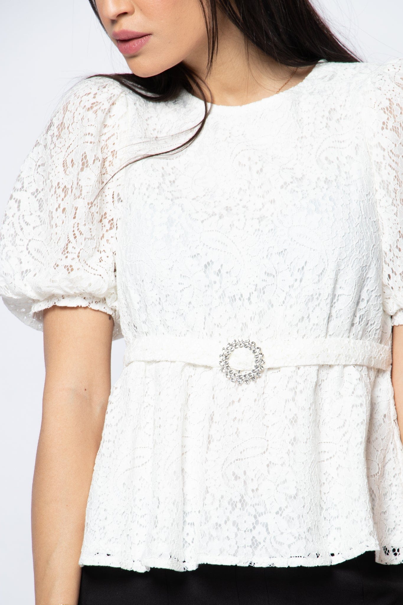 بلوزة دانتيل بحزام كم قصير منفوخ نسائي