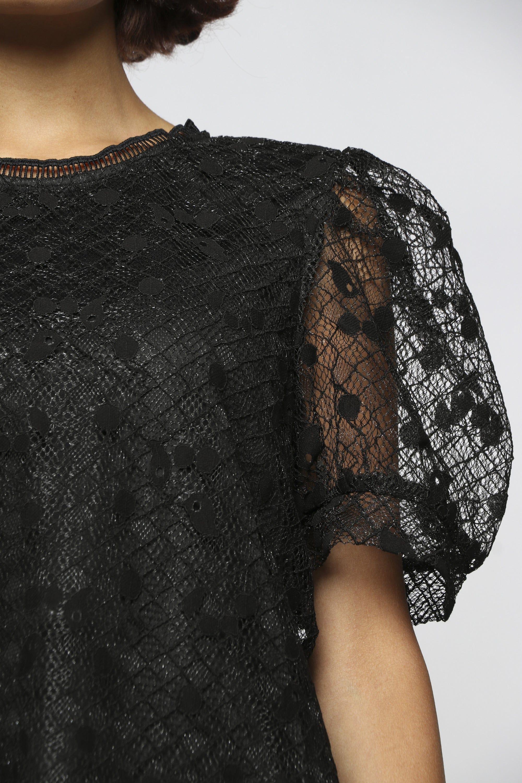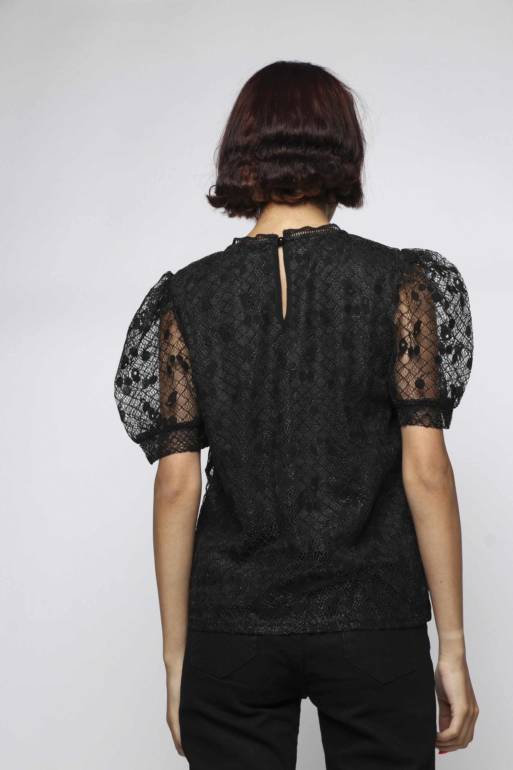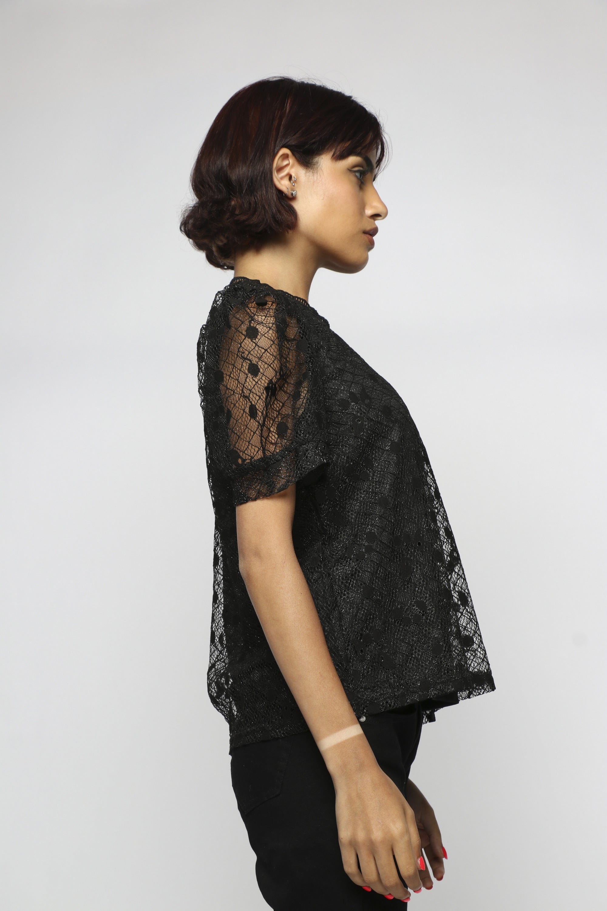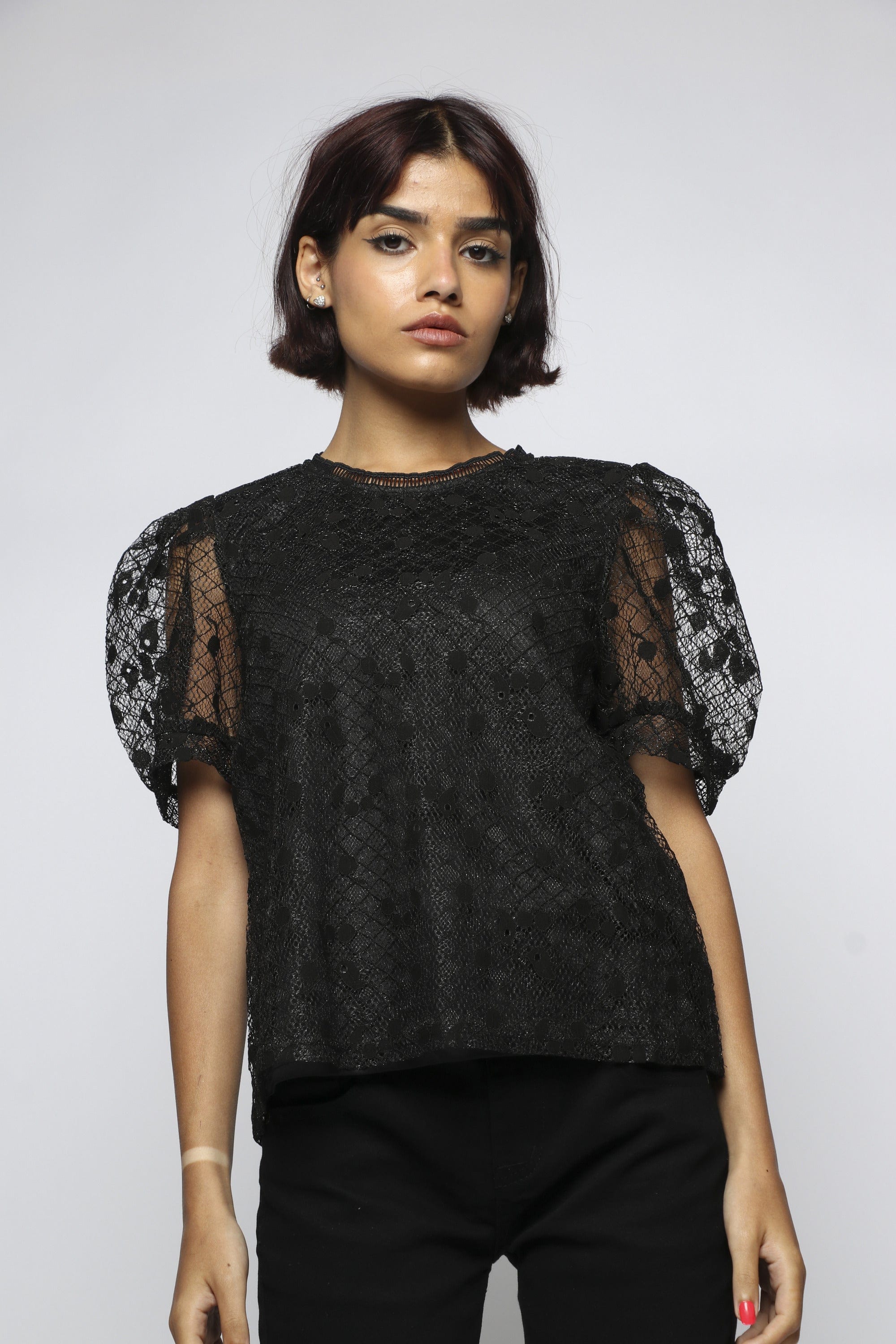 بلوزة بأكمام قصيرة شفافة بياقة دائرية