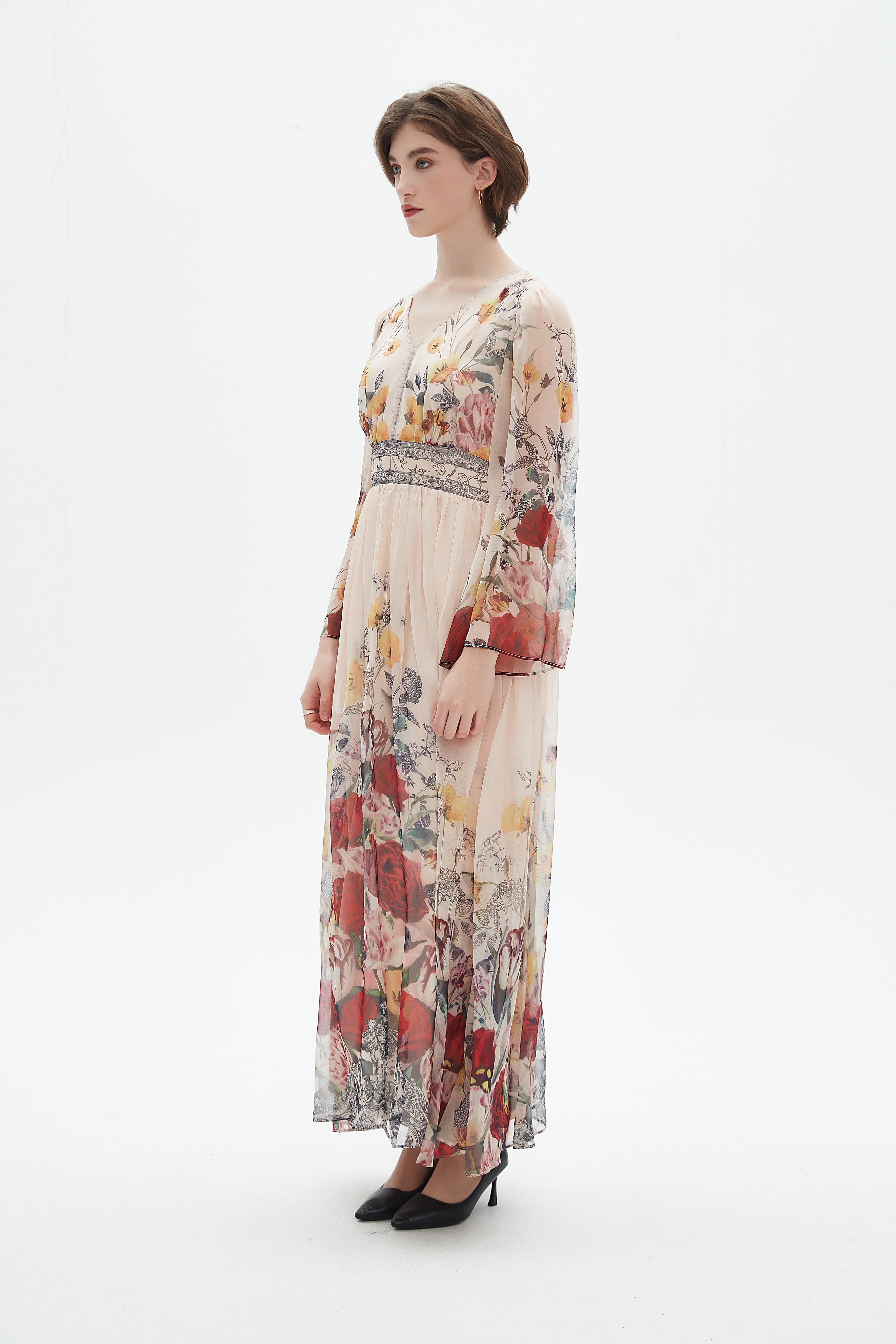 فستان نسائي ماكسي مورد بكم طويل وقصة واسعة