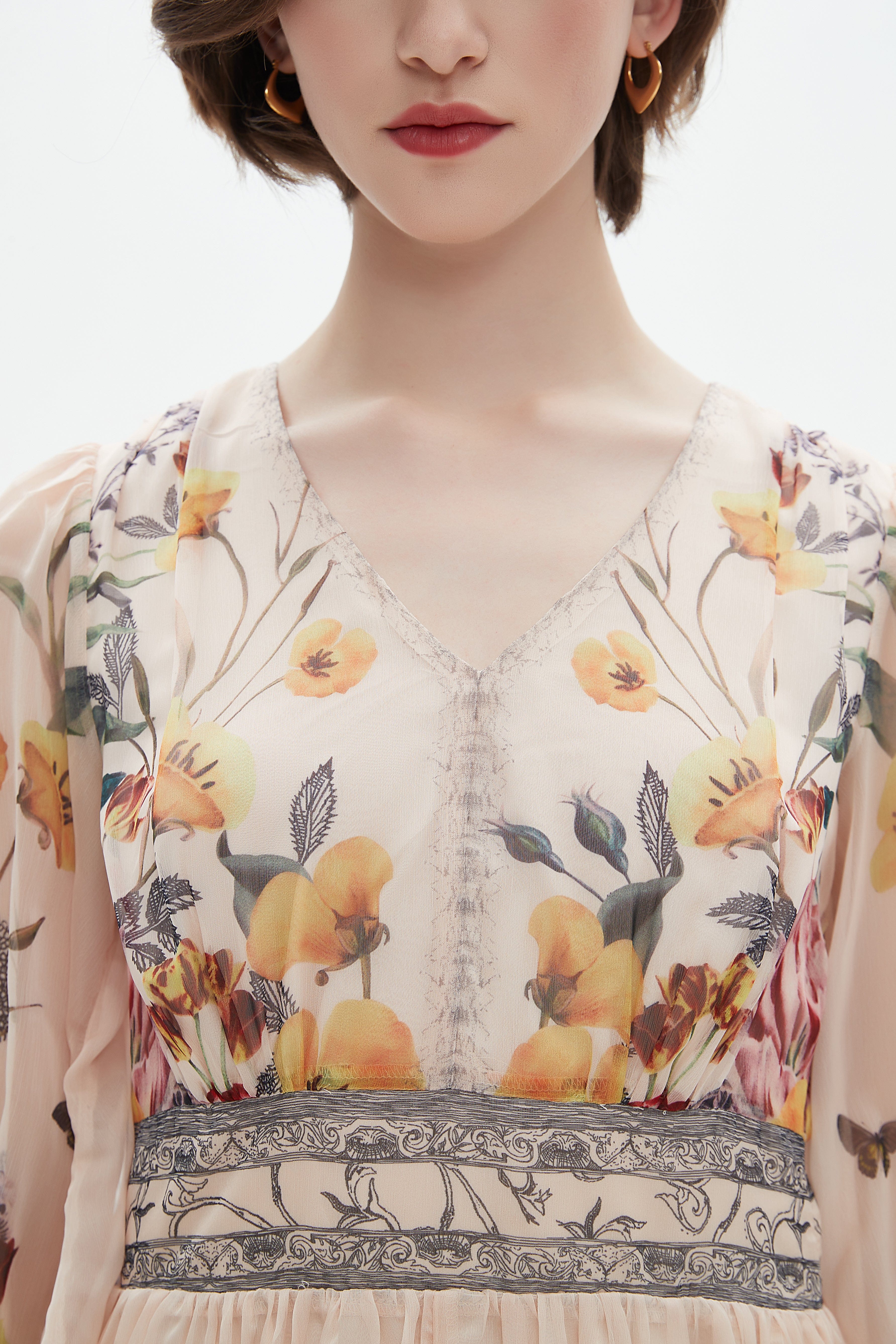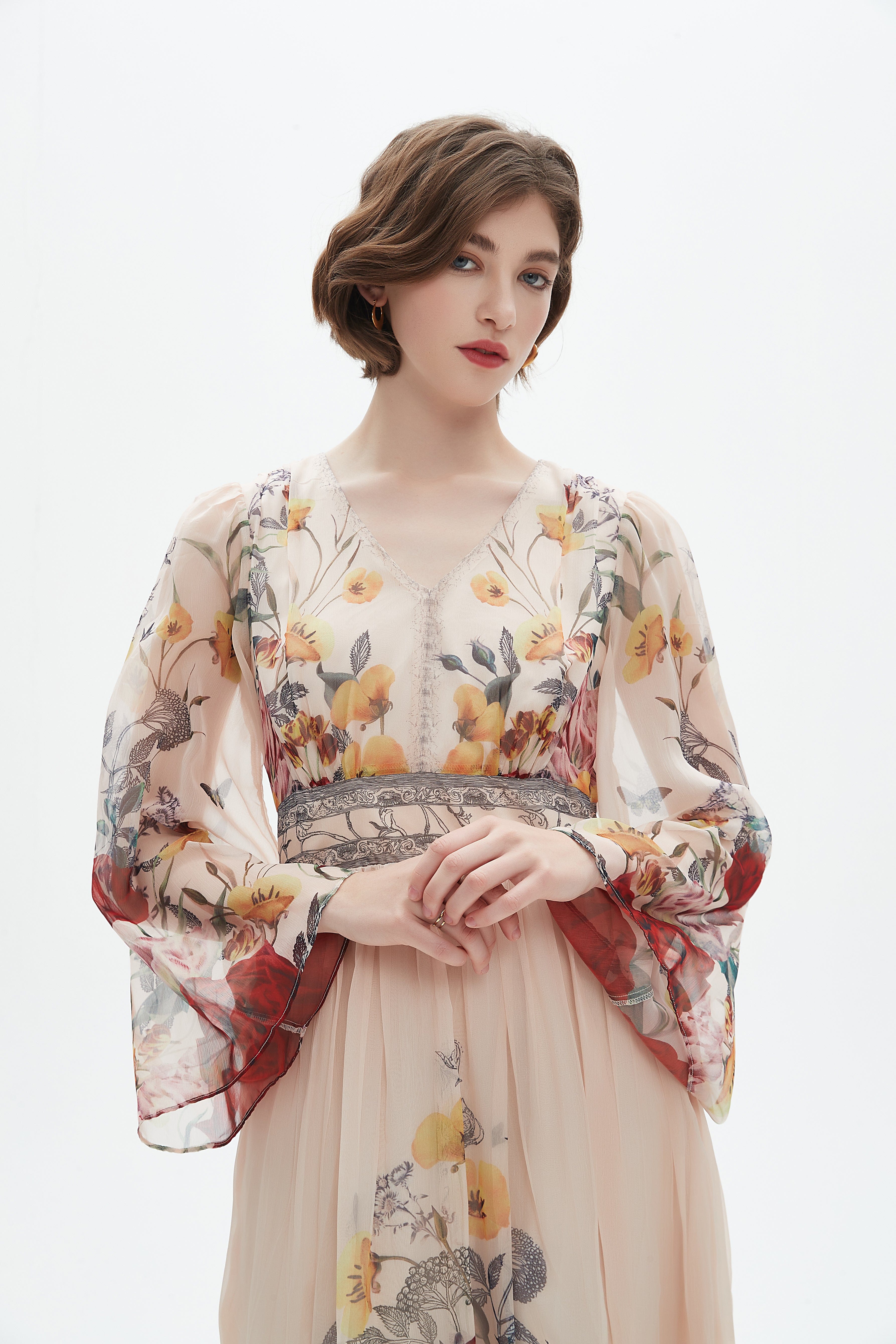 - العناية: اغسلي الفستان بماء بارد أو دورة غسيل خفيفة، استخدمي غسولاً لطيفاً مع ألوان مماثلة، لا تبيّضي، كوي على حرارة منخفضة أو بالهواء بعد التسوية؛ تجنبي درجات حرارة عالية للحفاظ على الطباعة.