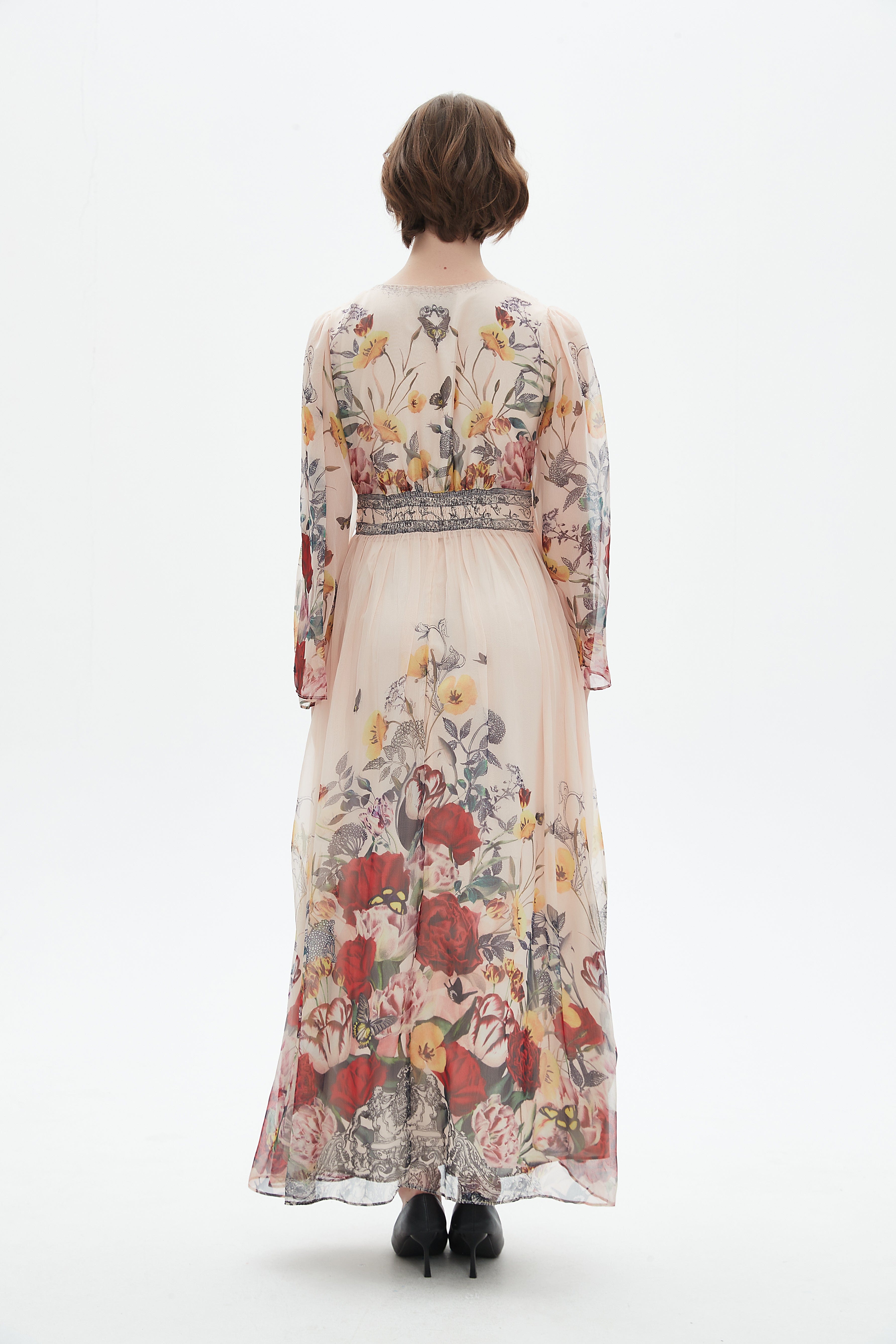لما تبحثين عن فستان يجمع بين طابع أنثوي وأسلوب عملي، هذا الفستان ماكسي بقصة A هو خيار مثالي. الخامة الأساسية من بوليستر 100% تمنحه ملمساً خفيفاً ومتانة وسهولة في العناية، والبطانة من بوليستر 100% متاحة لتوفير لمسة ناعمة عند الحاجة أو يأتي الموديل أحياناً بدون بطانة لخيار أخف. الرقشة الزهرية بطباعة رقمية تمنح الفستان حياة وألواناً متعددة تناسب كل المواسم، وياقة V مع كم طويل تعطي توازناً بين الأناقة والتغطية. الطول الماكسي والقصة العادية يجعلانه مناسباً للمناسبات الأنيقة والخروجات النهارية على حد سواء؛ ستحبين كيف يتحرك معك عند المشي، ومثالي للخروجات الرومانسية أو لحفلة مسائية هادئة، ويمكن أن يصبح قطعة مميزة في خزانة ملابسك. اعثري على مقاسك في فاشن السعودية وأضيفي هذه القطعة المتنوعة إلى خزانة ملابسك اليوم.
