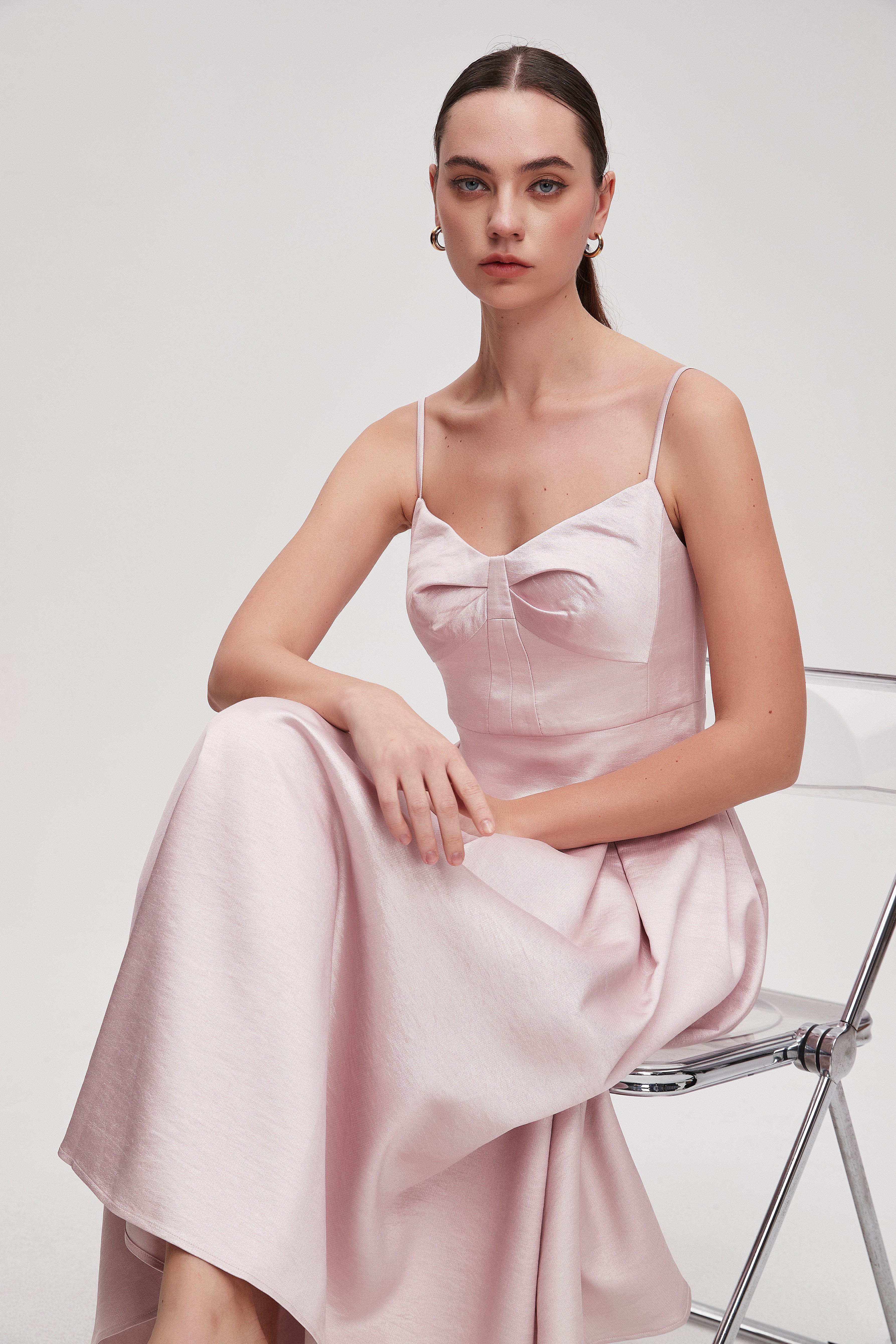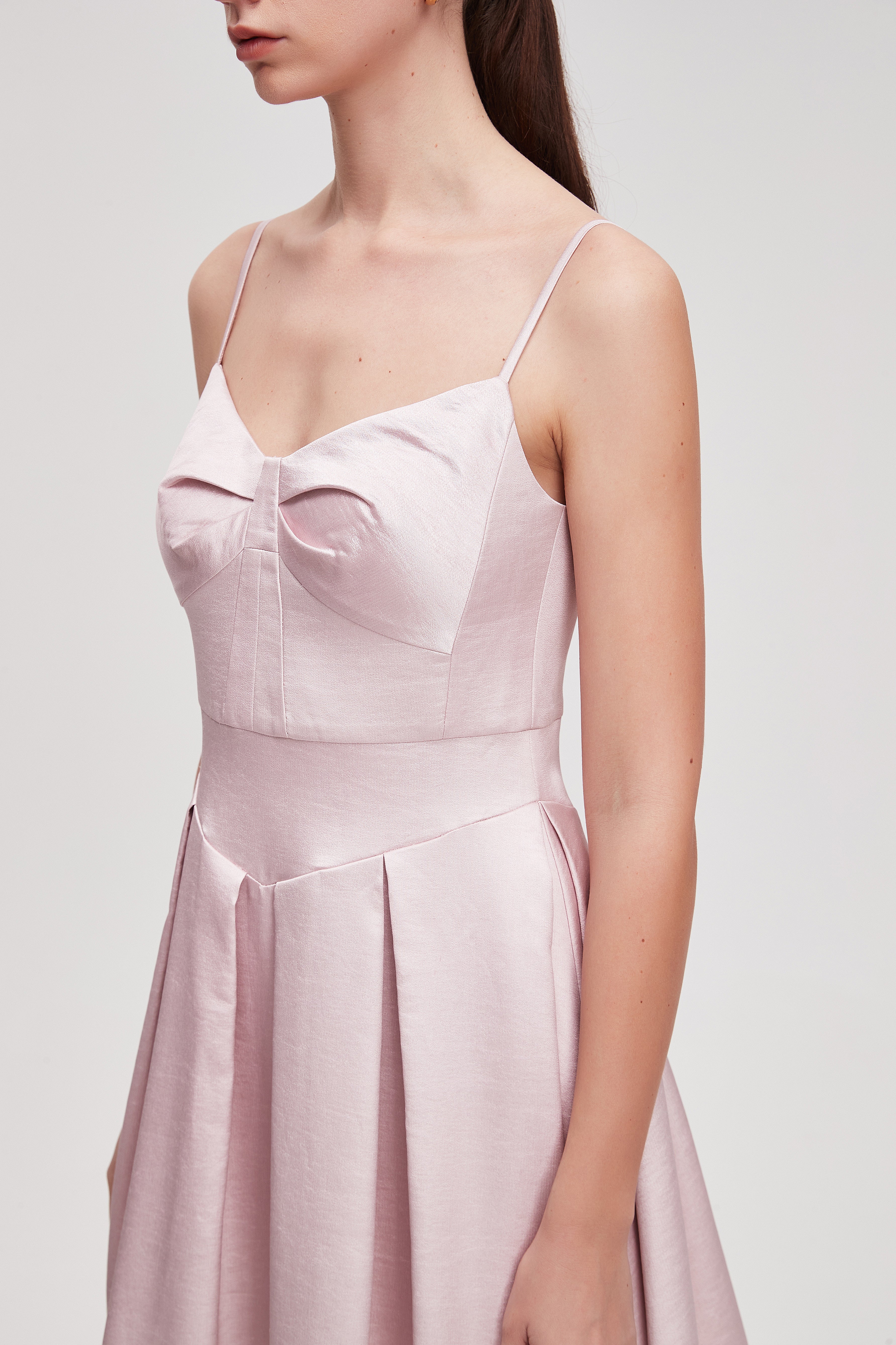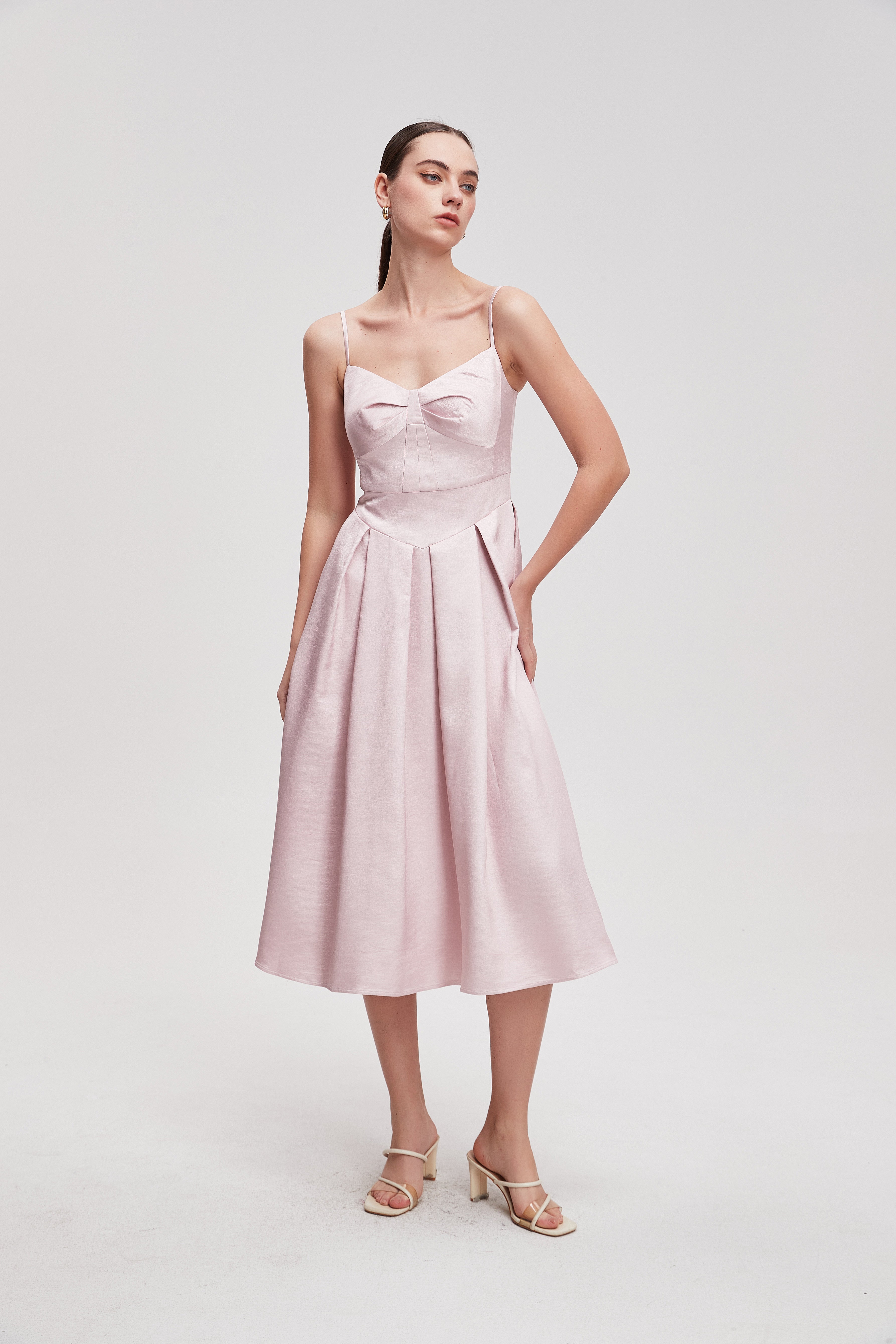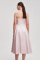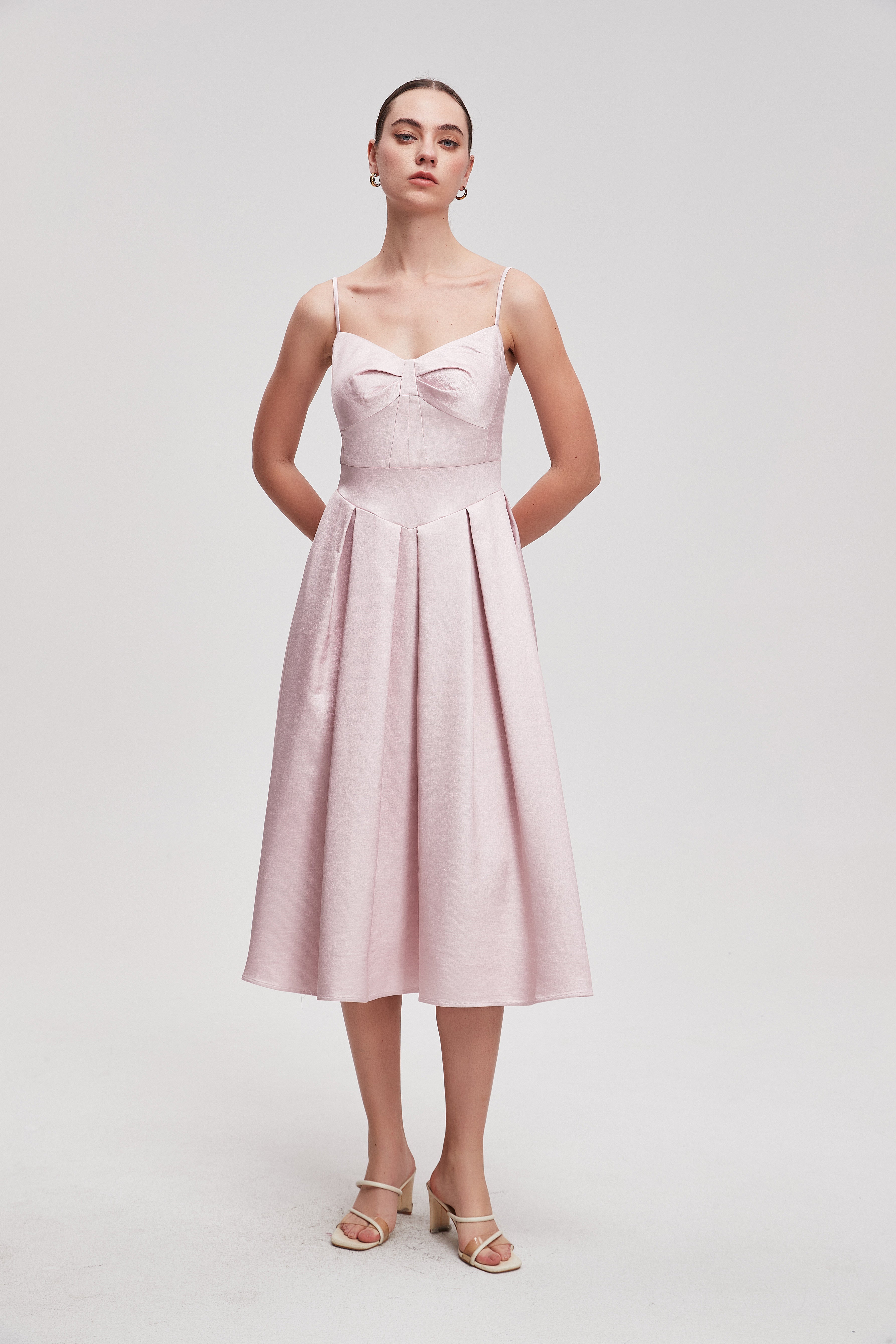 فستان ميدي سادة بحمالات بطيات