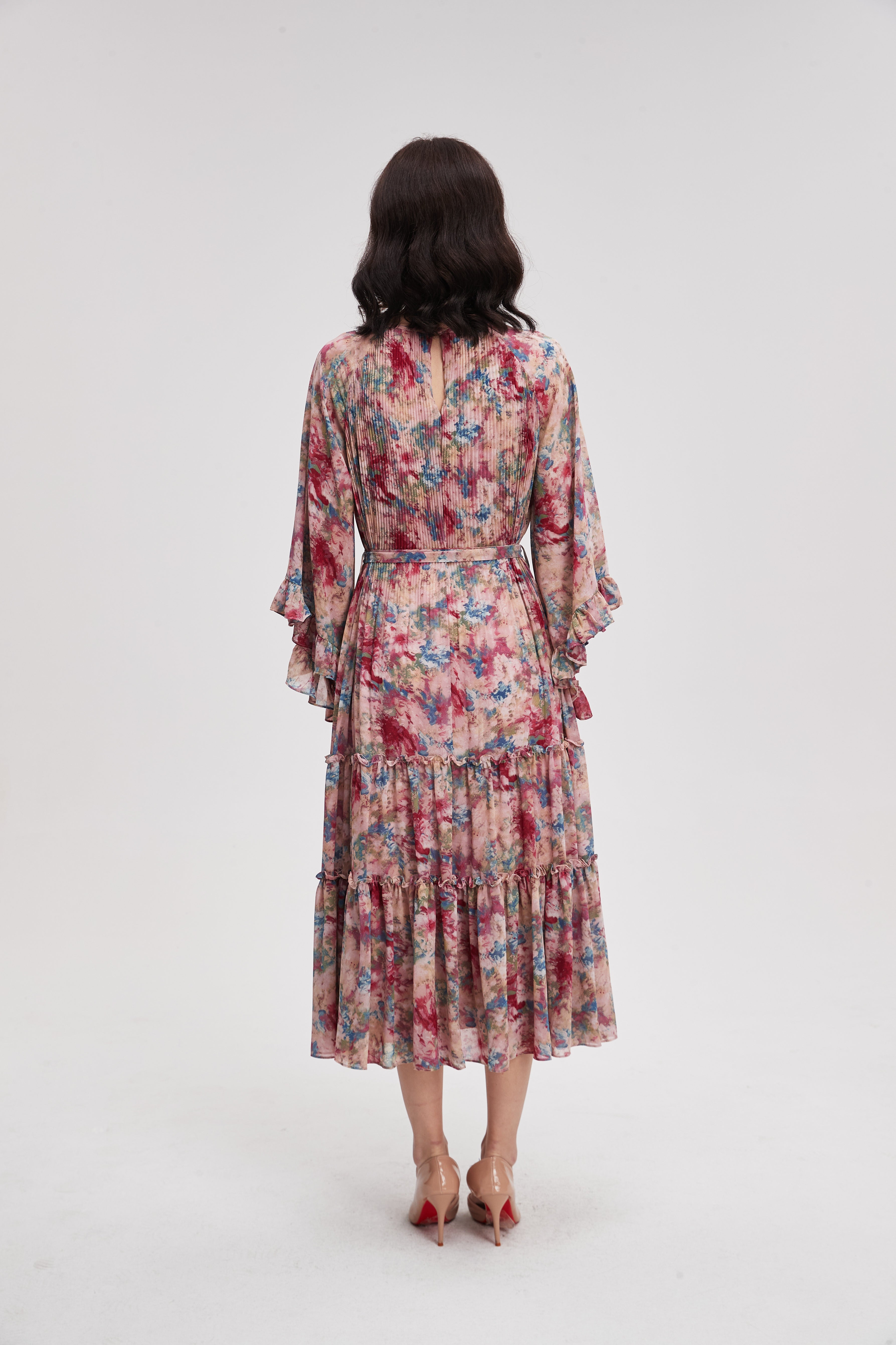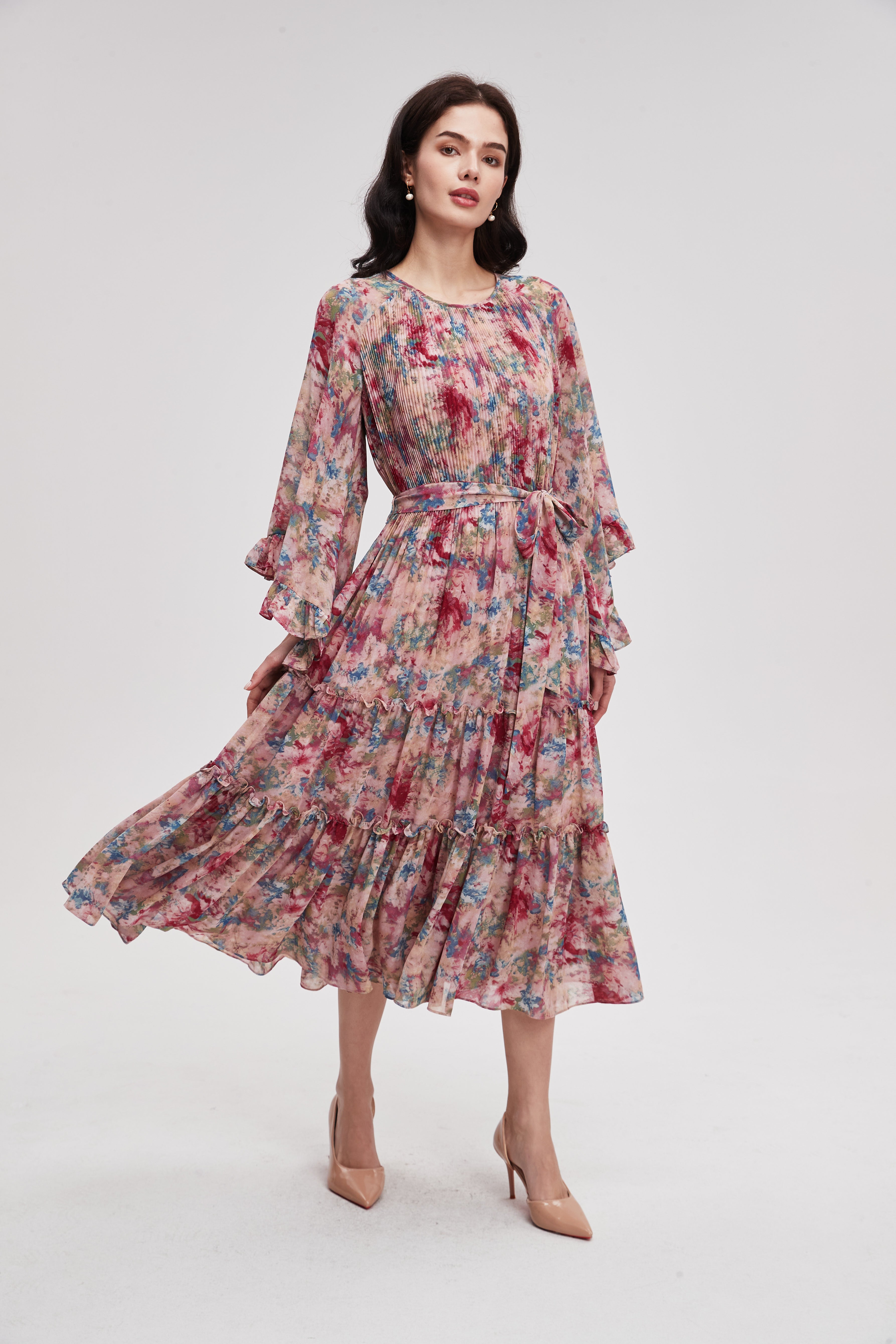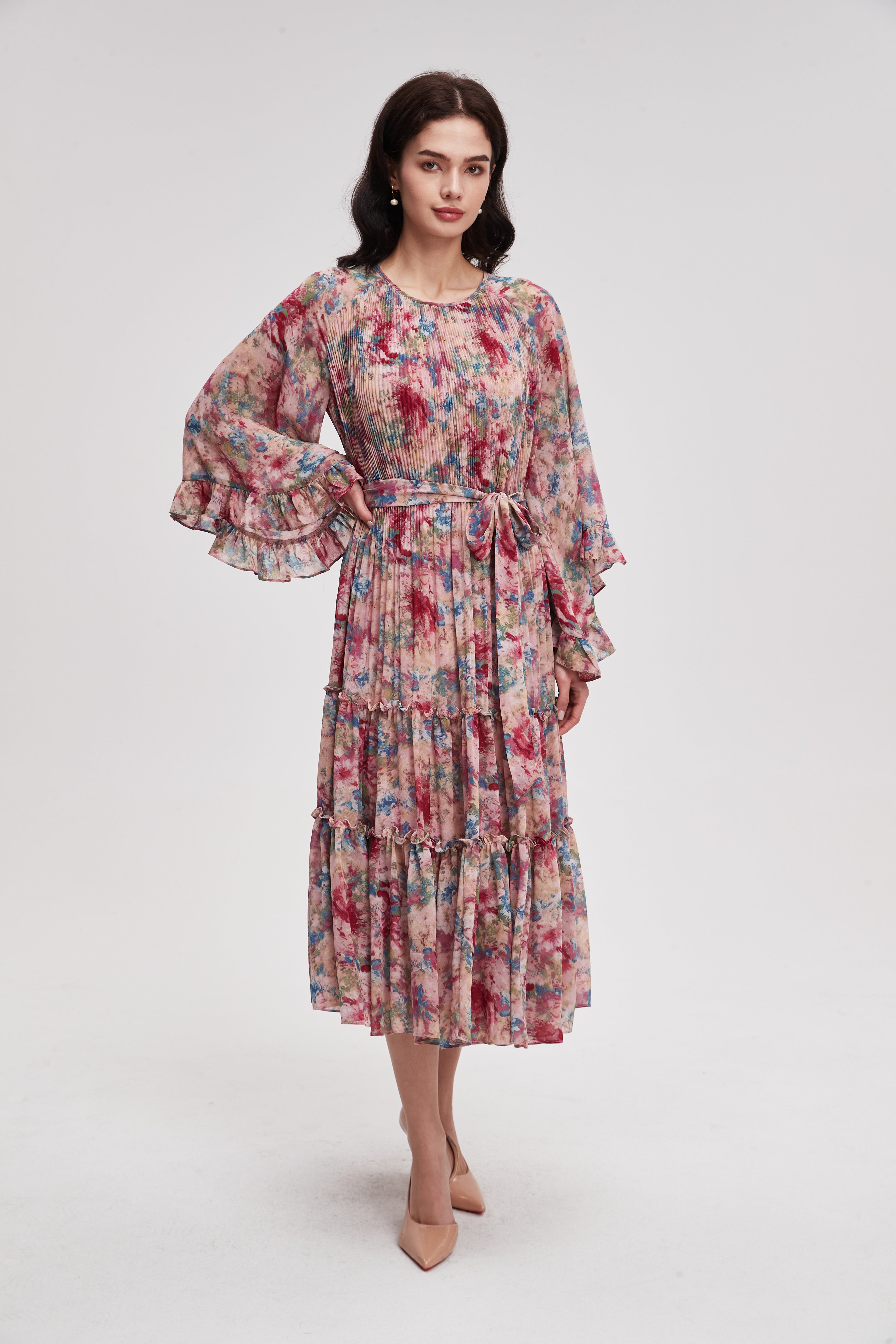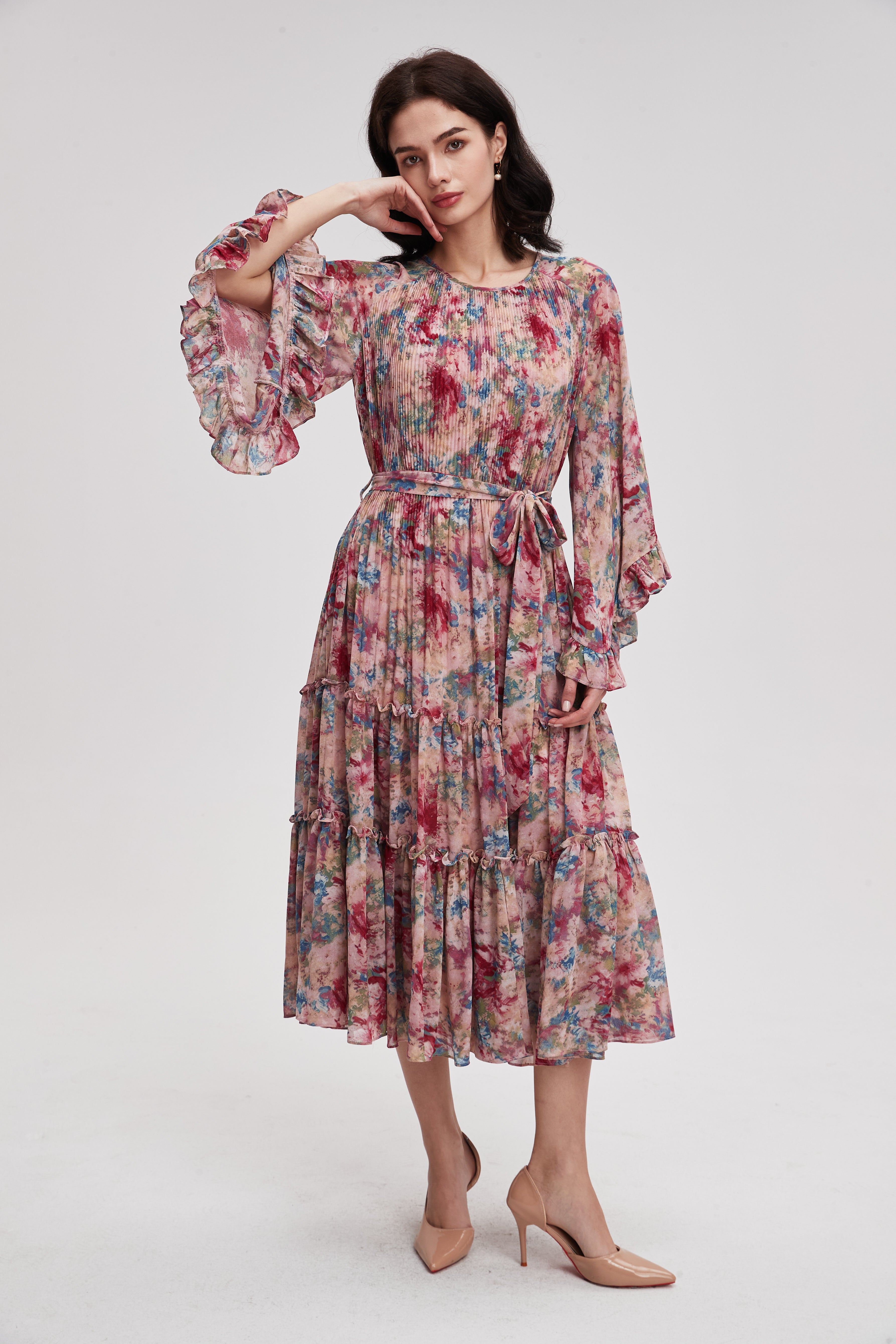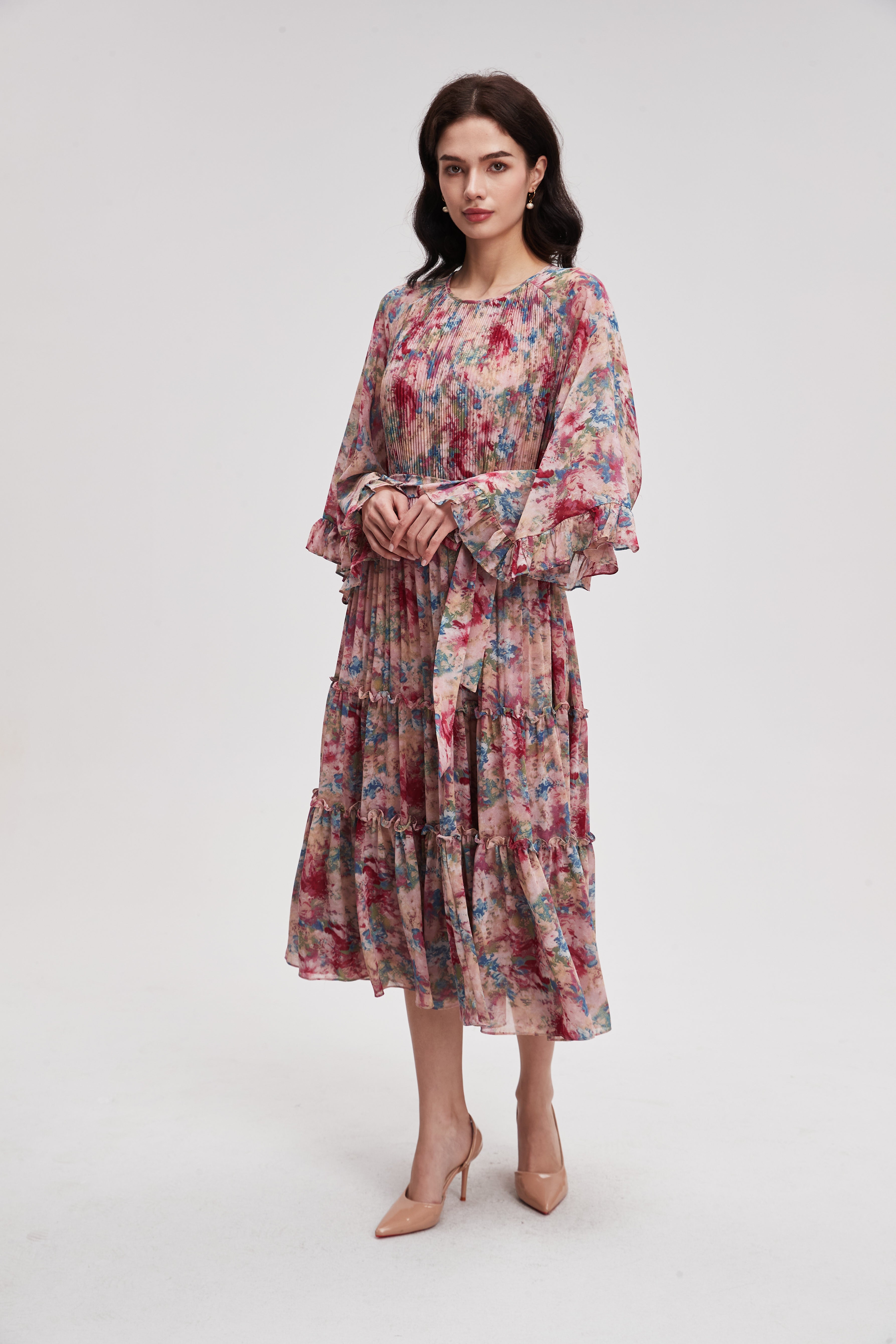 فستان ميدي منقوش بأكمام طويلة