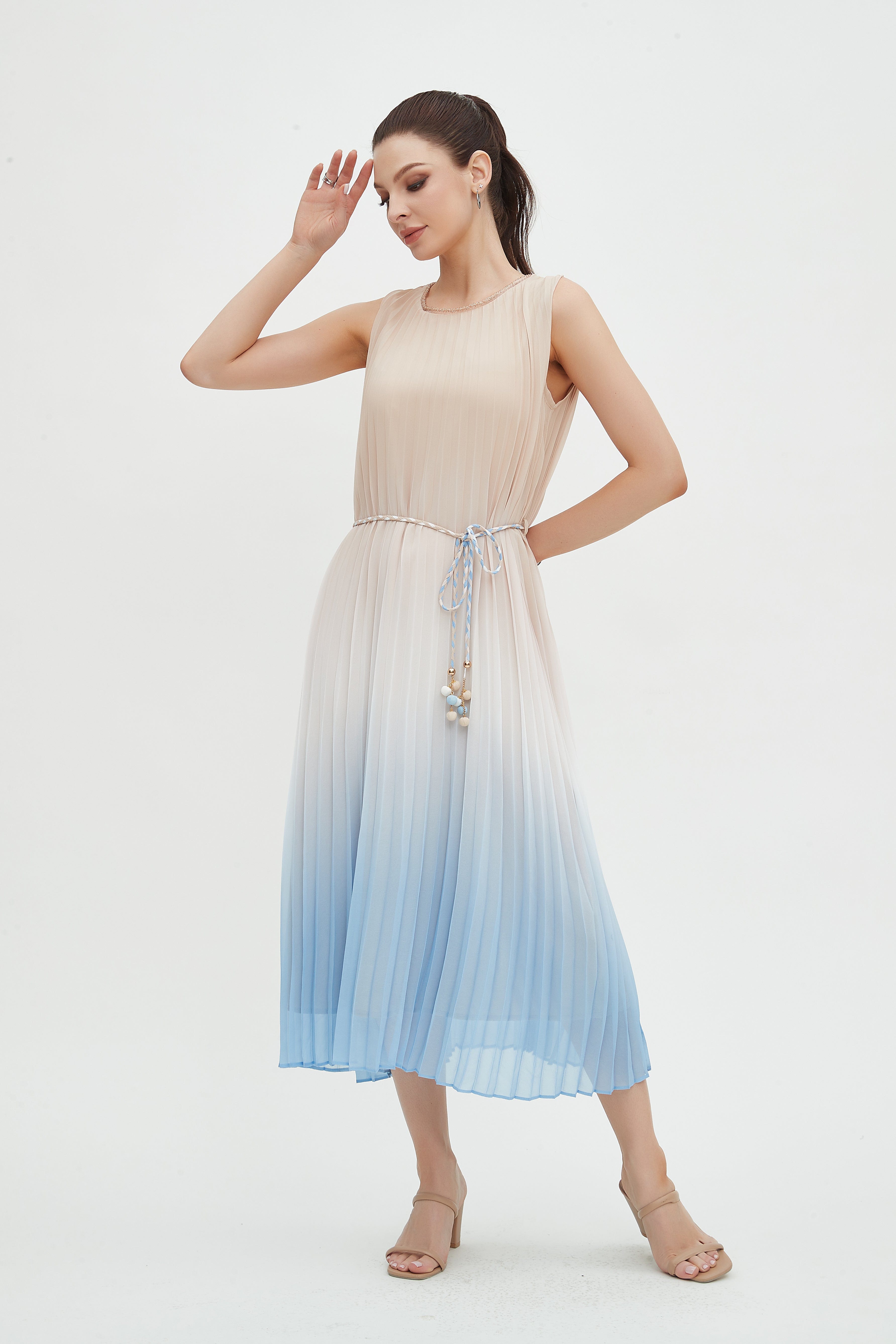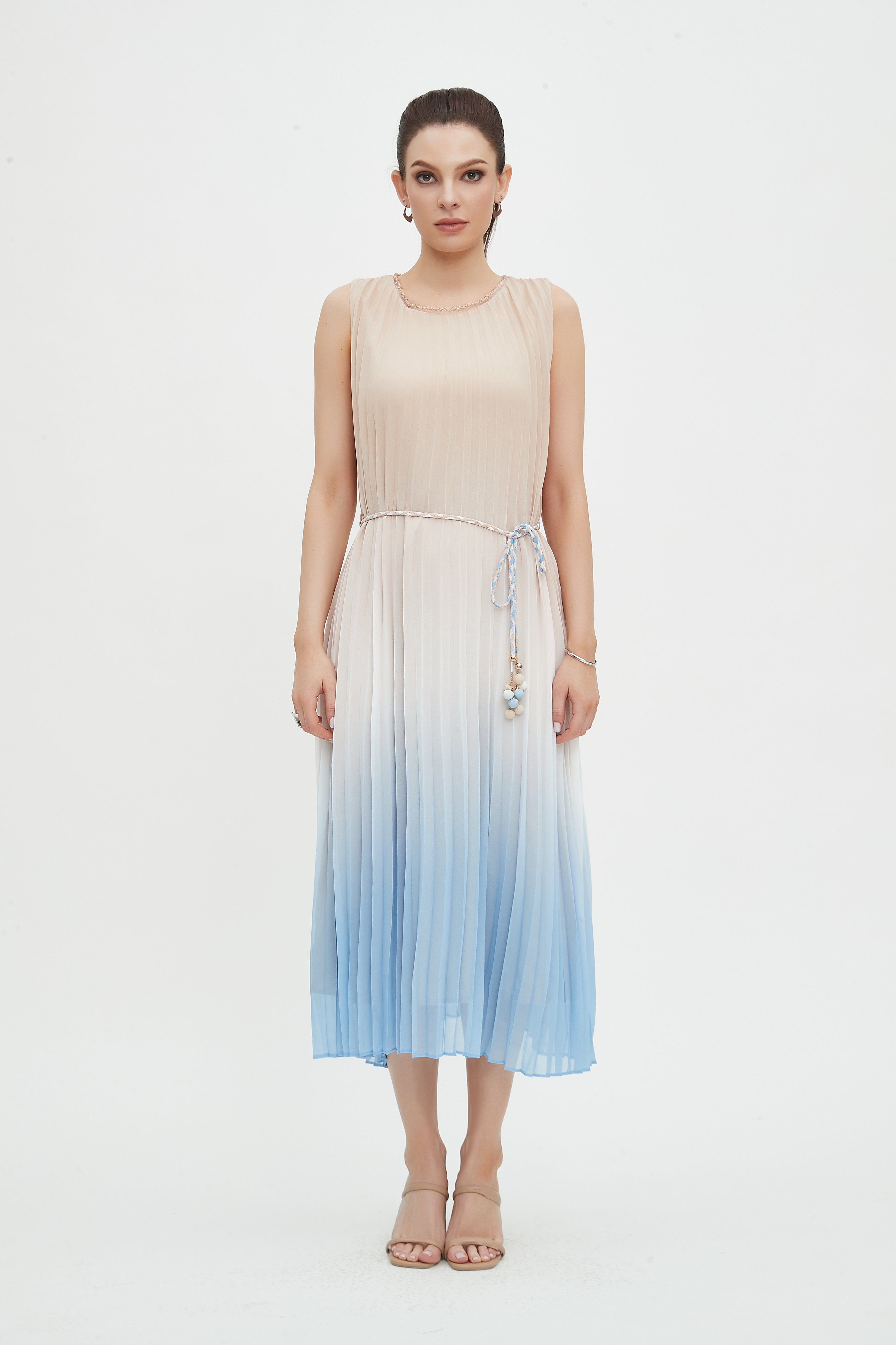 فستان ميدي مدرج ألوان بليسيه بفتحة رقبة مستديرة