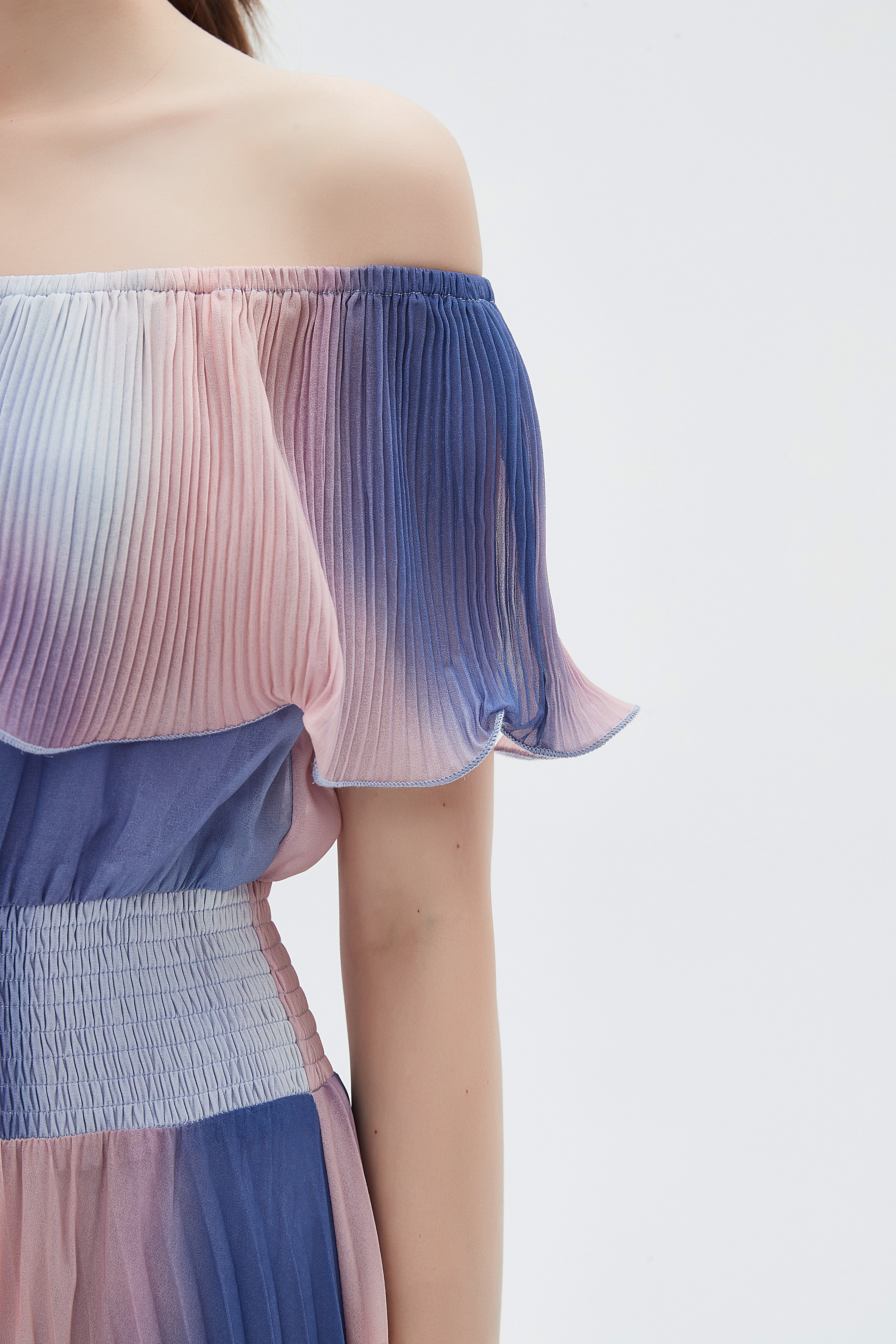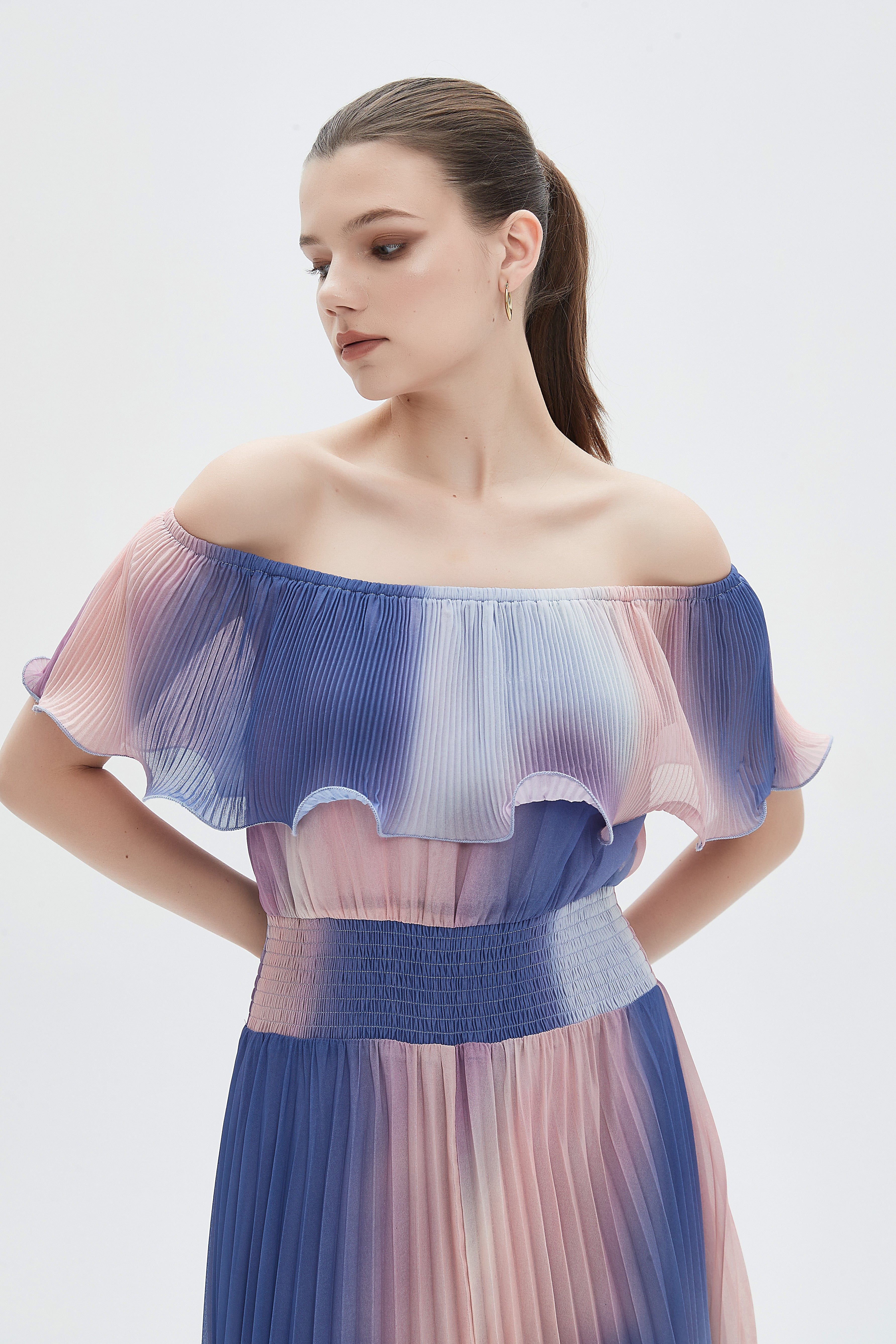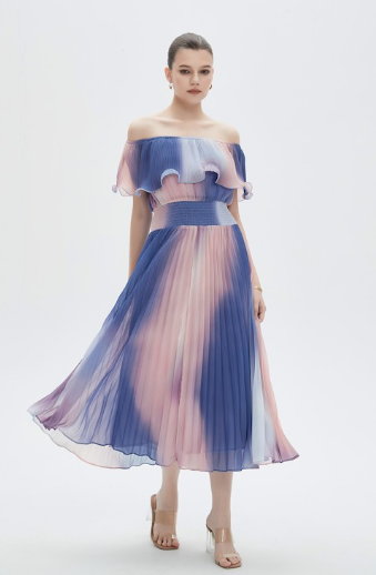 فستان نسائي ميدي أوف شولدر بليسيه ألوان
