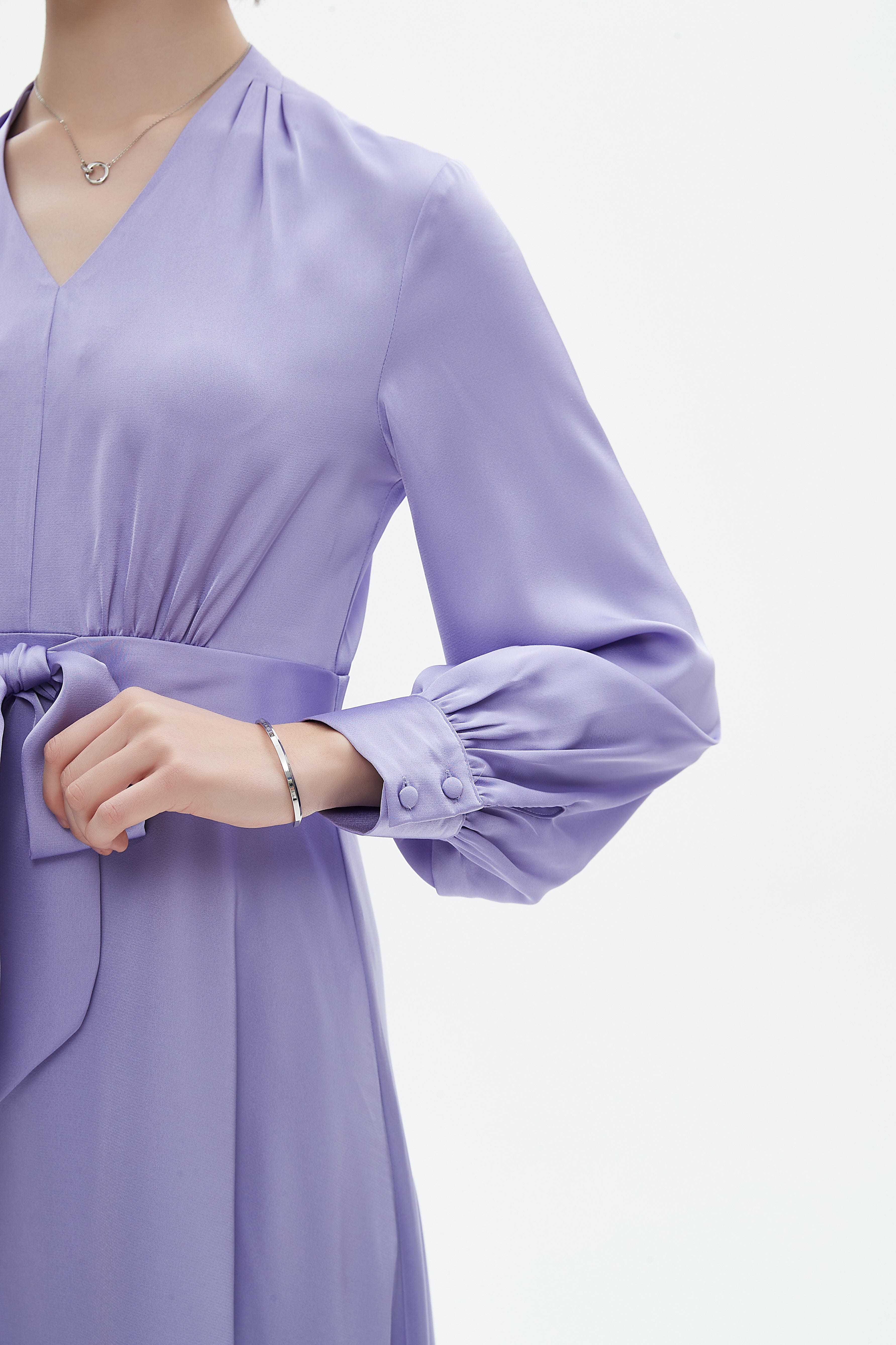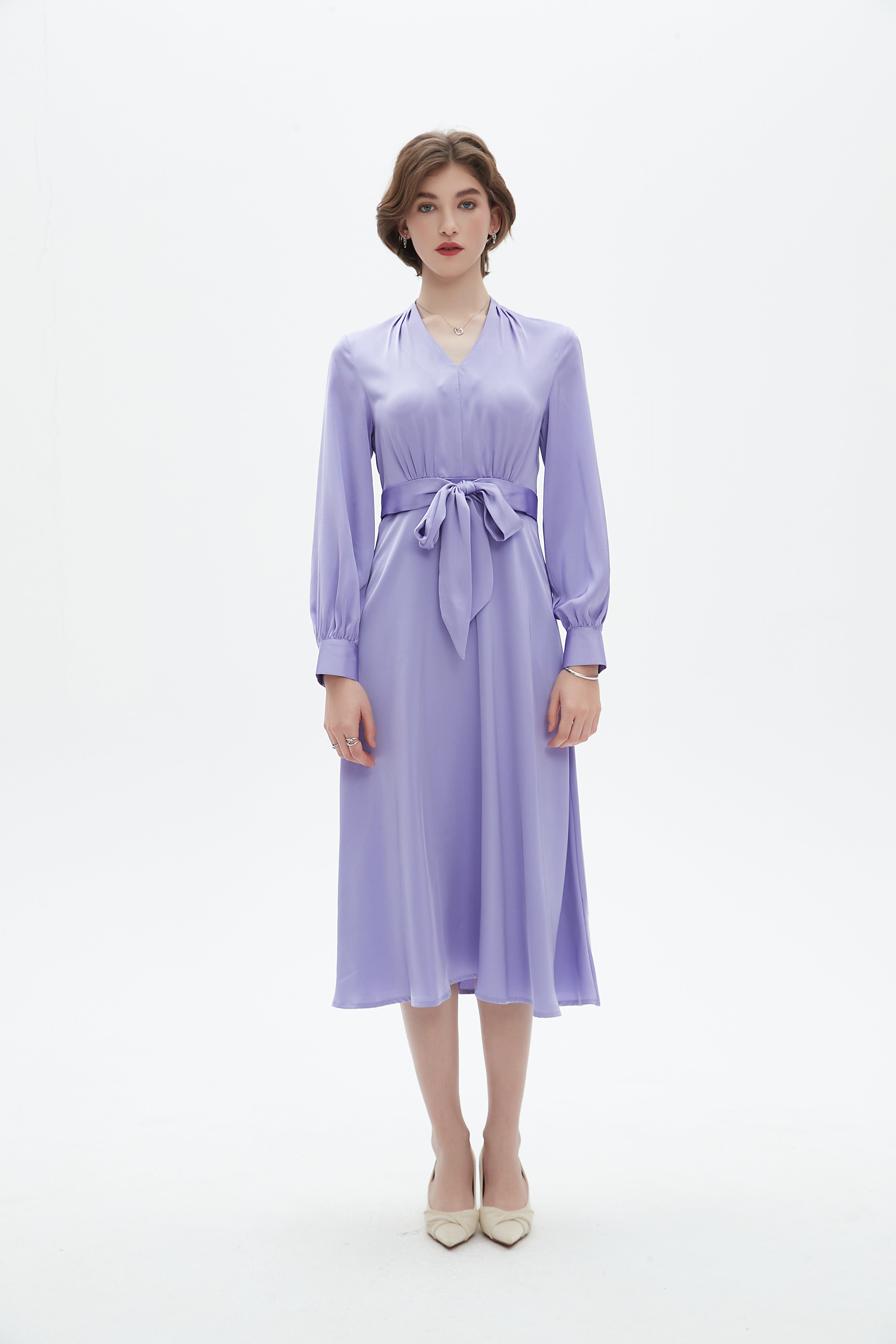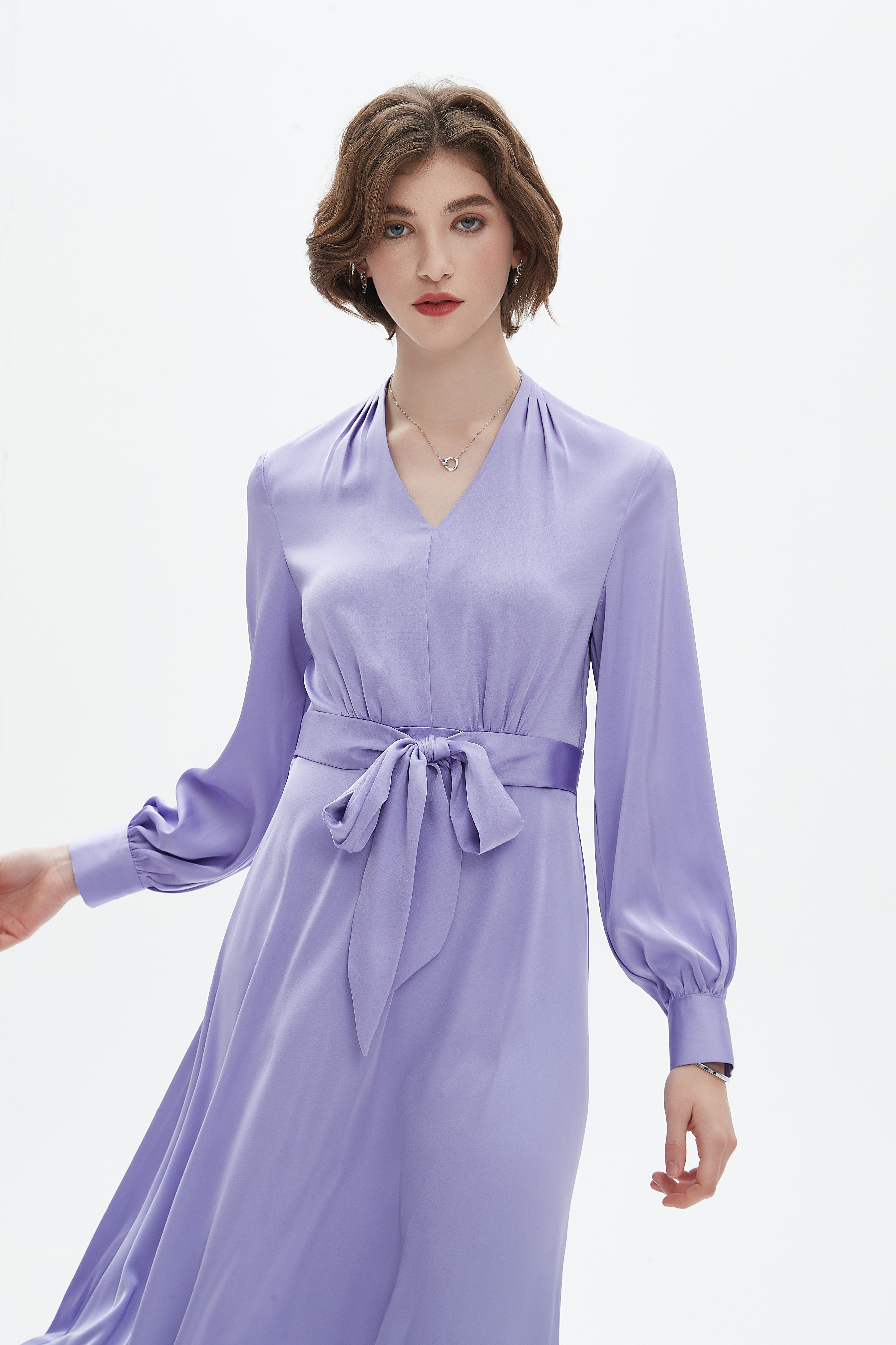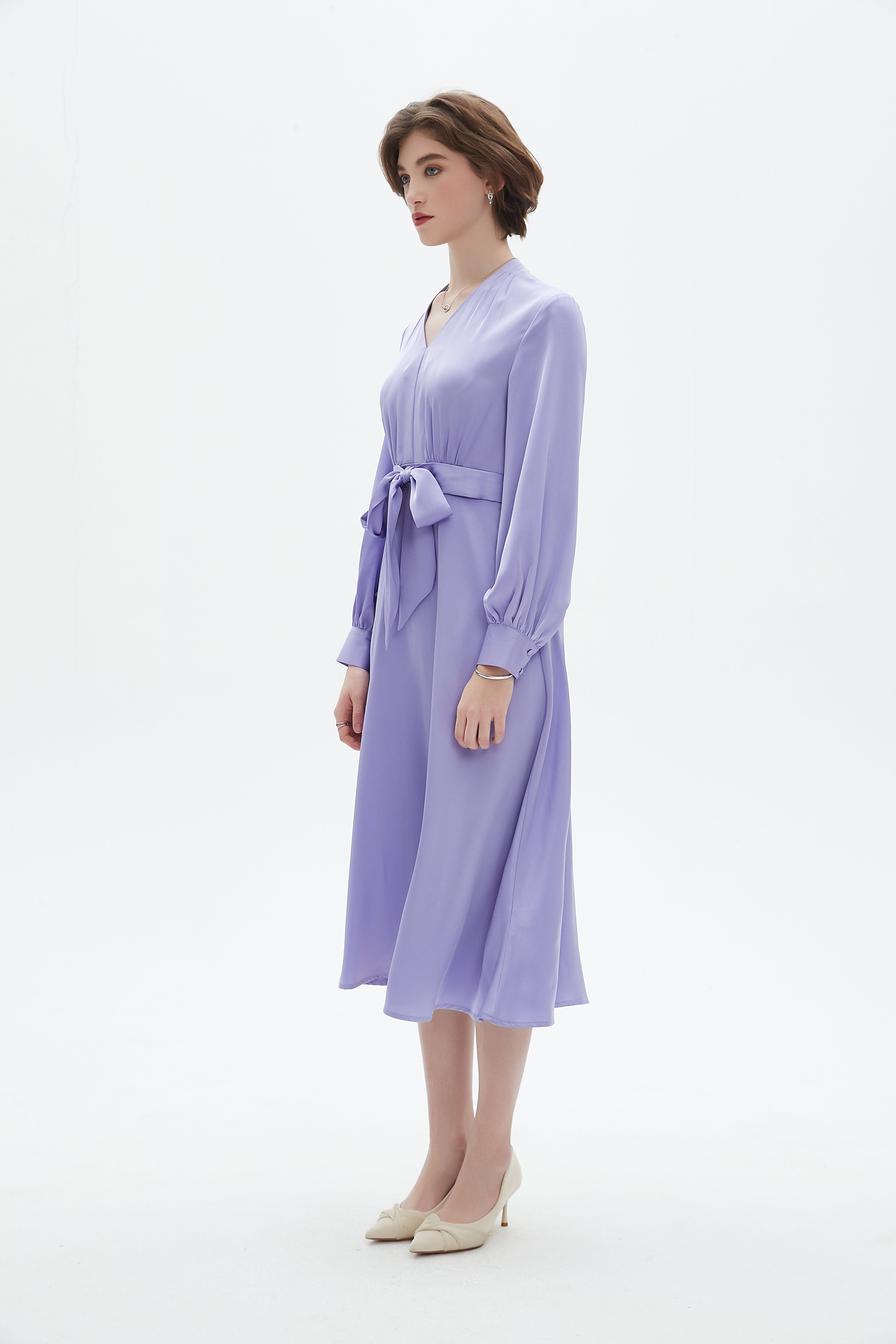 فستان ميدي كم طويل بربطة عالخصر ورقبة على شكل V