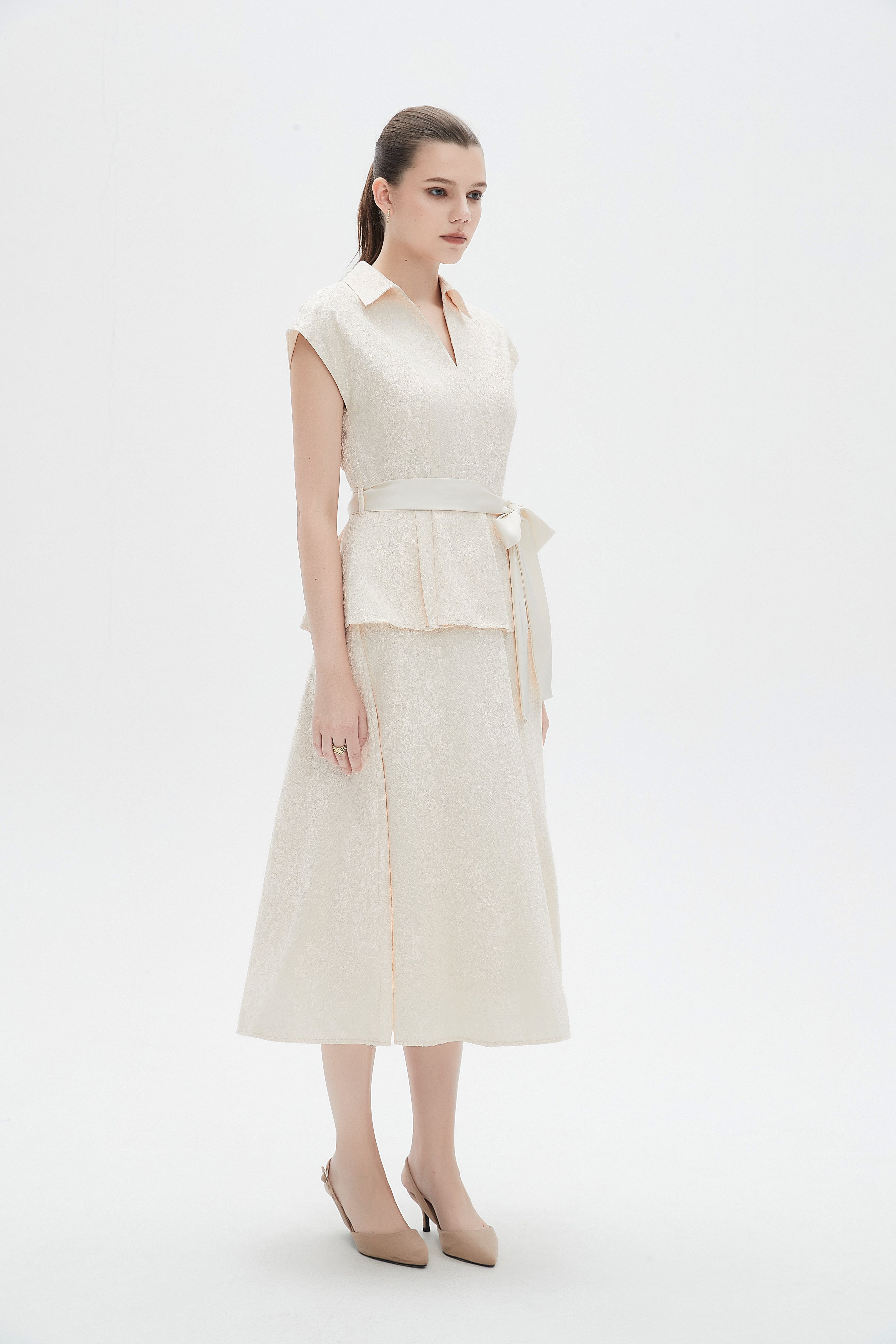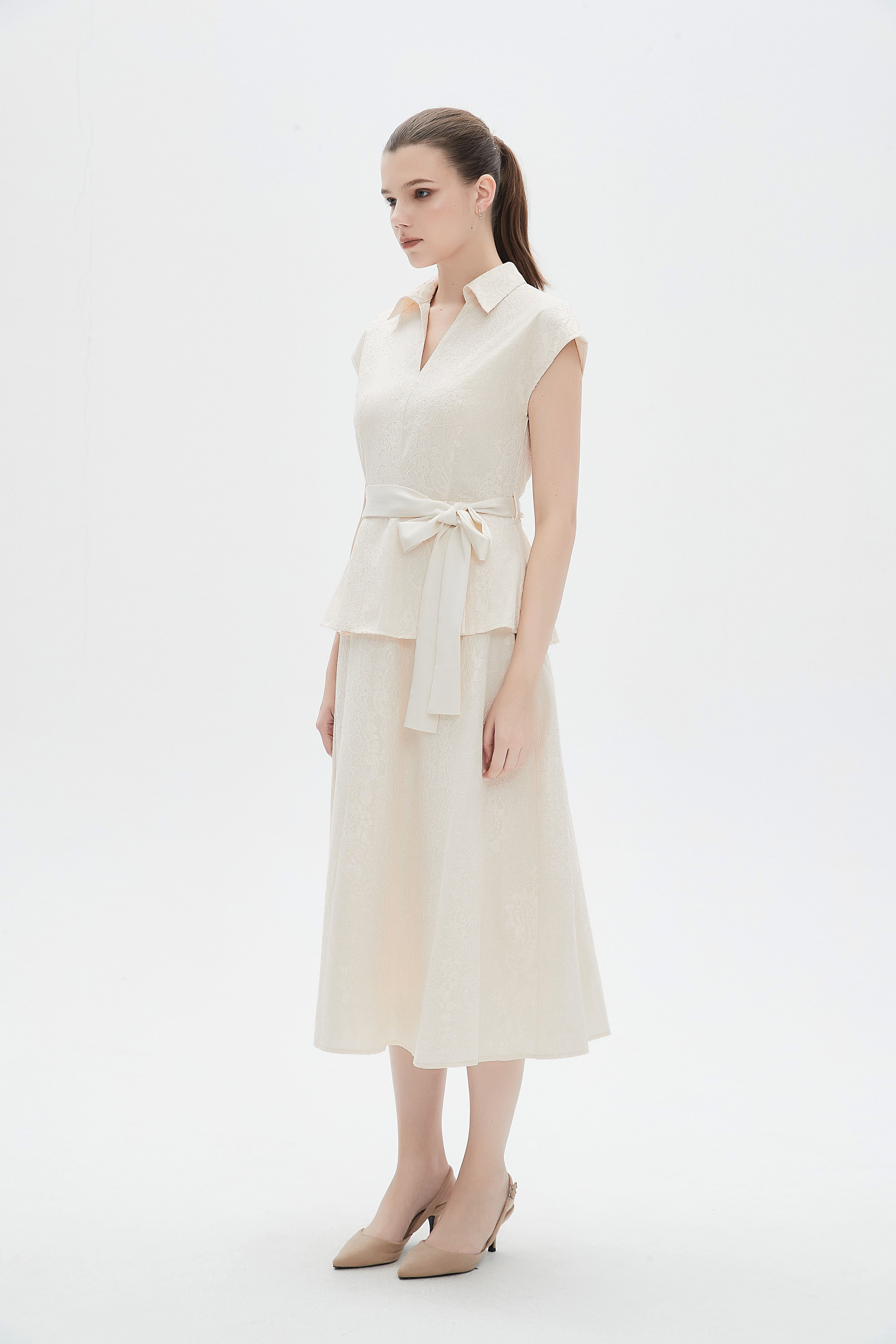 فستان طويل بأكمام قصيرة وحزام عالخصر بياقة قميص مكشكش