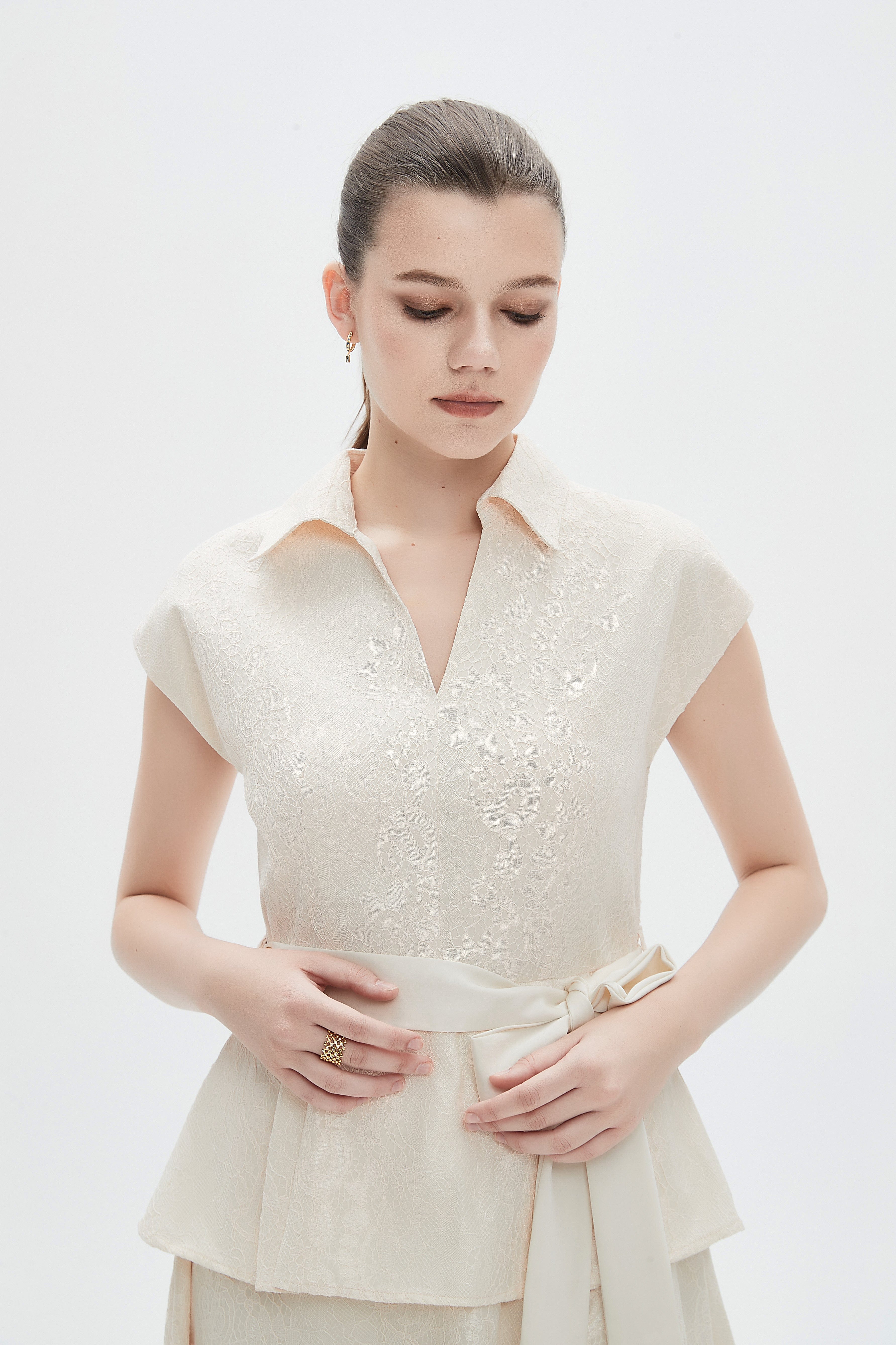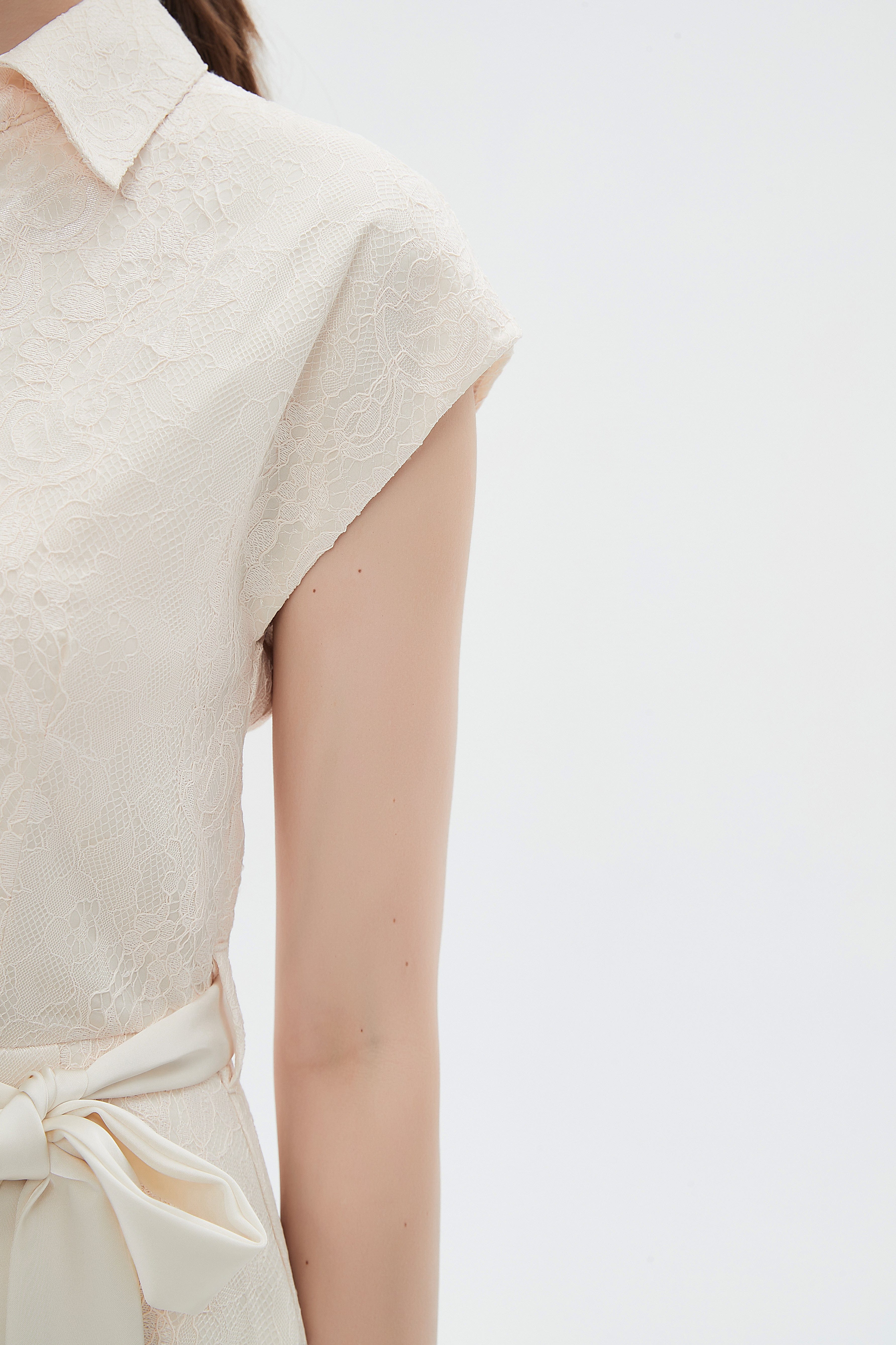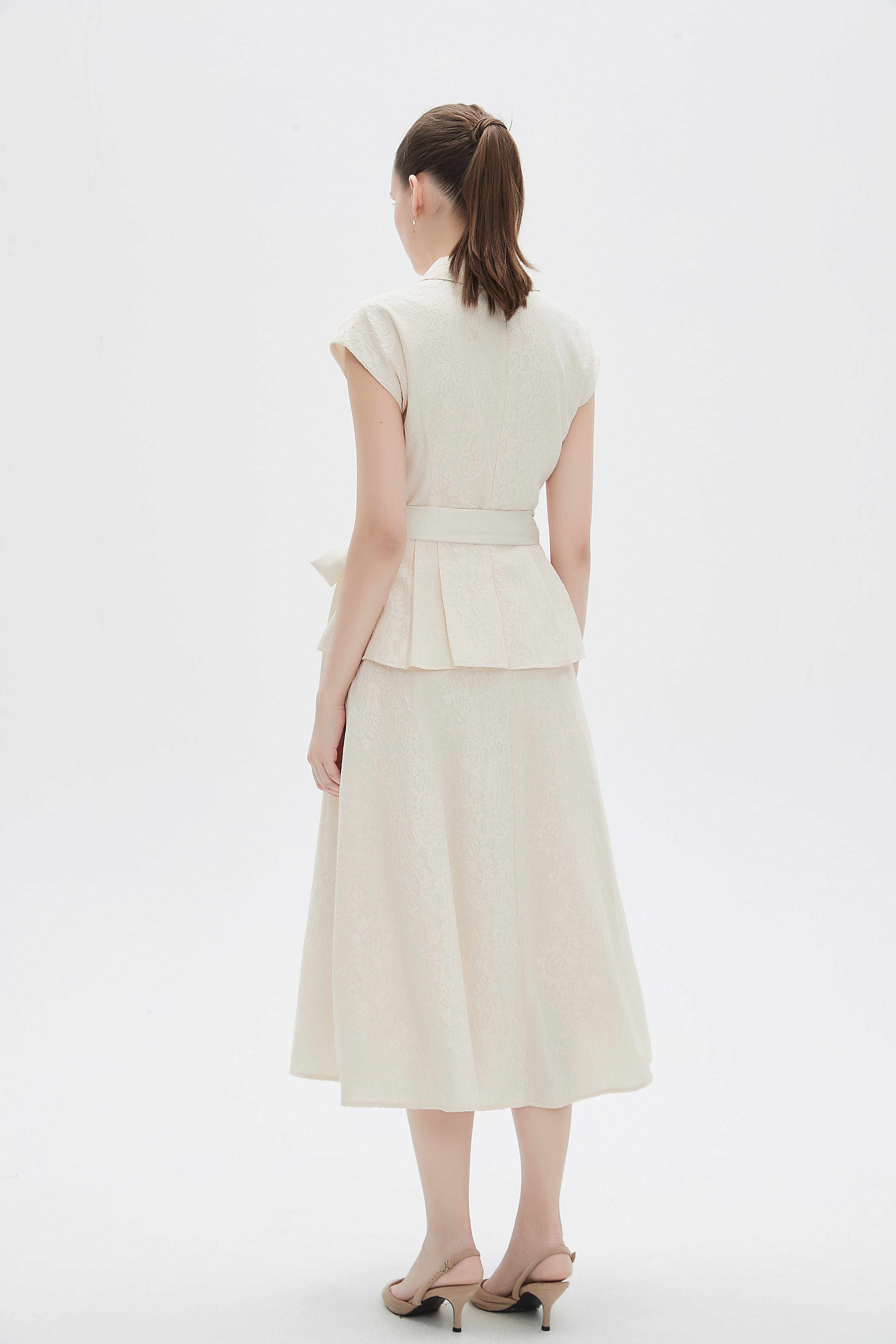 فستان نسائي ميدي نصف كم بتفاصيل دانتيل وحزام عالخصر بفيونكة