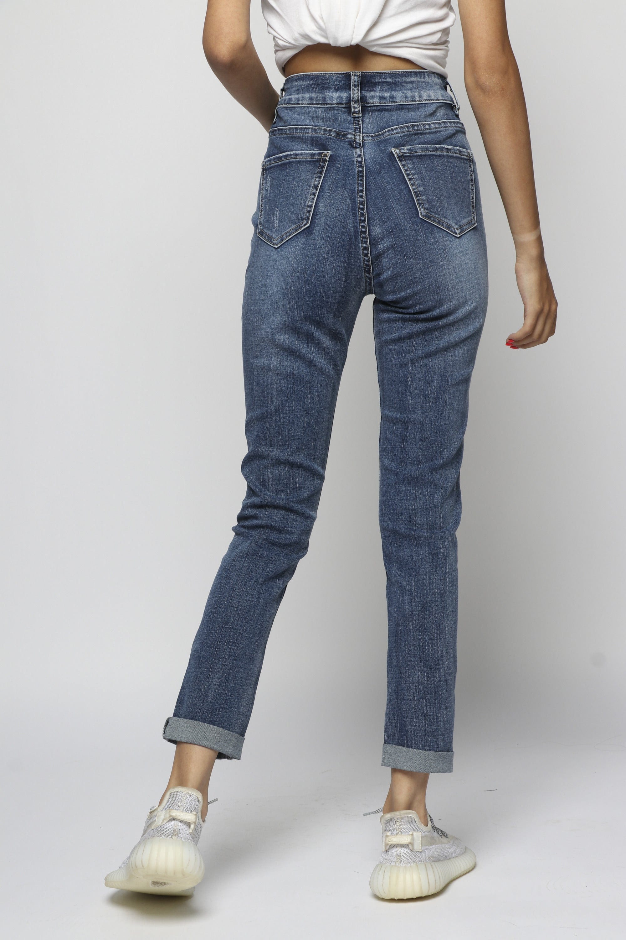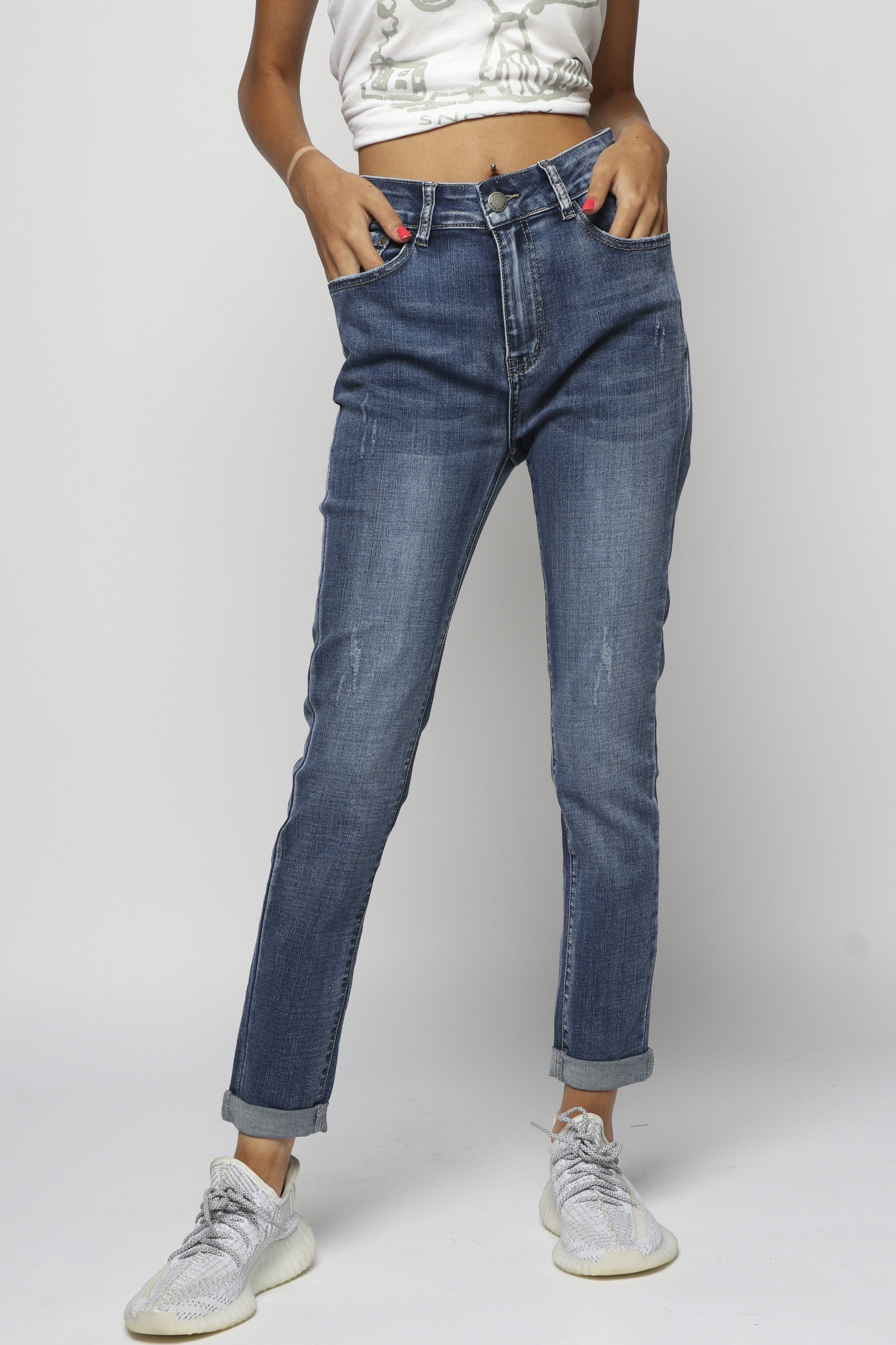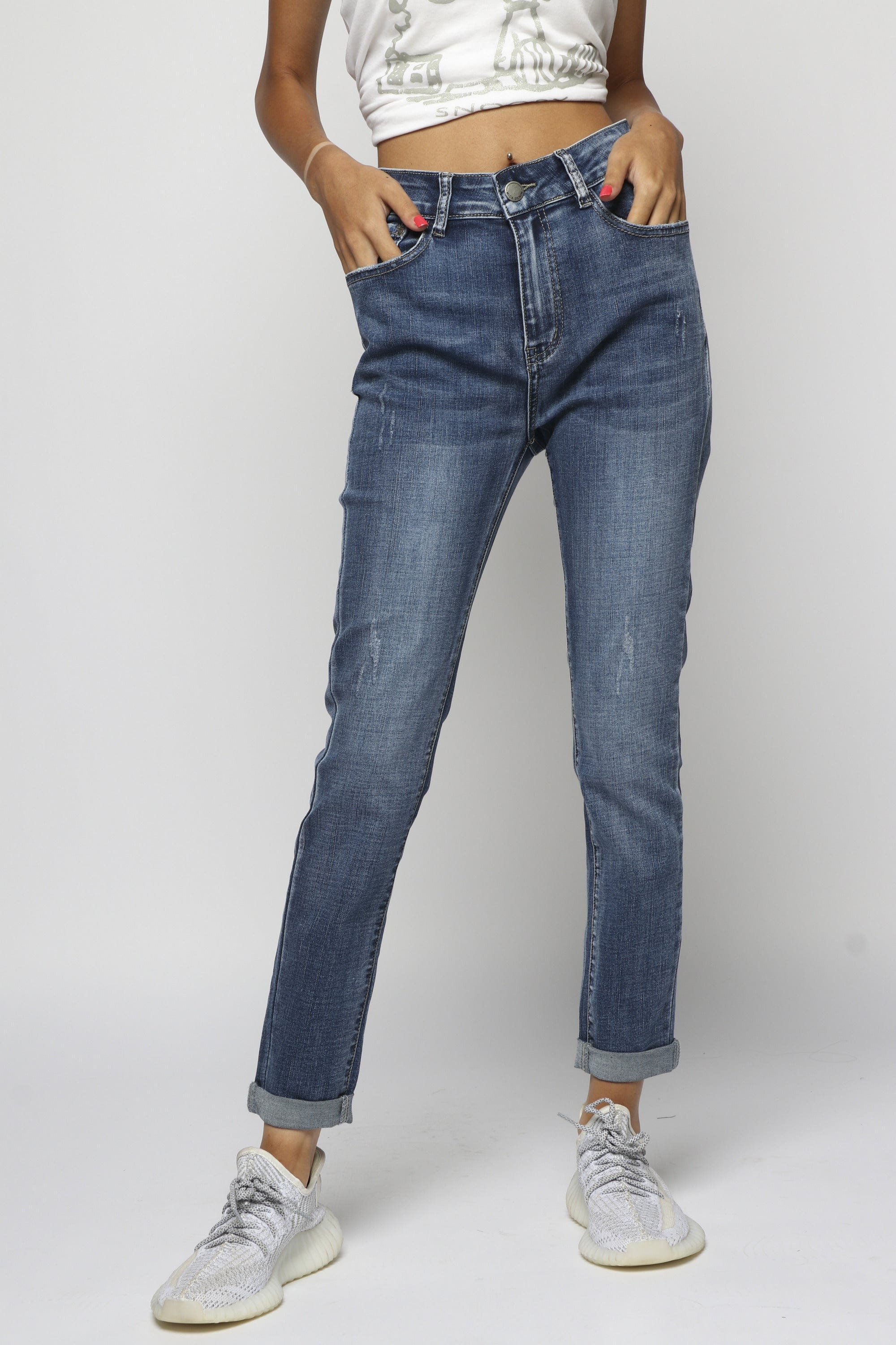 بنطلون جينز هاي ويست بسحاب وزرار طويل نسائي