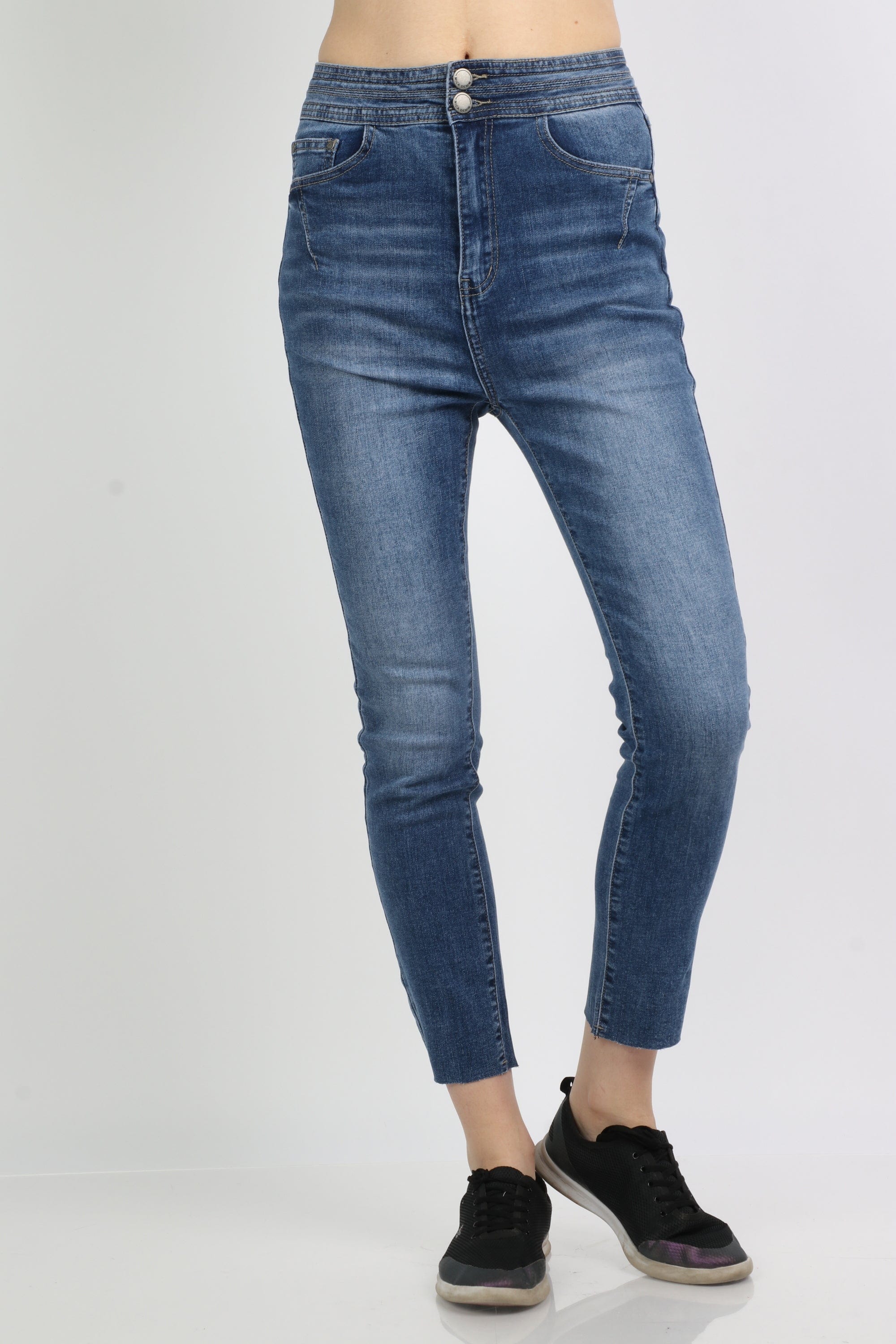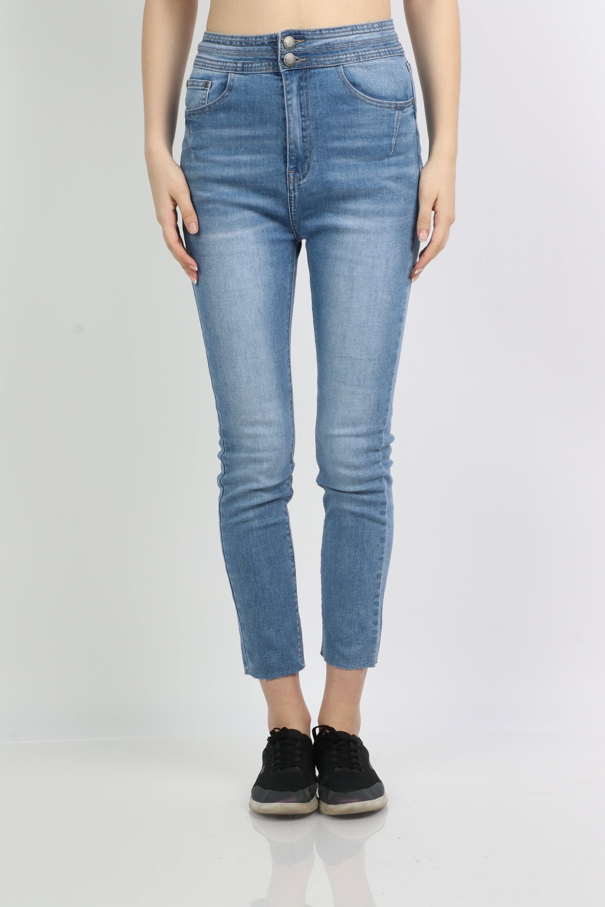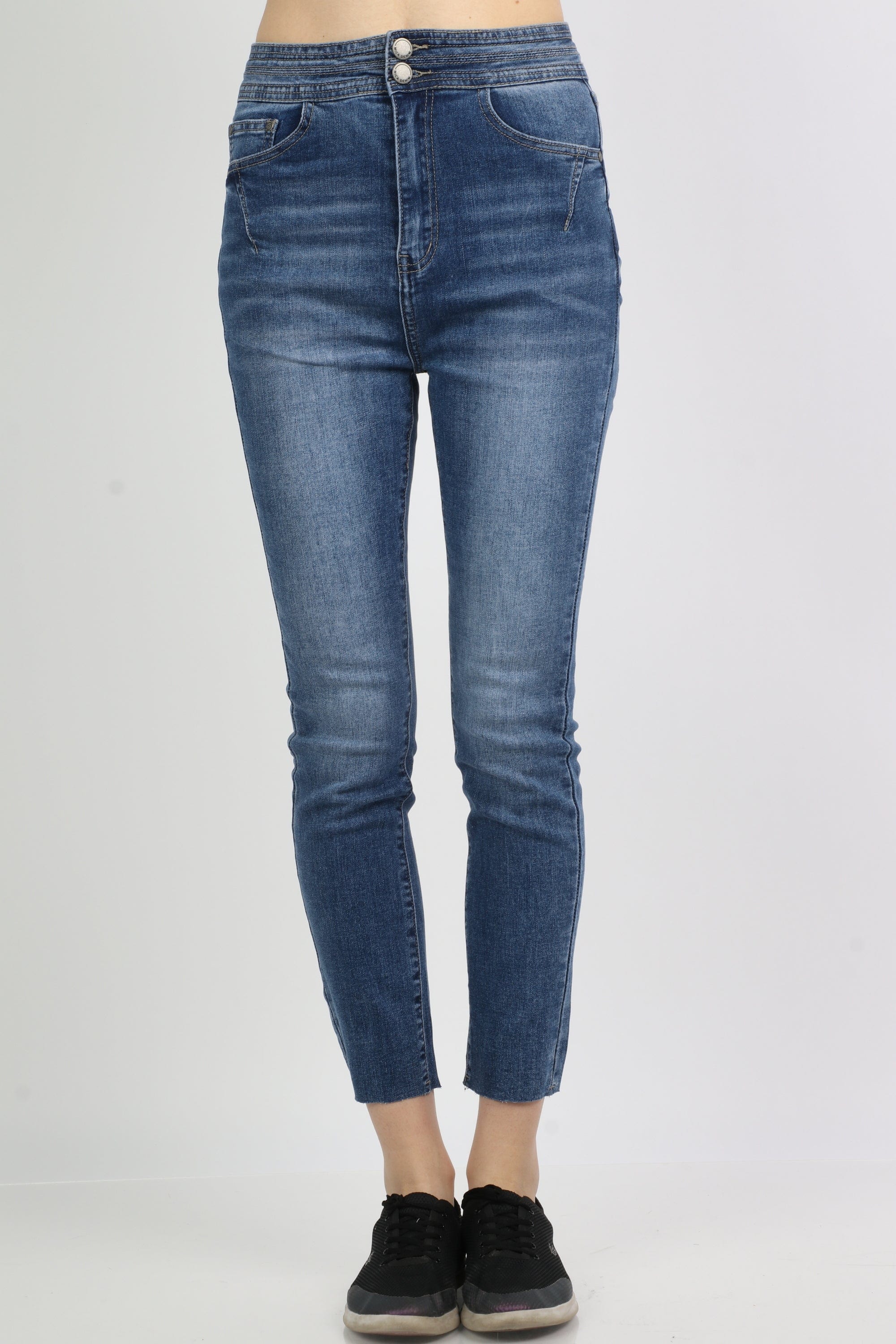بنطلون جينز هاي ويست سكيني بسحاب وزرارين وجيوب أمامية طويل نسائي