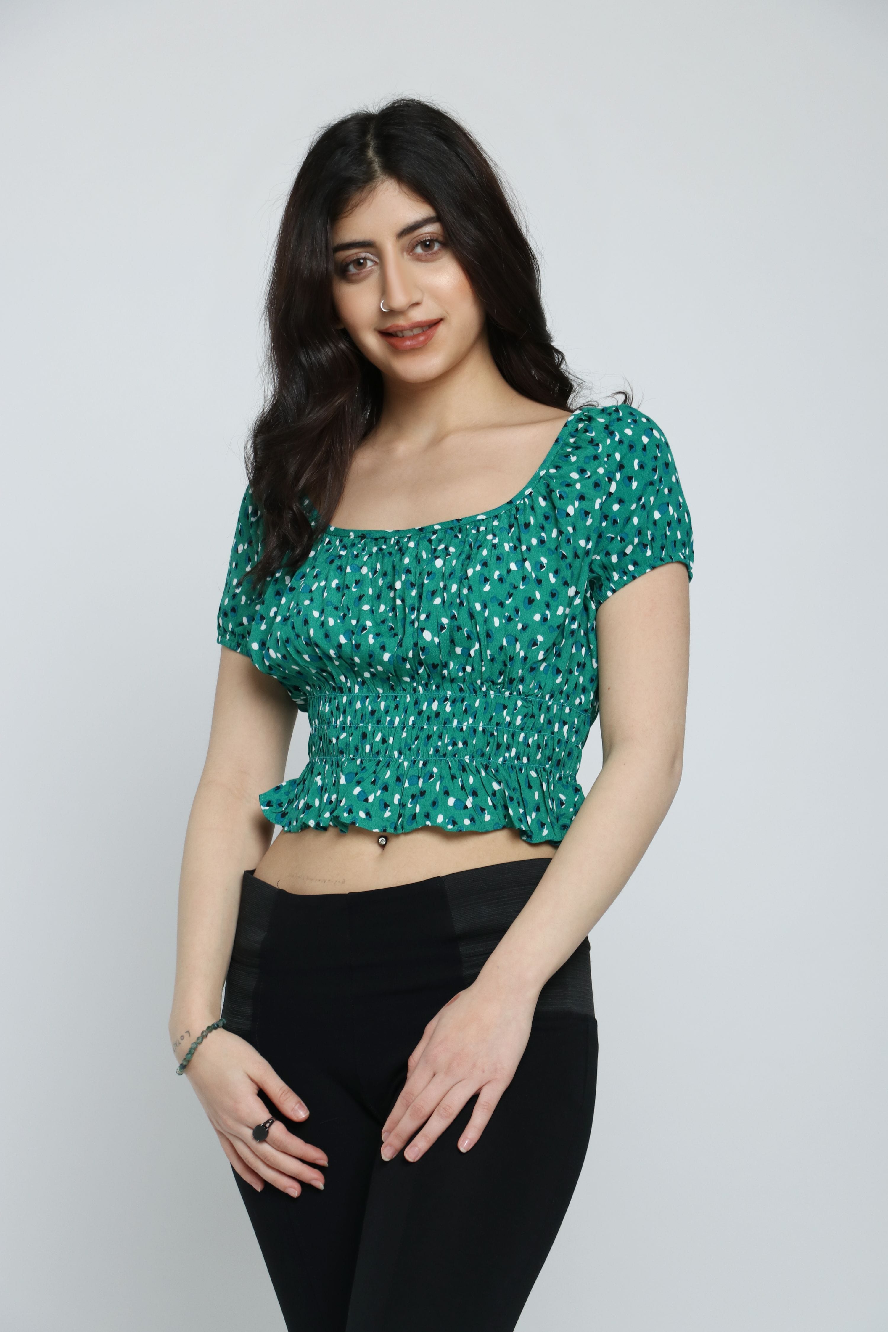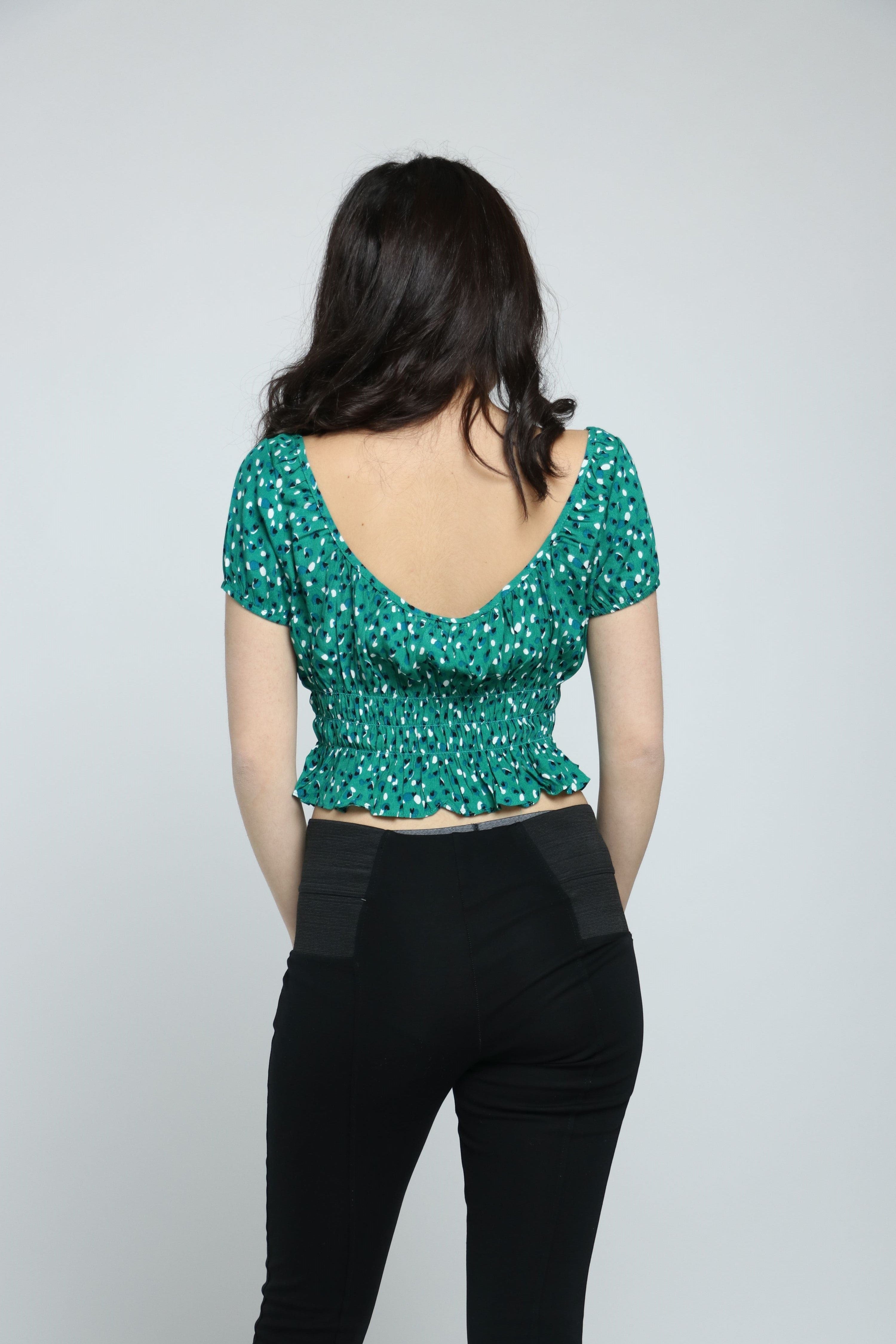 بلوزة نص بطن ياقة مربعة مخصرة كم قصير نسائي