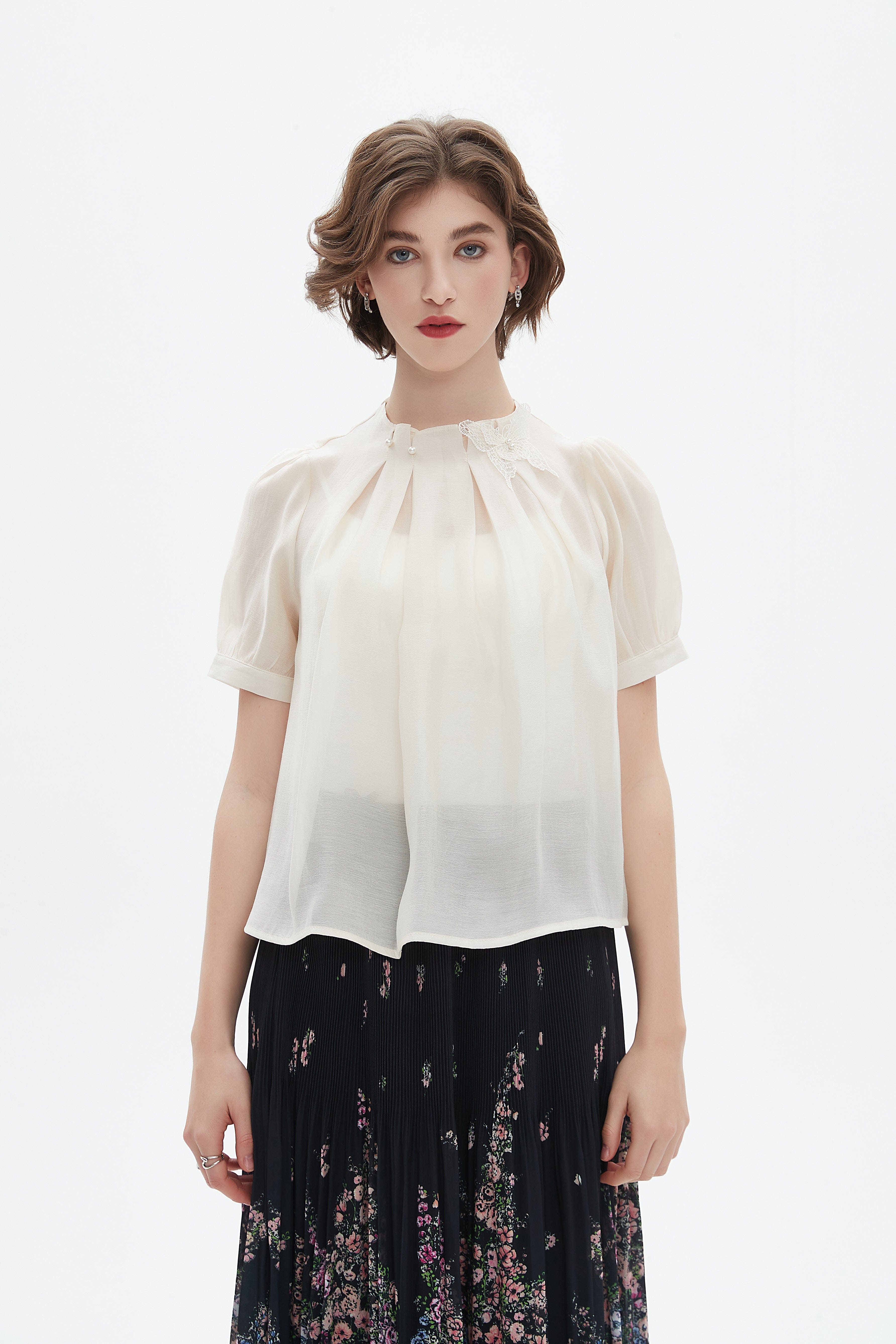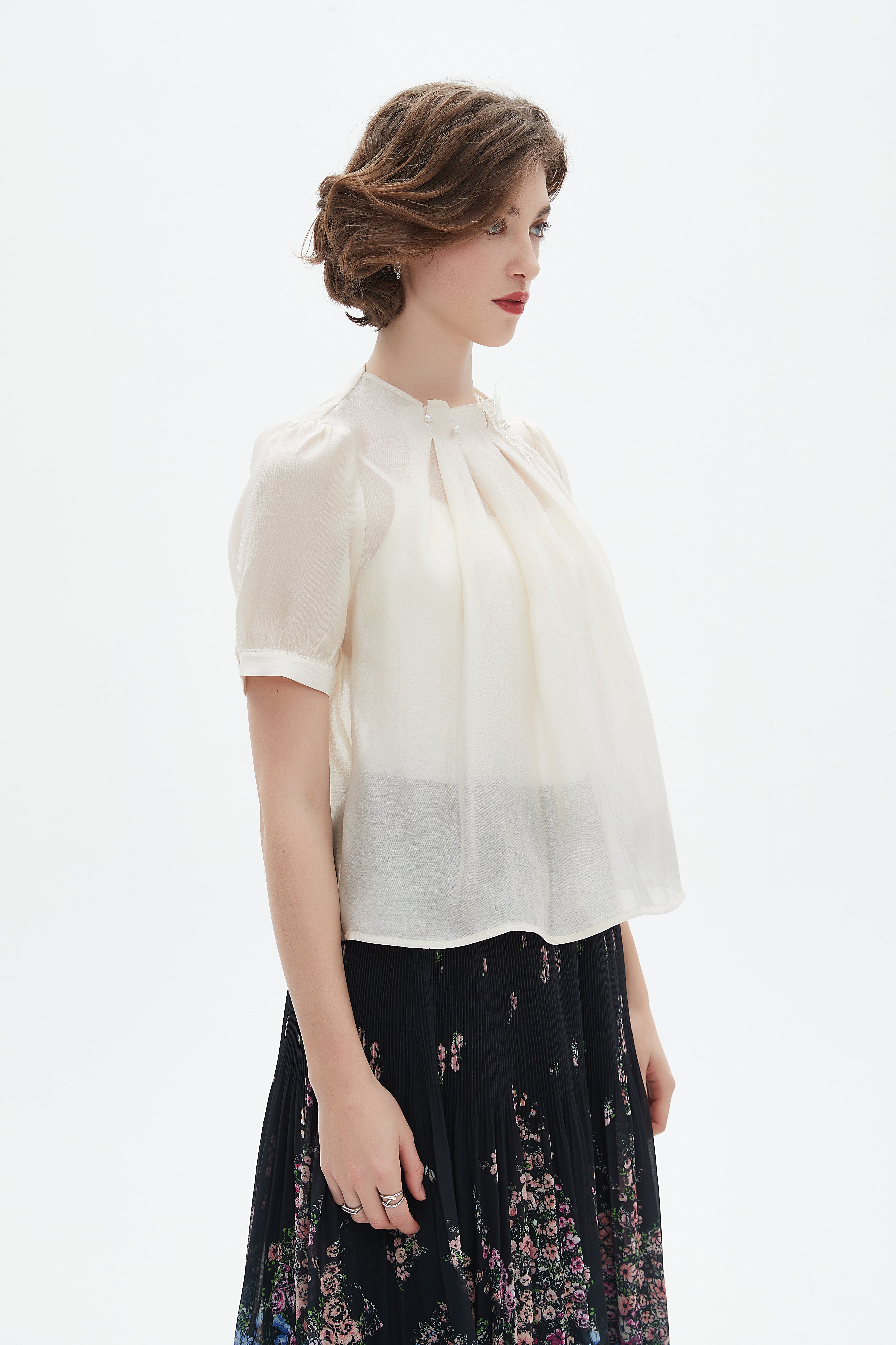 بلوزة نصف كم بفتحة رقبة دائرية ومكشكشه من عند الياقة
