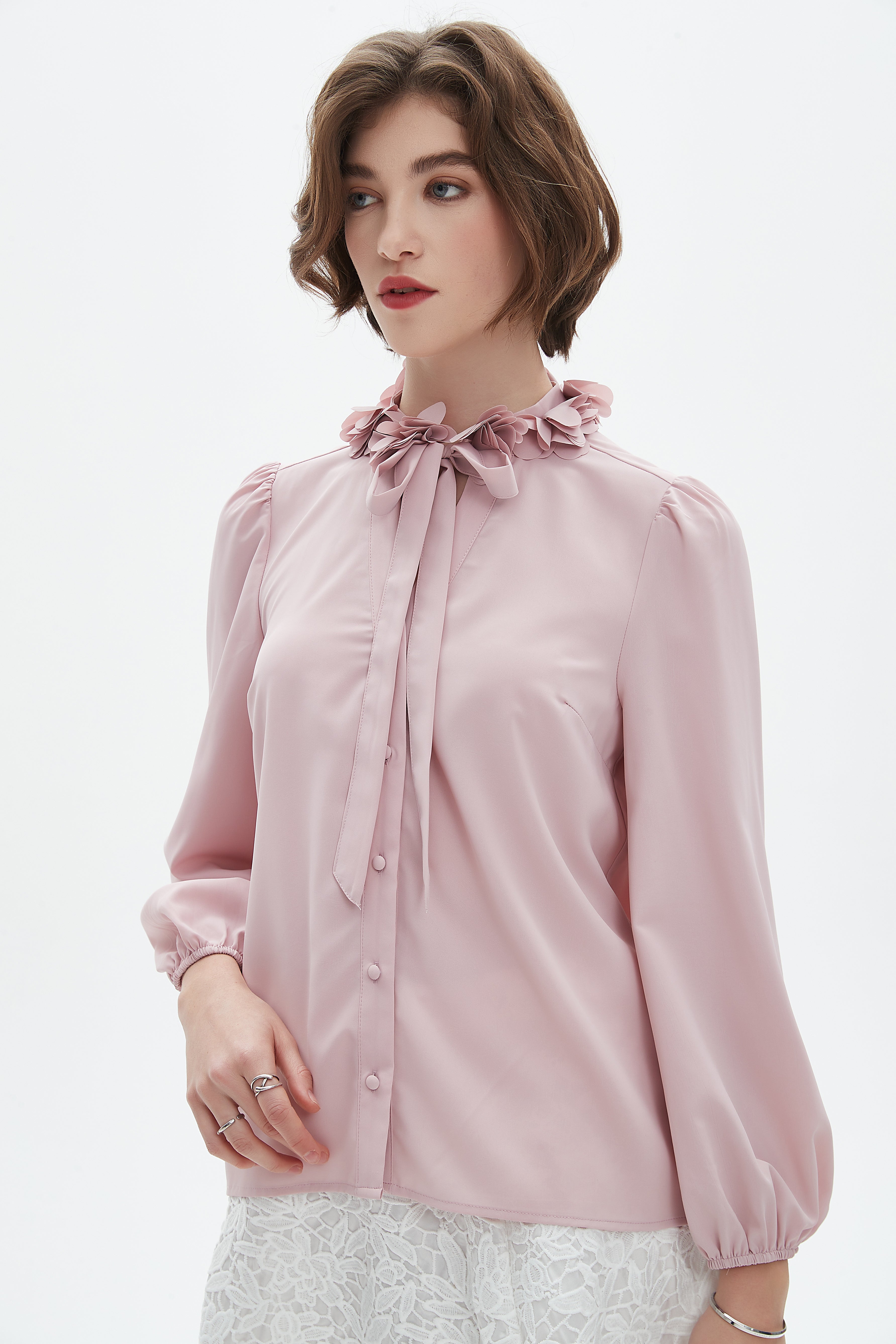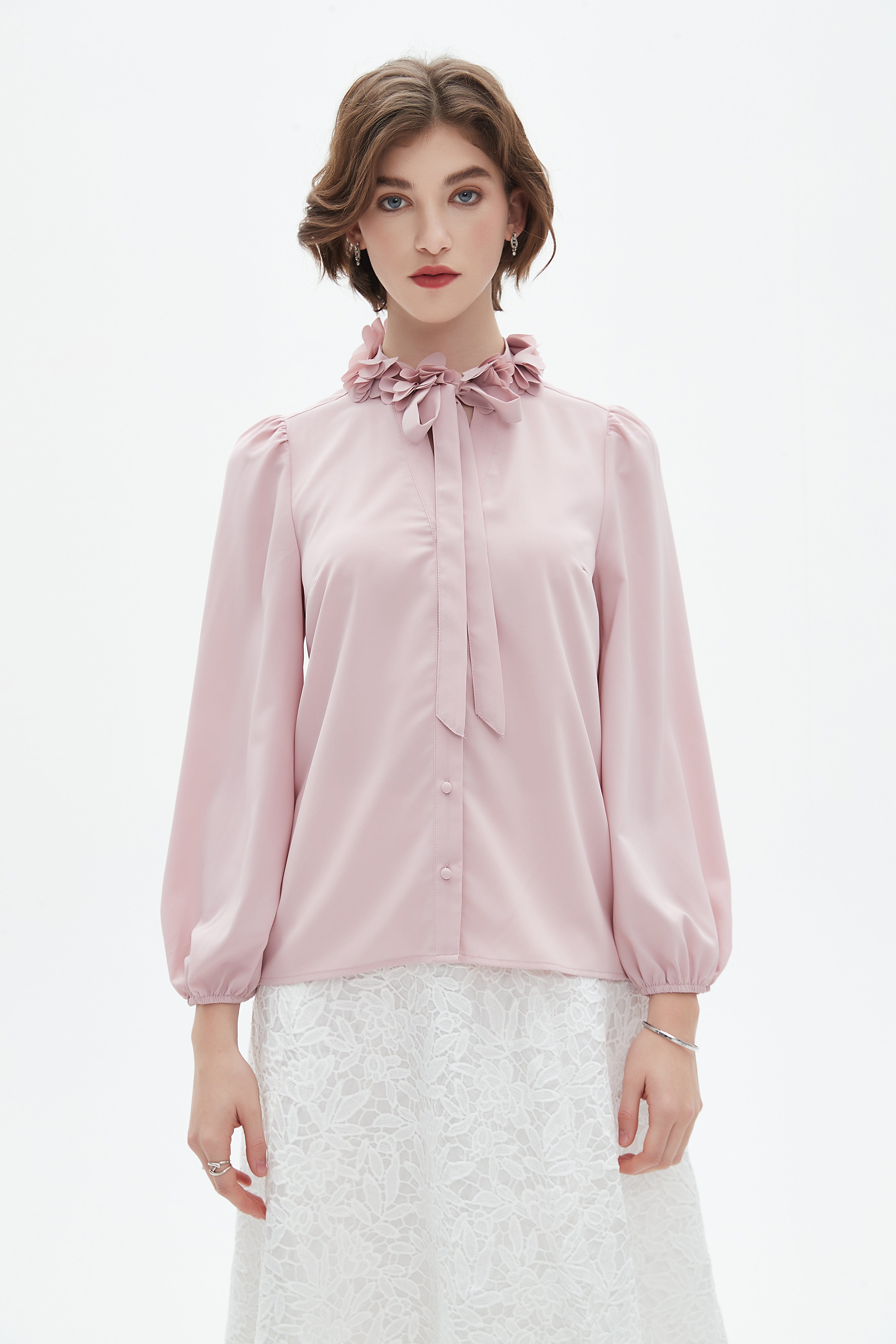 بلوزة نسائية بأكمام طويلة وفتحة رقبة دائرية مزينه بورود