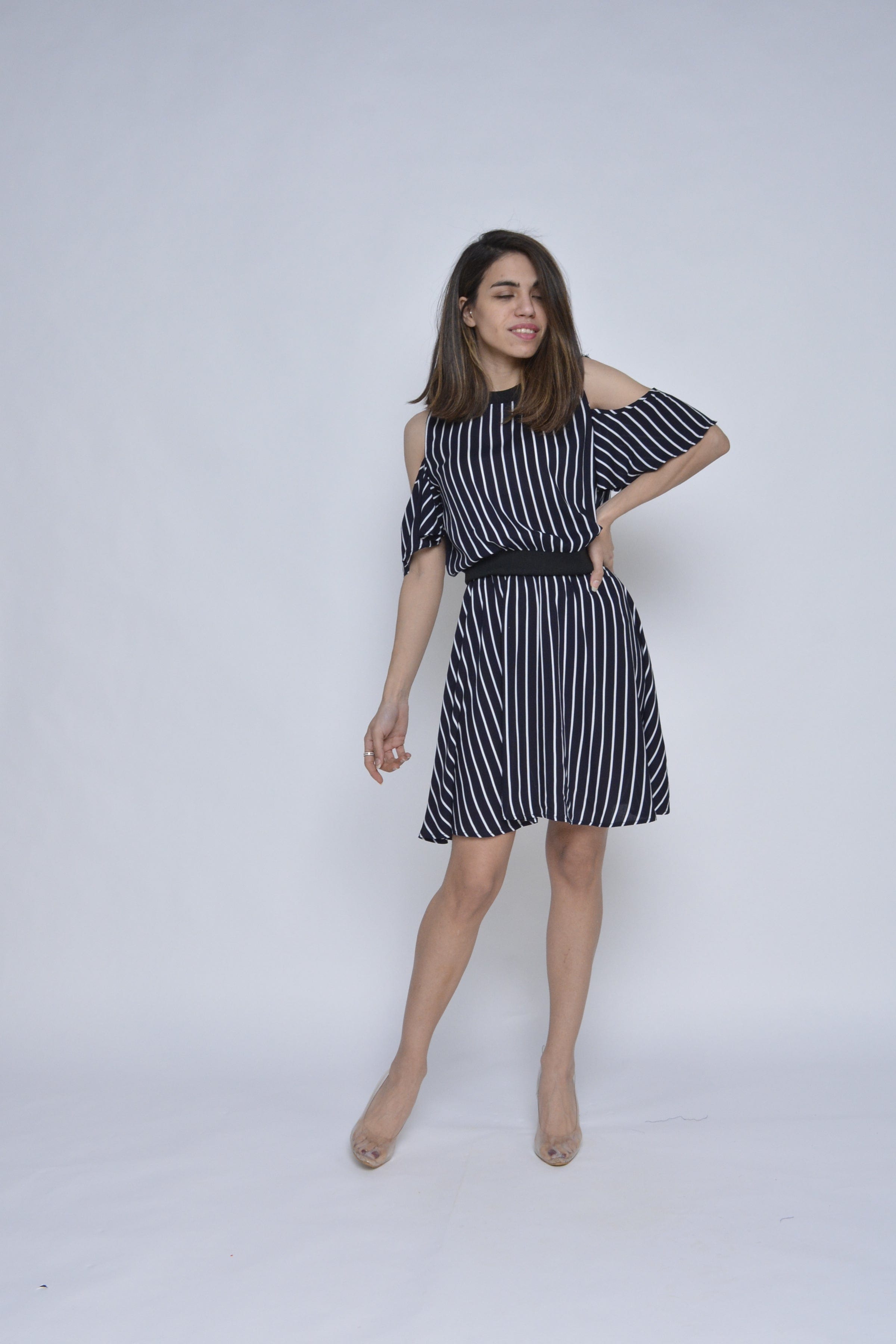 هذا الفستان رائع إذا كنتِ تريدي قطعة يومية شبابية ومريحة تضيف لونًا لخزانة ملابسك. بقصة A يعطي تنورة متسعة قليلًا وطول يصل إلى الركبة، ما يجعله عمليًا للخروجات واللقاءات اليومية. النقشة المخططة متعدد الألوان تضيف حيوية، وياقته المستديرة مع كتف مكشوف وأكمام قصيرة تمنح طابعًا أنثويًا بدون مبالغة. السماكة متوسطة تناسب فصلي الربيع والخريف، والقصة العادية مريحة لمعظم الأجسام. لا يحتوي على إغلاق أو جيوب، لكنه يأتي مع حزام يمكنك ربطه لتحديد الخصر وتغيير الإطلالة بين مظهر مريح وأنثوي محدد. ستحبين كيف يتحرك معك أثناء المشي، مثالي للنزهات والقهوة مع الصديقات أو لمواعيد مسائية بسيطة.