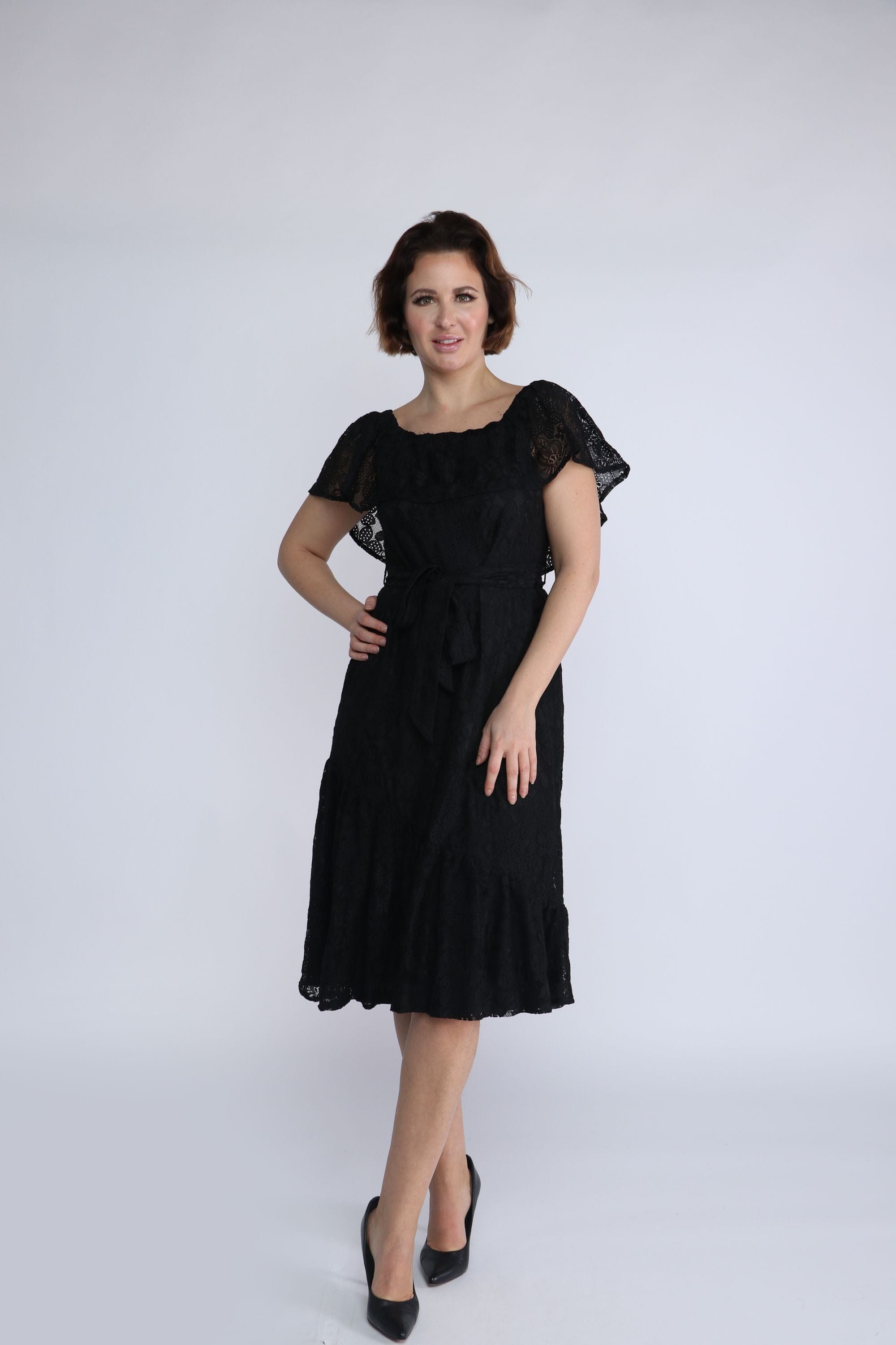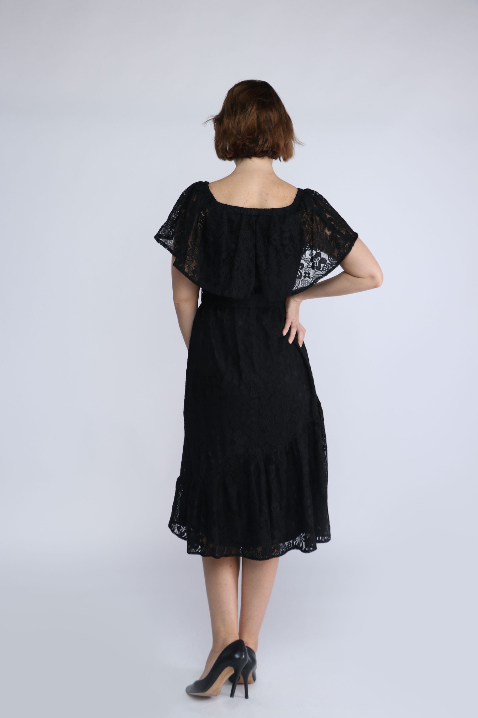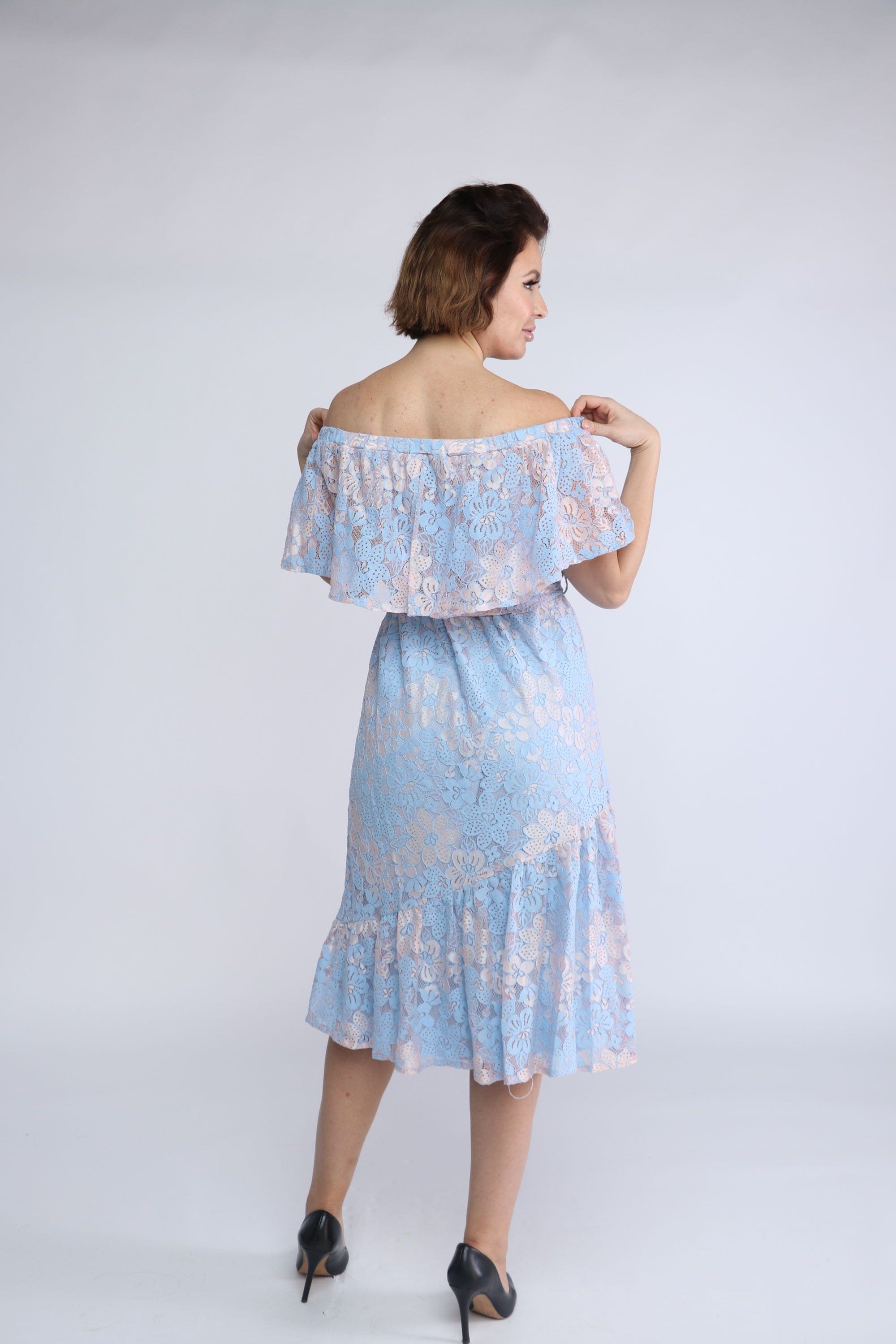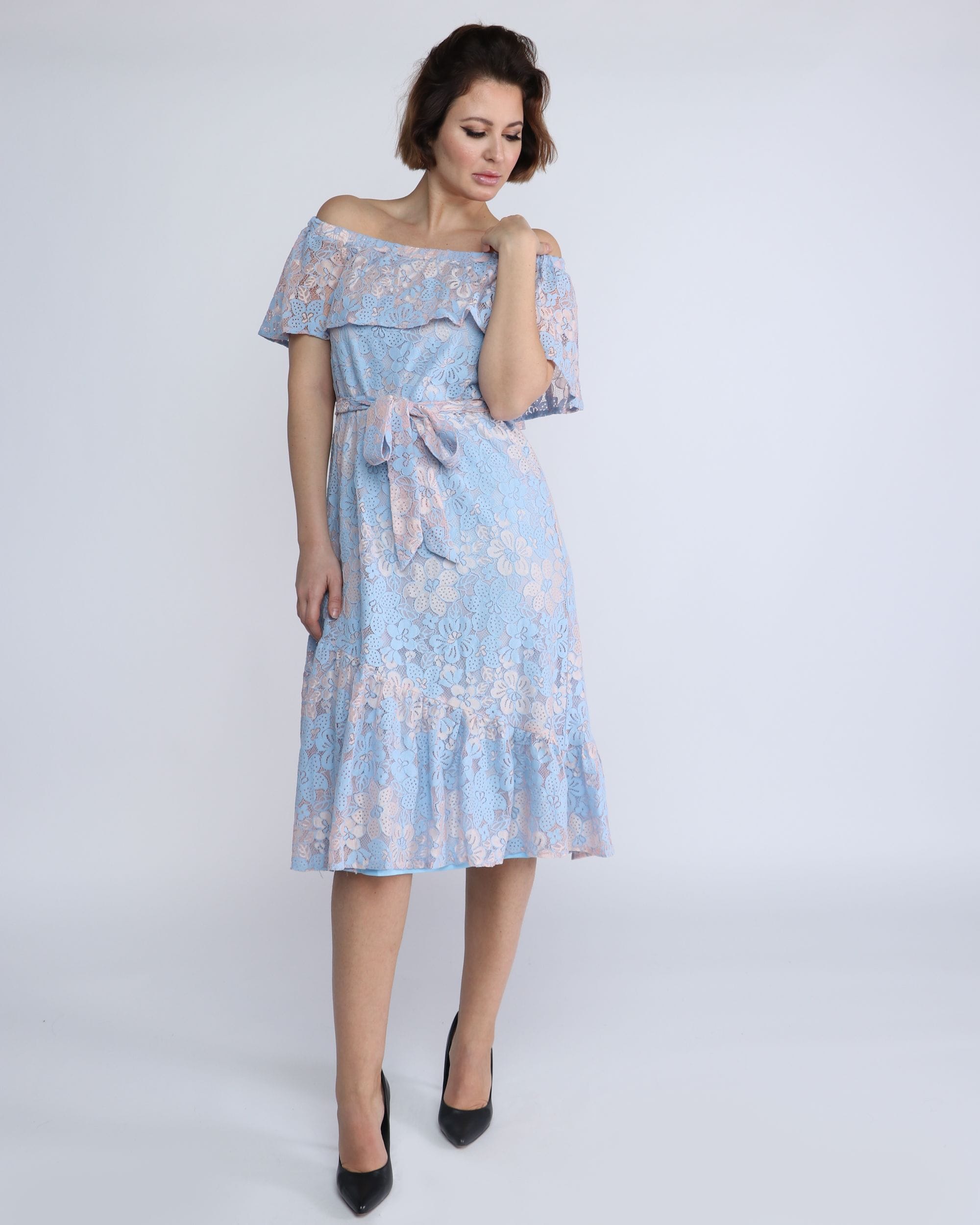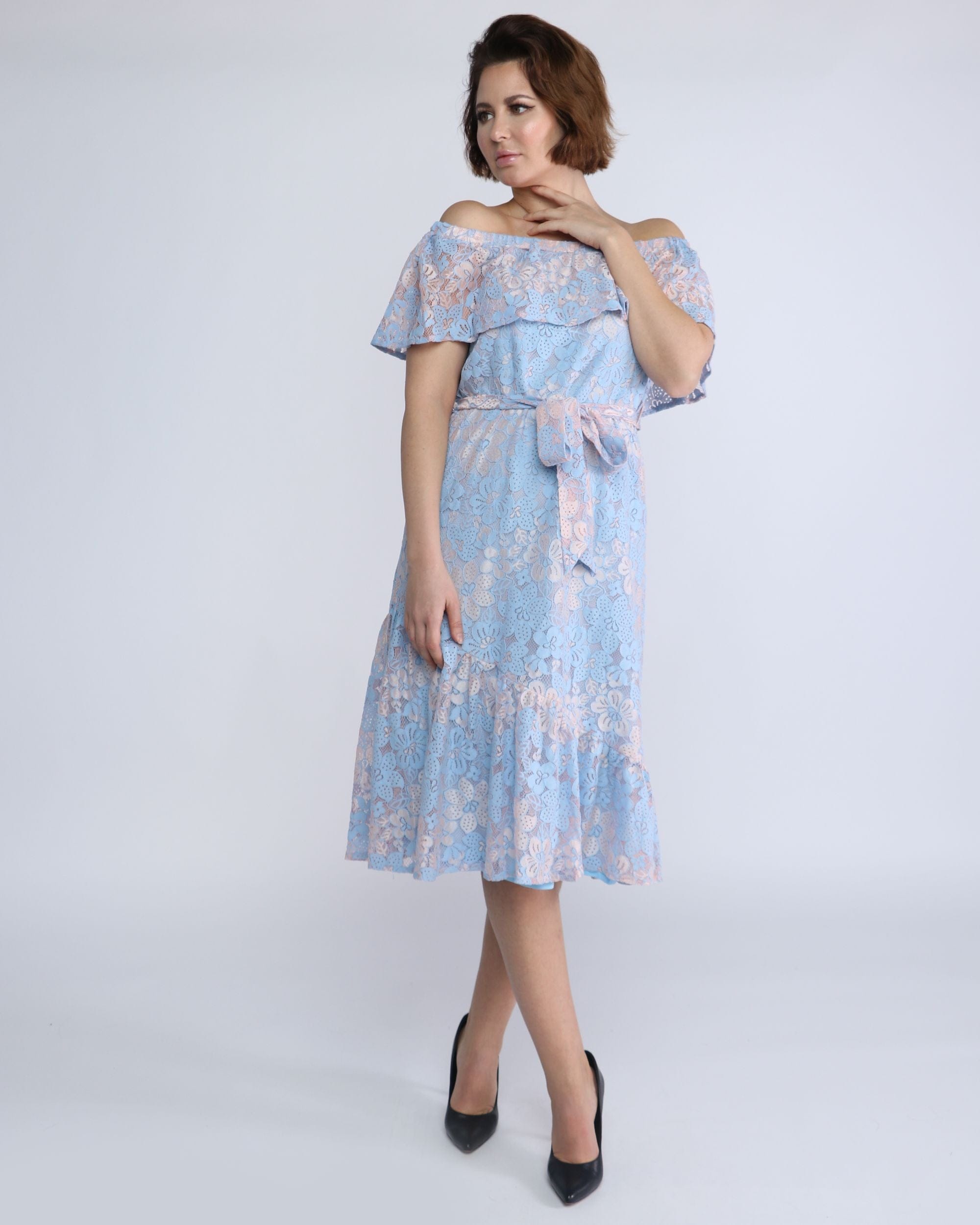 فستان ميدي دانتيل مفتوح من الكتف بفيونكة خصر بكم قصير