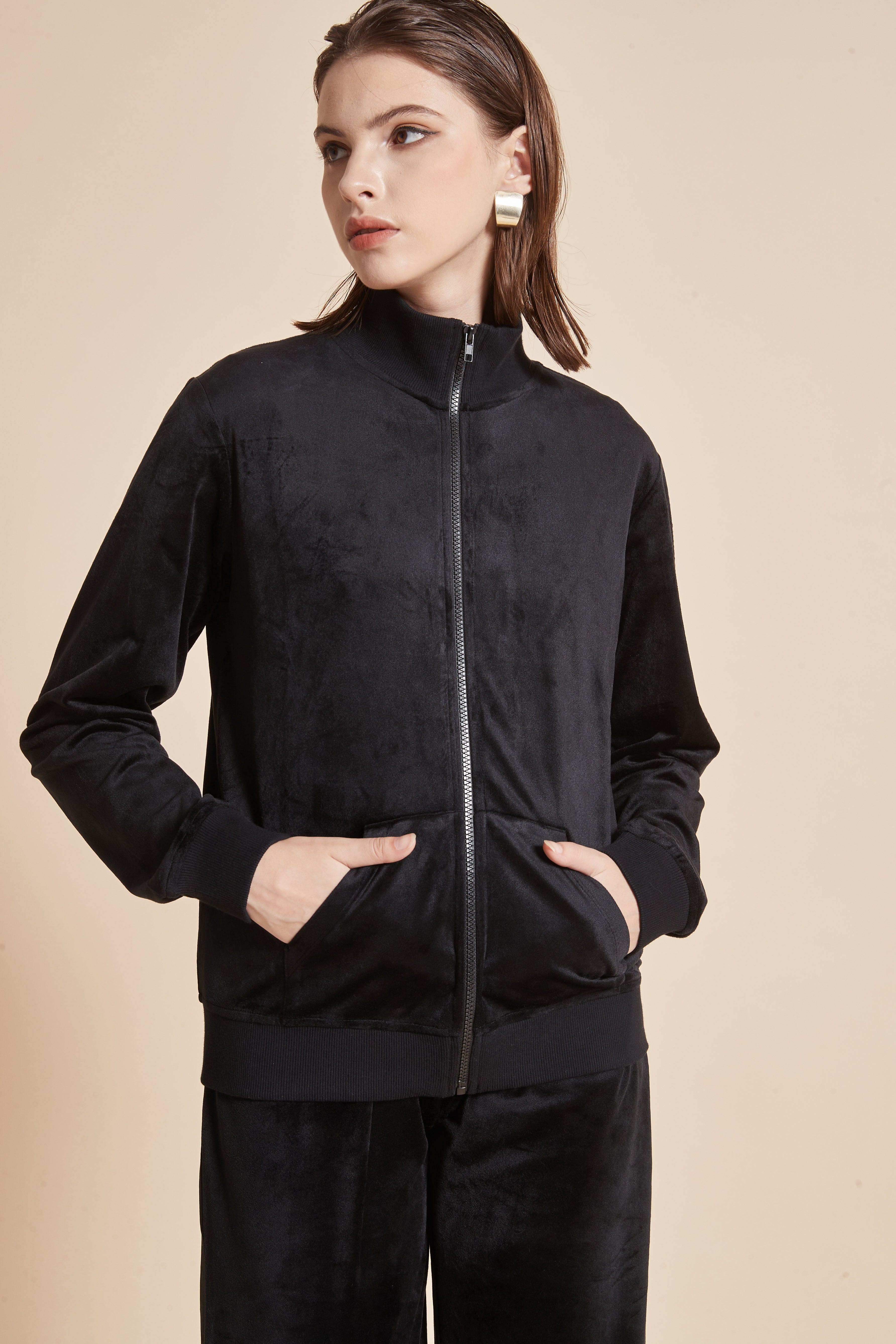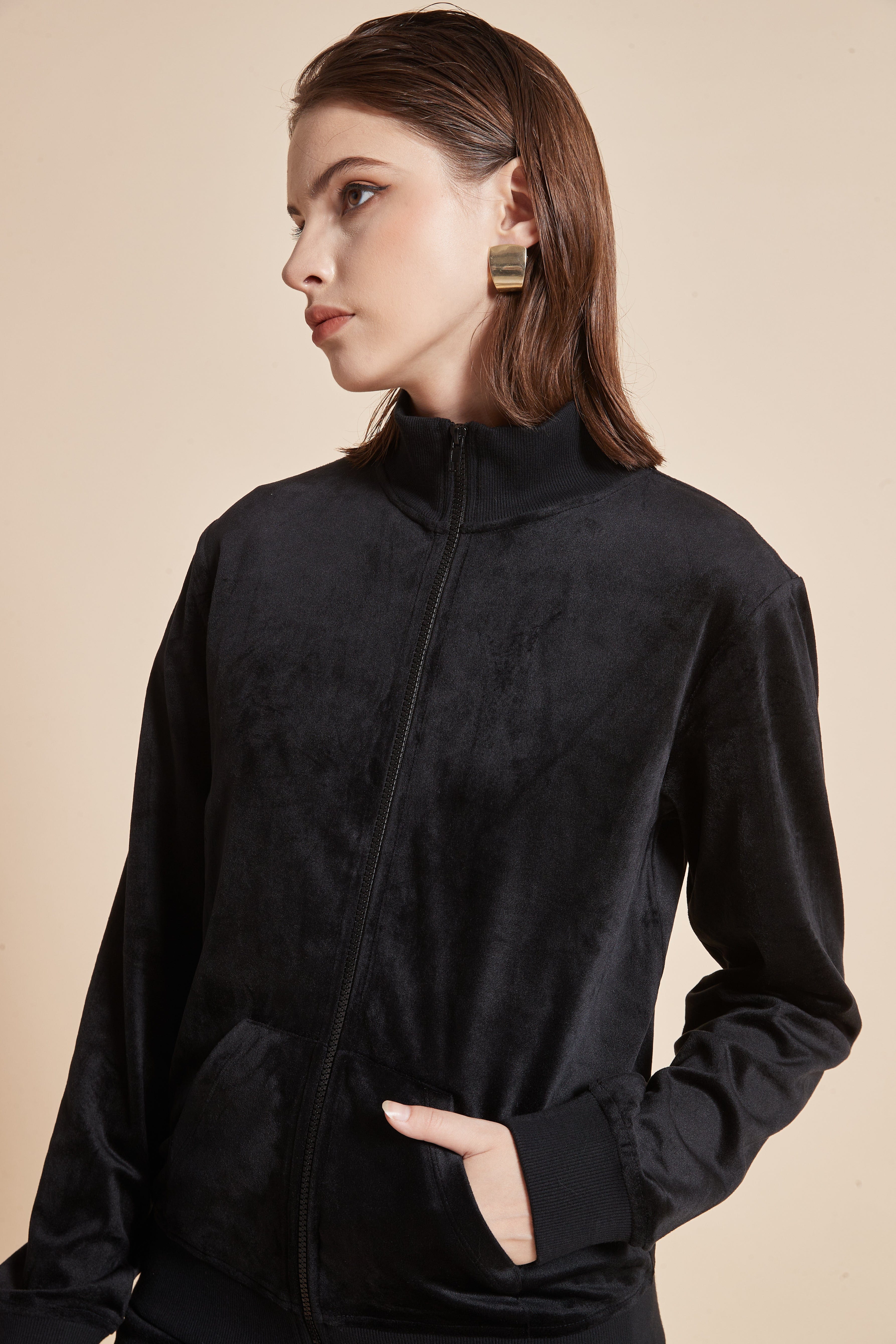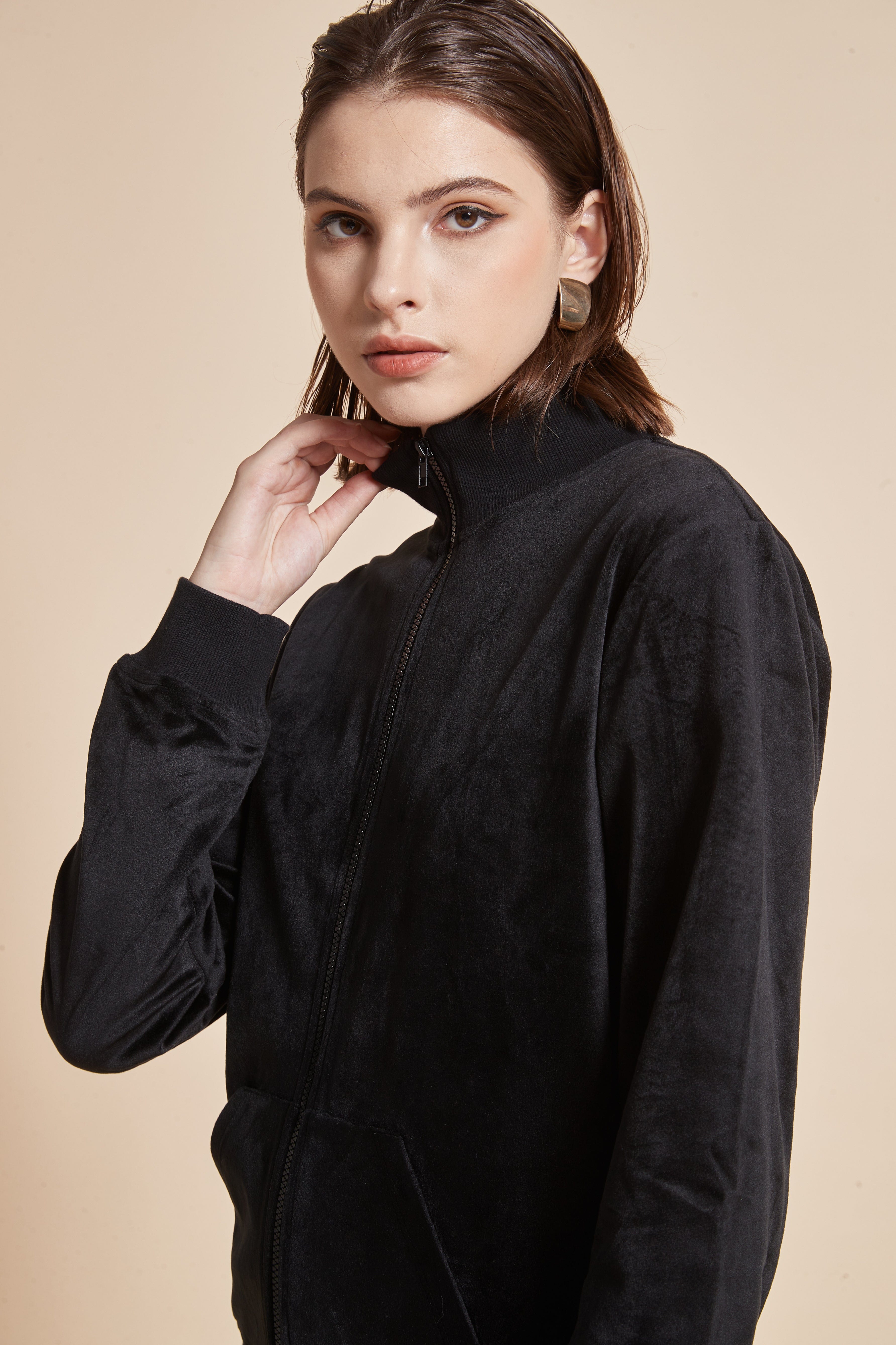 جاكيت مخملي بكم طويل وسحاب أمامي مع جيوب