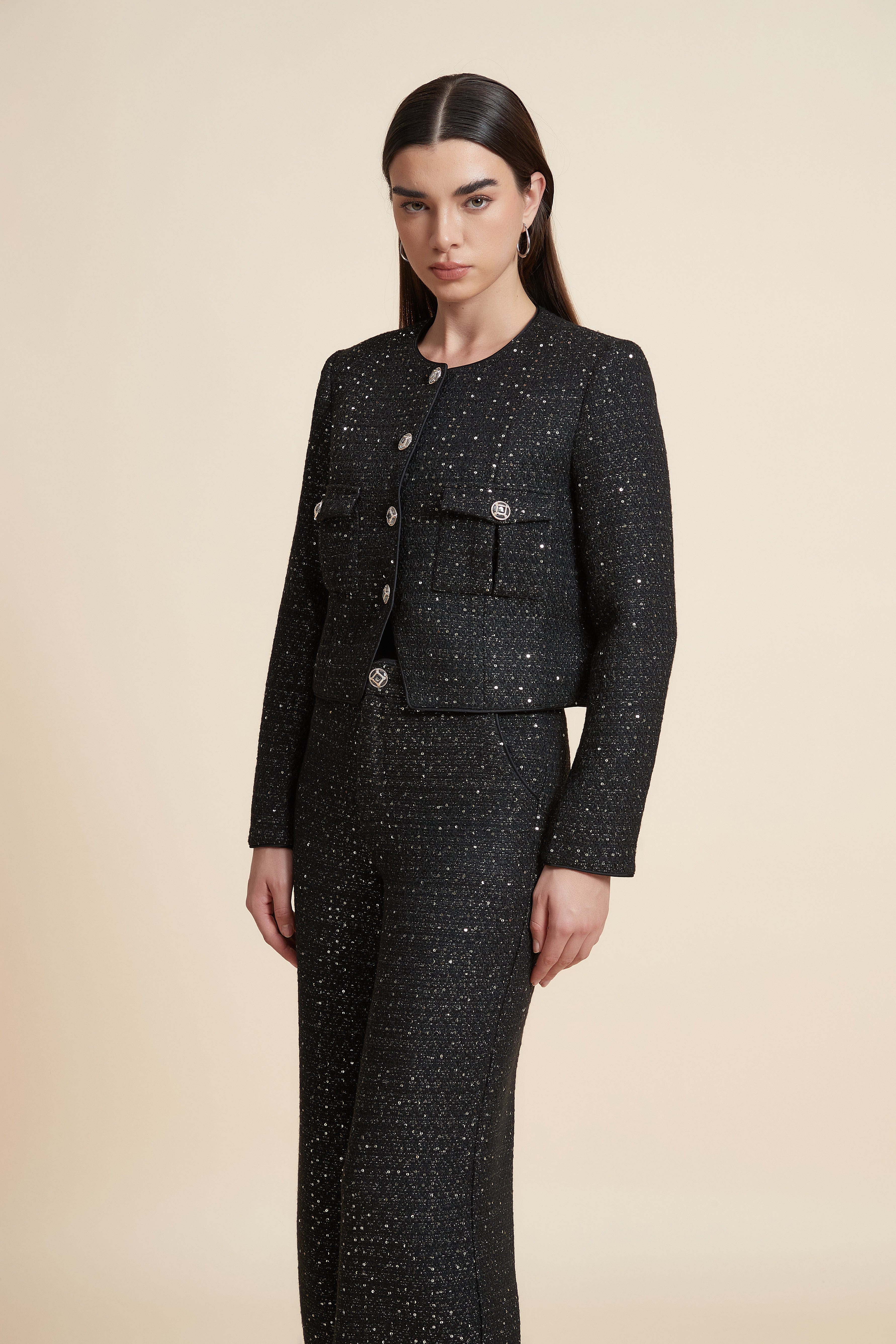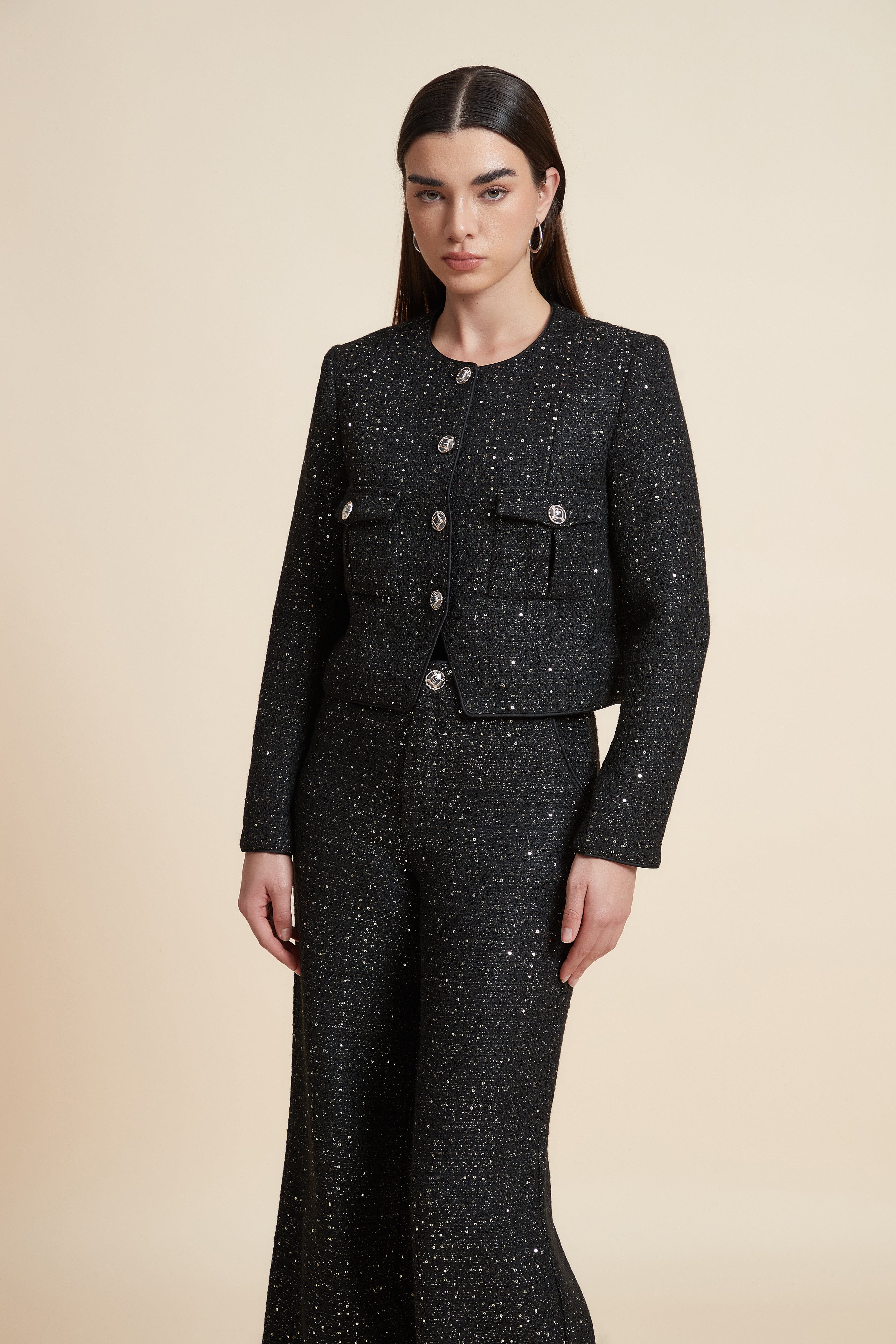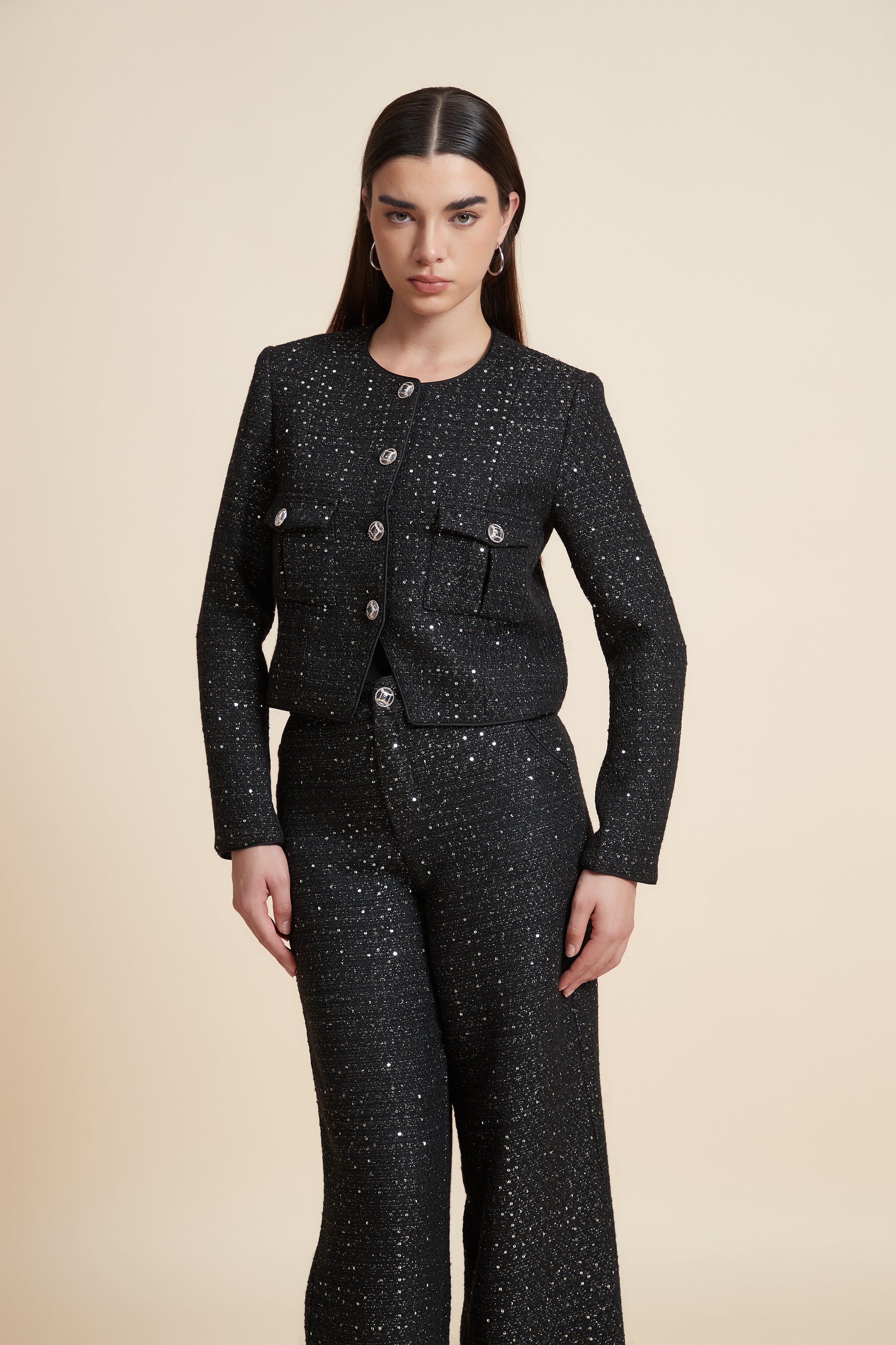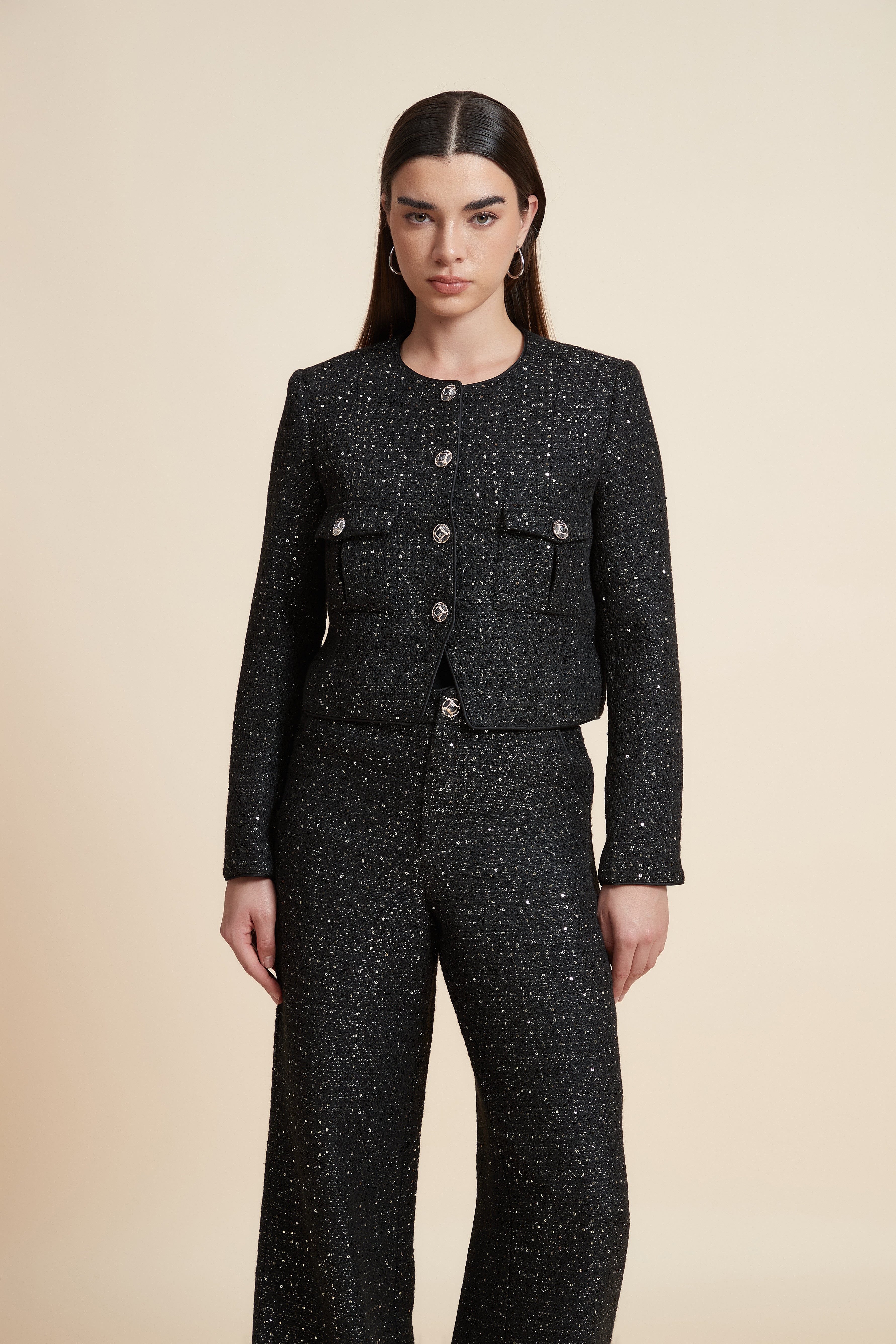 جاكيت قصير لامع اكمام طويلة بجيوب
