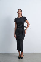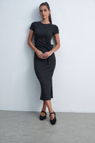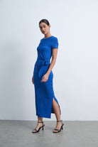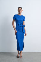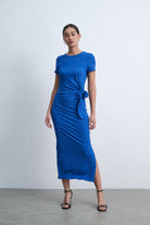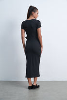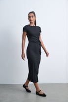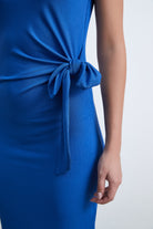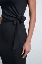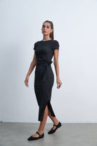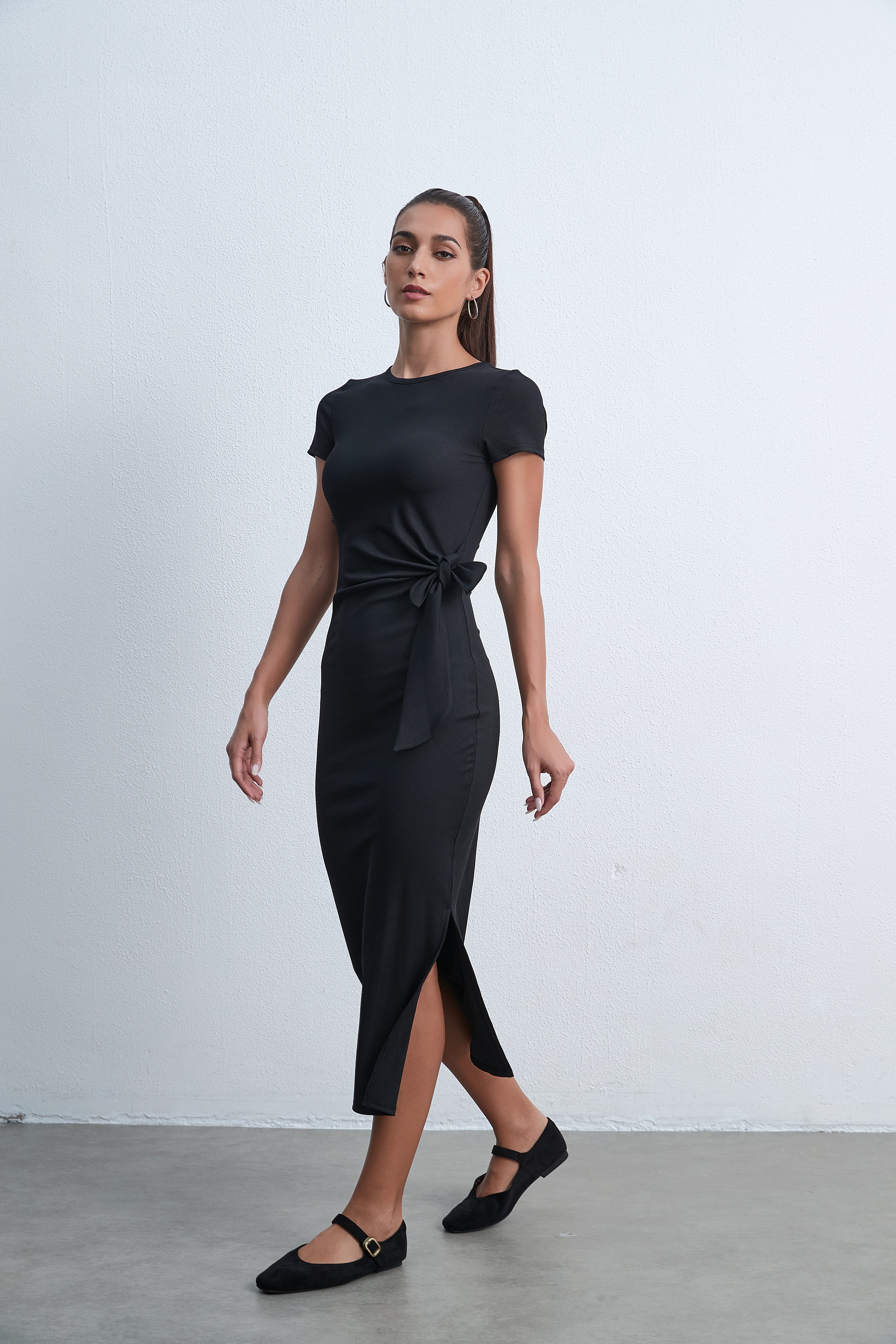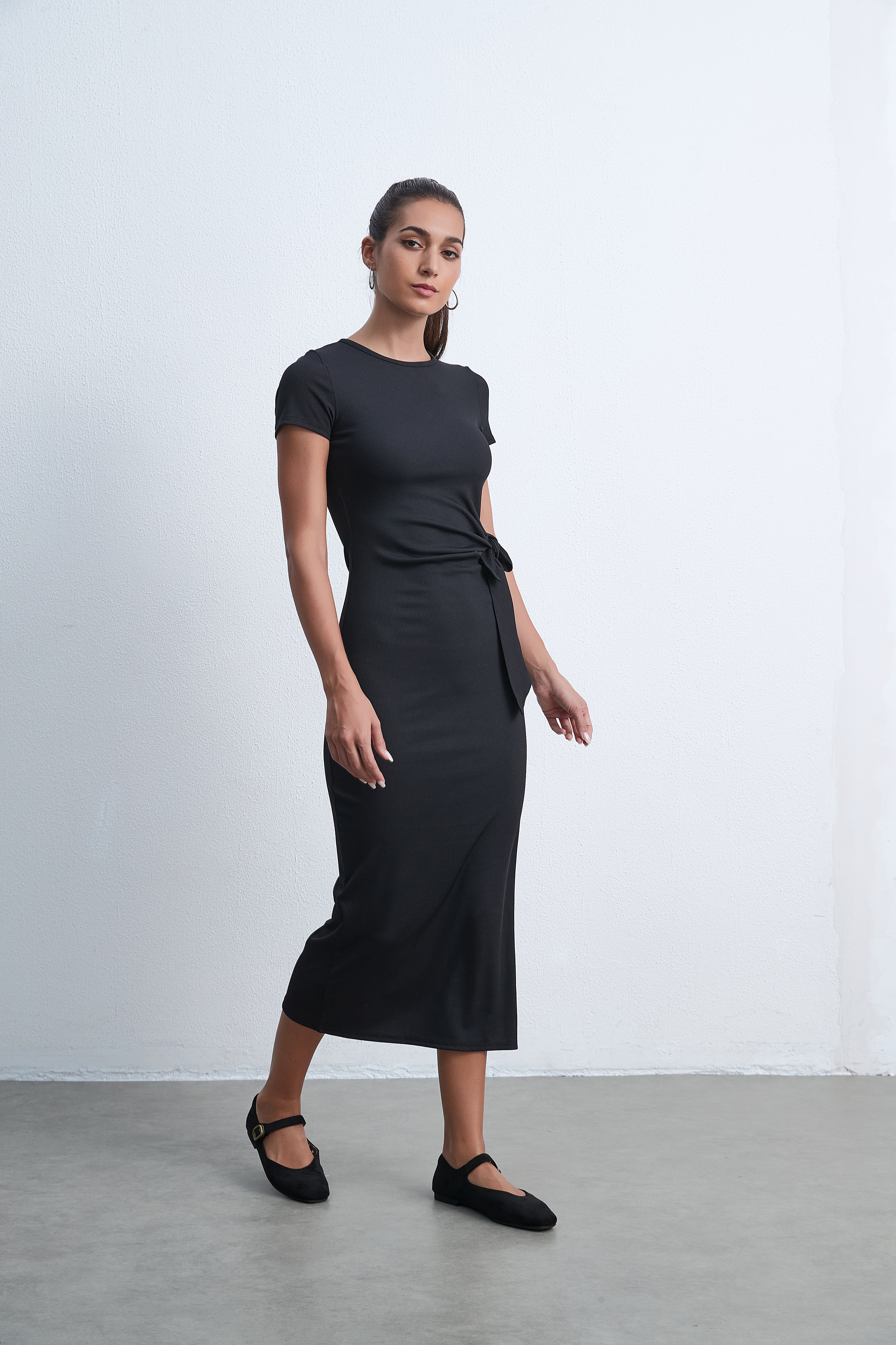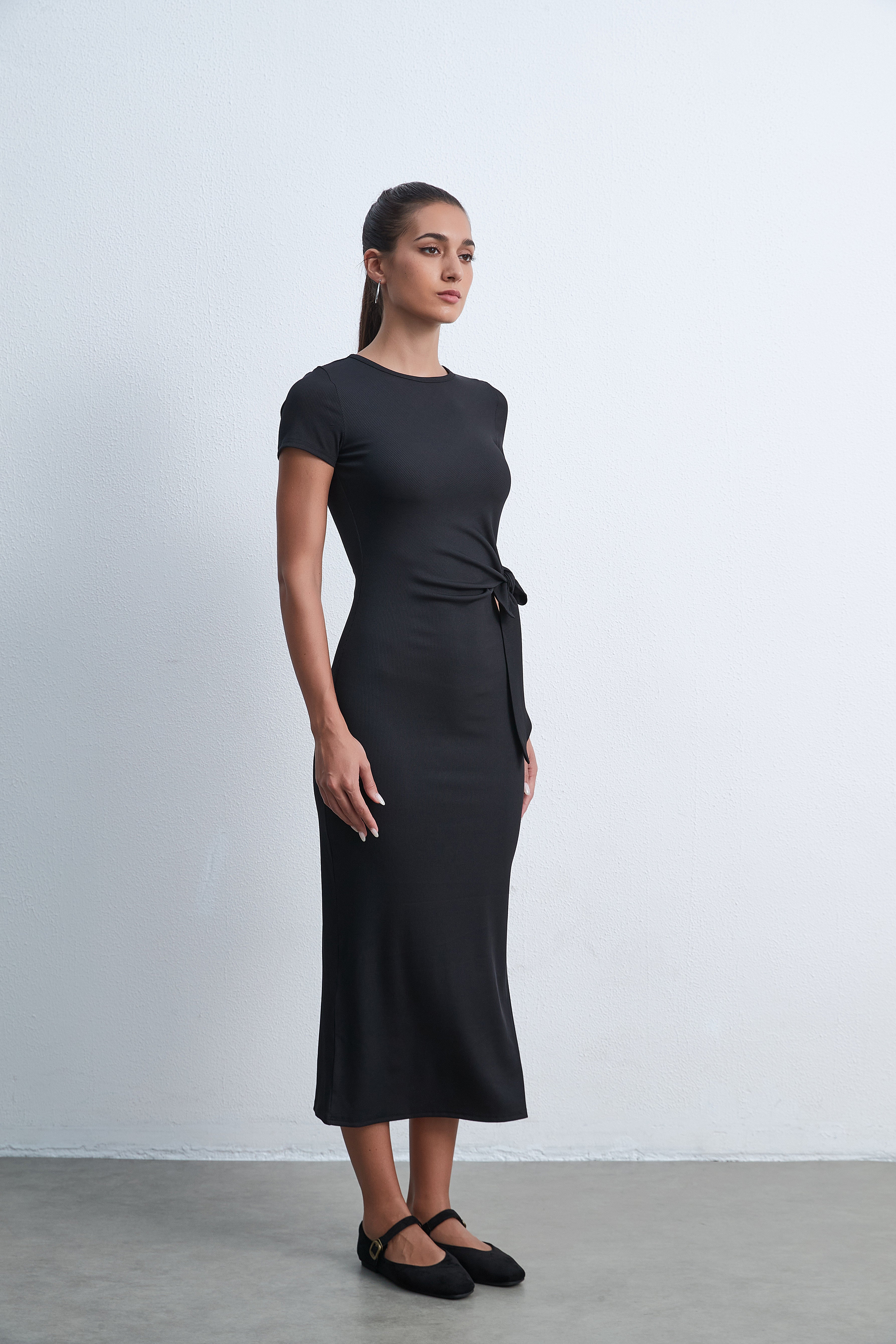 فستان ميدي بكم قصير سادة بفيونكة على الخصر
