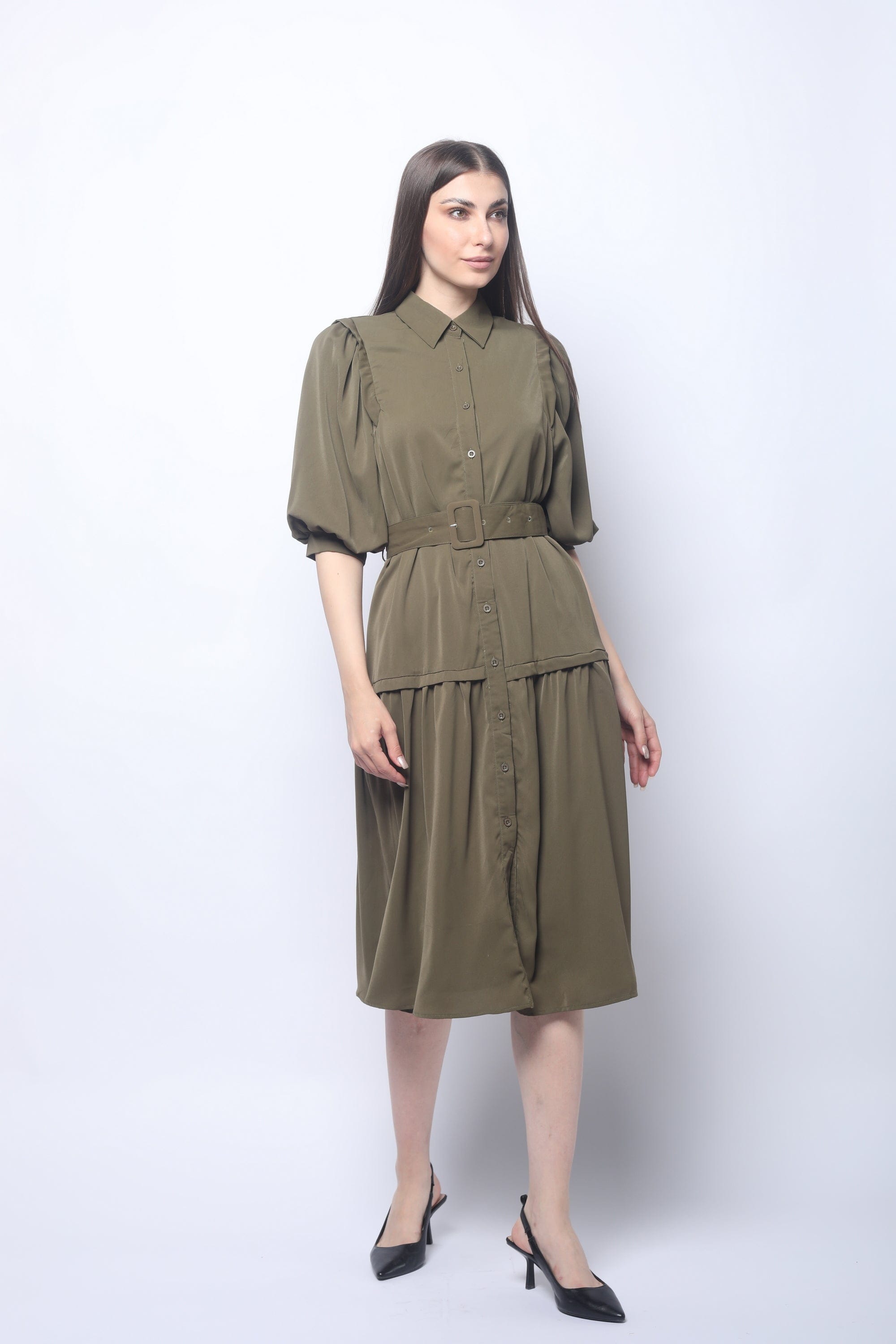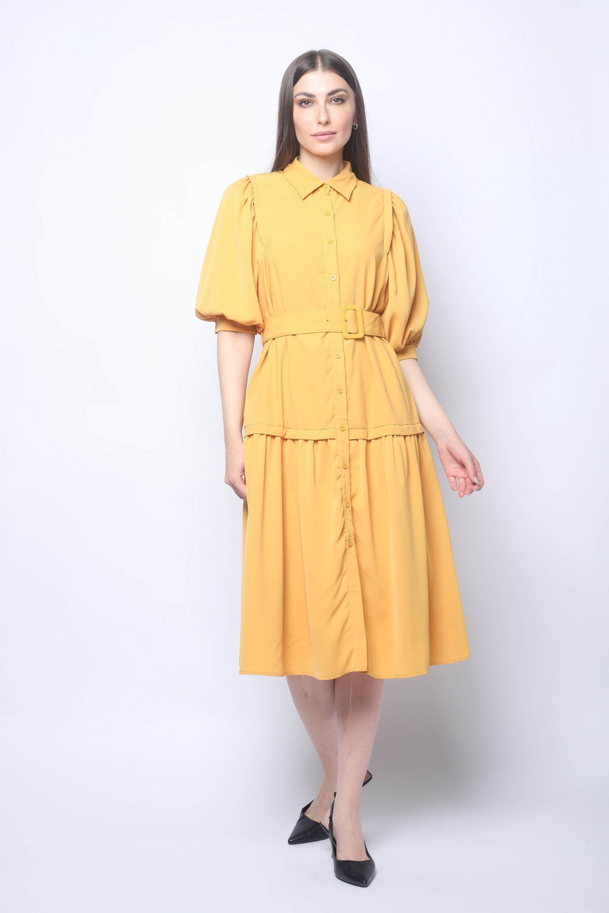 فستان ميدي سادة بأزرار أمامية نص كم بف