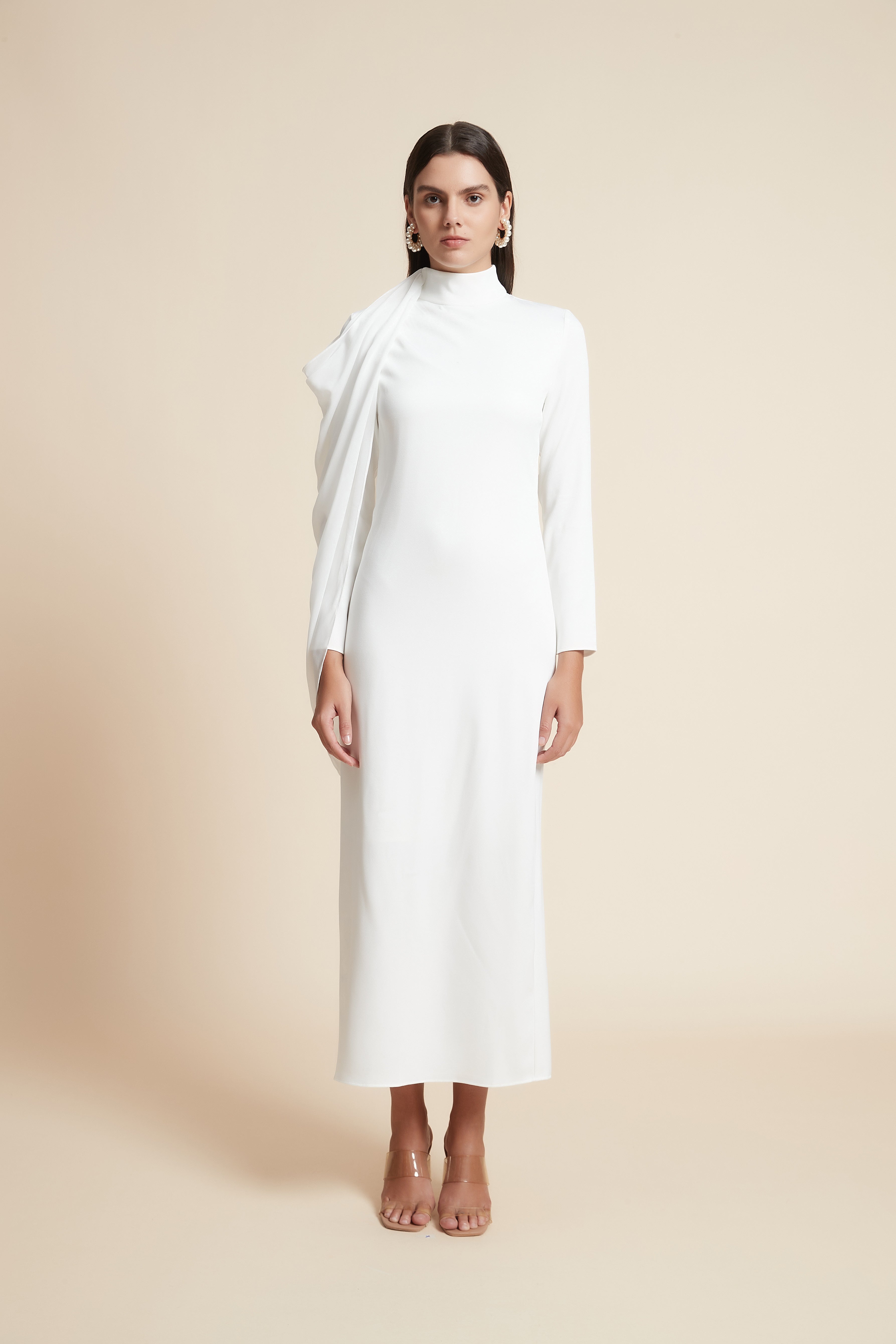 فستان ميدي بياقة مرتفعة وكم طويل سادة