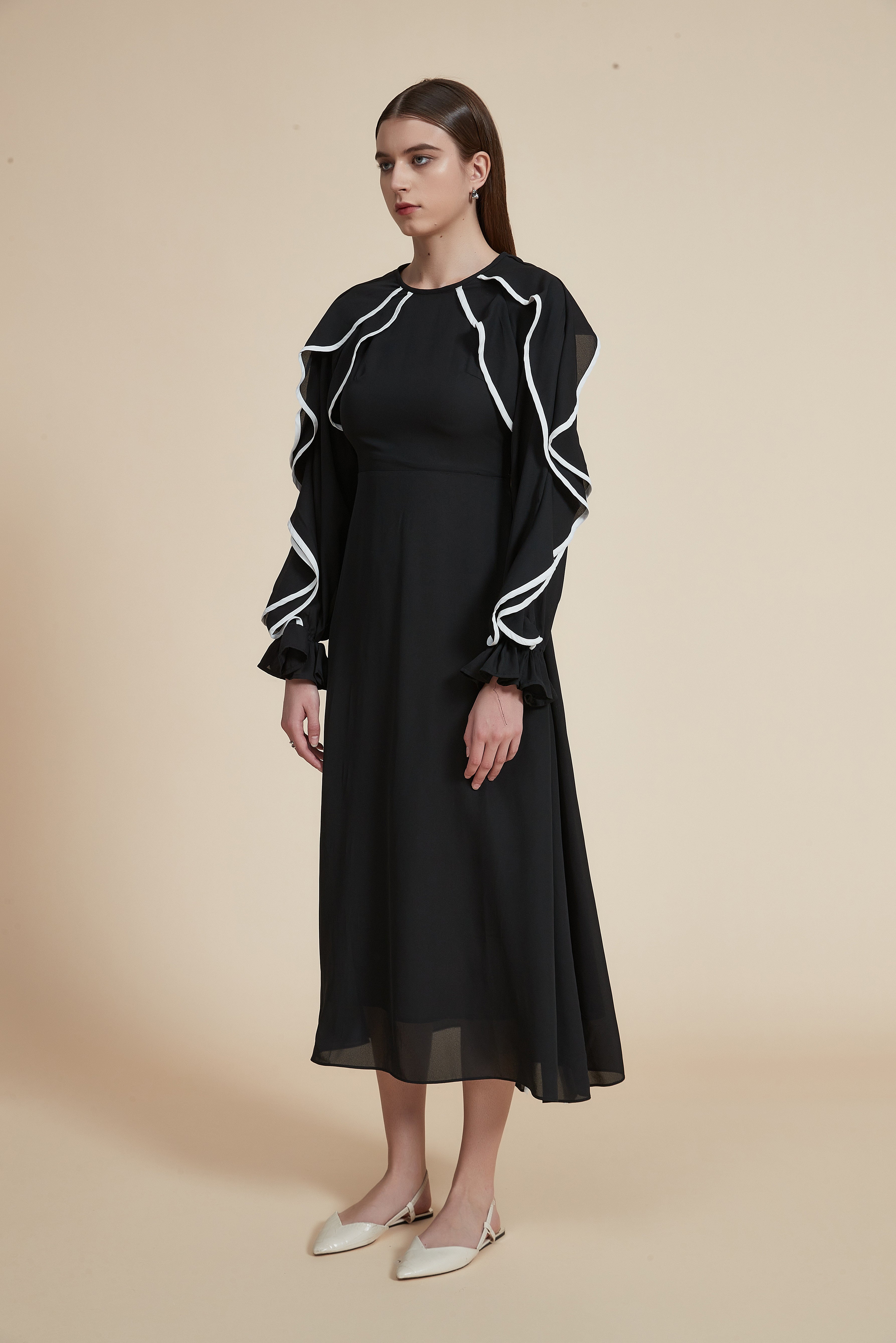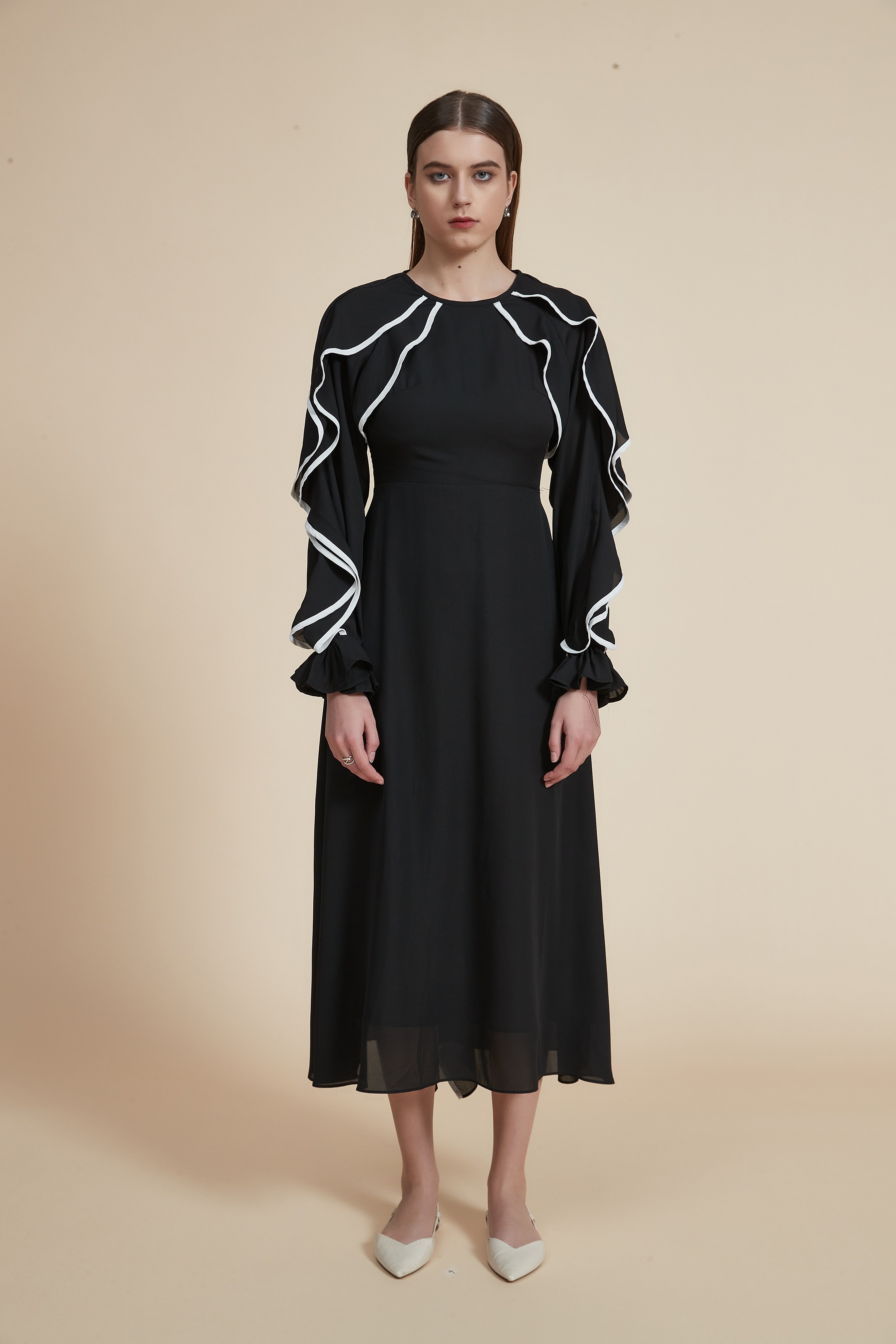 فستان ميدي بكم طويل وفتحة رقبة مستديرة