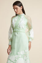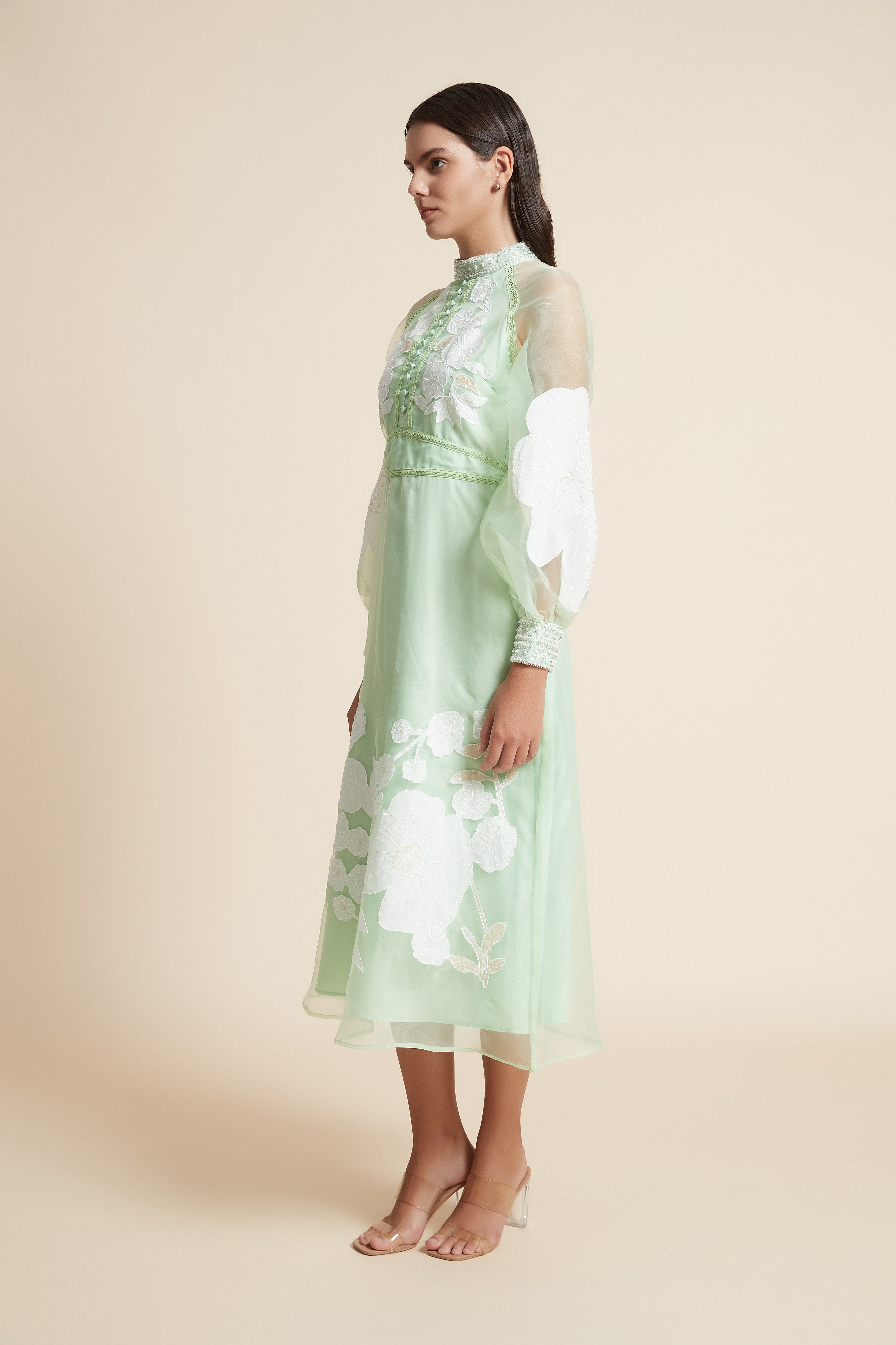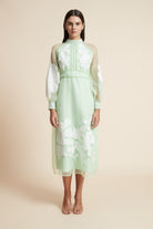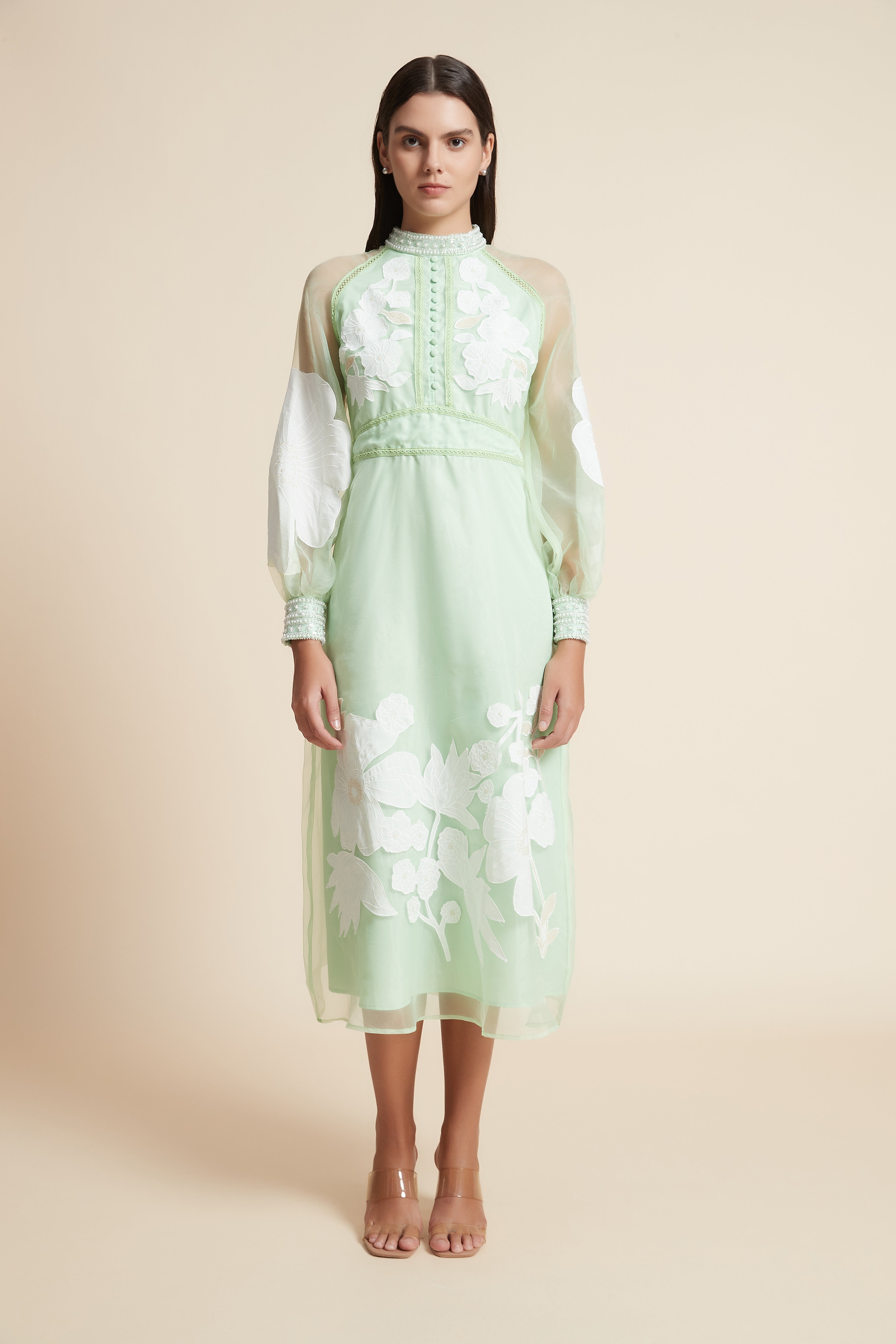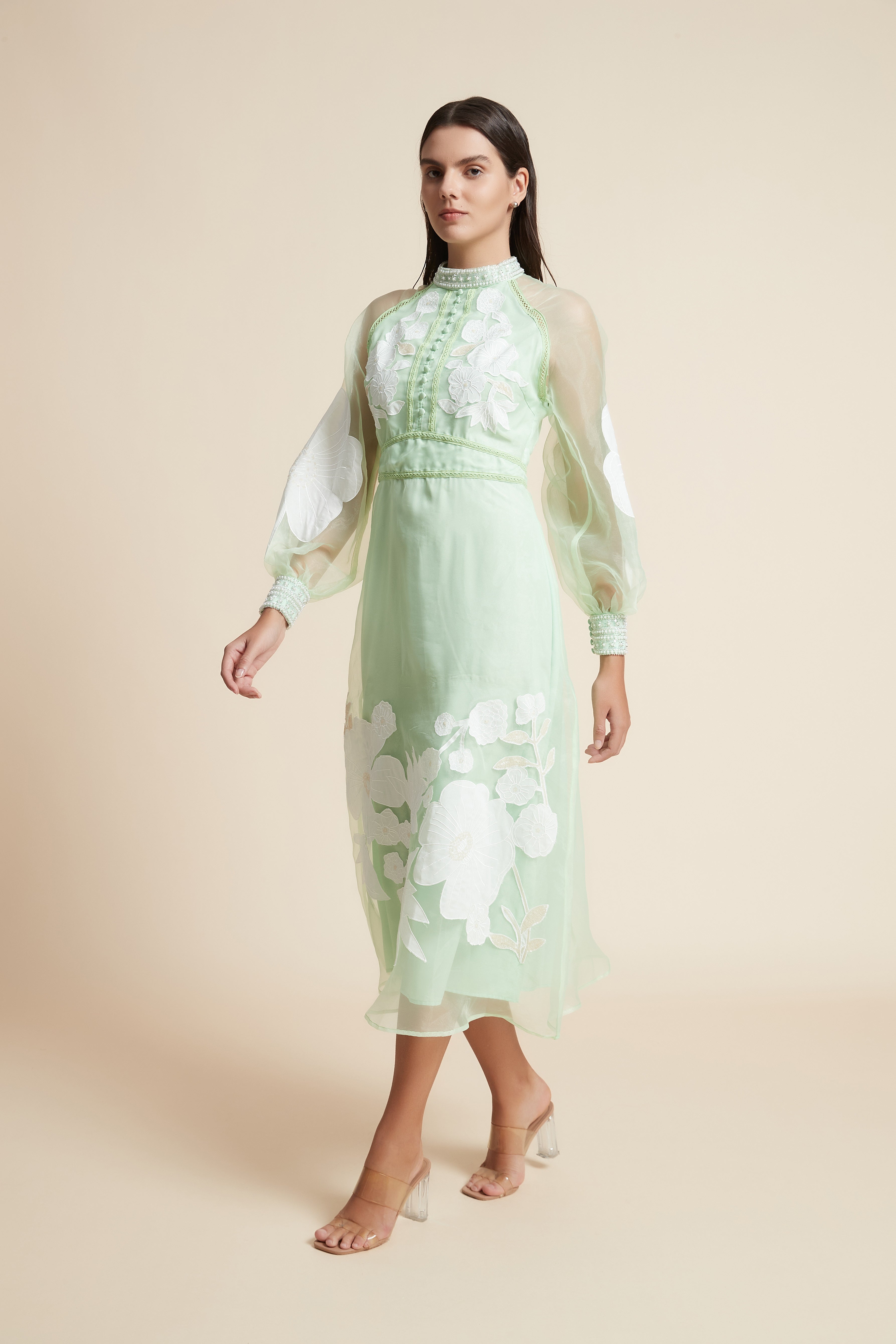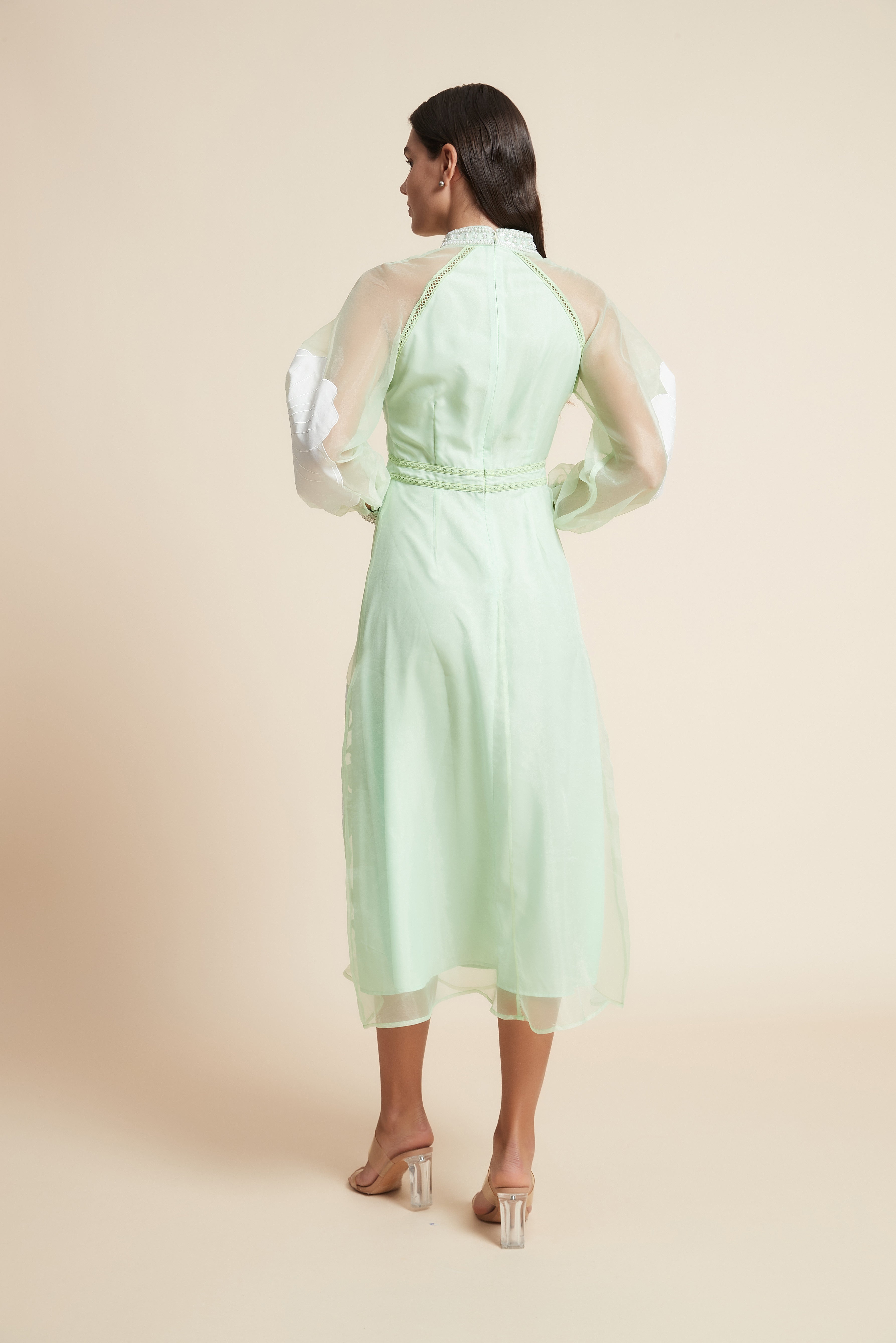 - التنسيق: نسقيه مع صندل مسطح أو بكعب متوسط لنهار الربيع، ومع حذاء بكعب منخفض ومجوهرات بسيطة لمساء أنيق. أضيفي سترة خفيفة عند الحاجة، واللون الأخضر الفاتح ينسجم مع إكسسوارات ببيج أو ذهبي.