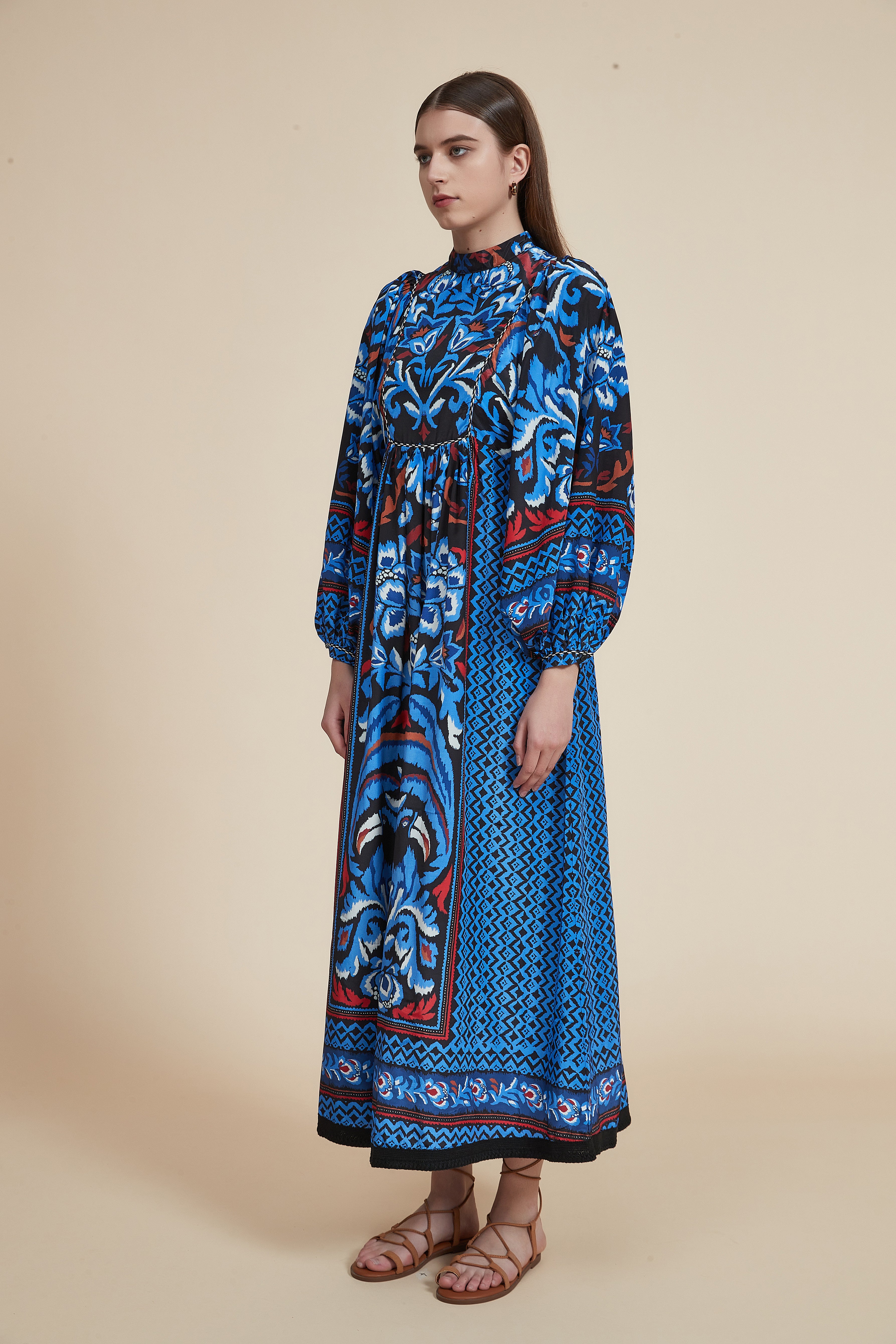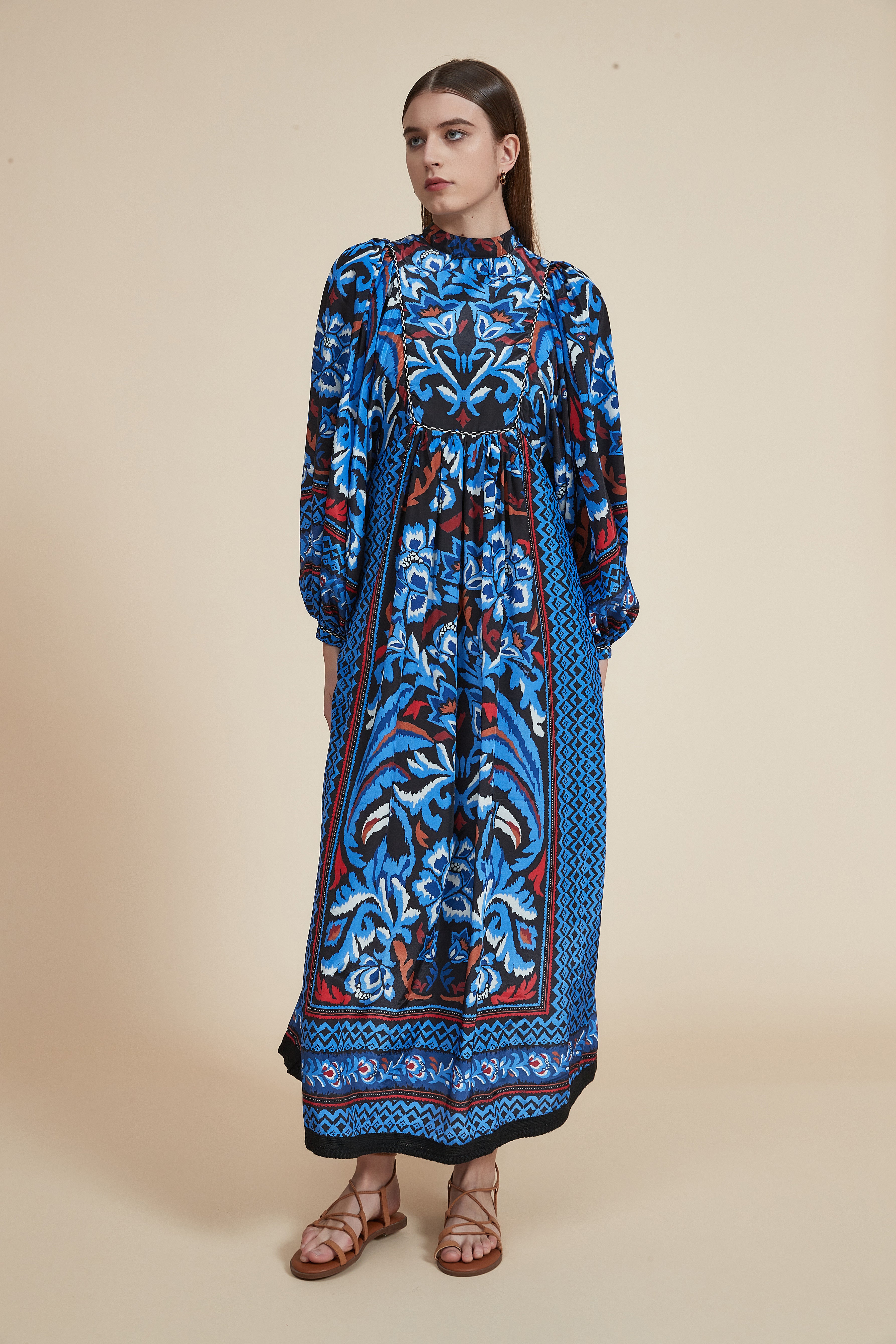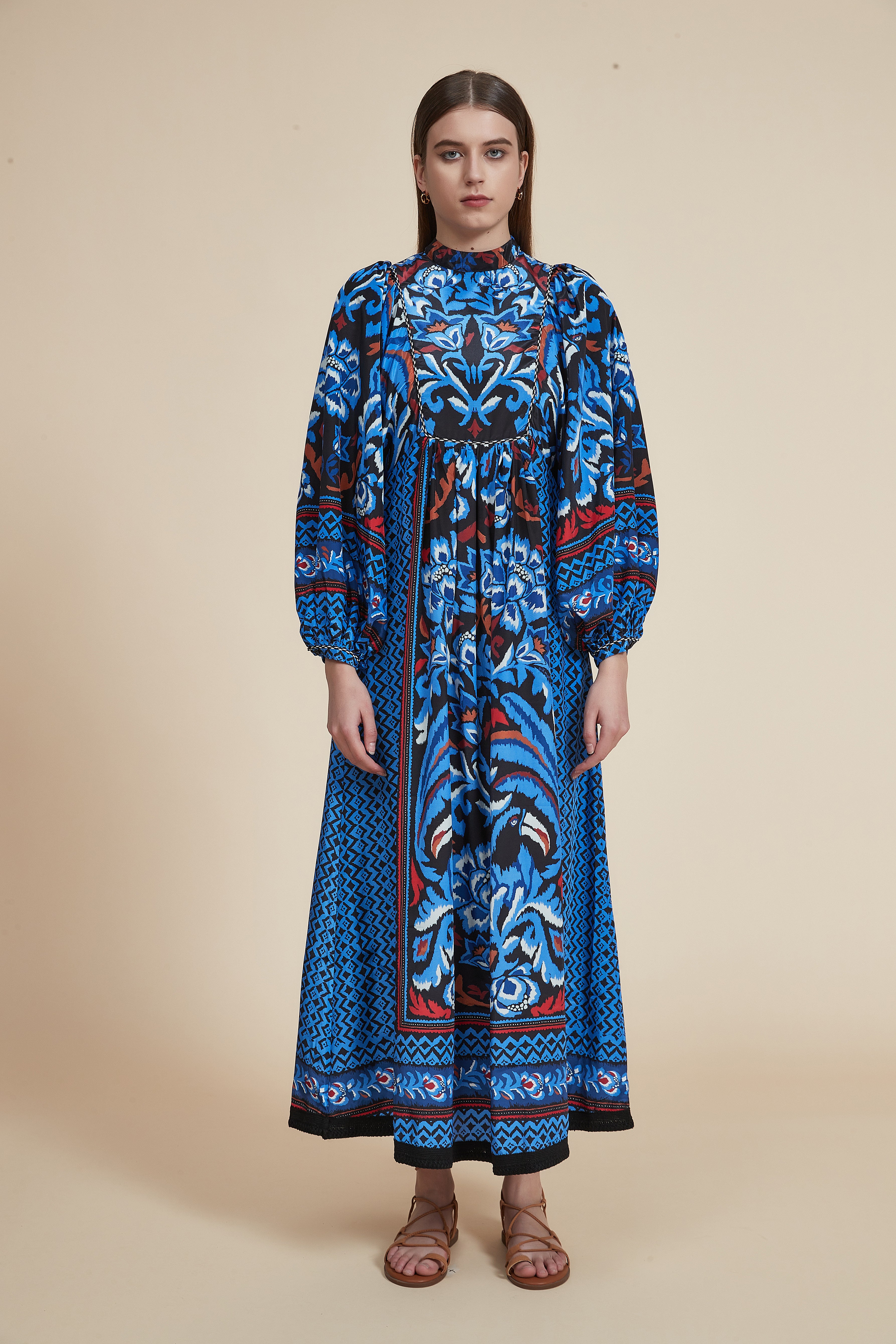 لو تبحثين عن فستان يجمع بين الأناقة والراحة اليومية، هذا الفستان ماكسي بقصة A هو خيار رائع. الخامة بسمك متوسط وبدون بطانة، تمنحك إحساس خفيف مناسب لكل المواسم. النقشة المتعددة الألوان على أساس أزرق تضيف لمسة حيوية، والياقة العالية مع الكم الطويل تعطي مظهرًا مواكبًا للموضة وفيه طابع محتشم. قصة عادية تجعل القطعة سهلة الارتداء يوميًا، مع تصميم بدون جيوب وبدون حزام للحفاظ على انسيابية الخطوط. مثالي للخروجات الكاجوال، ستحبين كيف يتحرك معك عند المشي، ويمكن تحويله بمجوهرات بسيطة لموعد مسائي هادئ. اعثري على مقاسك في فاشن السعودية وأضيفي هذه القطعة المتنوعة إلى خزانة ملابسك اليوم.