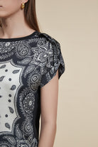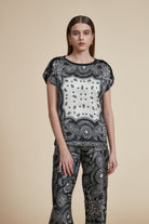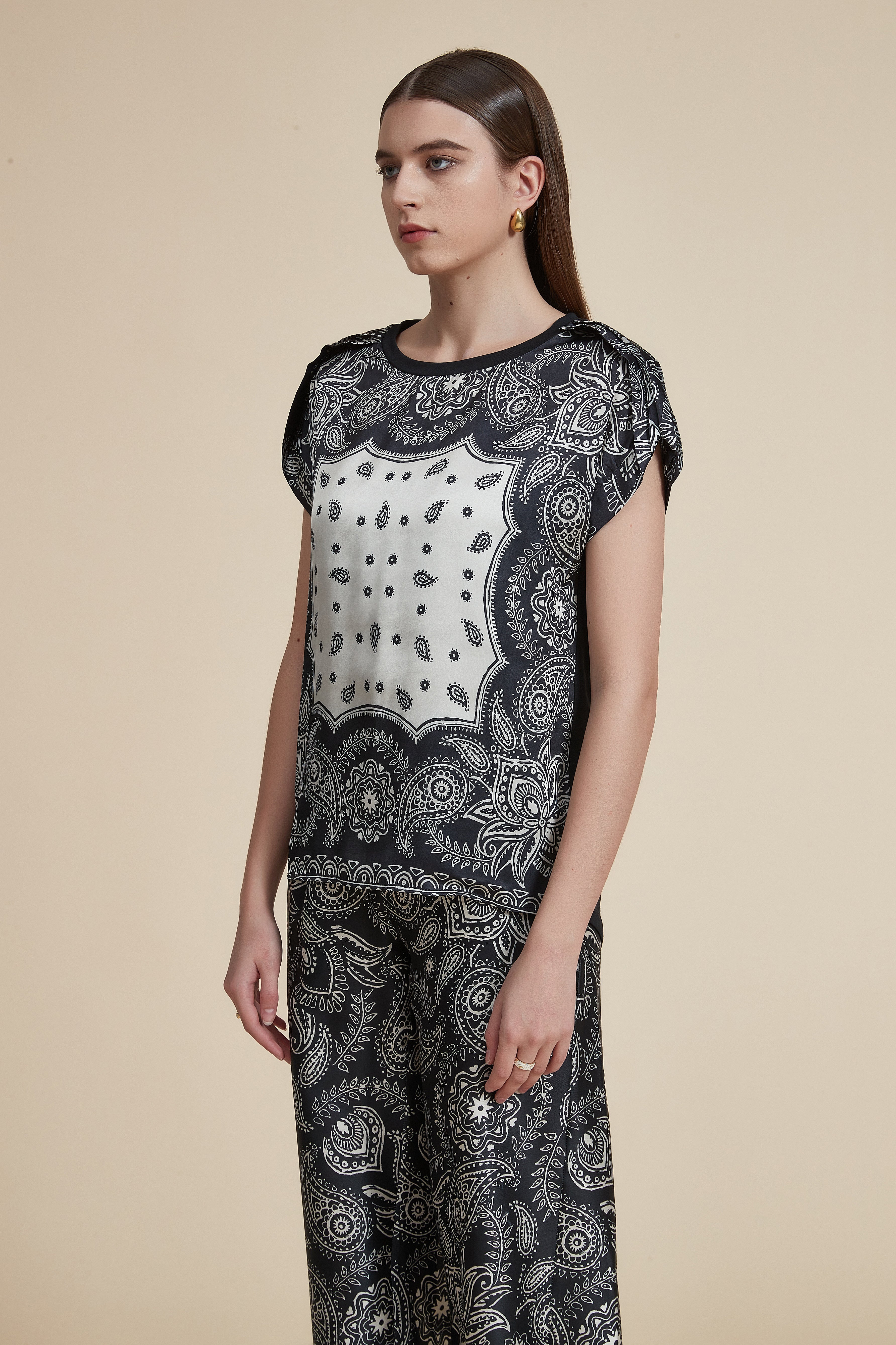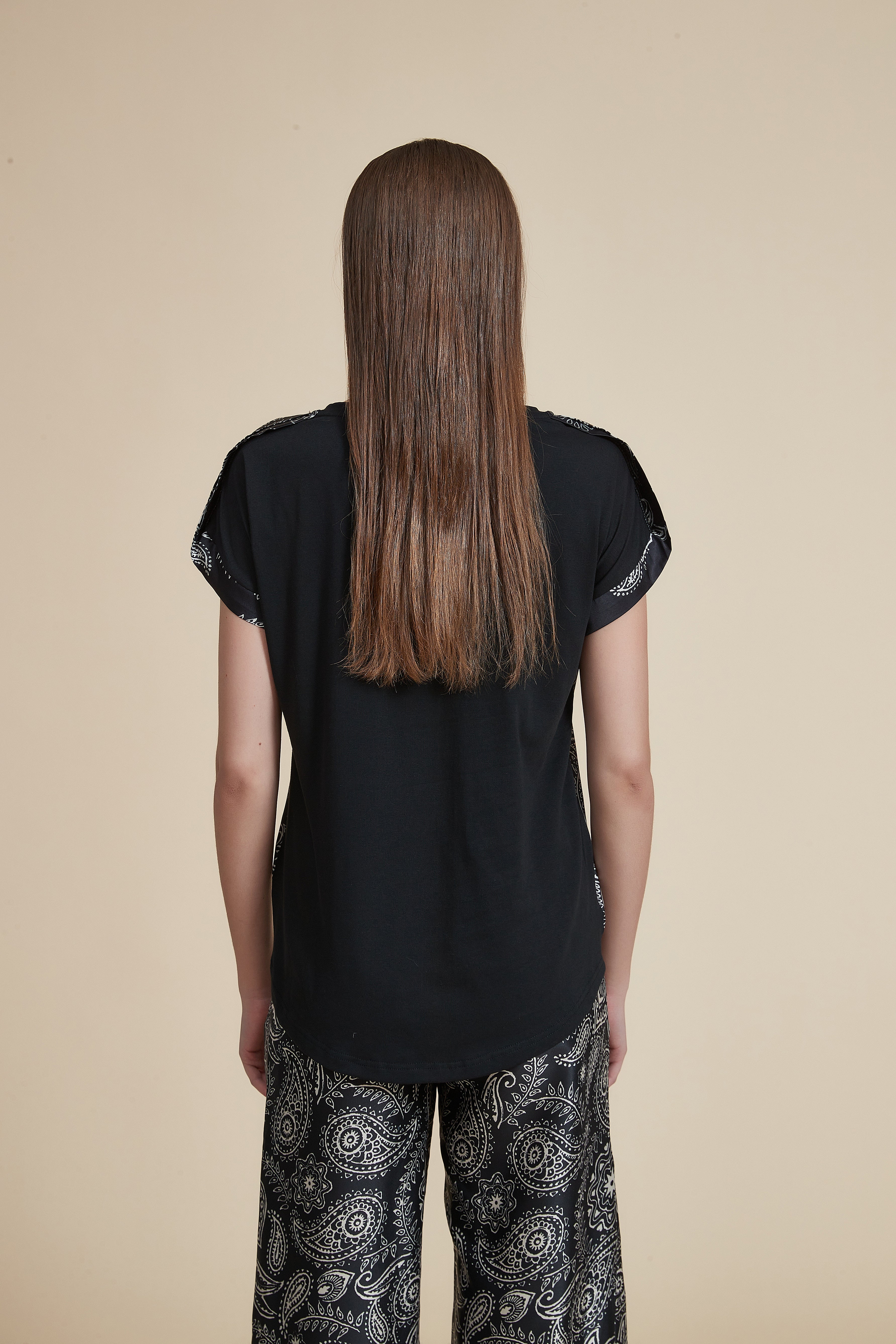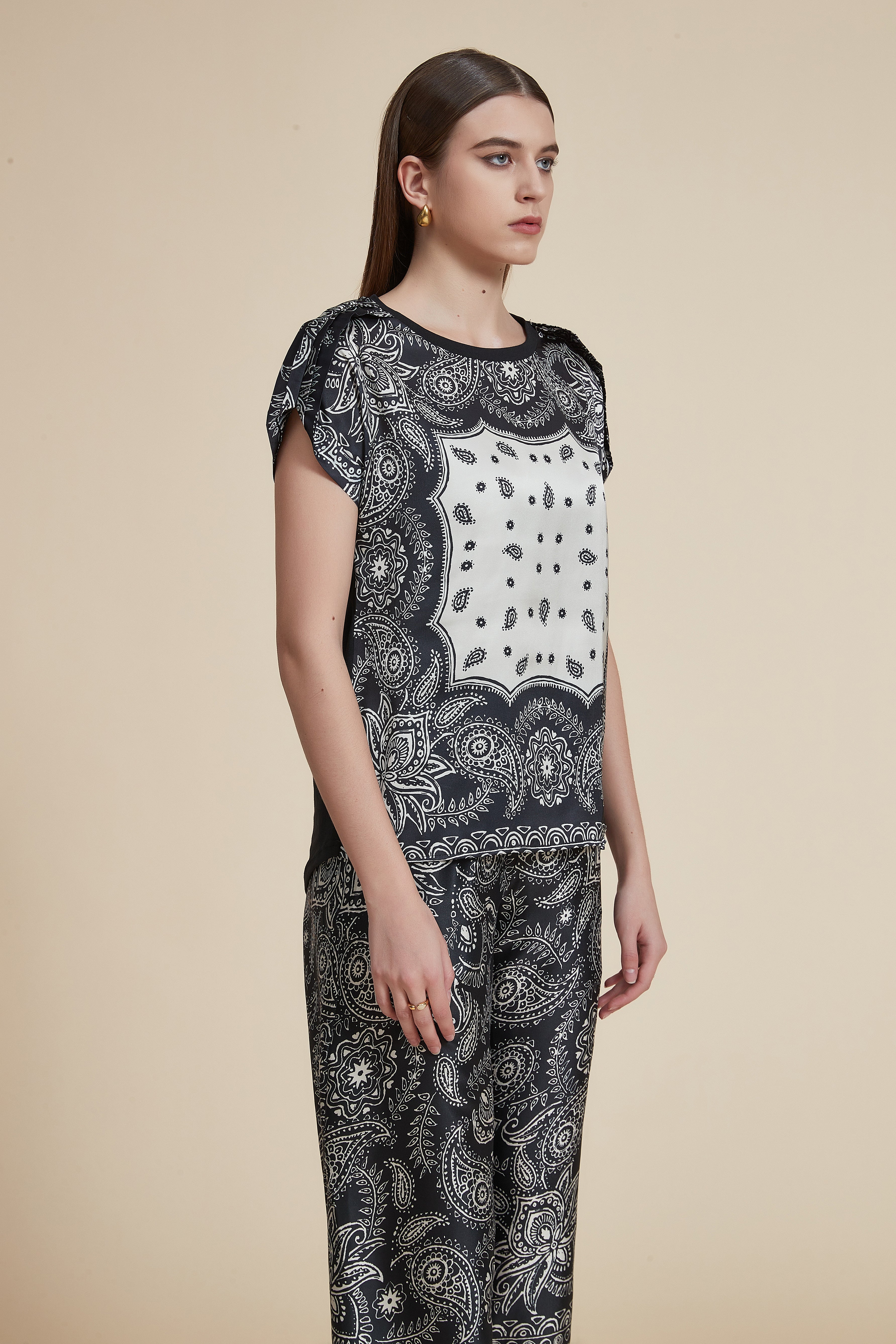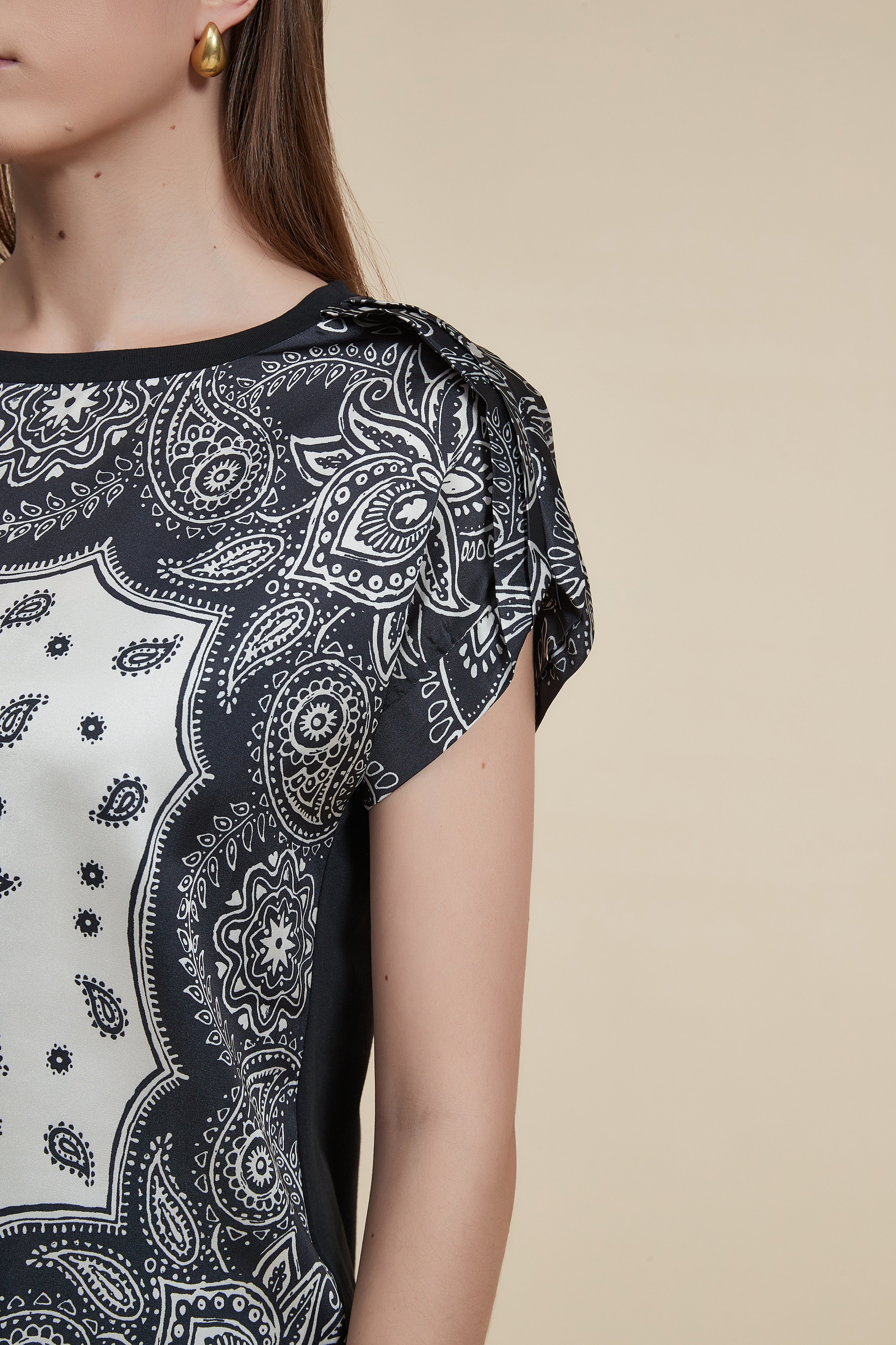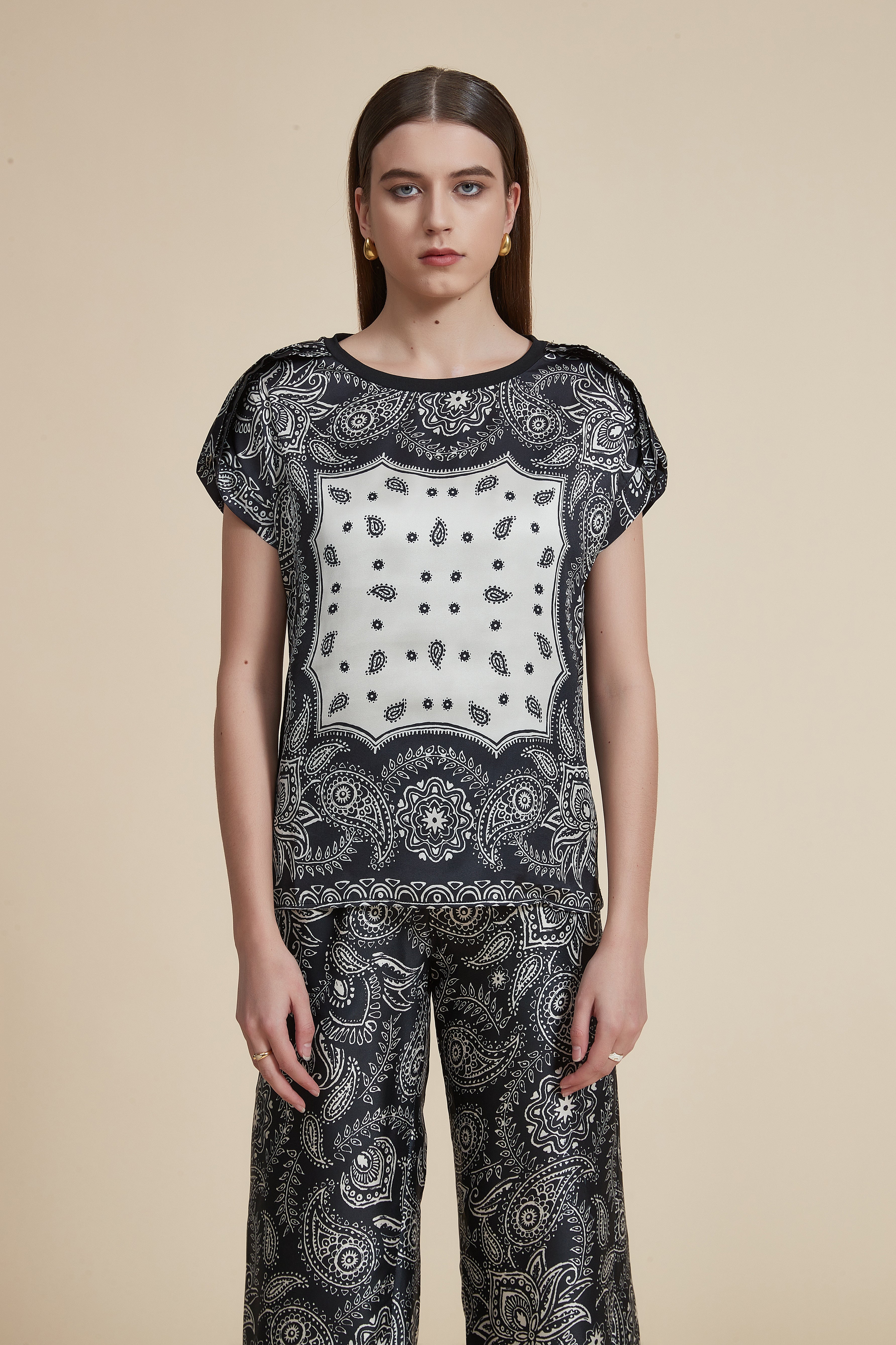 بلوزة قصيرة الأكمام مزخرفة بياقة دائرية