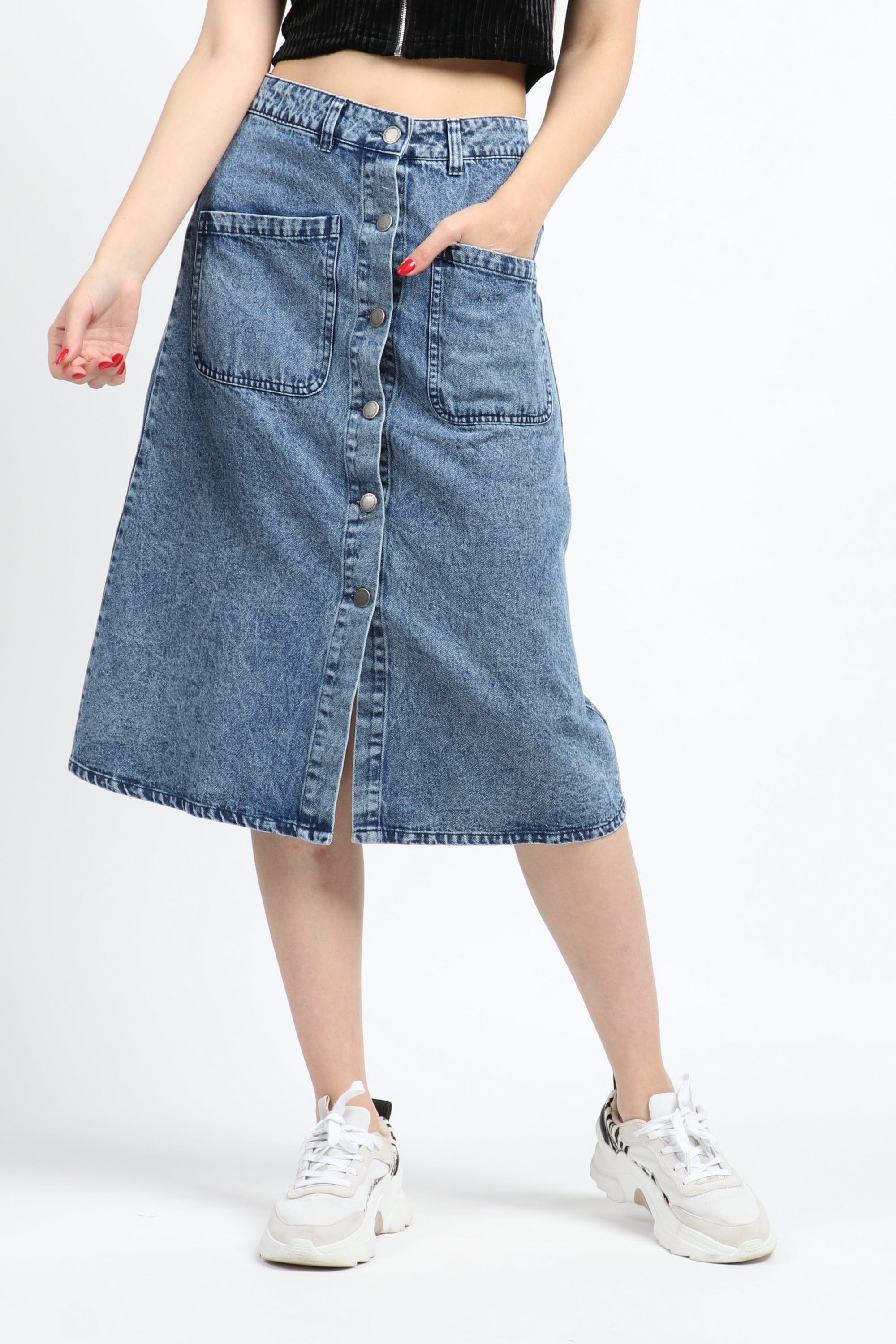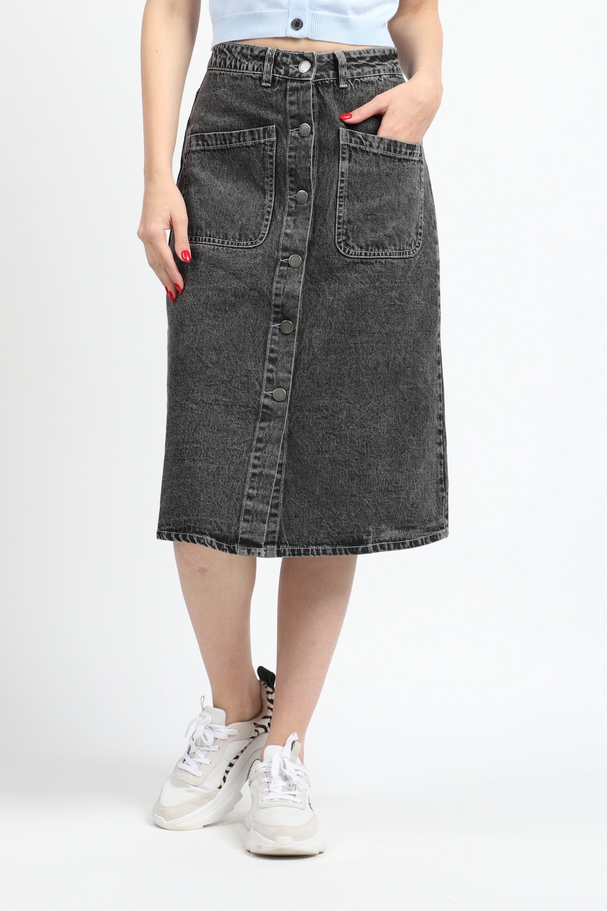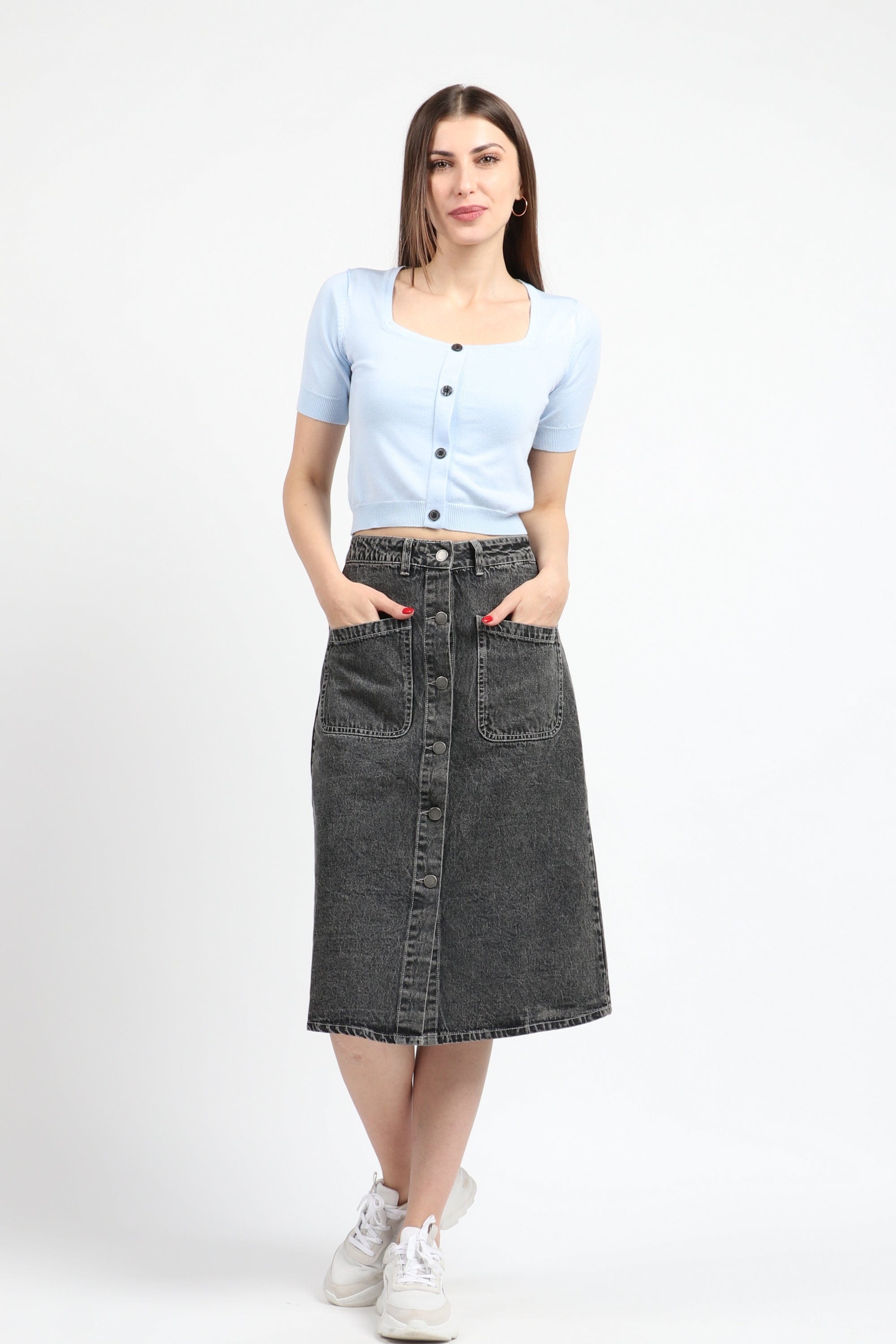 Stand out for a modern and elegant look with a midi denim skirt with front pockets and buttons from Kitschen. This skirt is available in a variety of colours including elegant black and attractive blue. This piece is designed with great elegance and its meticulous details make it perfect for any occasion. Front pockets and buttons add a modern and functional touch to the skirt. Style it with a chic blouse and high heels for a feminine look. Get now a denim skirt with front pockets and buttons from Kitschen Get ready for a great look. Order it now and enjoy the best fashion from Fashion Saudi Arabia. Product Number: 66-0021