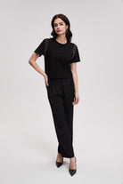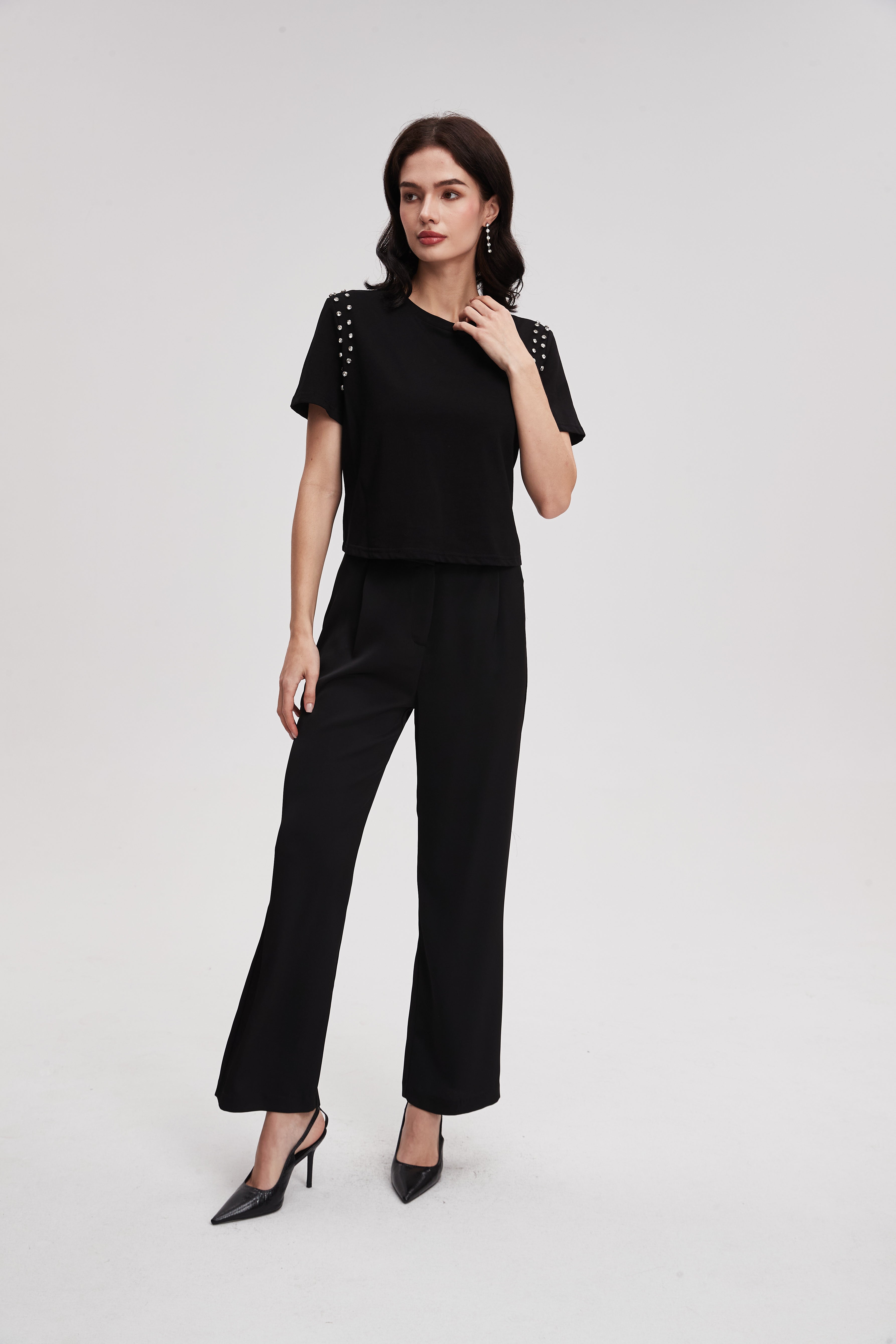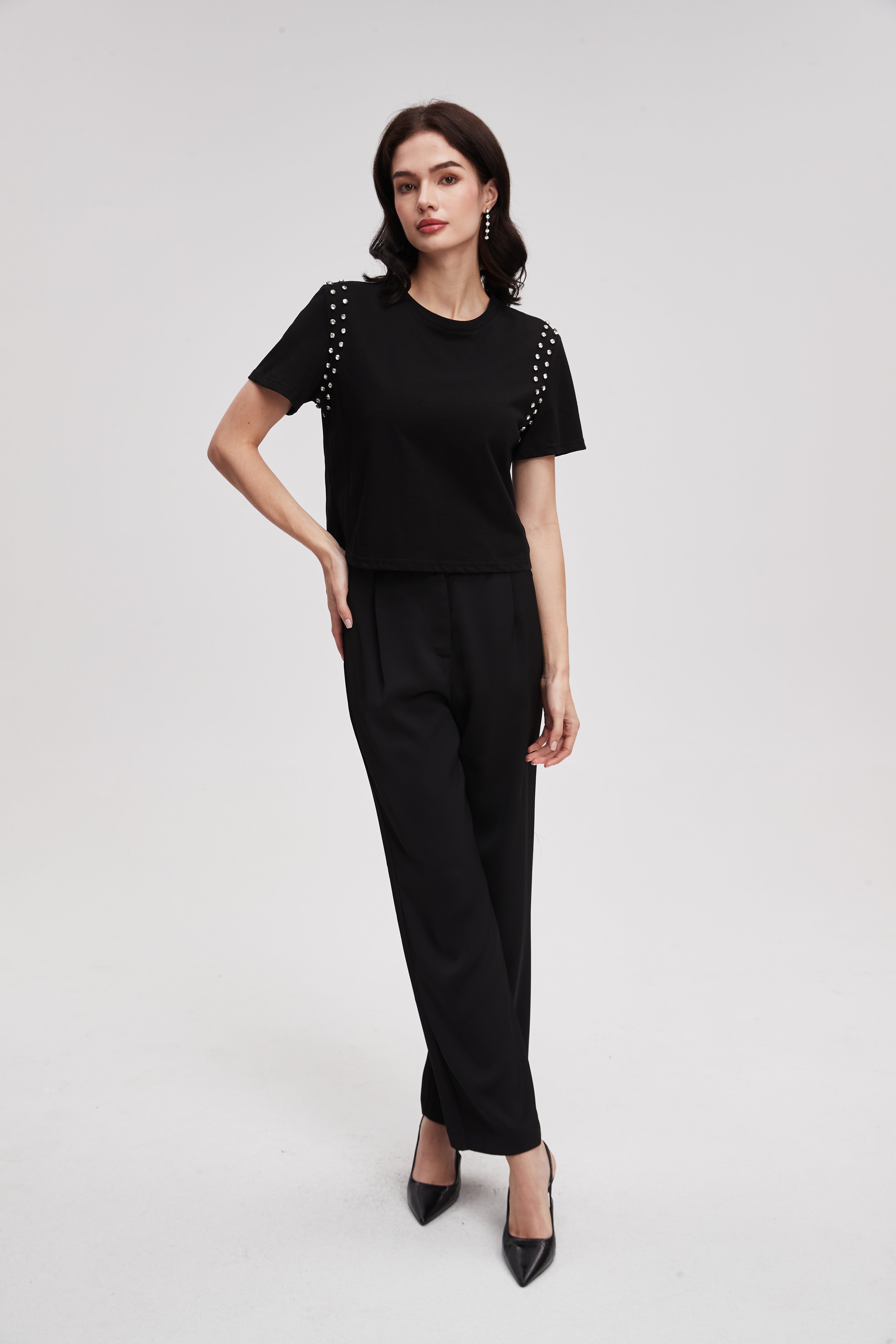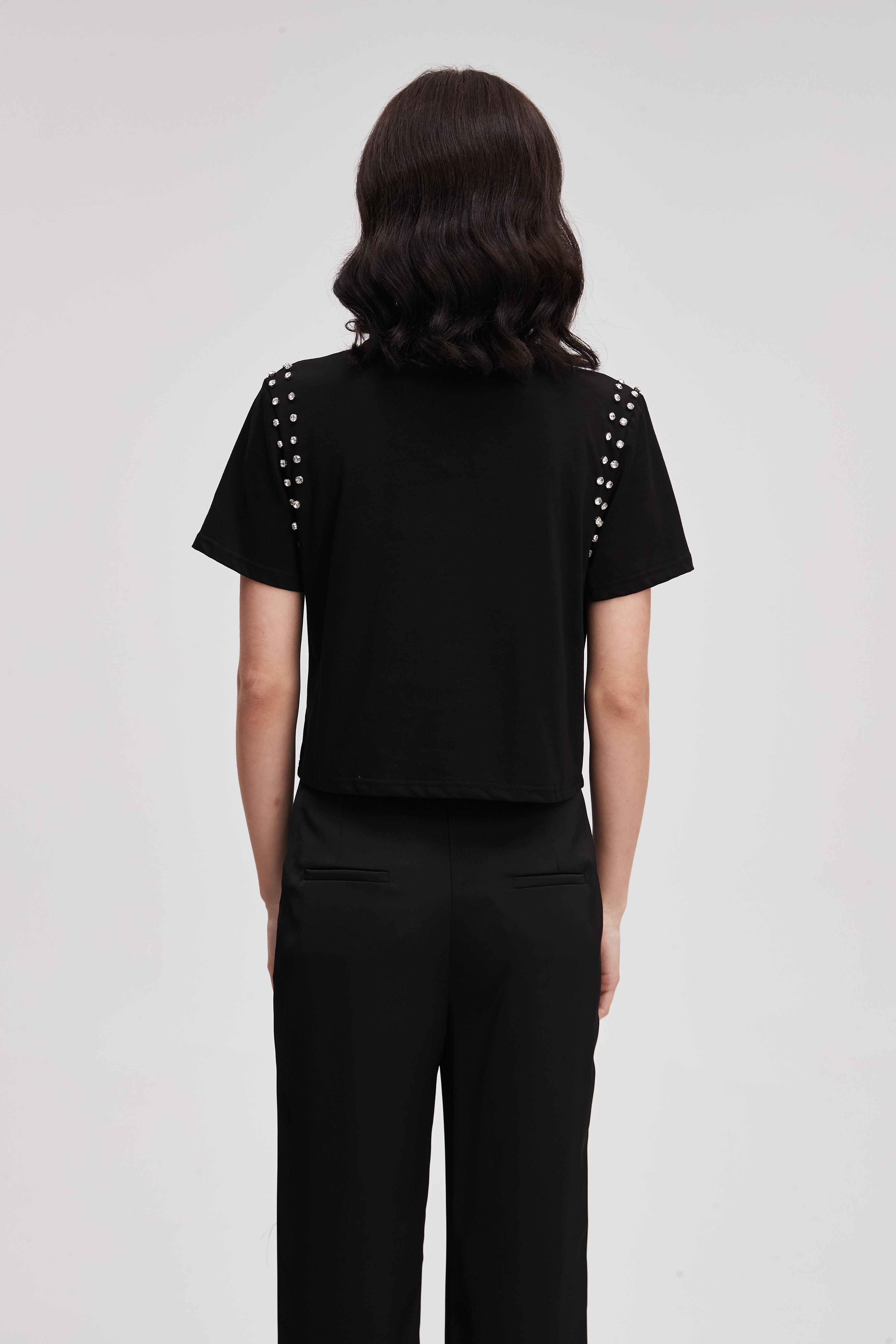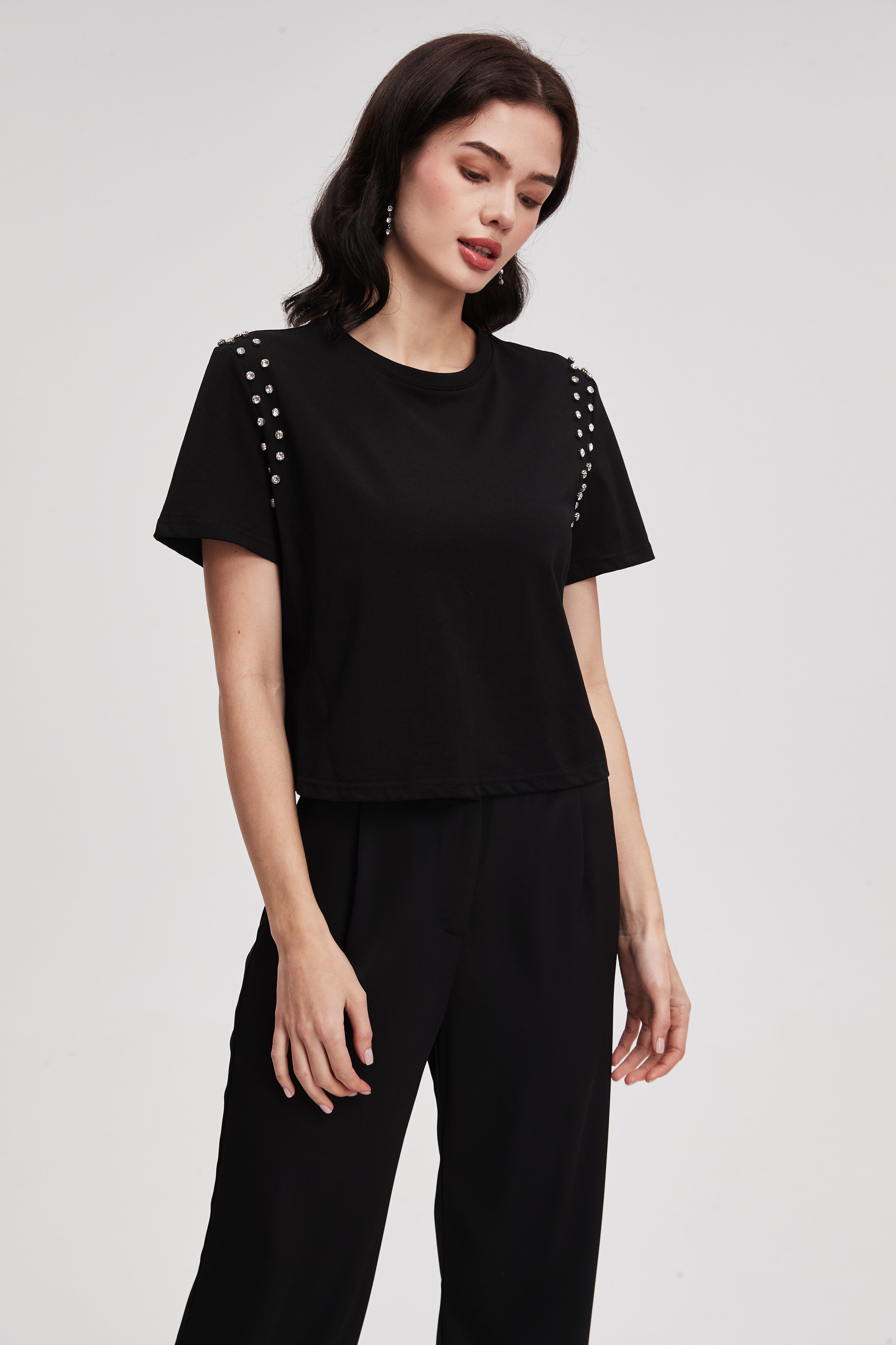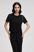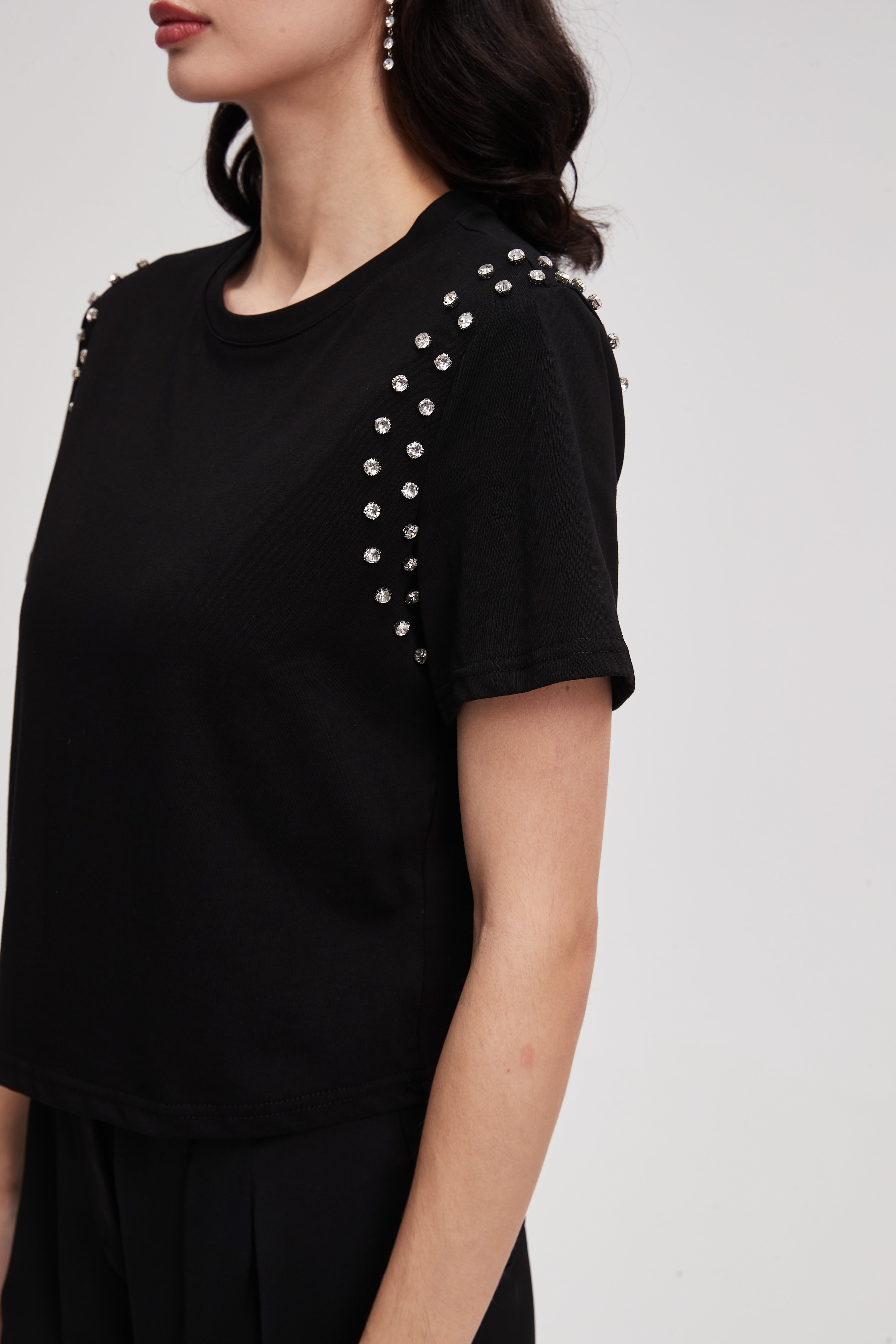 Plain T-Shirt with Shoulder Embroidery and Short Sleeves