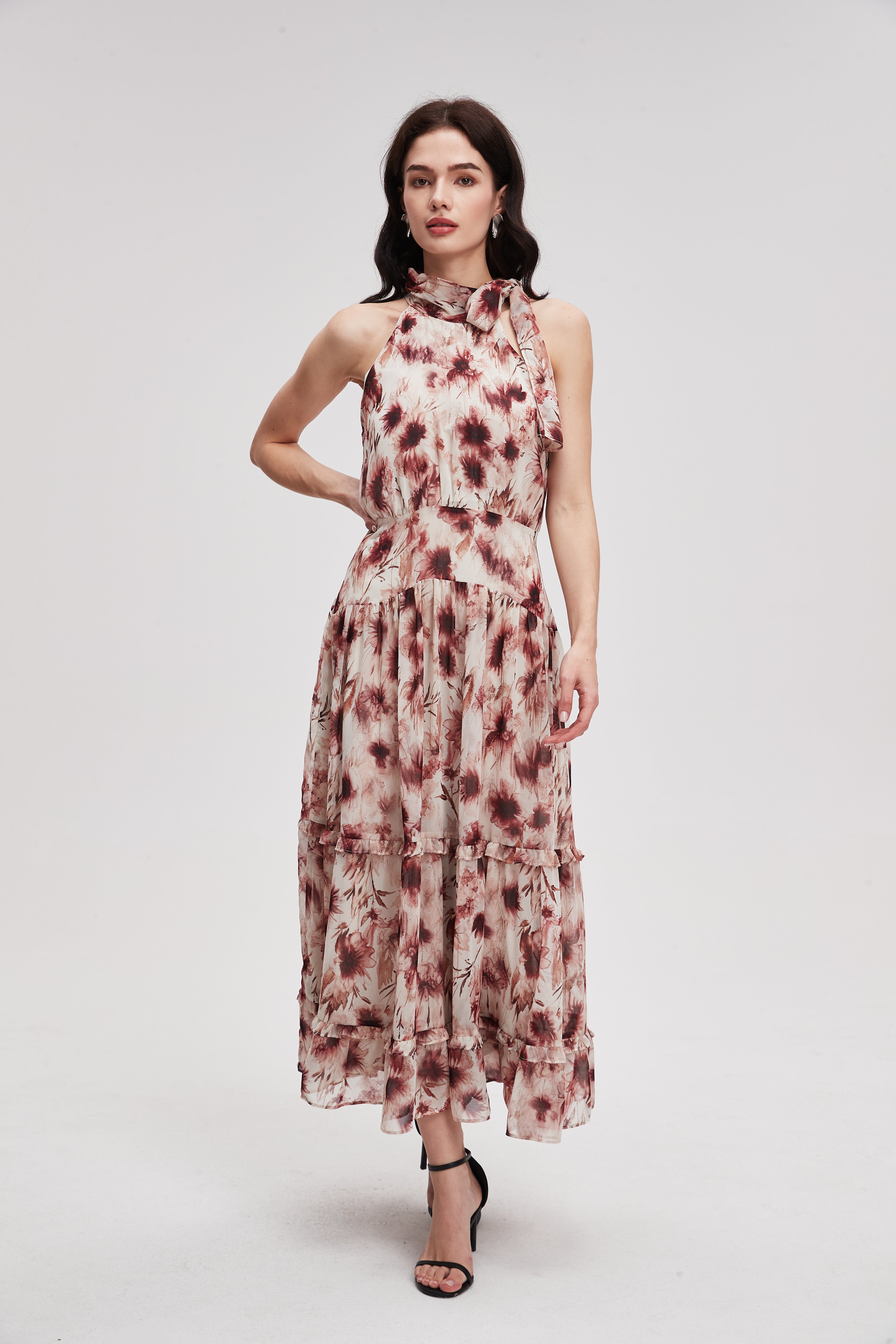 Immerse yourself in a vibrant tapestry of colors with our Floral Print Sleeveless Maxi Dress, designed to enhance your every step. This stunning piece features an intricate floral pattern that evokes the beauty of a blooming landscape, making it a pivotal addition to any woman's wardrobe. The lightweight fabric ensures comfort, while the flowing silhouette effectively flatters your figure. Moreover, its versatility allows you to dress it up for a special occasion or keep it casual for a day out. Product Number: ma0402s261vt