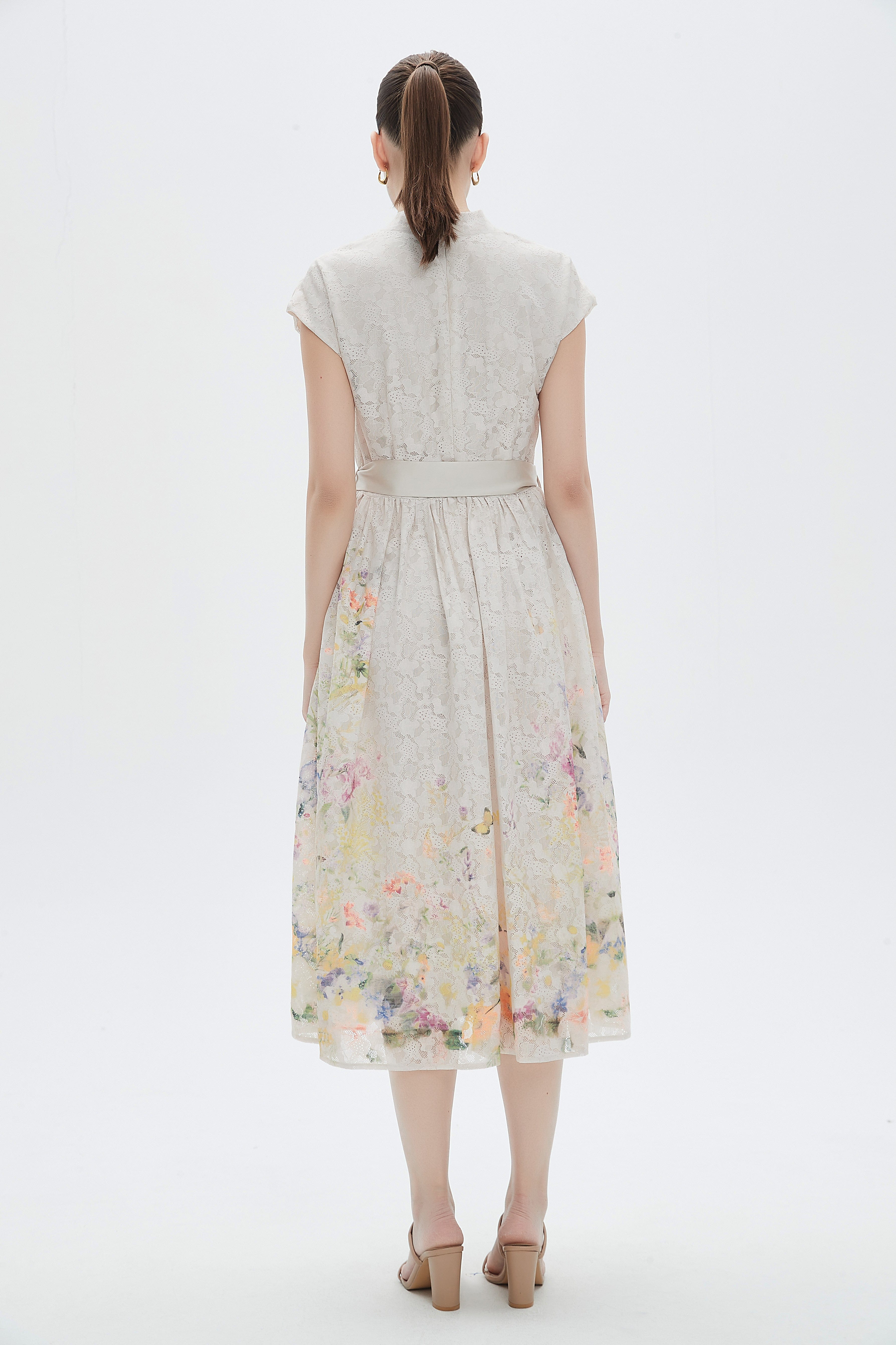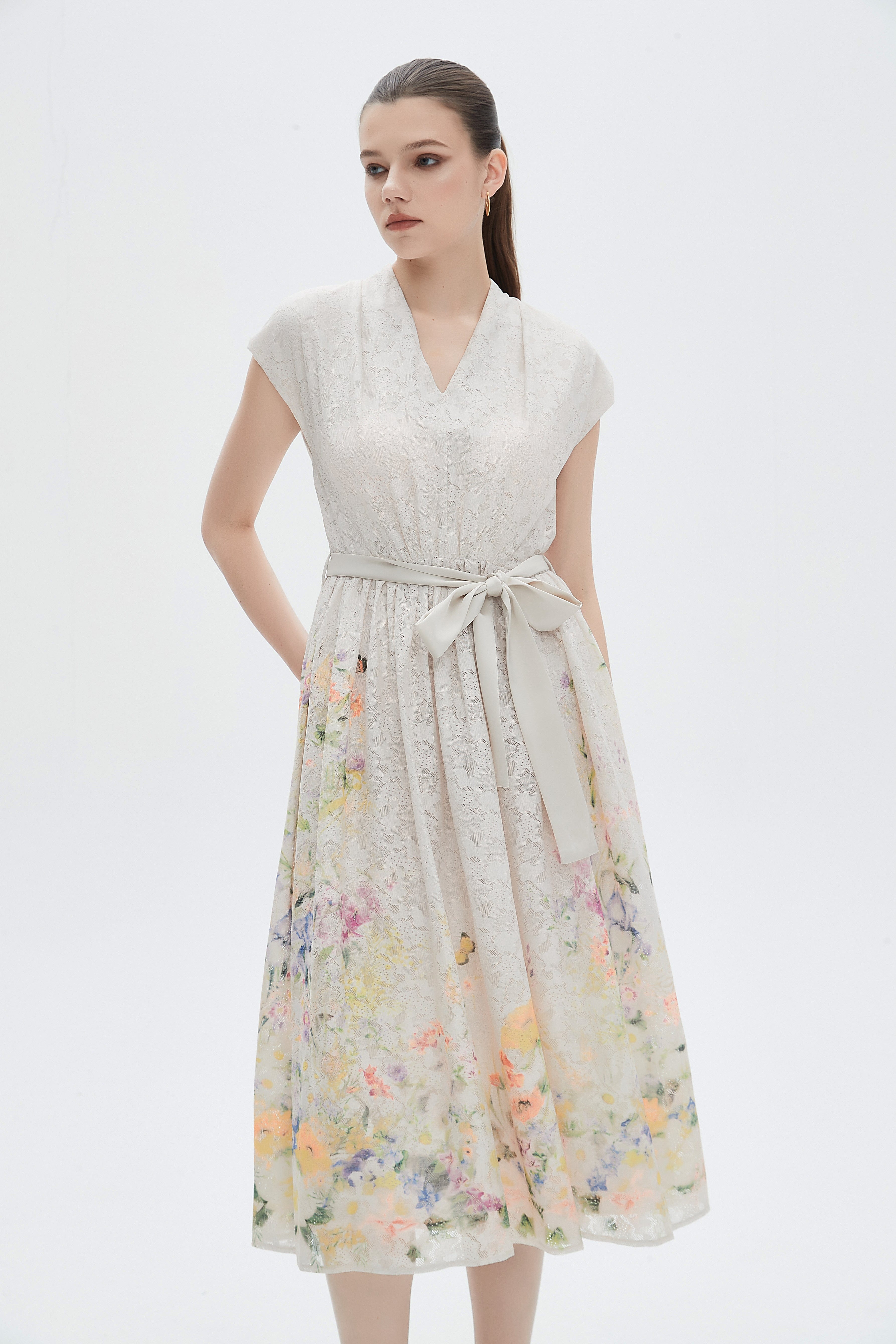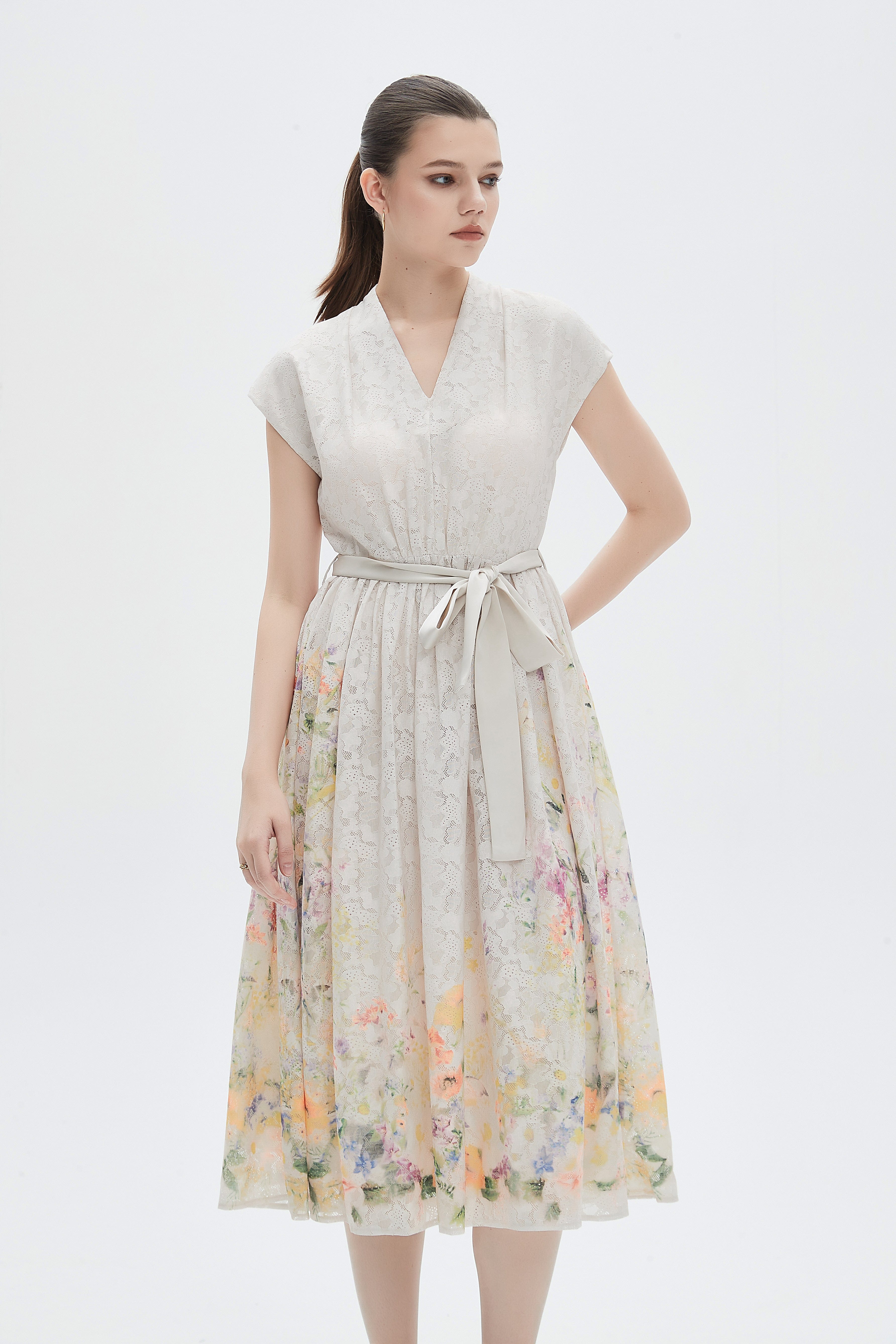 A flared midi dress with a waist belt and a V-neck.