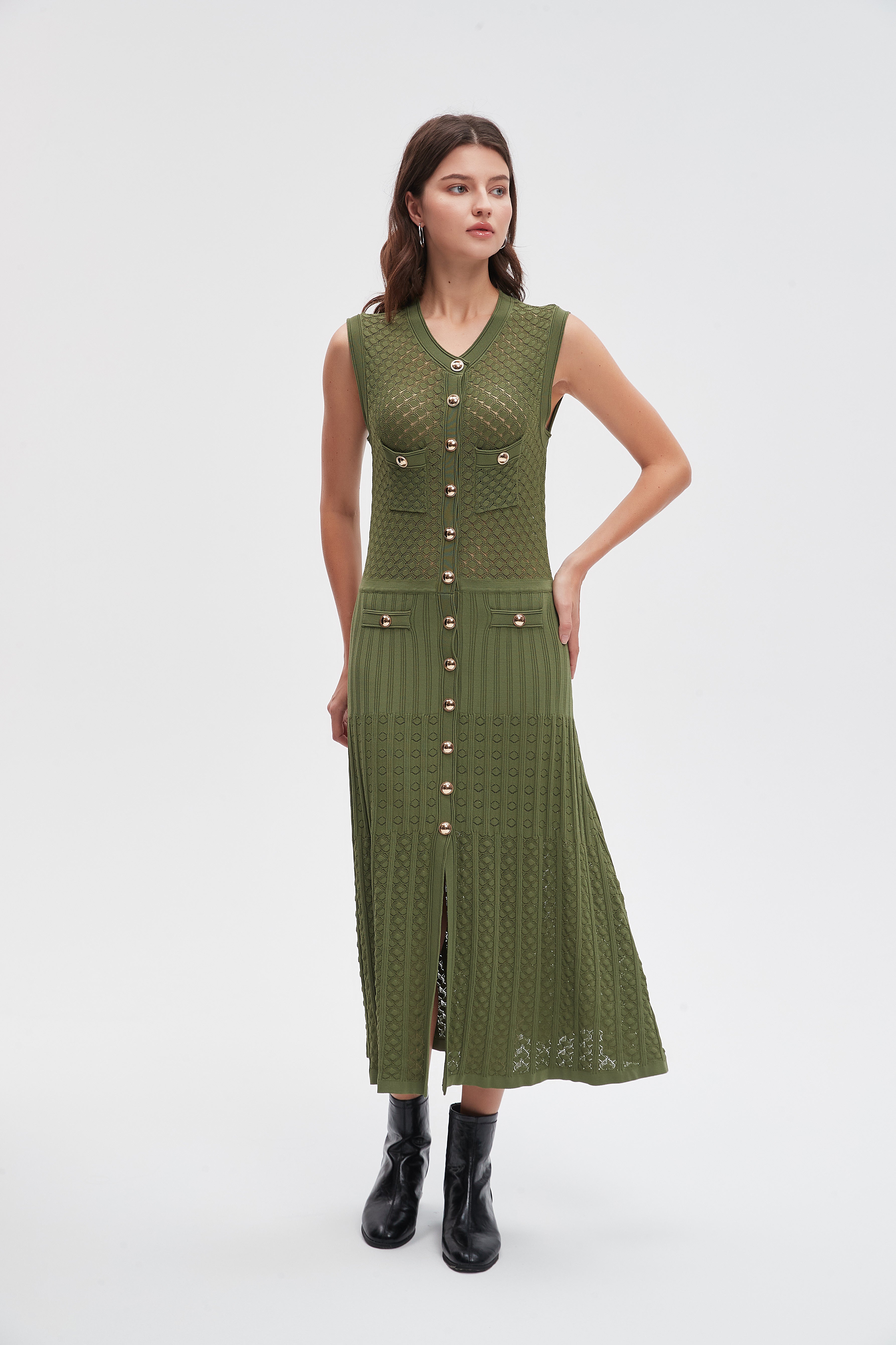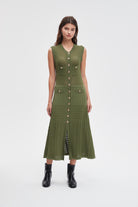 Turn everyday outings into a confident moment with this Green Textured Midi Sleeveless Dress from Fashion SA. The feminine A-line silhouette skims the waist into a graceful midi hem, while the textured pattern adds tactile interest to a regular-fit shape. Sleeveless with a flattering V-neck and neat button closure, the unlined, medium-weight fabric offers breathable structure for all seasons. Double pockets bring practical ease without compromising the streamlined look, and the beltless design keeps the silhouette clean and versatile. Effortlessly styled for casual weekends, layered office looks, or city brunches — dress it up with heels or down with sneakers. Discover the balance of comfort and polish with this Livia piece on Fashion SA and add a timeless, wearable staple to your wardrobe today.