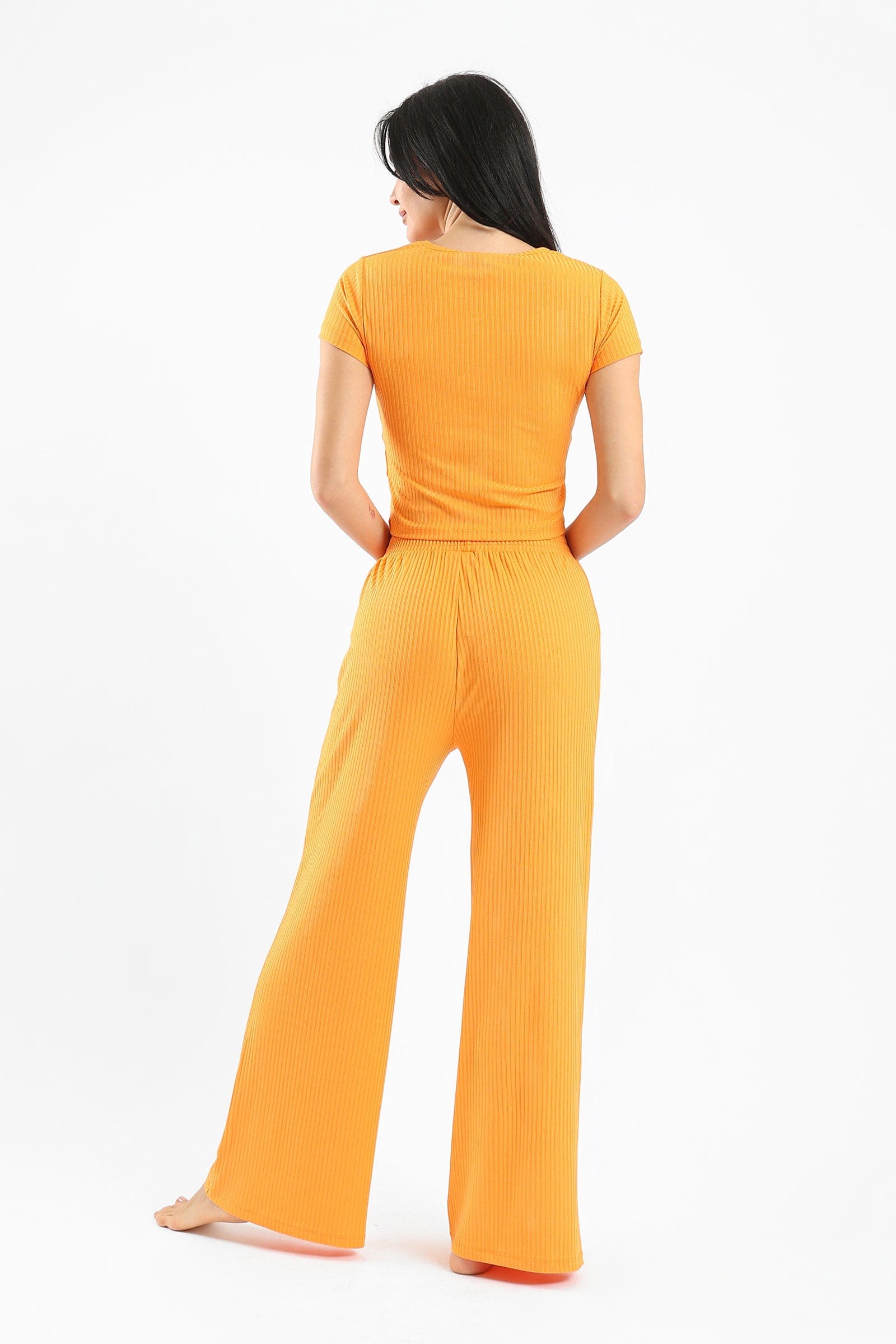 Get ready for comfort and style with this Carina T-shirt and ribbed viscose pajama set. This set is available in five gorgeous colors: beige, black, dark blue, olive, and orange. This set is elegantly designed with high quality for all-night comfort. The T-shirt is cut for a relaxed fit and short sleeves, while the trousers have a ribbed silhouette that offers unparalleled flexibility and comfort. Get a t-shirt and ribbed viscose pajama set now and enjoy style and comfort at the same time. Order it now through Fashion KSA and get ready to spend quiet and relaxing nights. Introducing the luxurious and comfortable viscose ribbed shirt and pants pajama set from Carina. Made with high-quality viscose fabric, this set offers a cozy and soft feel against your skin. The set includes a stylish ribbed shirt and pants, perfect for lounging or sleeping in style. Available in a range of beautiful colors including beige, black, dark blue, olive, and orange, you can choose the perfect shade to suit your mood and personal style. Product Number: 54459