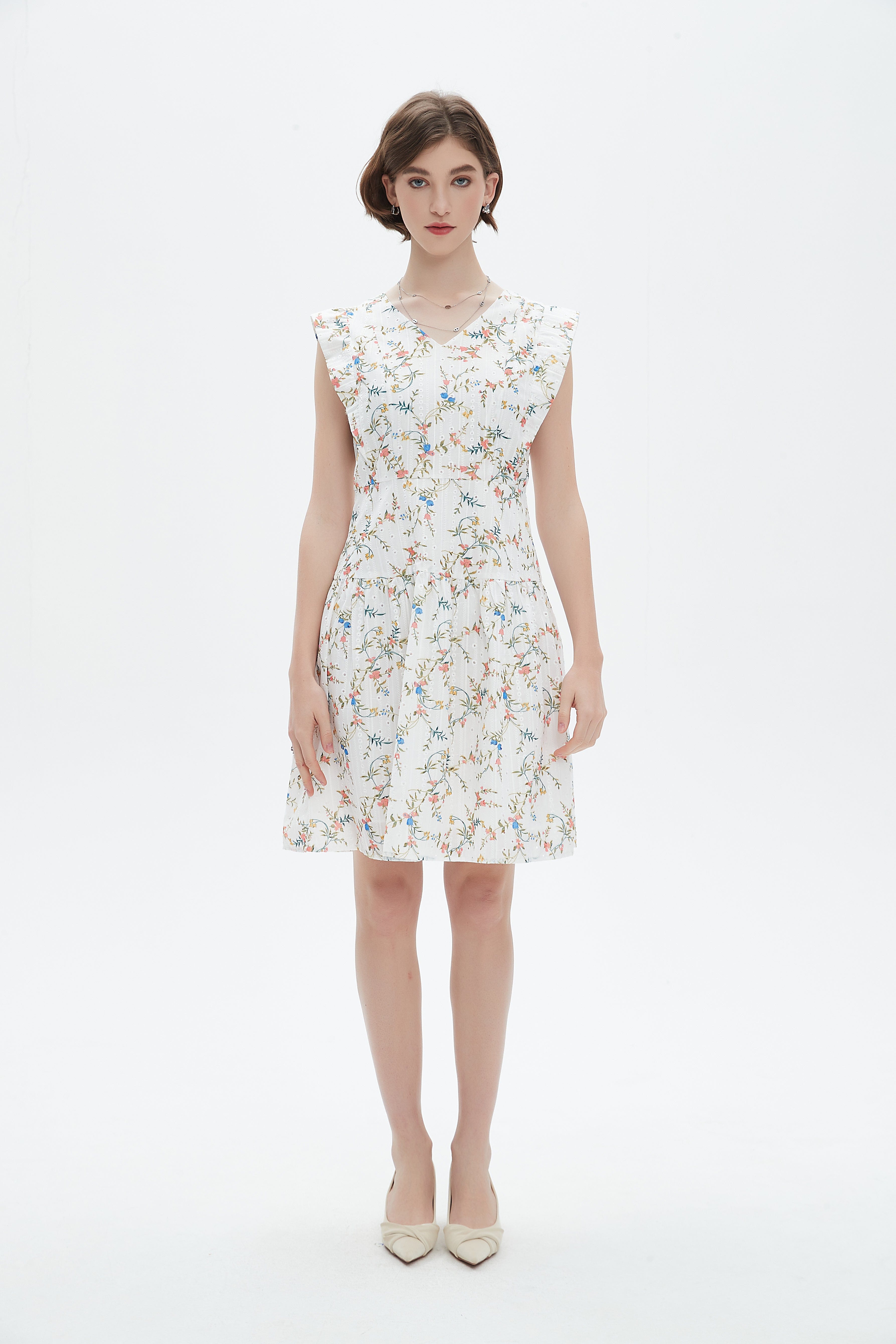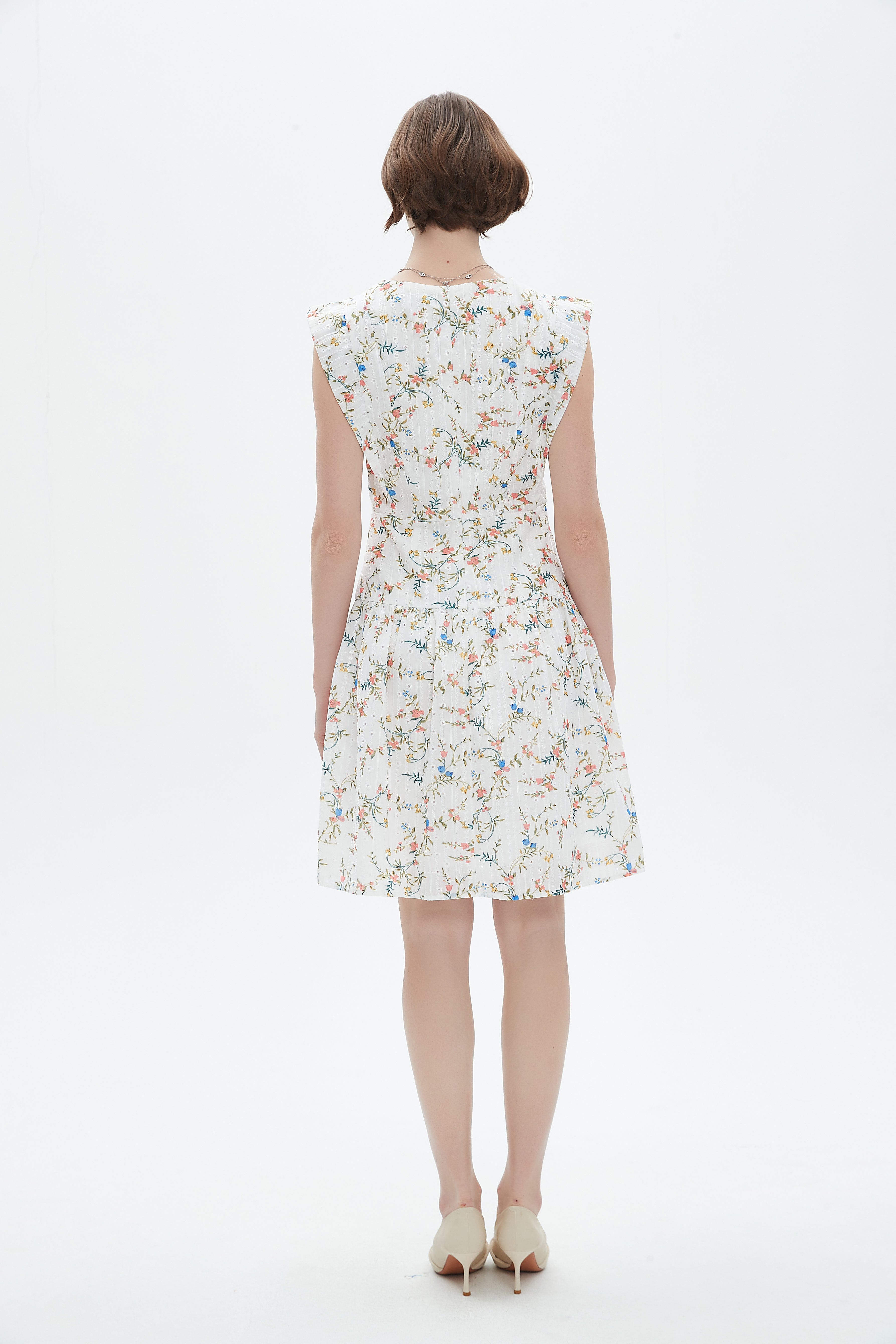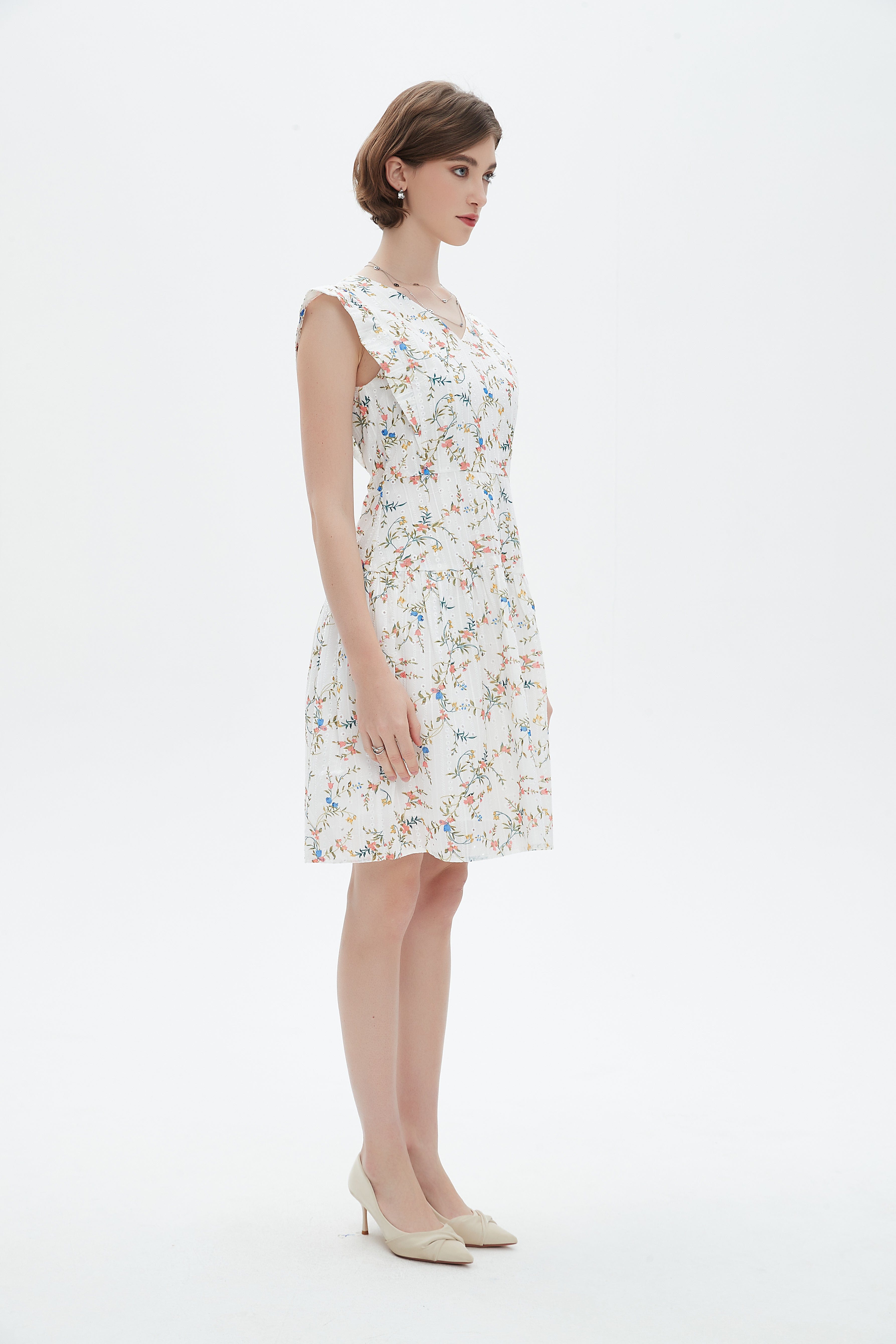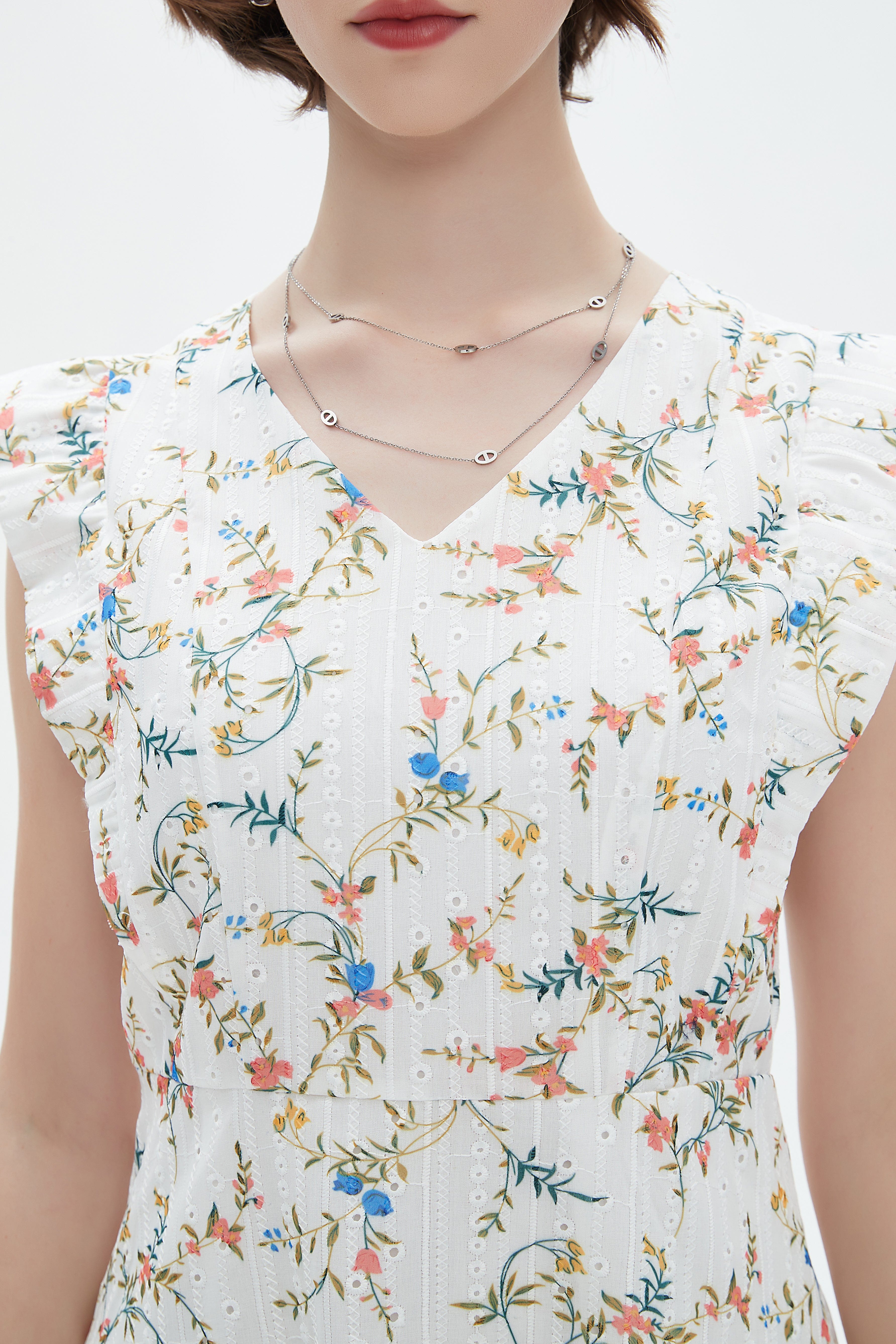 Sleeveless midi dress in floral pattern with a V-neck opening.