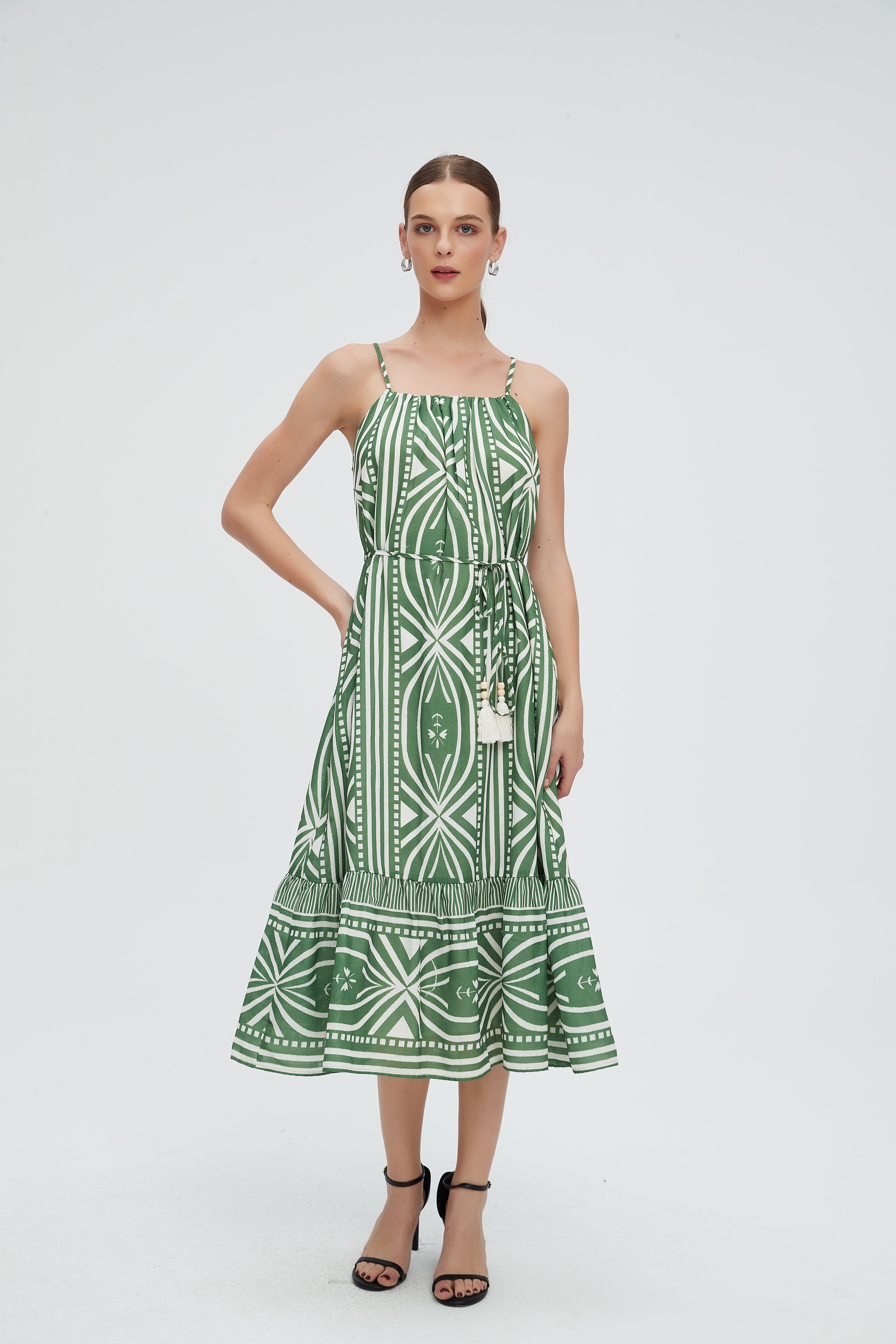 Midi Sleeveless Dress with Round Neck and Chest Flower