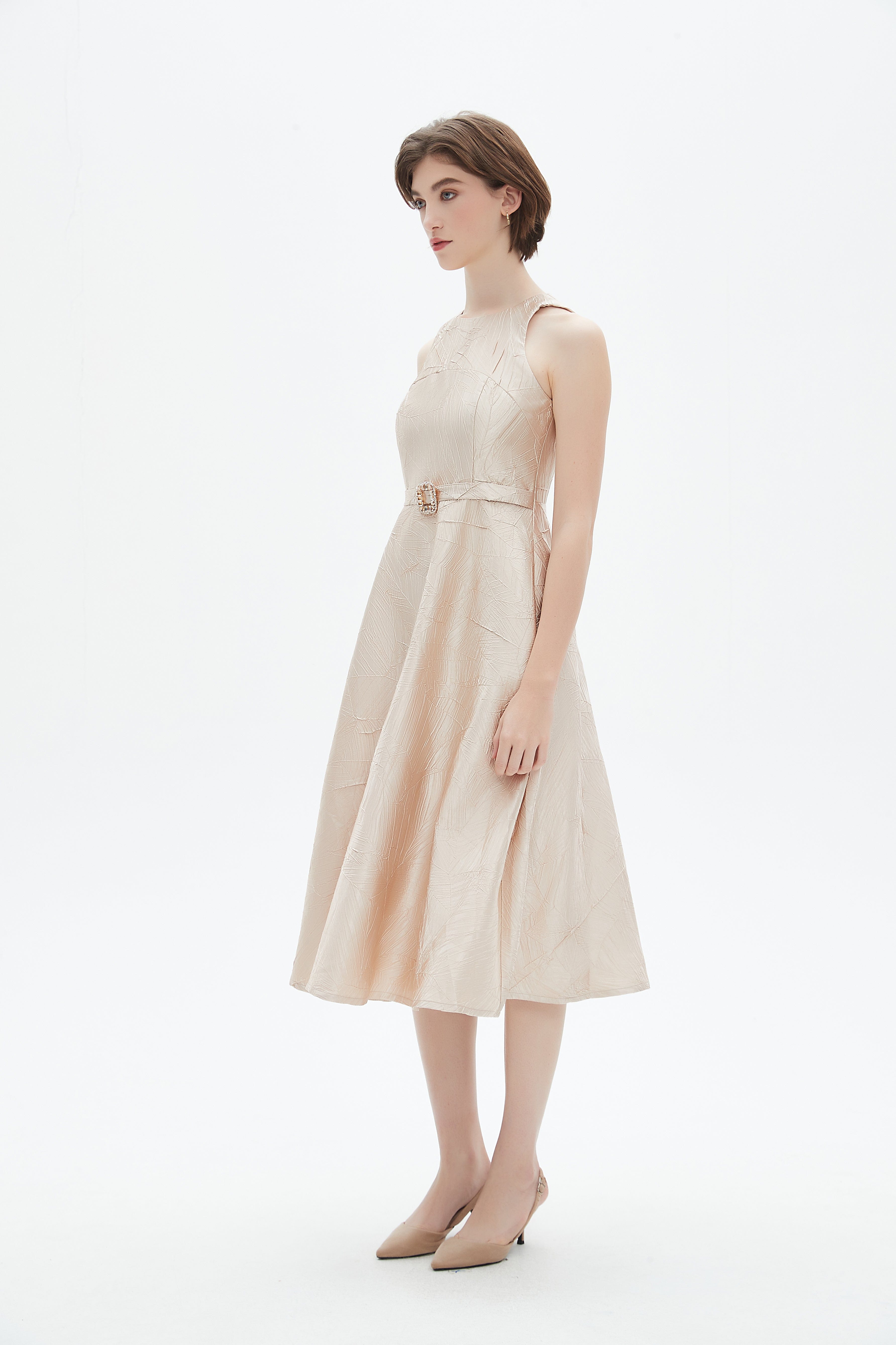 This beige textured midi belted dress is a study in refined ease — a wardrobe essential that elevates workdays and evening affairs alike. Cut in a flattering A-line silhouette with a high neck and sleeveless profile, the regular-fit shape skims the body while the included self-tie belt defines the waist for a polished finish. The mid-weight textured fabric of 95% polyester and 5% elastane offers wrinkle-resistant structure with just the right amount of stretch, and the 100% polyester lining ensures smooth coverage and comfortable wear. Midi length lends versatile elegance — easy to style with heels for events or a tailored blazer for the office. Pocketless clean lines and a belted waist create a modern, feminine look. Shop this versatile piece from Nichii on Fashion SA and add a timeless staple to your collection today.