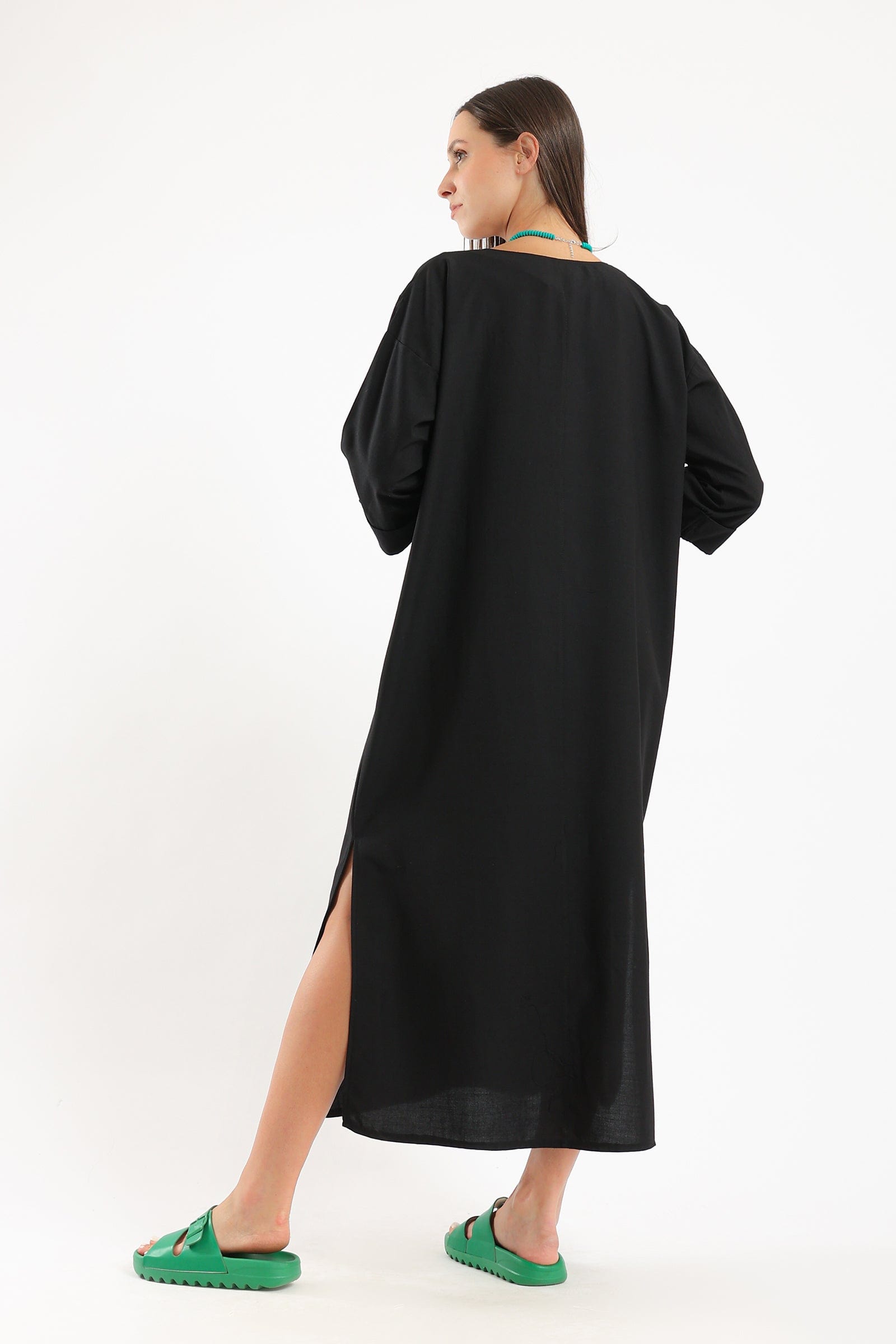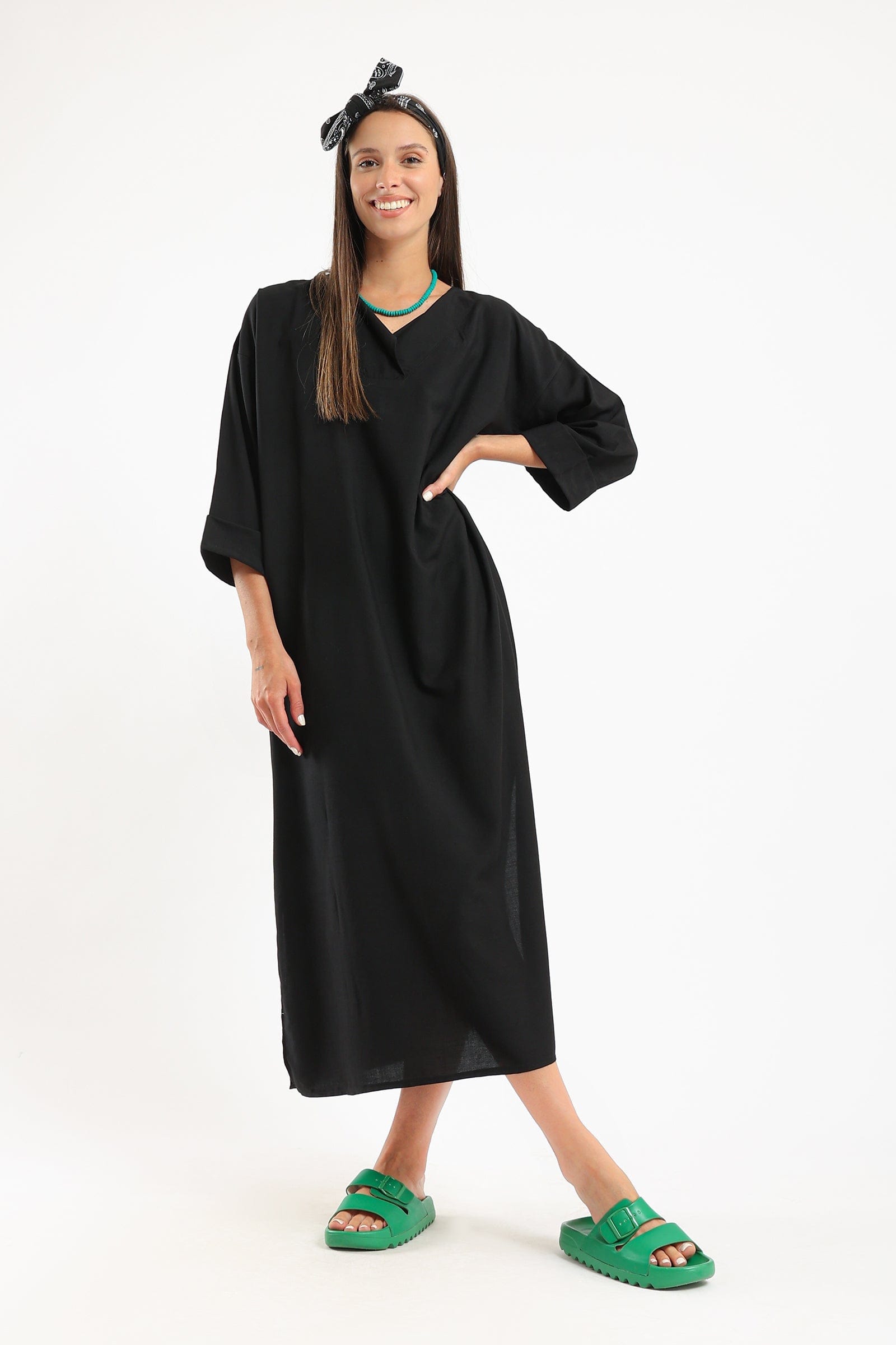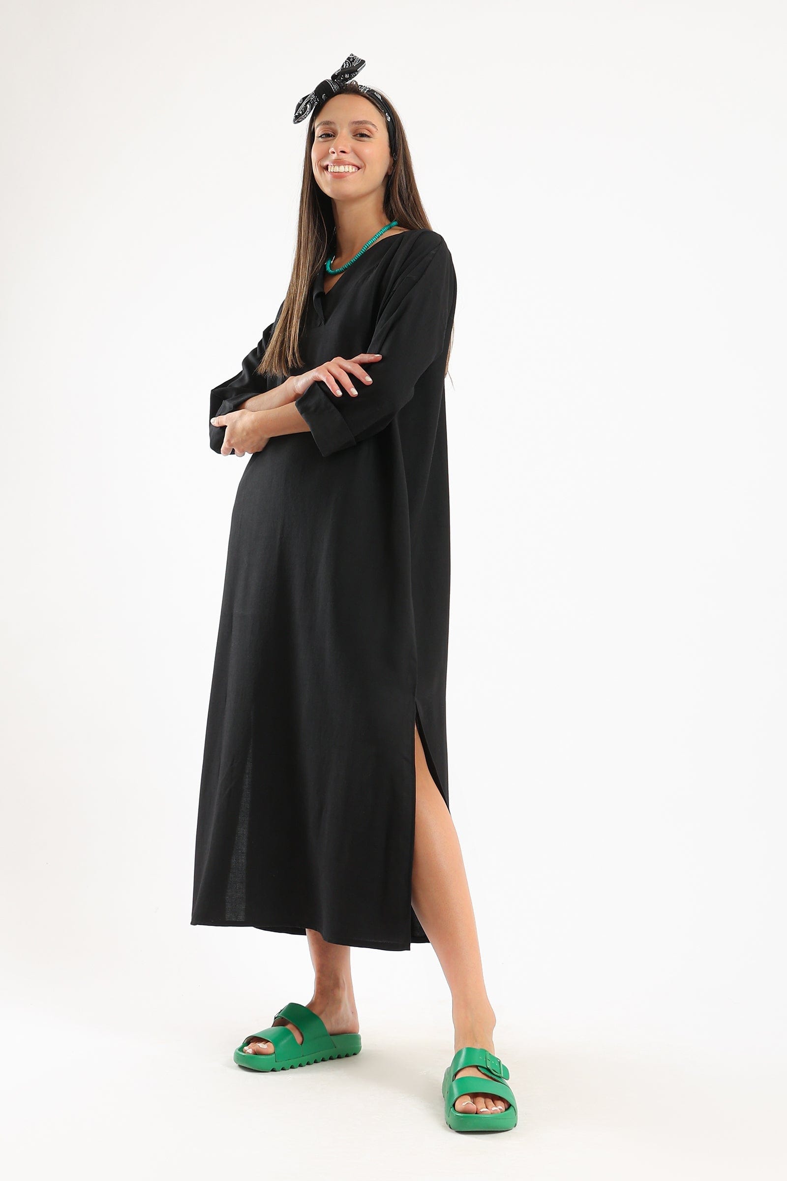 Effortlessly chic and endlessly wearable, the Midi Black Plain Slit Dress is a go-to for modern everyday style. Cut from a medium-weight fabric that breathes and drapes with relaxed ease, the loose silhouette skims the body while the midi length and side slit add graceful movement and a flattering line. Three-quarter sleeves offer smart coverage for transitional seasons and the unlined construction keeps the feel lightweight and breathable. Designed without closures and pocketless for streamlined, slip-on simplicity, this beltless style invites easy layering or the addition of a waist-cinching belt for definition. Perfect for casual days, weekend brunches or low-key evenings, it transitions effortlessly from day to night. Discover versatile wardrobe building at Fashion SA — add this essential black midi to your basket and style your way.