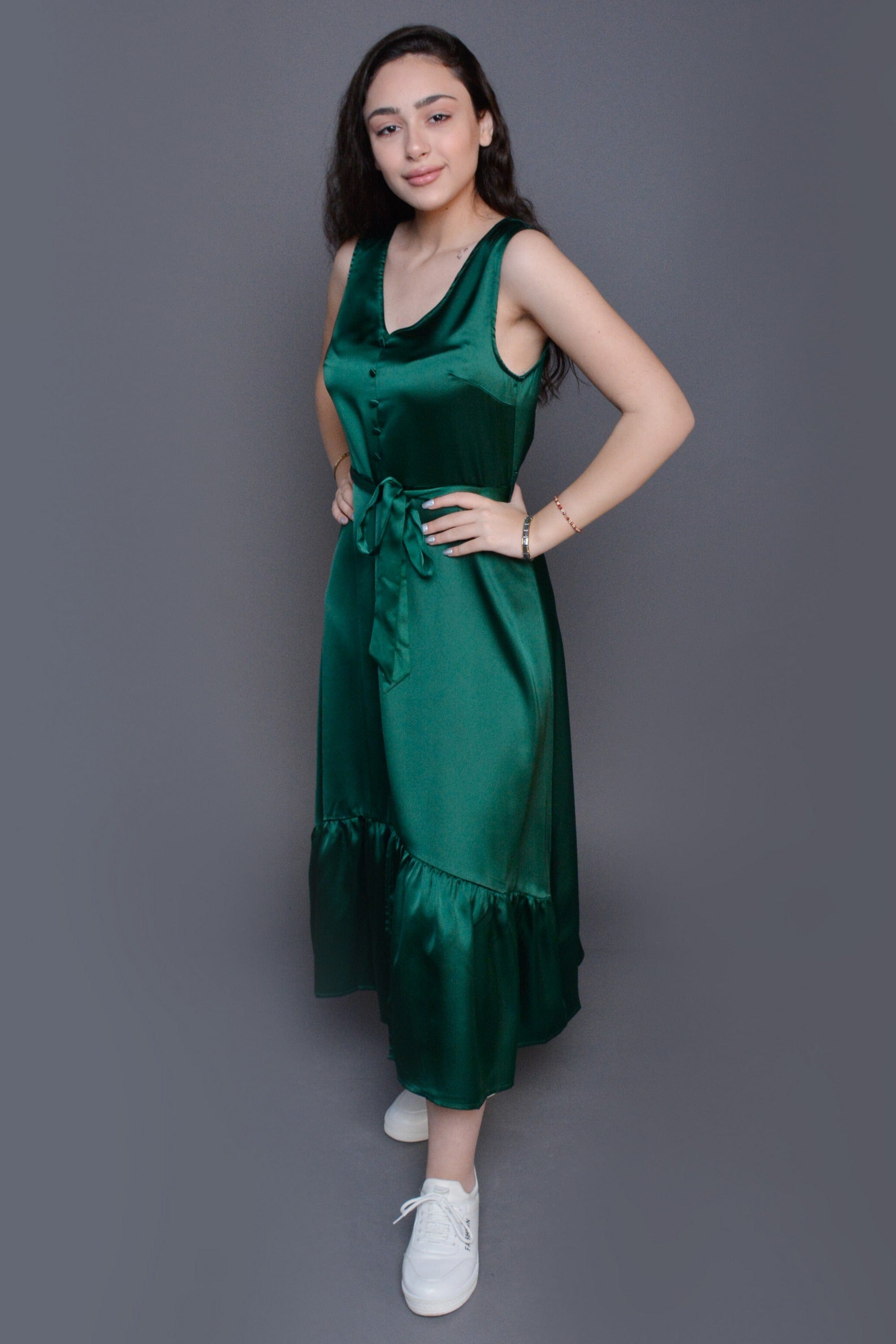 This green solid midi belted dress is a wardrobe essential that blends effortless polish with easy everyday comfort. The flattering A-line silhouette skims the waist and falls to a versatile midi length, while the self-tie belt defines the waist for a feminine, hourglass shape. Cut in a lightweight 97% polyester/3% elastane blend, the fabric is wrinkle-resistant with gentle stretch for ease of movement and a regular fit that drapes beautifully. Sleeveless styling and an unlined construction keep the feel breathable across seasons, and a discreet button closure adds classic detail. Pocketless for a streamlined profile, this casual dress transitions from weekend markets to relaxed office days — simply dress up with heels or layer with a blazer. Discover this Mica piece at Fashion SA and add refined casual sophistication to your rotation; shop now.