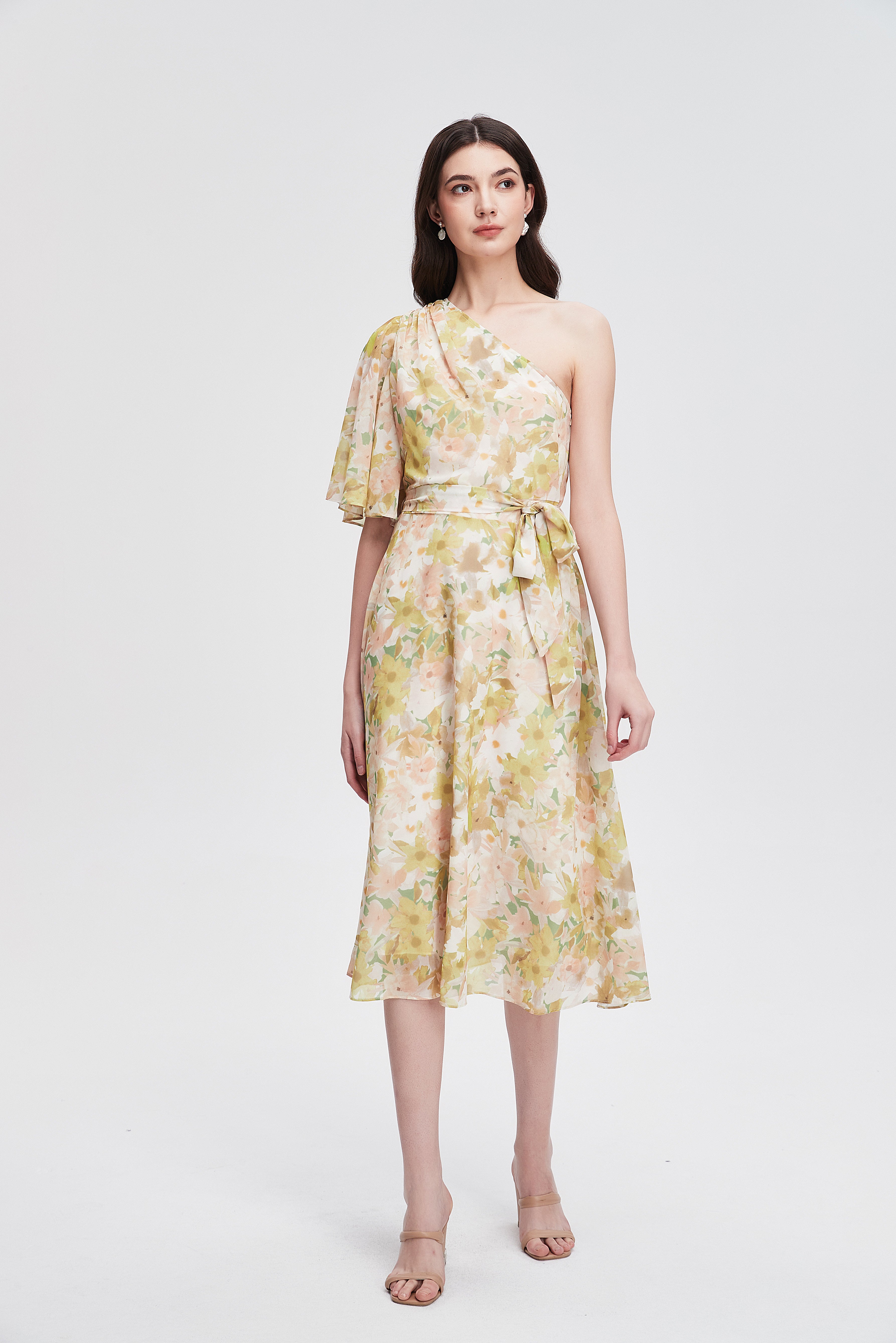 floral short-sleeved midi dress with a waist belt Shirt collar