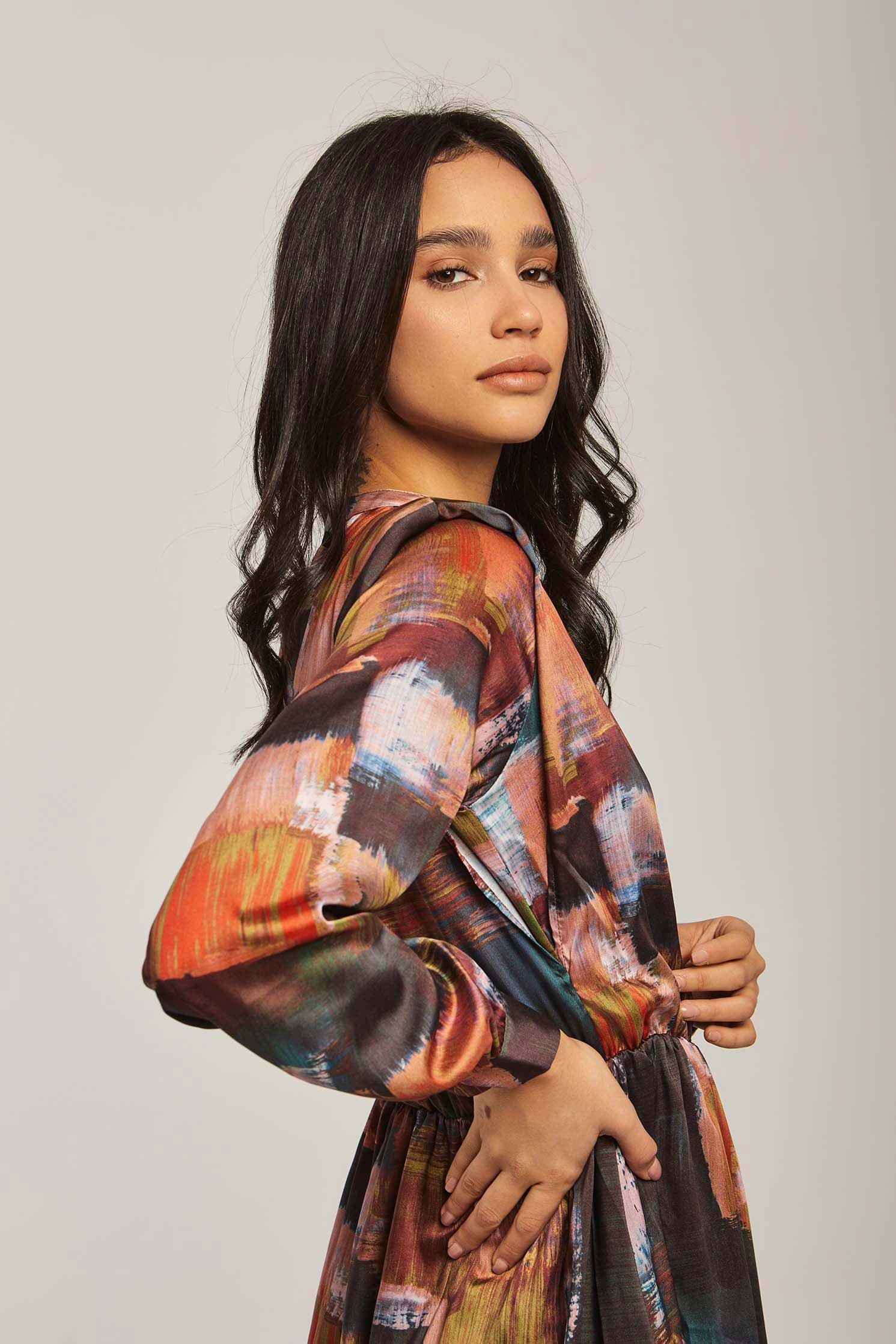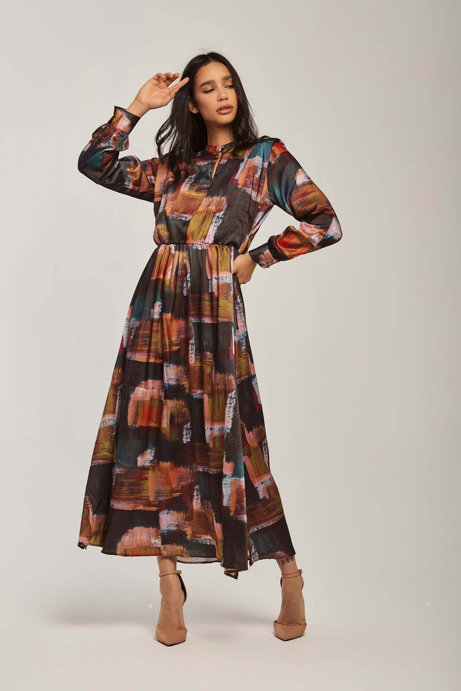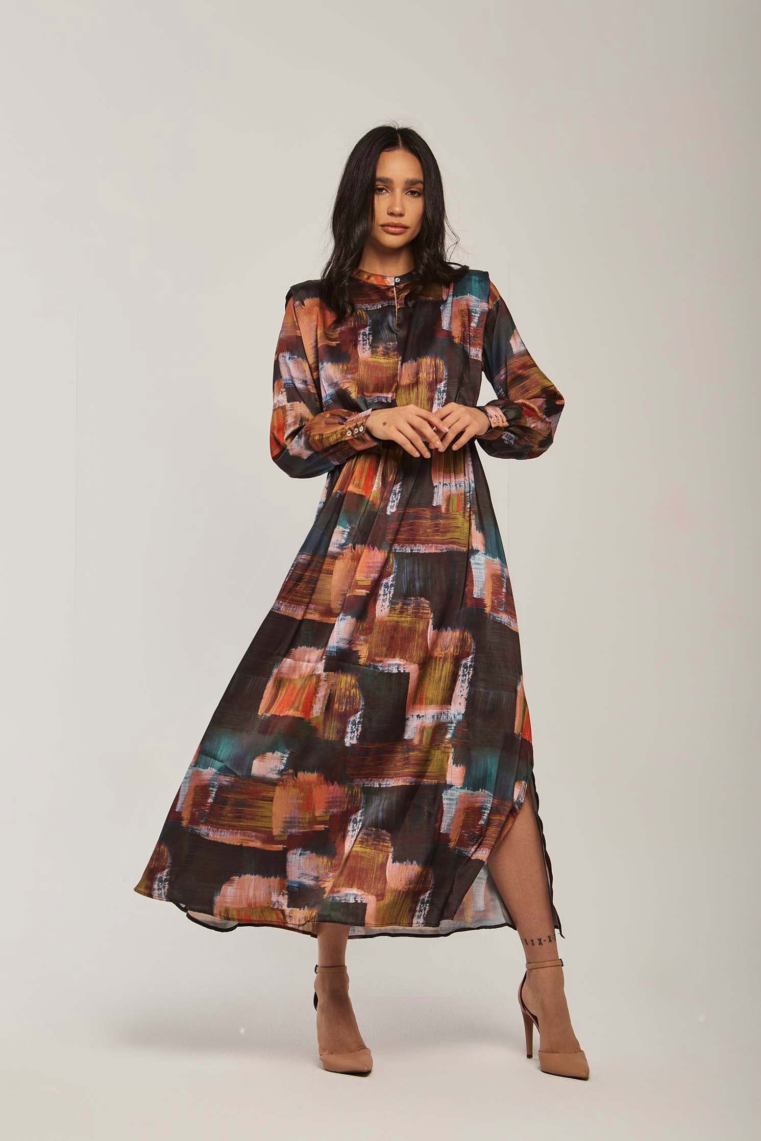 Make a vibrant statement in the Multicolor Abstract Maxi Long-Sleeve Dress โ an A-line silhouette designed to flatter while offering effortless movement. The multicolor abstract pattern brings artistic energy to a medium-weight fabric blend that transitions beautifully between spring and autumn. Long sleeves and a neat mandarin collar with button closure create a polished, wearable look; the unlined construction keeps the dress breathable and comfortable for all-day wear. With a regular fit and flowing maxi length, this piece provides graceful coverage without sacrificing ease โ perfect for weekend brunches, city strolls or relaxed office settings. Pocketless and beltless for a clean profile, itโs easy to accessorize for day or evening. Shop this versatile staple at Fashion SA and add instant personality to your casual wardrobe.