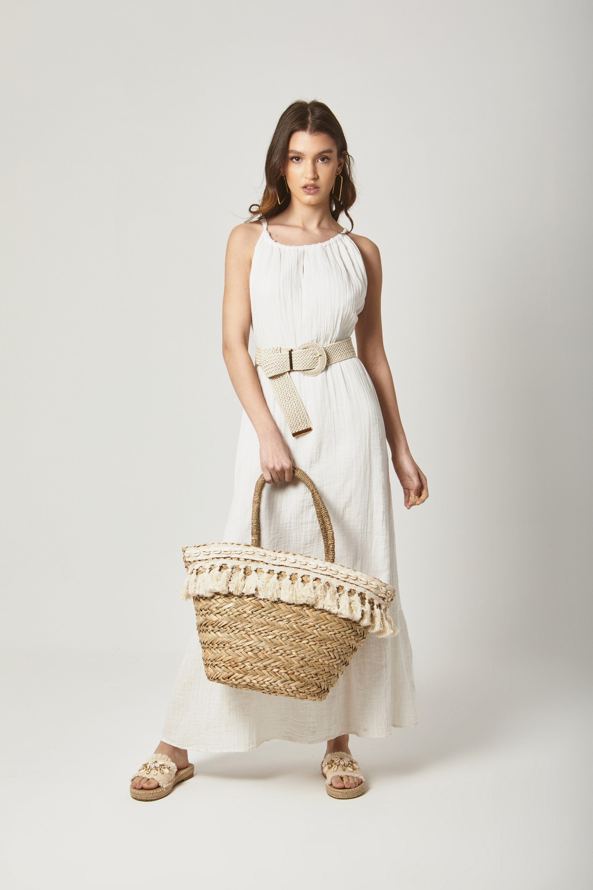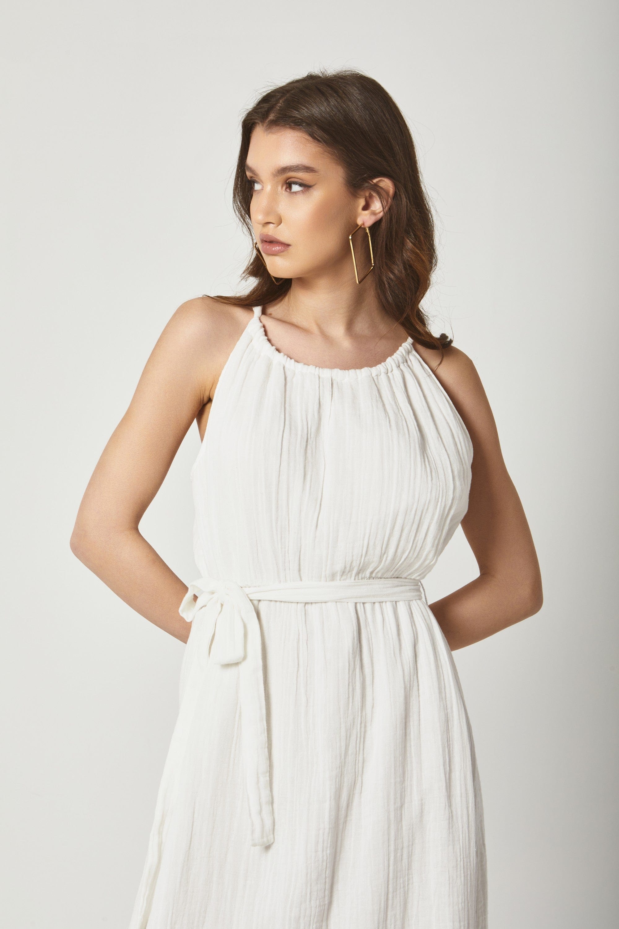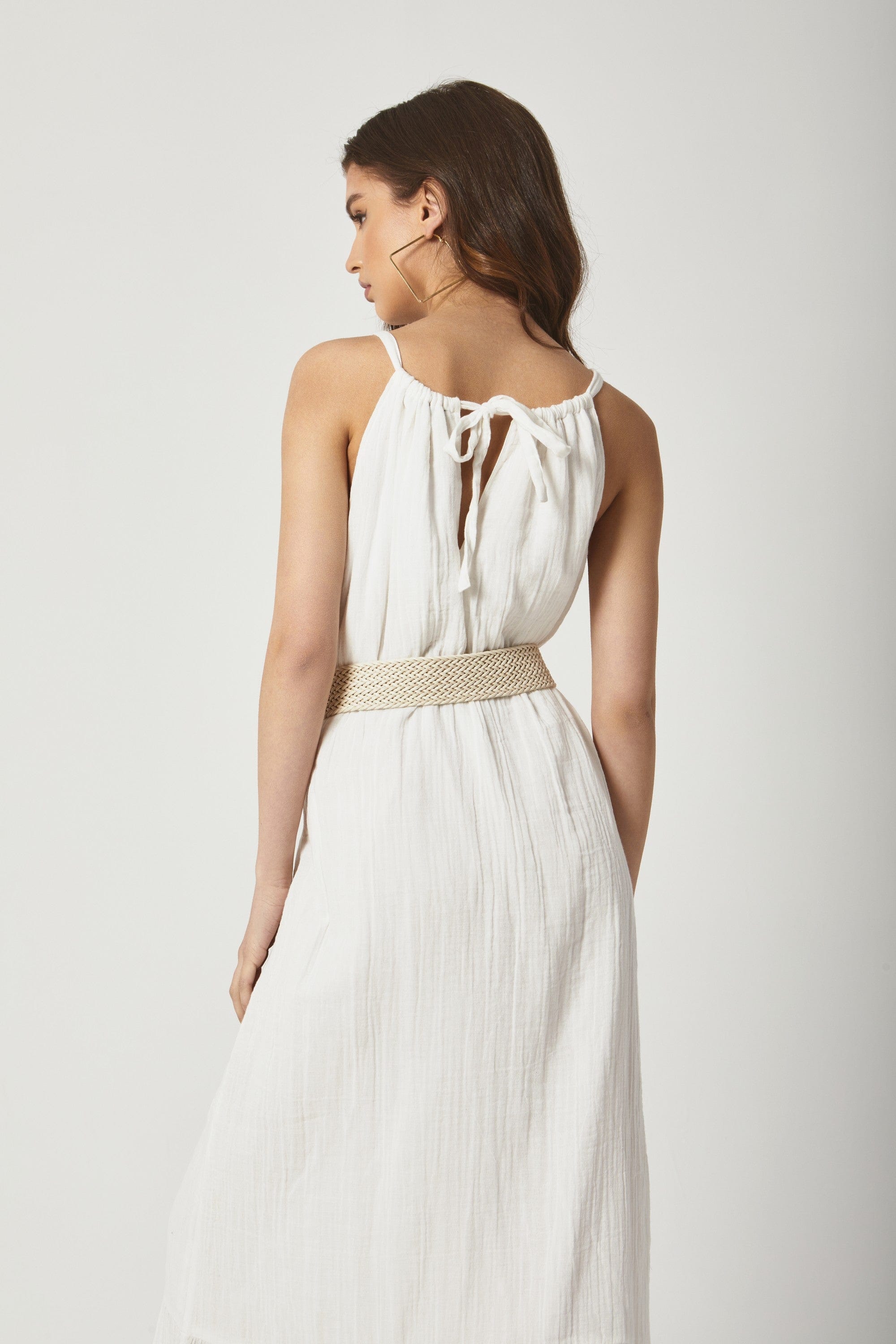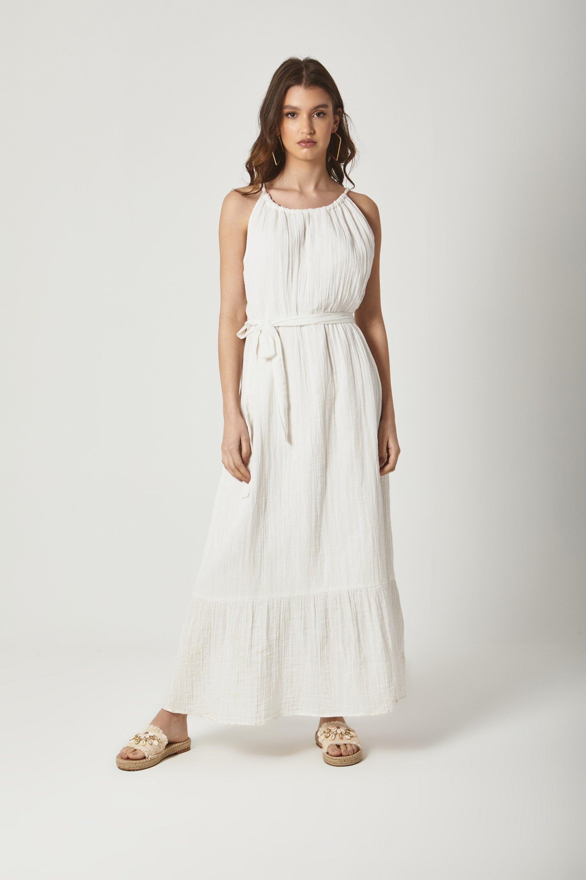 This timeless white plain maxi belted dress makes everyday dressing feel effortlessly chic — a breathable, lightweight staple that flatters and moves with you. The feminine A-line silhouette gently skims the waist and falls to a graceful maxi length, while the sleeveless, thin unlined construction keeps you cool through warm summer days. A self-fabric belt provides adjustable definition in a regular fit for polished shaping without restriction. Pocketless and non-padded for a streamlined profile, the plain solid finish ensures versatile wear from casual daytime outings to relaxed evening plans. Finished with a simple belted closure for instant refinement, this Dalydress design is a casual-everyday essential. Discover it at Fashion SA and add this versatile white maxi to your wardrobe — shop now for effortless summer style.